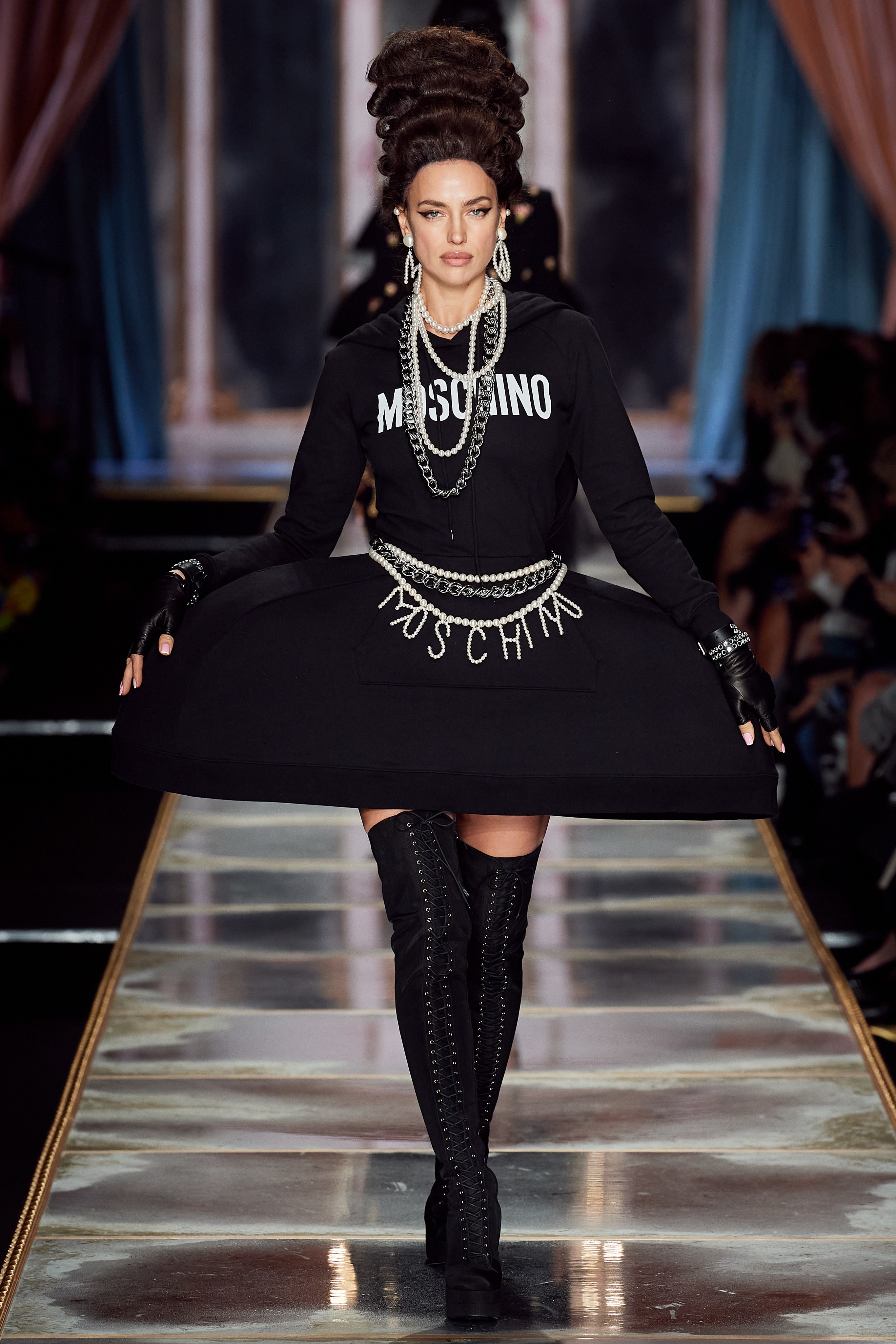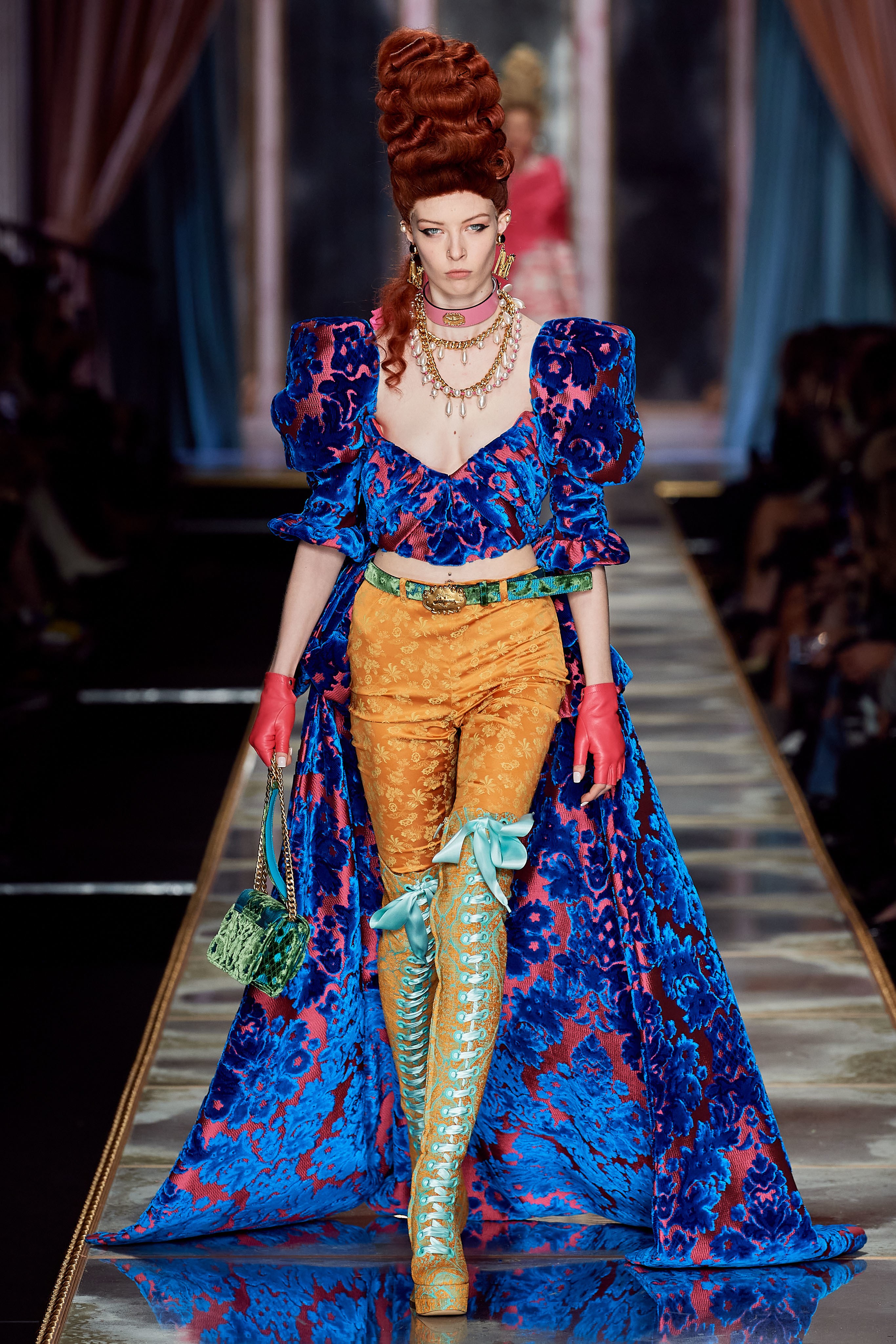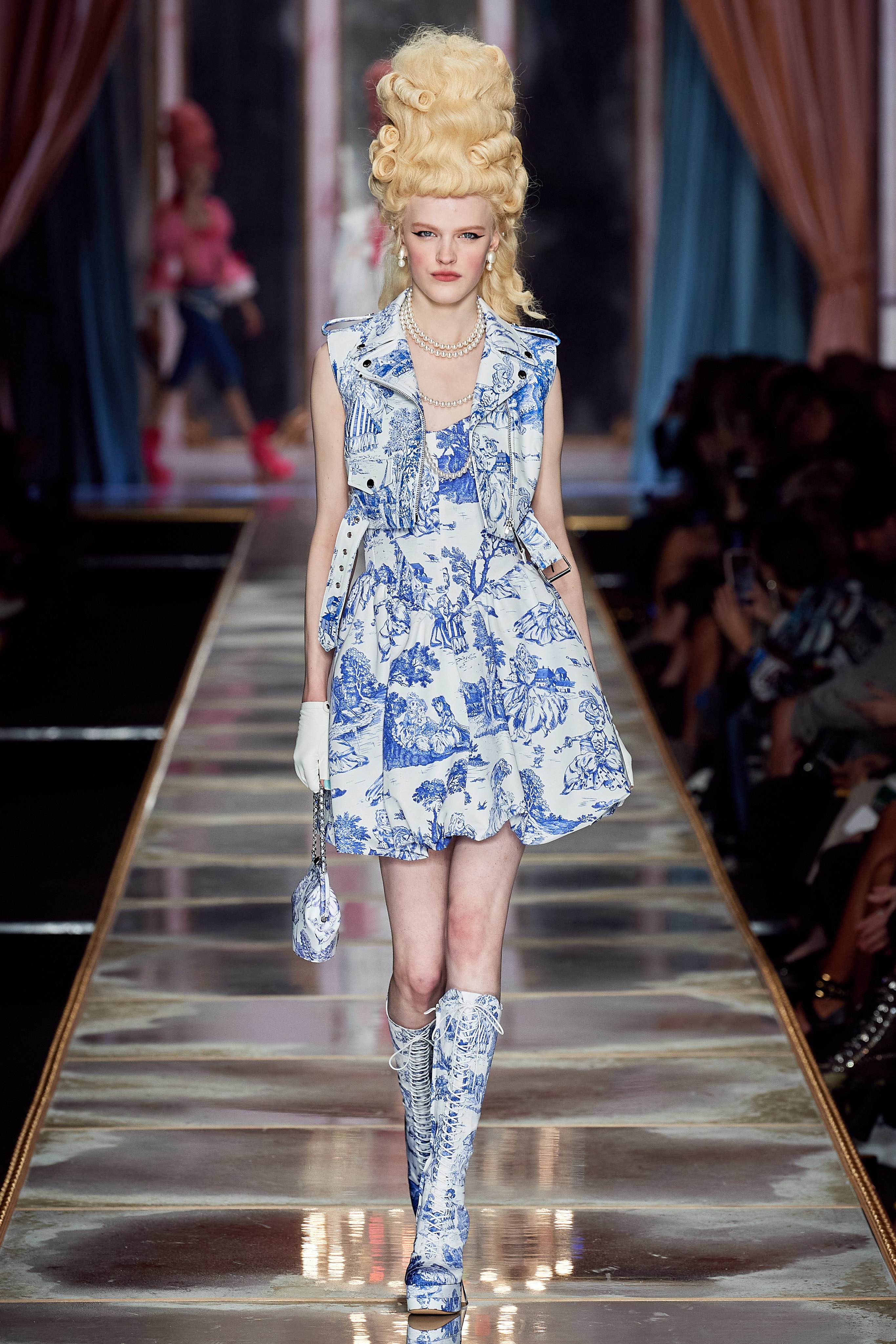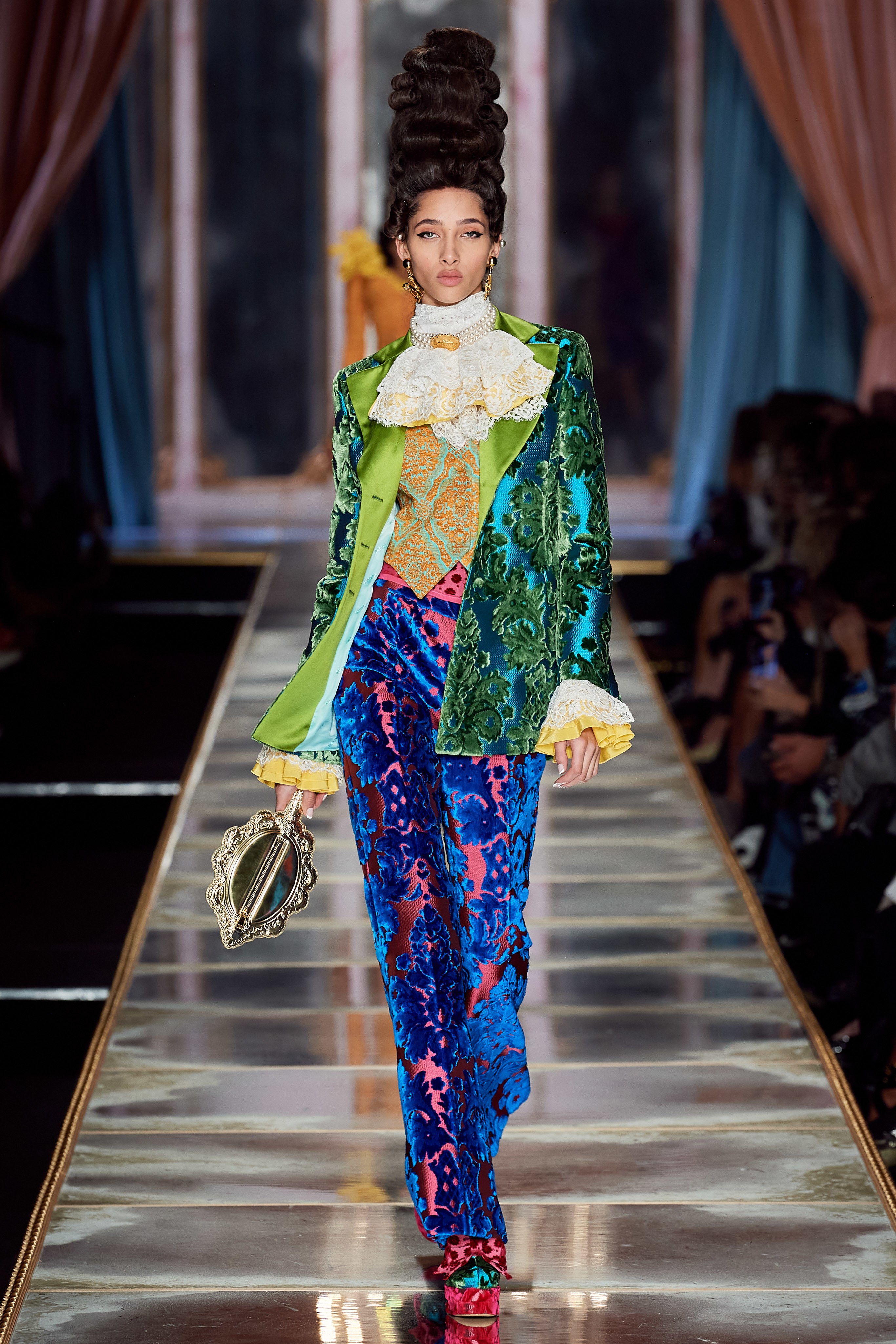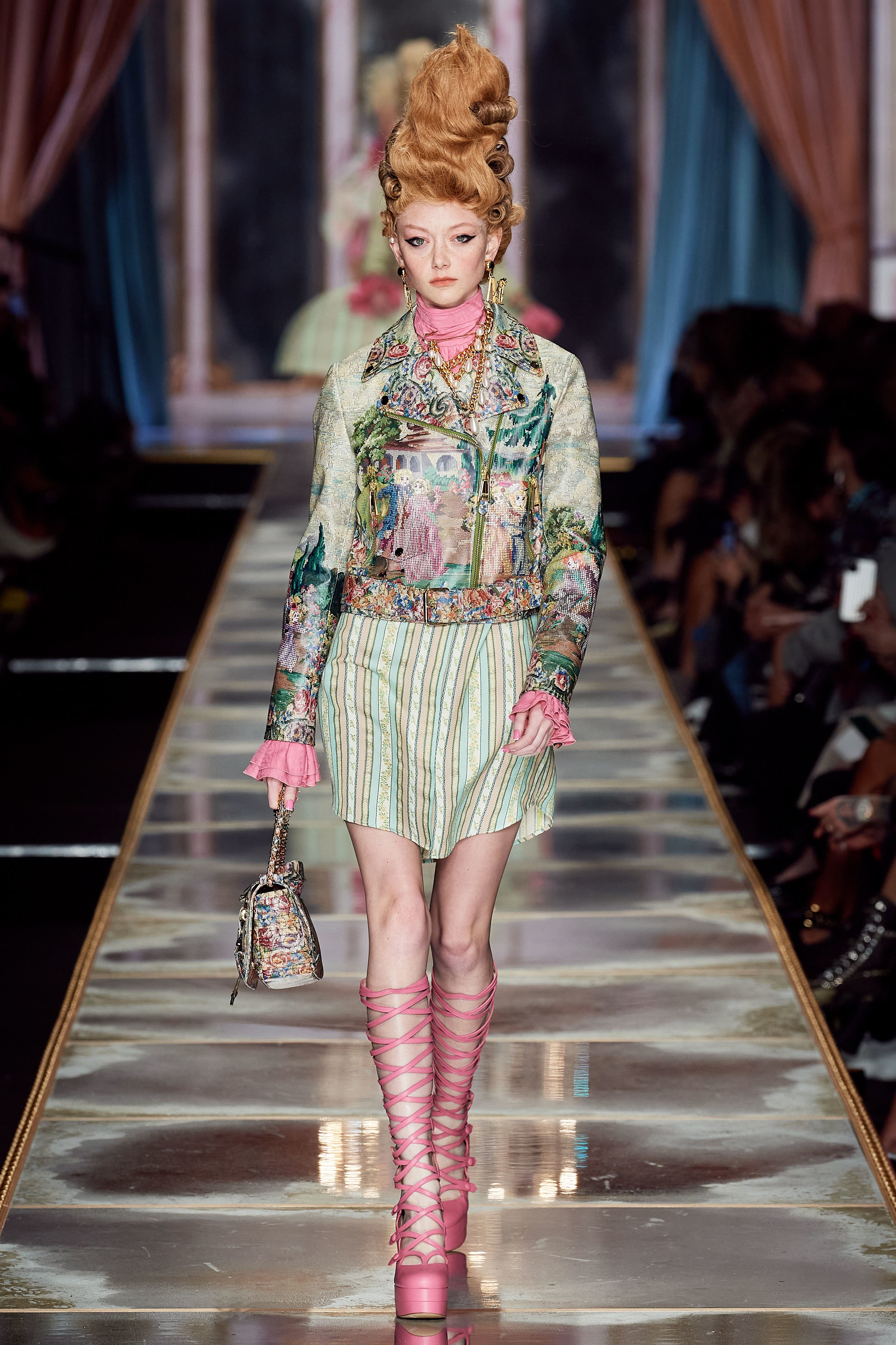 Пышная конструкция панье или кринолина — один из самых интересных и неожиданных трендов сезона. Модели, в том числе и Джиджи Хадид, выходили к гостям в высоких париках конфетных оттенков и платьях в духе рококо. Камзолы, зауженные кюлоты и фраки с богатой вышивкой также вошли в коллекцию. Дополнили всё платья в бантах с кружевами в стиле японских фрик-модниц токийского района Харадзюку и сумочки в виде сладостей.