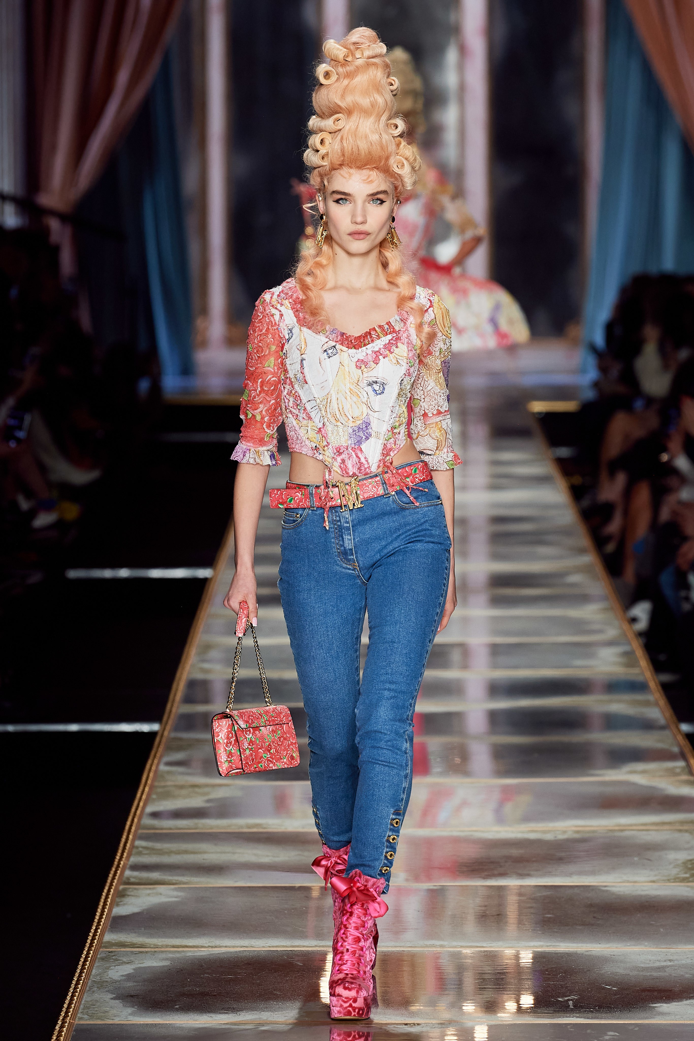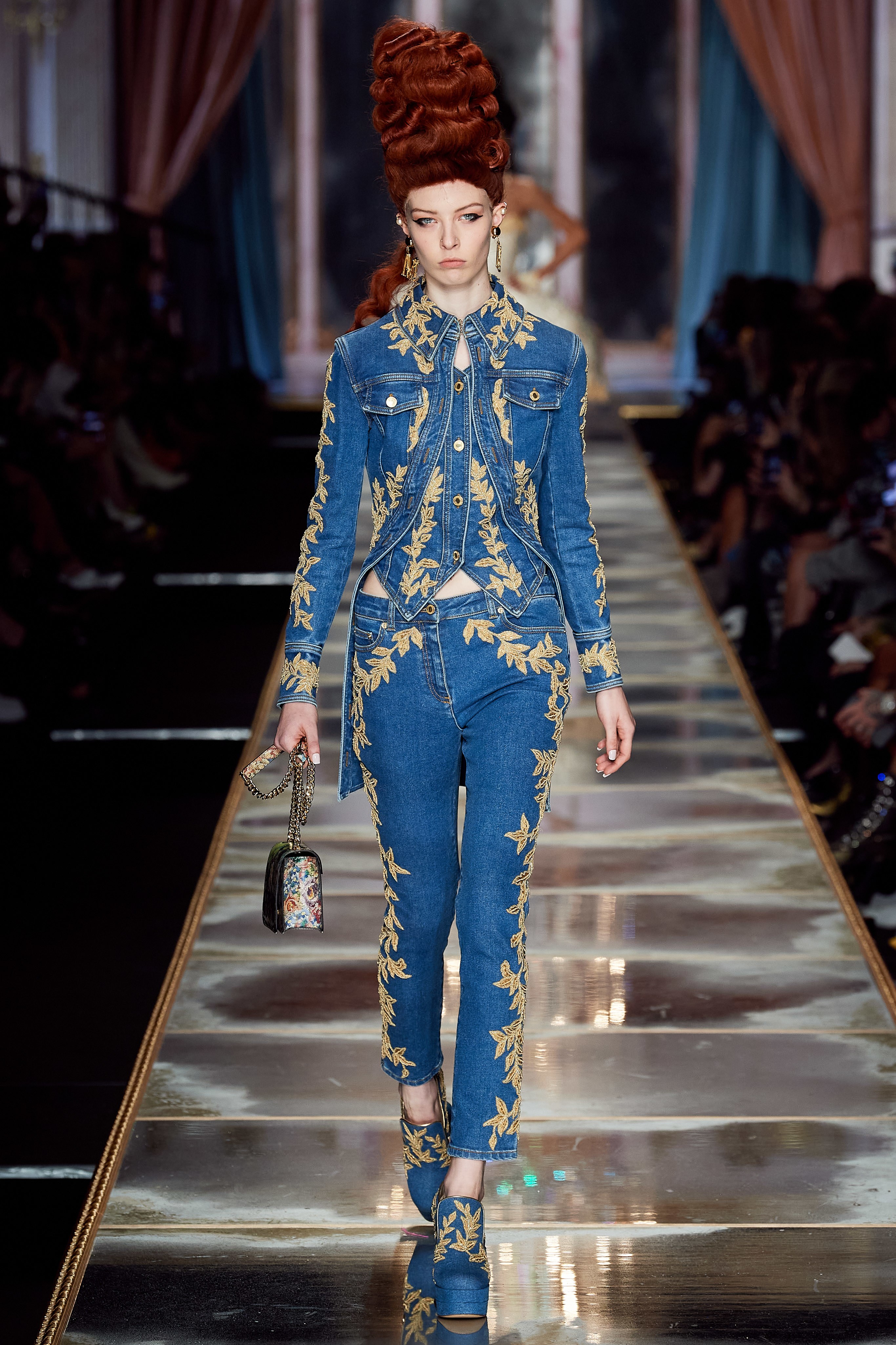 Ключевые элементы: каркасные платья из денима, расшитые золотой нитью, джинсовые юбки-кринолины, топы-корсеты, платья мини на бретелях, шнурованные сапоги на танкетках, жабо, костюмы из жаккарда, парки и куртки-косухи с аниме-принтом, маленькие гобеленовые сумочки.