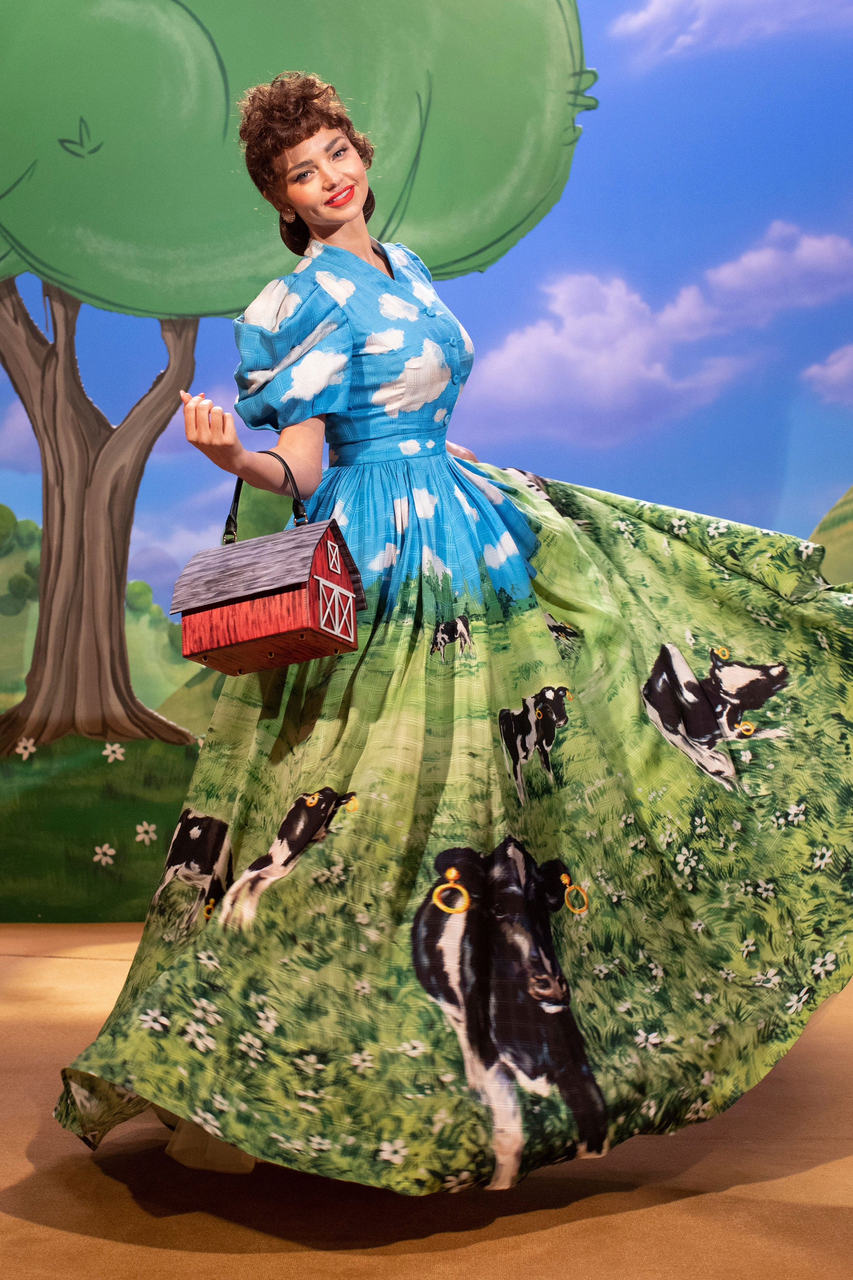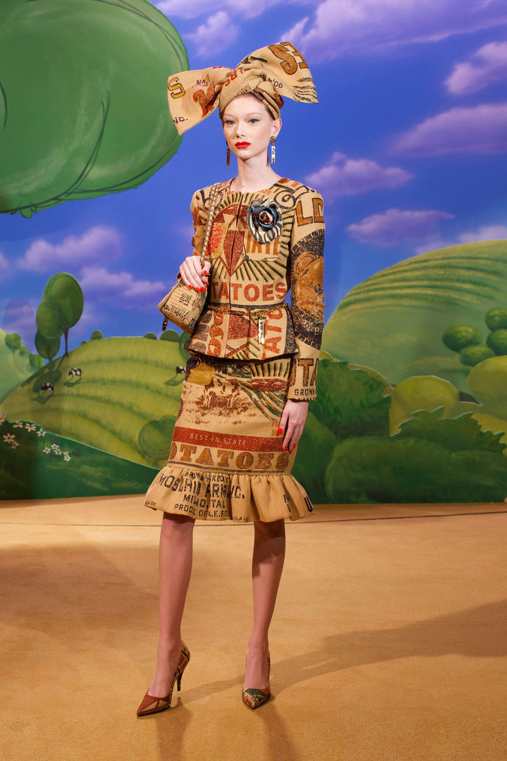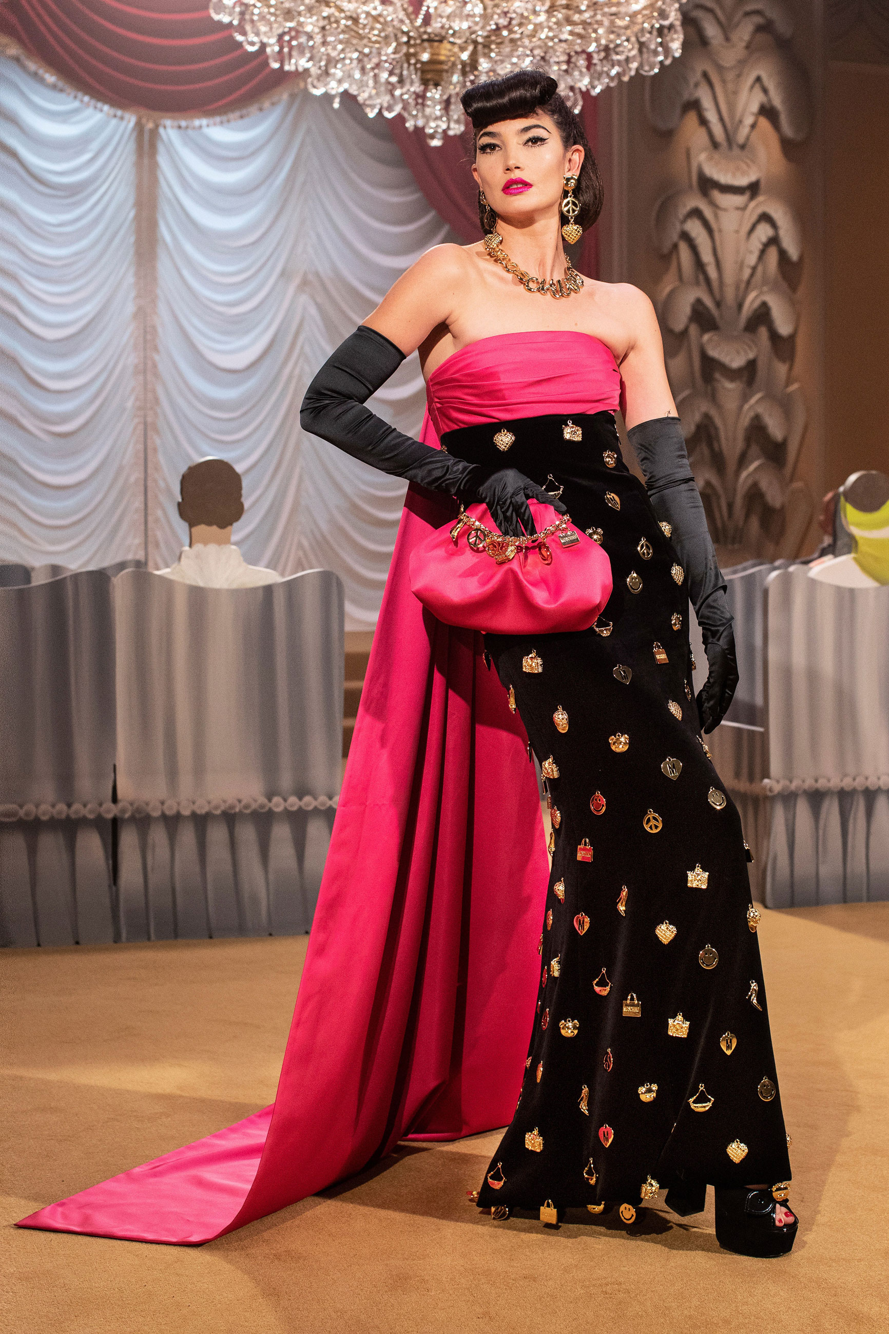 Театр Джереми Скотта приобрел небывалый размах гламура — на сцене с декорациями города и тропиков появлялись не только модели, изображающие героинь истории, но и ожившие фигуры из витрин магазинов, экзотические жирафы, зебры и тигры, кокетливо покачивающие головными уборами и хвостами, исследовательницы джунглей, ослепительные дивы в бальных и вечерних платьях и сошедшие с полотен в музеях картины. Звездные модели Шалом Харлоу, Миранда Керр, Карен Эльсон, Уинни Харлоу, Хейли Бибер и Precious Lee представили одежду для всех тех занятий, которых мы были лишены из-за карантина: путешествий, активного бизнеса, шопинга, походов в салон или на прием. Эмбер Валлетта вышла в образе золотистого аллигатора в сияющем костюме с "драконьим" шлейфом. Салонное шоу вела Мэй Маск в элегантном черном костюме и белоснежной блузе. Образы в духе золотой эпохи пин-апа дизайнер усилил при помощи доброй иронии, за которую мы любим Moschino: деловой костюм в полоску опоясывает огромный галстук, бальное платье и аристократичный кейп дополнены корзиной для пикника и принтом с зеленой лужайкой и коровами, а клатчи выглядят как сложенные пополам газеты. Настоящим сюрпризом для зрителей стало появление на сцене Диты фон Тиз в образе червовой дамы, в короне в виде сердца и облегающем платье, которое пикантно обнажило ягодицы звезды бурлеска, когда она покидала подиум.