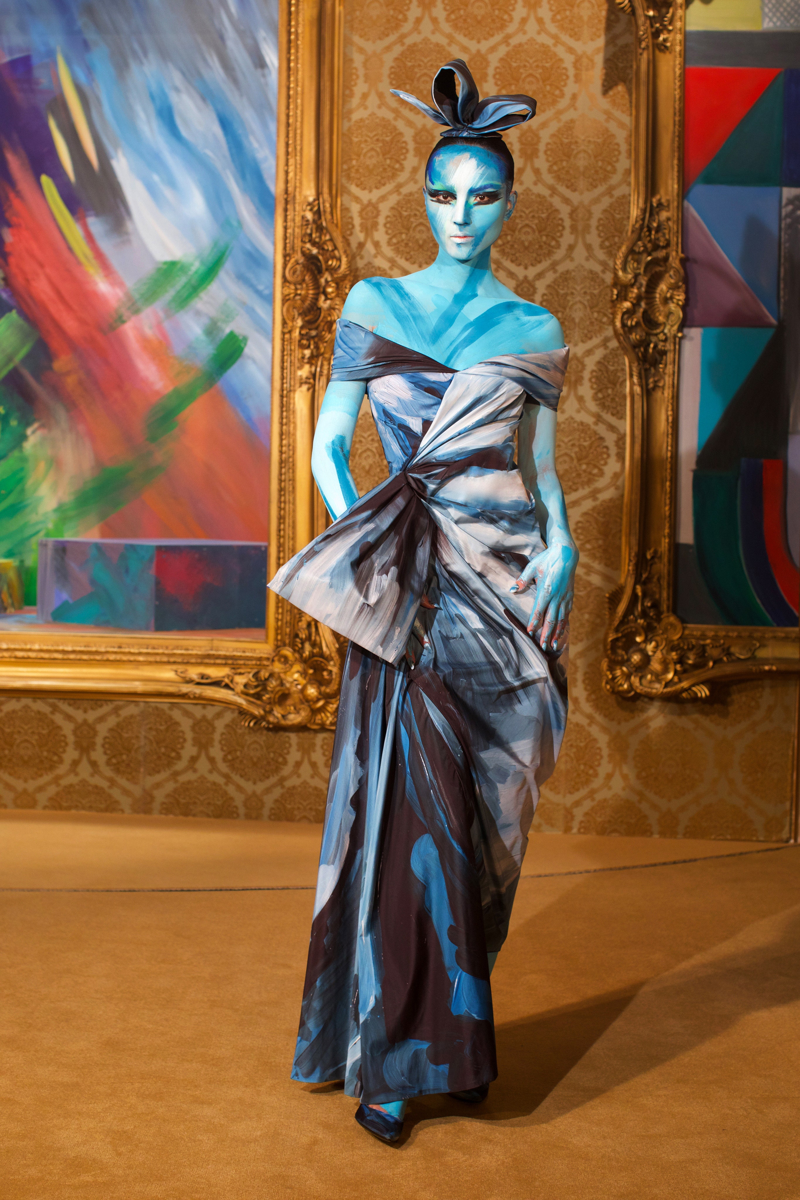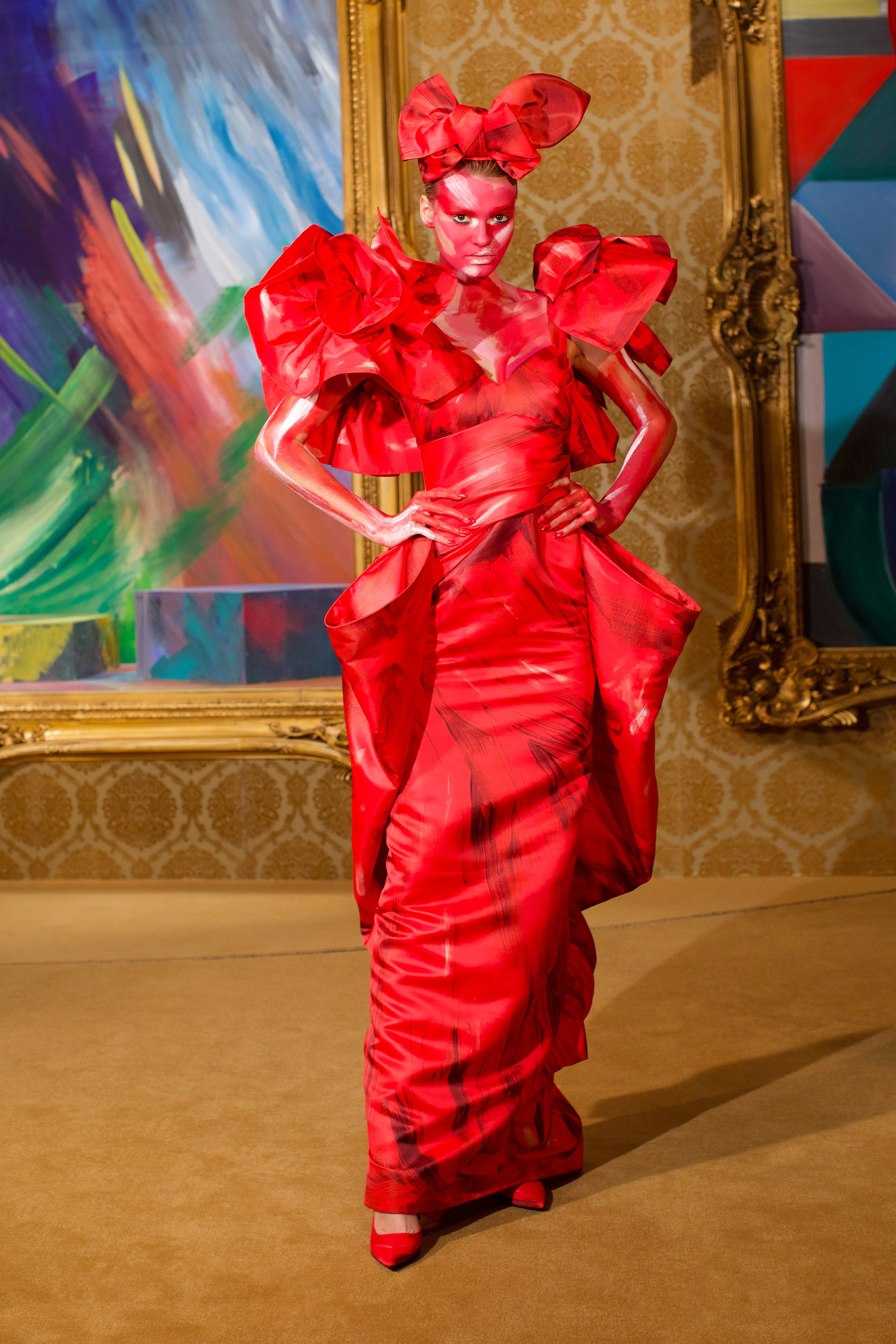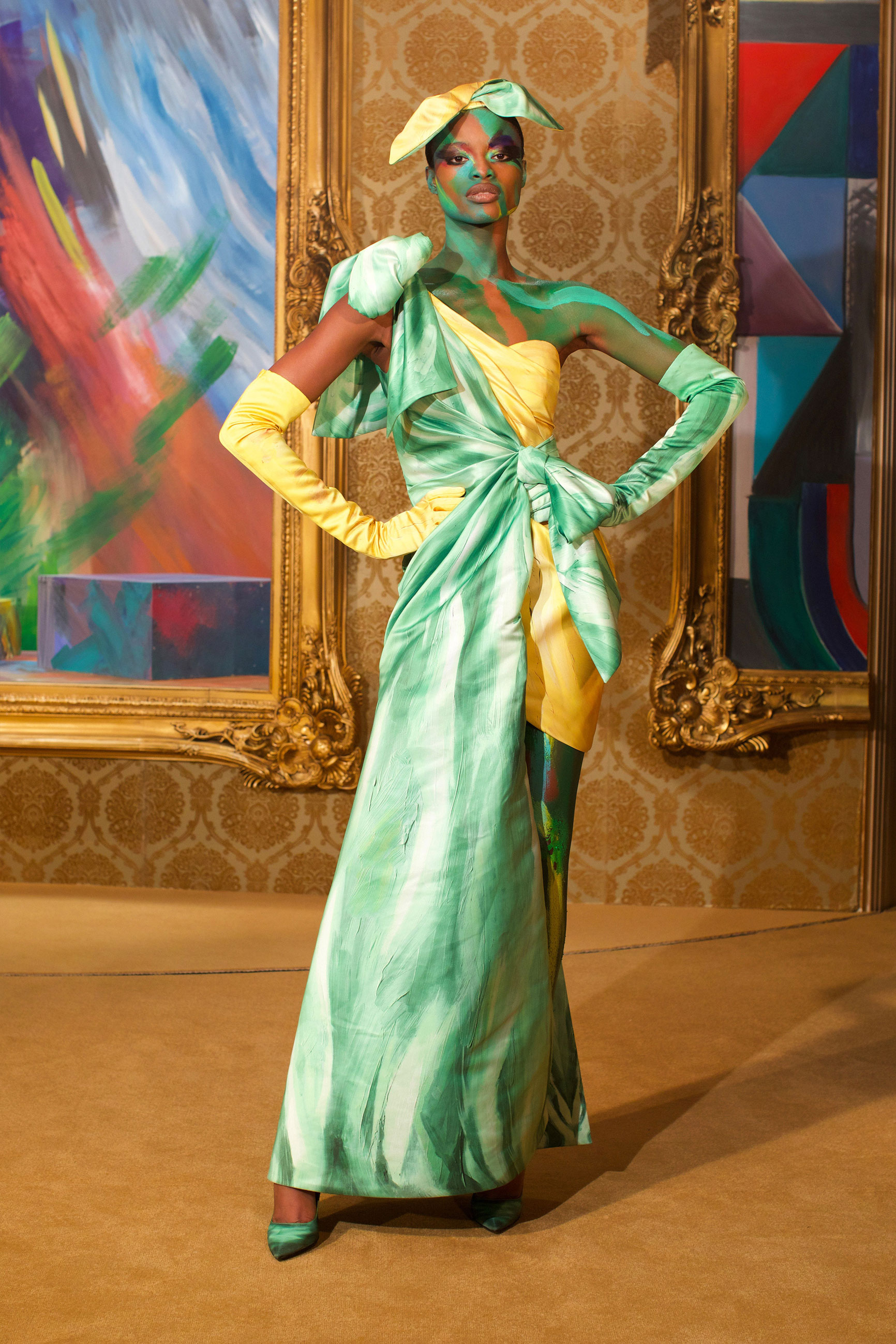 Театр Джереми Скотта приобрел небывалый размах гламура — на сцене с декорациями города и тропиков появлялись не только модели, изображающие героинь истории, но и ожившие фигуры из витрин магазинов, экзотические жирафы, зебры и тигры, кокетливо покачивающие головными уборами и хвостами, исследовательницы джунглей, ослепительные дивы в бальных и вечерних платьях и сошедшие с полотен в музеях картины. Звездные модели Шалом Харлоу, Миранда Керр, Карен Эльсон, Уинни Харлоу, Хейли Бибер и Precious Lee представили одежду для всех тех занятий, которых мы были лишены из-за карантина: путешествий, активного бизнеса, шопинга, походов в салон или на прием. Эмбер Валлетта вышла в образе золотистого аллигатора в сияющем костюме с "драконьим" шлейфом. Салонное шоу вела Мэй Маск в элегантном черном костюме и белоснежной блузе. Образы в духе золотой эпохи пин-апа дизайнер усилил при помощи доброй иронии, за которую мы любим Moschino: деловой костюм в полоску опоясывает огромный галстук, бальное платье и аристократичный кейп дополнены корзиной для пикника и принтом с зеленой лужайкой и коровами, а клатчи выглядят как сложенные пополам газеты. Настоящим сюрпризом для зрителей стало появление на сцене Диты фон Тиз в образе червовой дамы, в короне в виде сердца и облегающем платье, которое пикантно обнажило ягодицы звезды бурлеска, когда она покидала подиум.