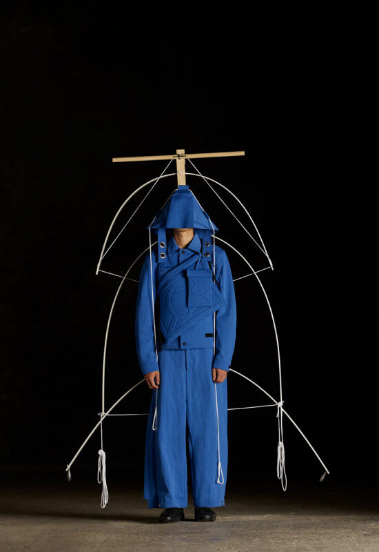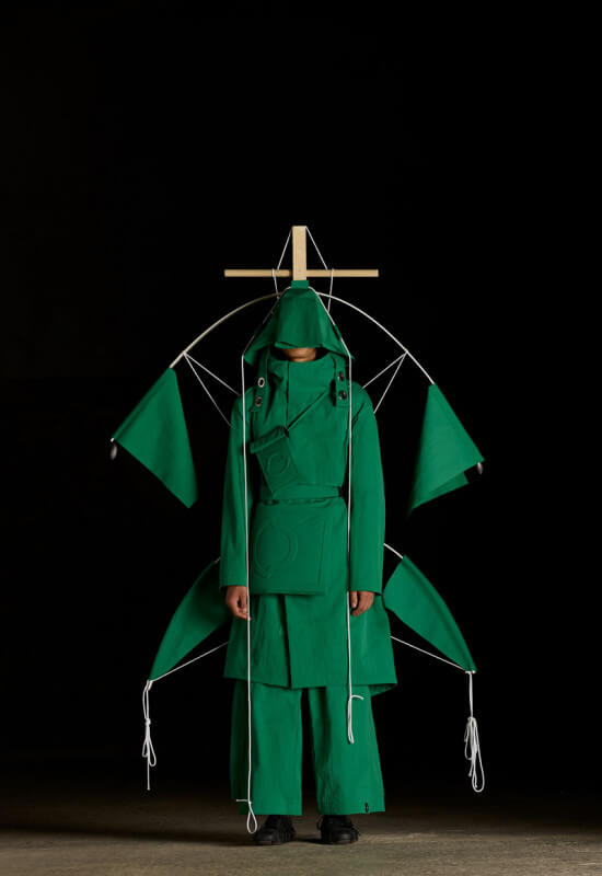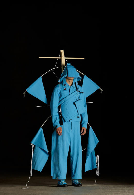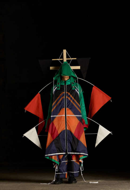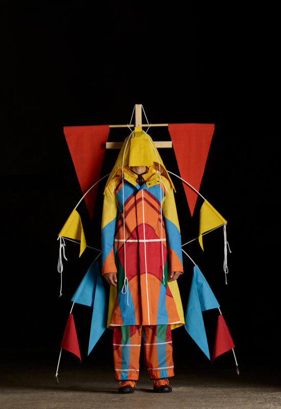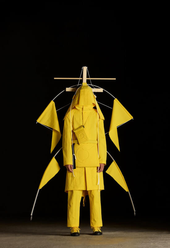 В коллекцию вошли вещи из сверхлегких материалов палитры первичных цветов как в работах Мондриана и других неопластицистов — желтого, красного и голубого. “Грин подходит к одежде прагматично, как к архитектурному объекту. Экстремальная форма появляется в ответ на потребности и выполняет свои функции”, — говорится в заявлении бренда.