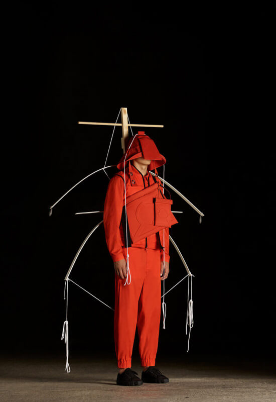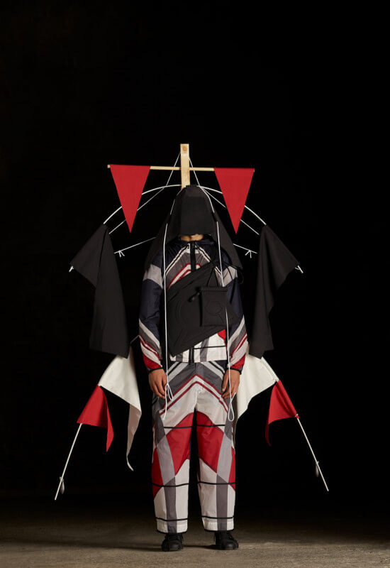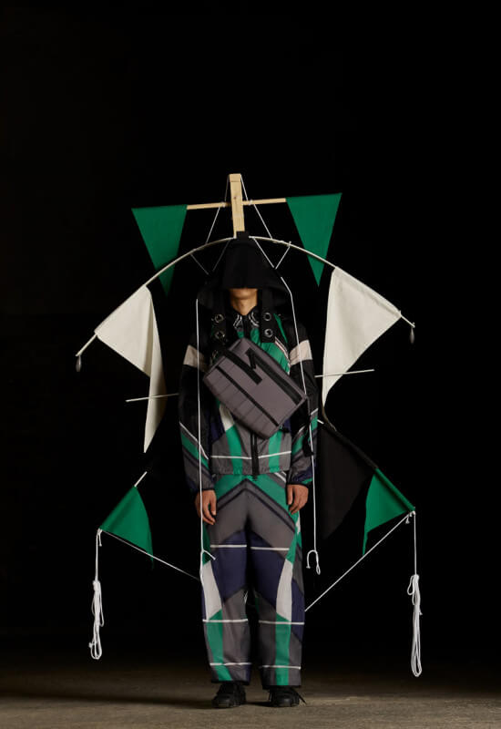 Креативный директор Moncler Крейг Грин продолжает развивать идеи защиты и перформанса, которые стали основой его первой коллекции для бренда. В рамках второй части проекта Moncler Genius Грин создал кинетические скульптуры, которые показывают одежду бренда. Железные инсталляции, напоминающие не то летающего змея, не то парус корабля, двигаются под музыку из фильмов ужасов.