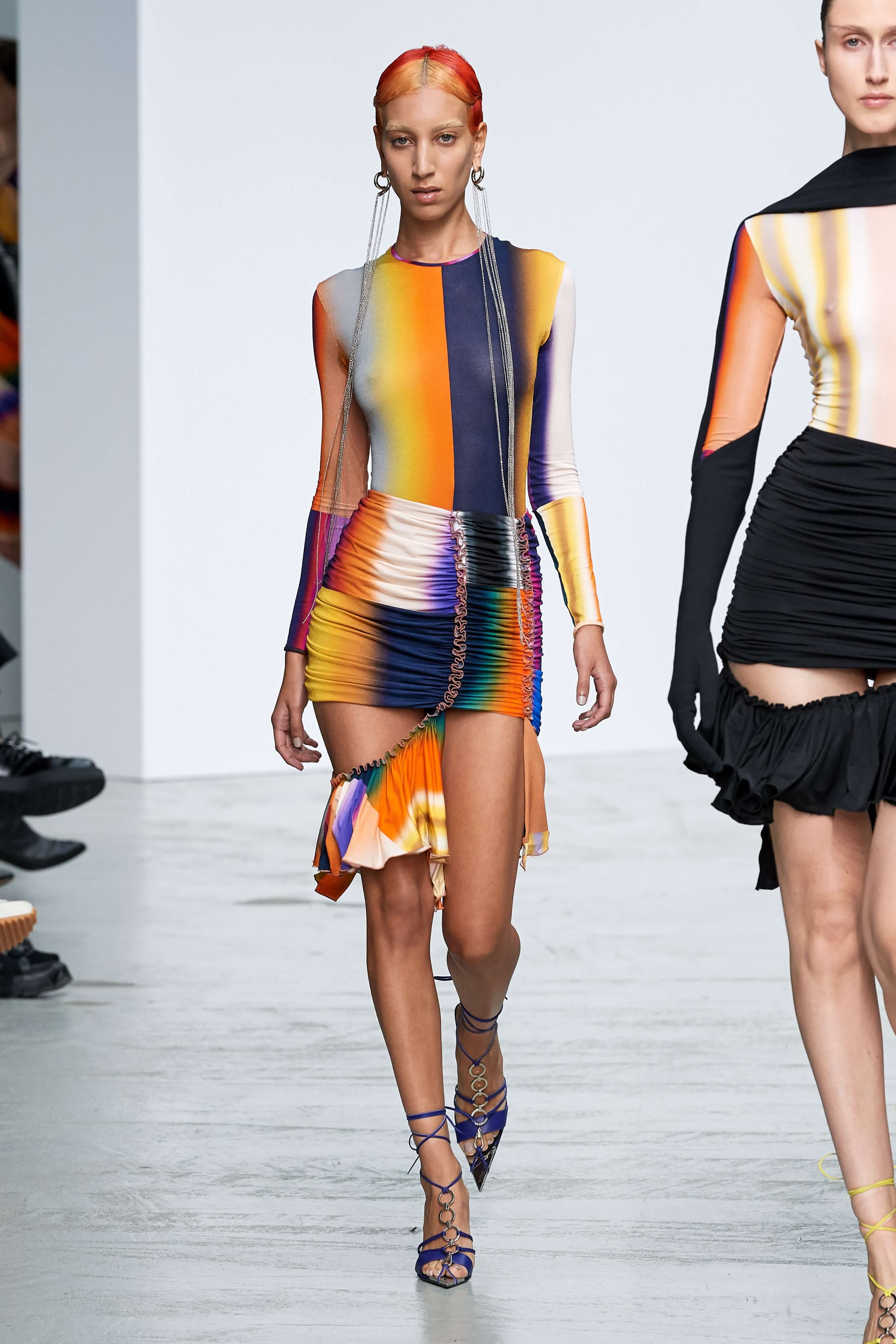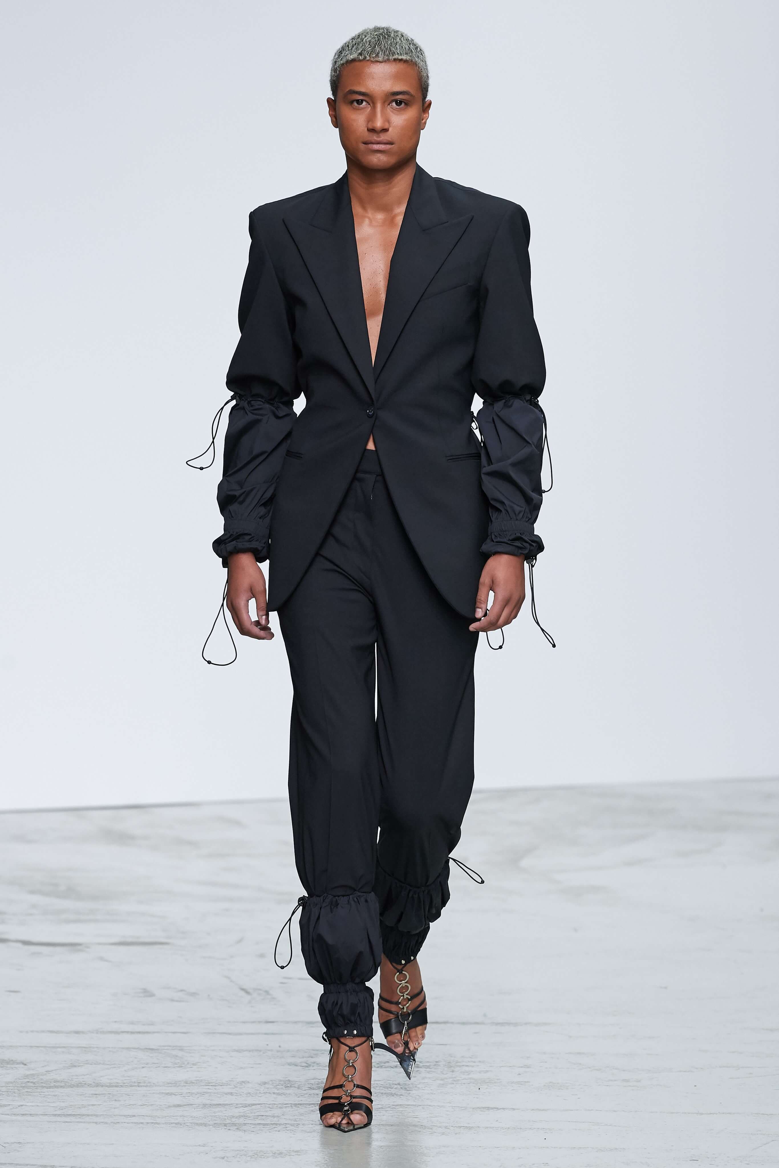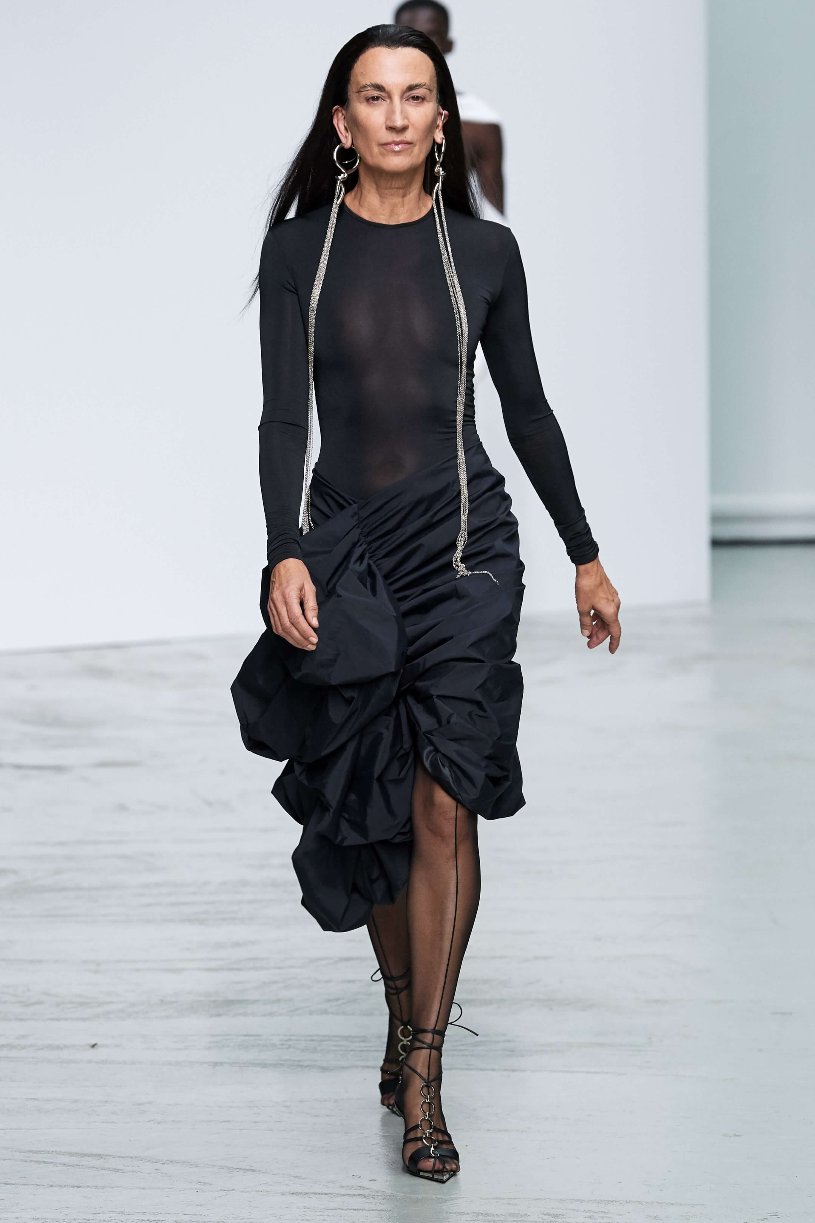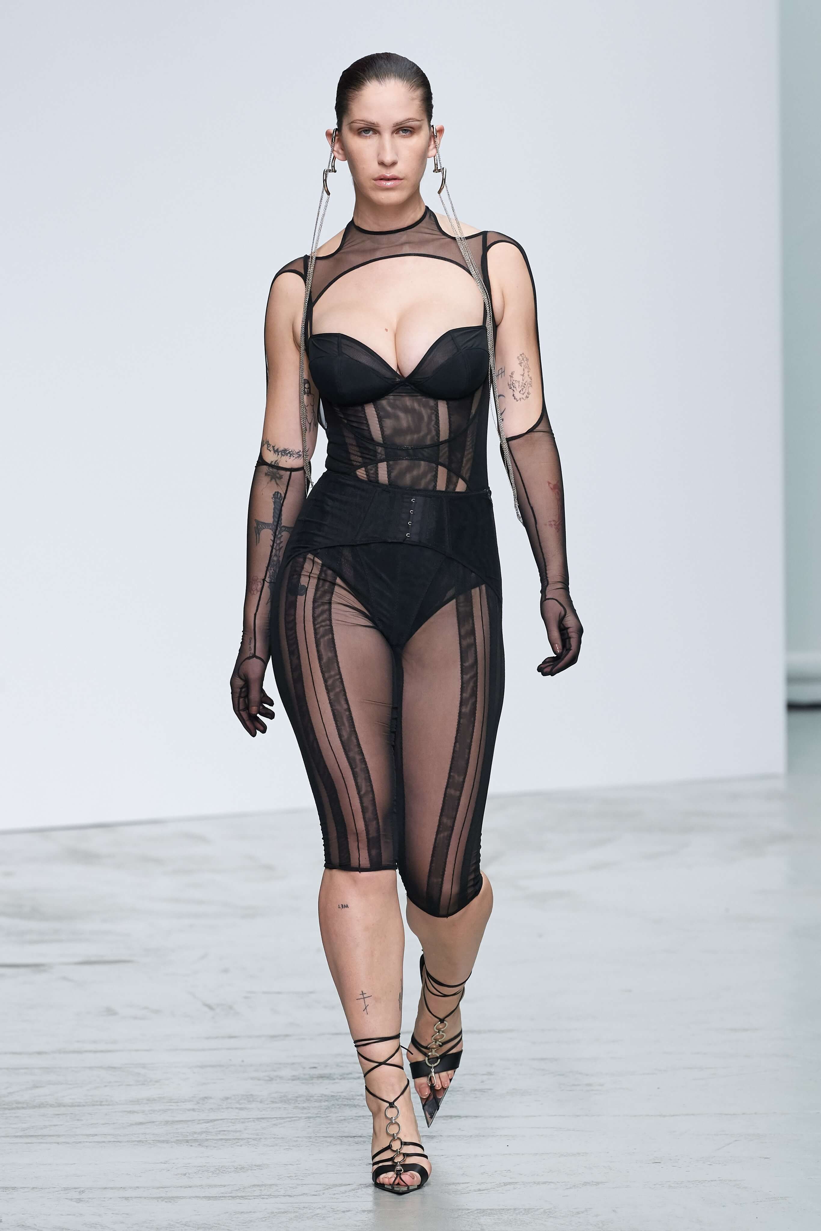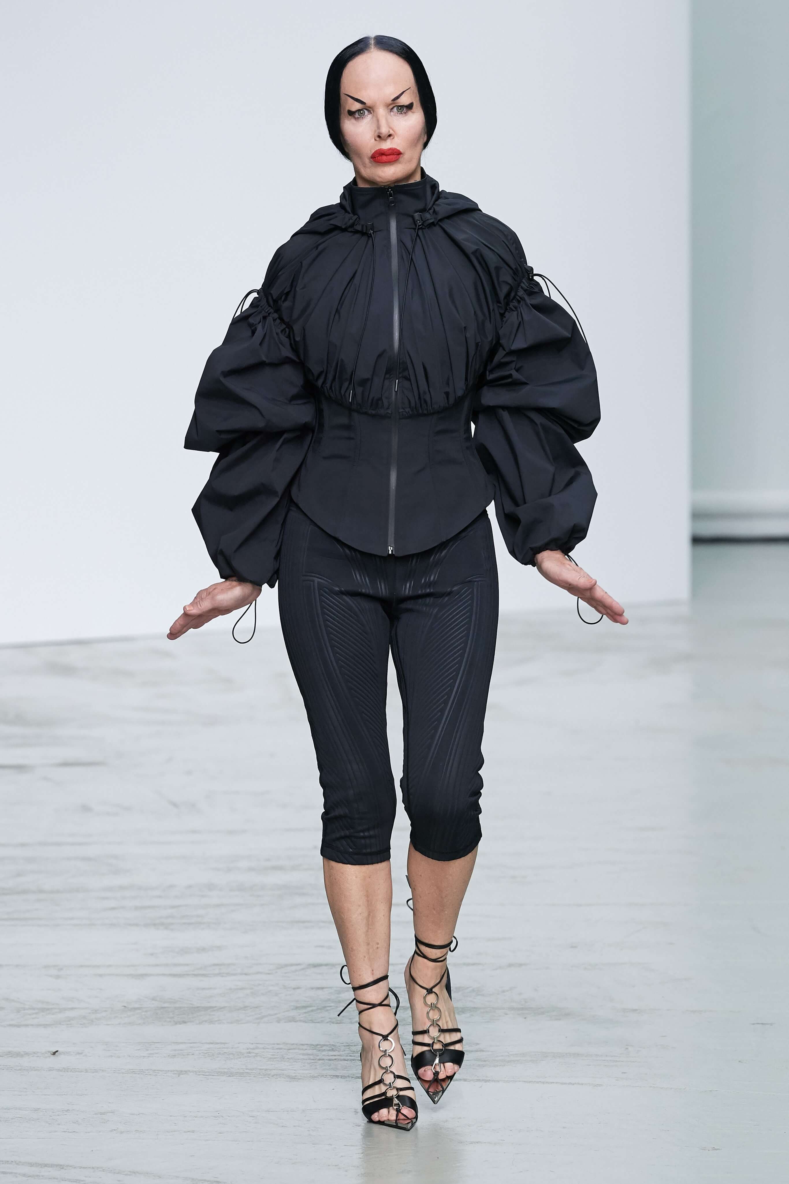 Однако не менее важным, чем сама коллекция, стал кастинг показа. Люди разного возраста, цвета, убеждений и национальностей выглядели интригующе и притягательно в обрамлении интеллектуального гламура от Mugler. А самым неожиданным и волнительным для ценителей контркультур стало появление культовой художницы, модели и артистки Кембры Пфалер. В первую очередь Кембра известна своей глэм-хоррор-панк-группой The Voluptuous Horror of Karen Black, провокационно-сексуальными выступлениями и выставками. На подиум Пфалер вышла в парке викторианского силуэта, с корсетом и стянутыми спортивными кулисками рукавами.