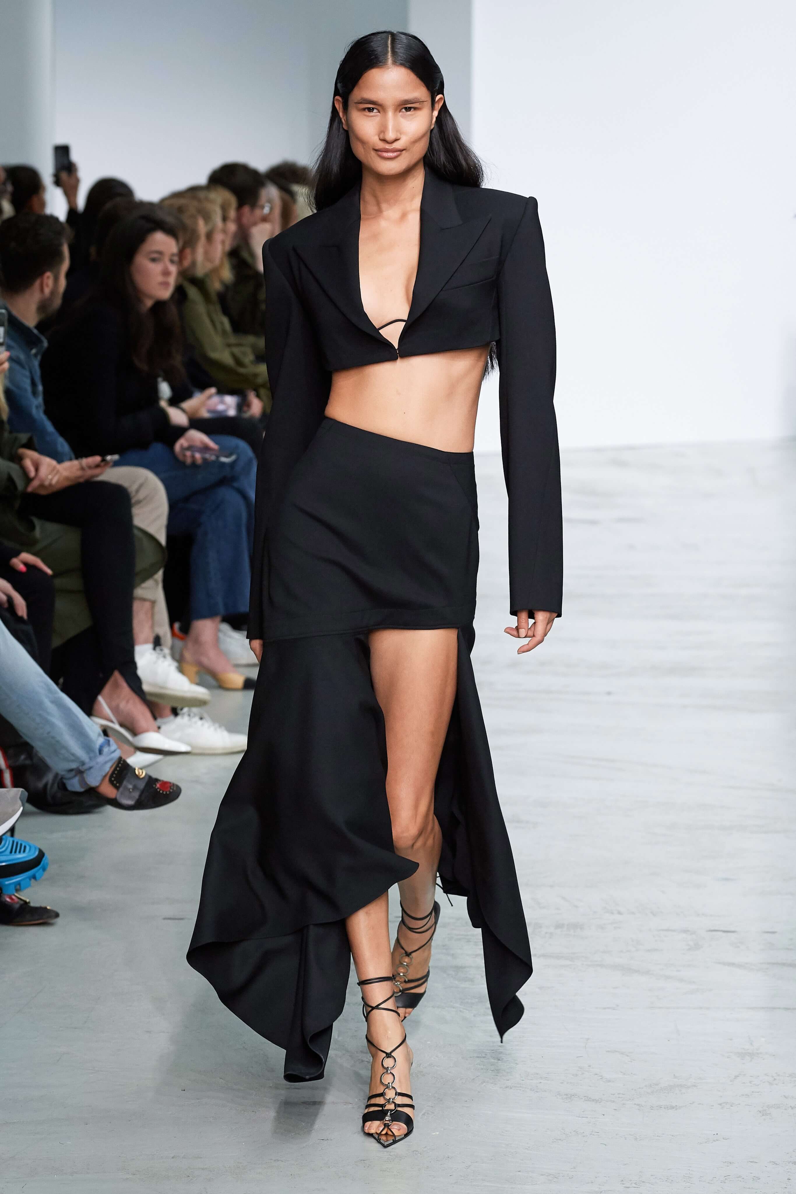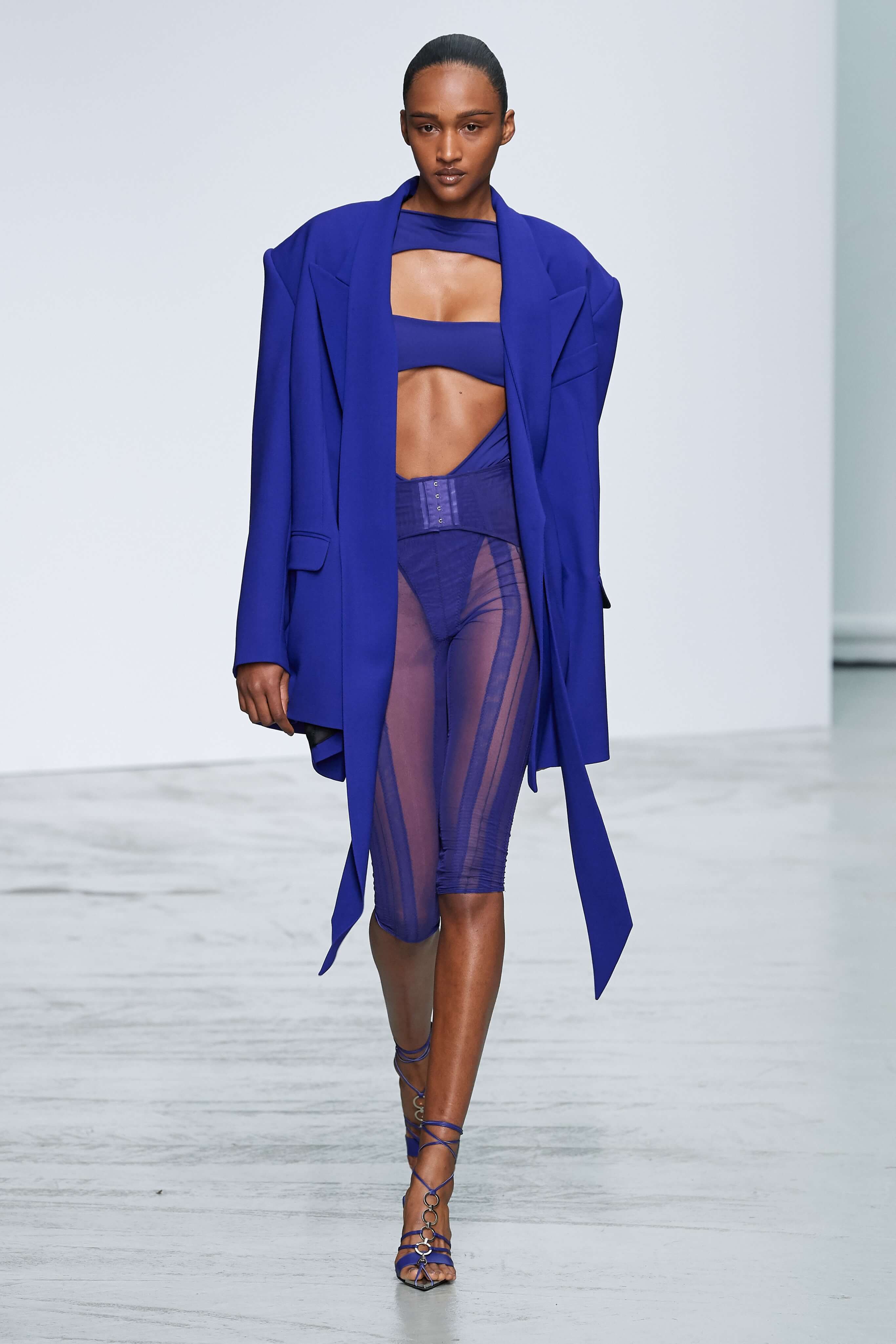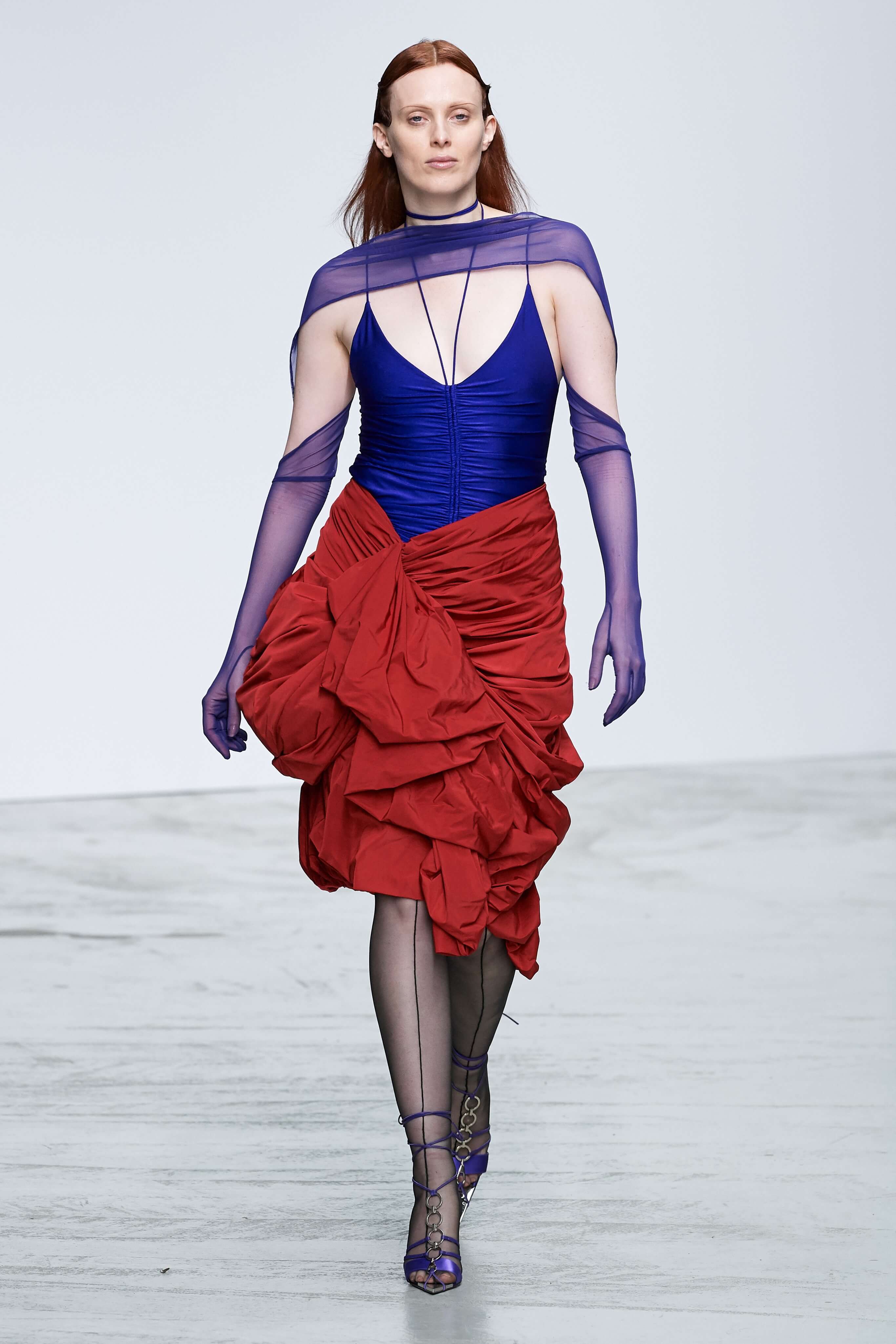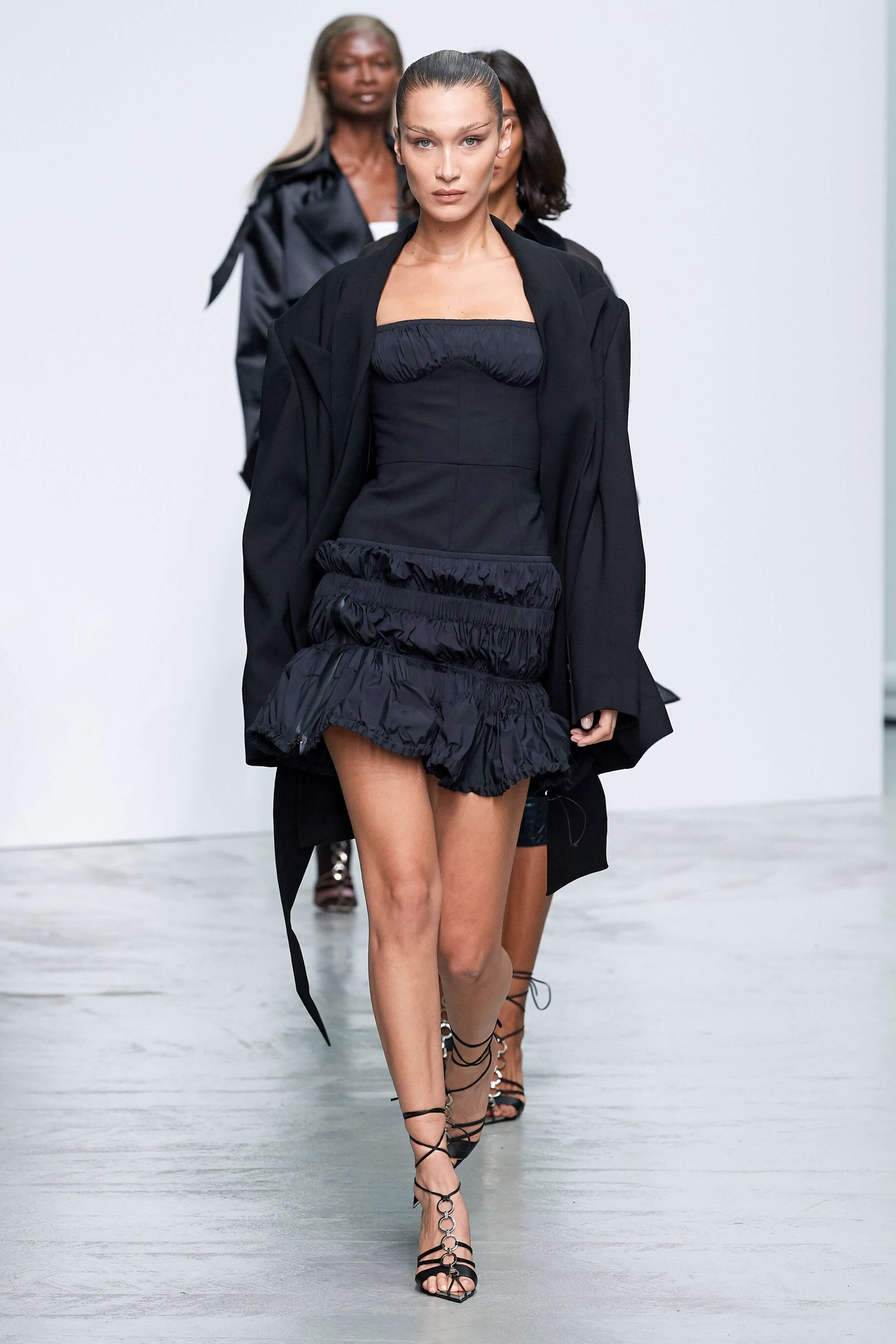 Супермодель Белла Хадид открыла показ в нательном, плотно облегающем прозрачном костюме из легинсов и корсета и укороченном жакете с острыми плечами. Следом за ней появилась модель в велосипедных легинсах с тиснением и воздушной блузе с пышными барочными рукавами, а за ней — девушка в белом жакете чистого силуэта и с перемычкой на груди. Все вещи в коллекции так или иначе объединяют в себе неуловимую сексуальность и интеллигентный шик. Блестящие атласные пальто, жакеты с прозрачными вставками, скульптурные костюмы и платья электрического синего оттенка, викторианские блузы из голубого шелка и футуристичные радужные лонгсливы и комбидрессы дополняли образы с готическими корсетными костюмами и перчатками, переплетающими грудь.