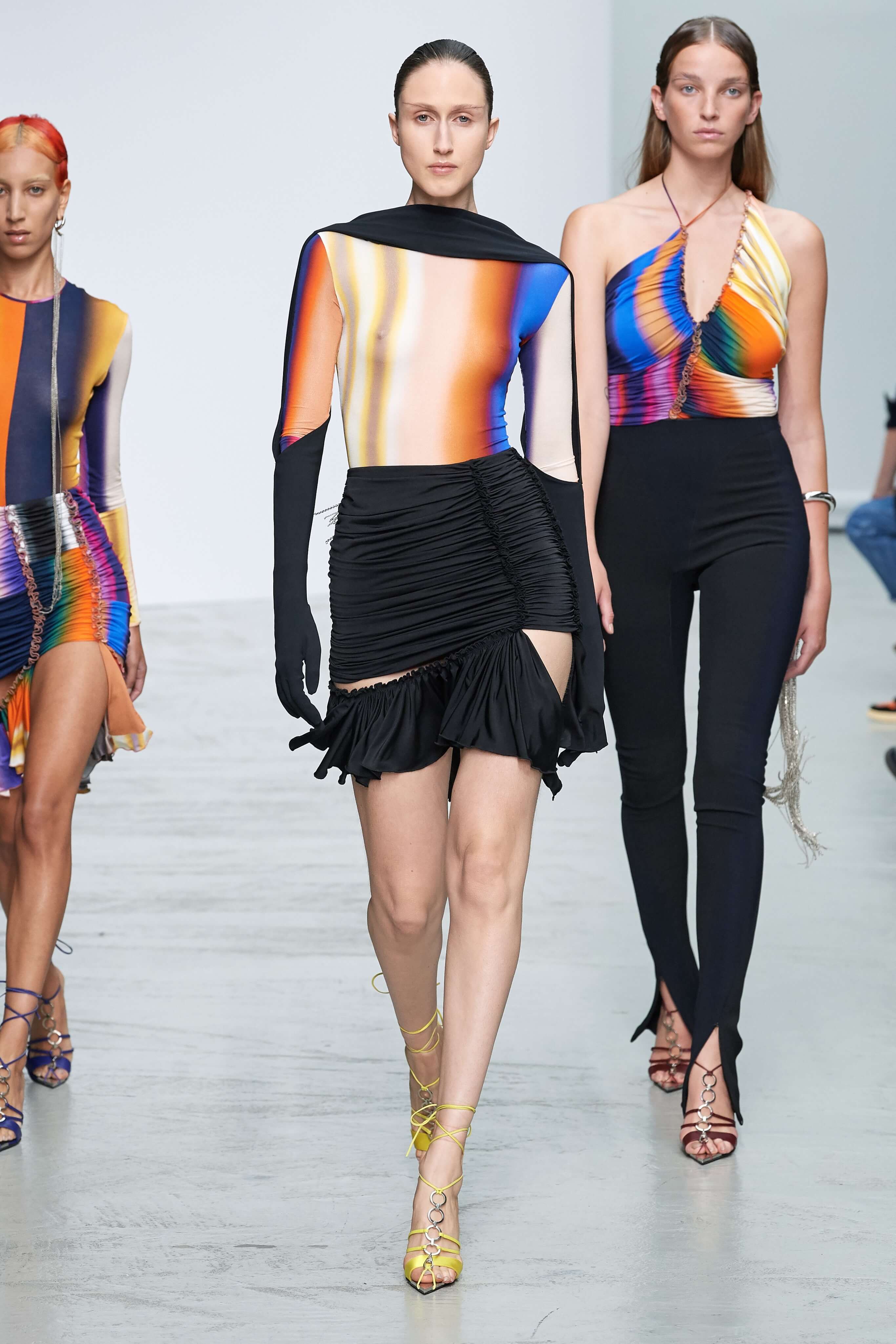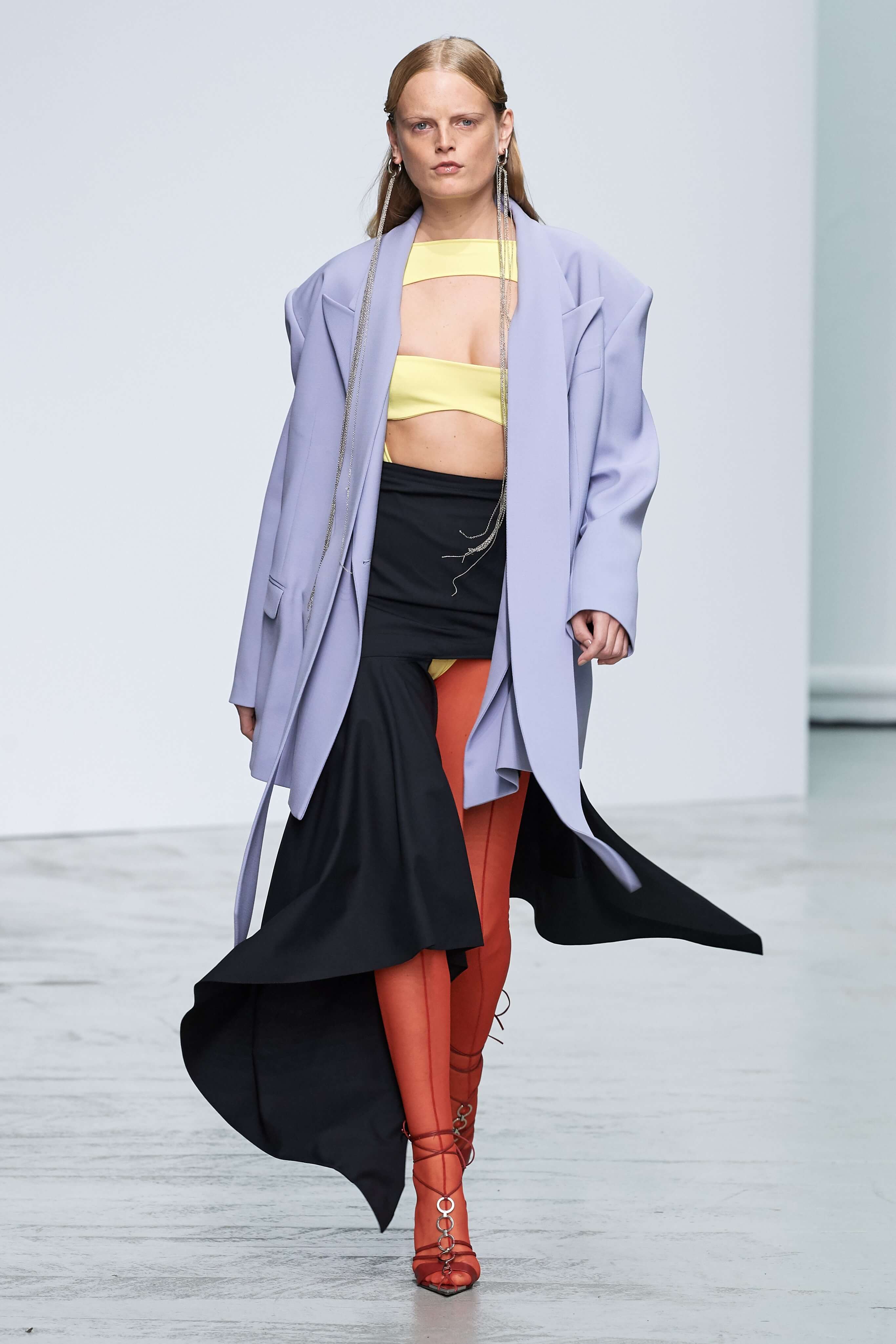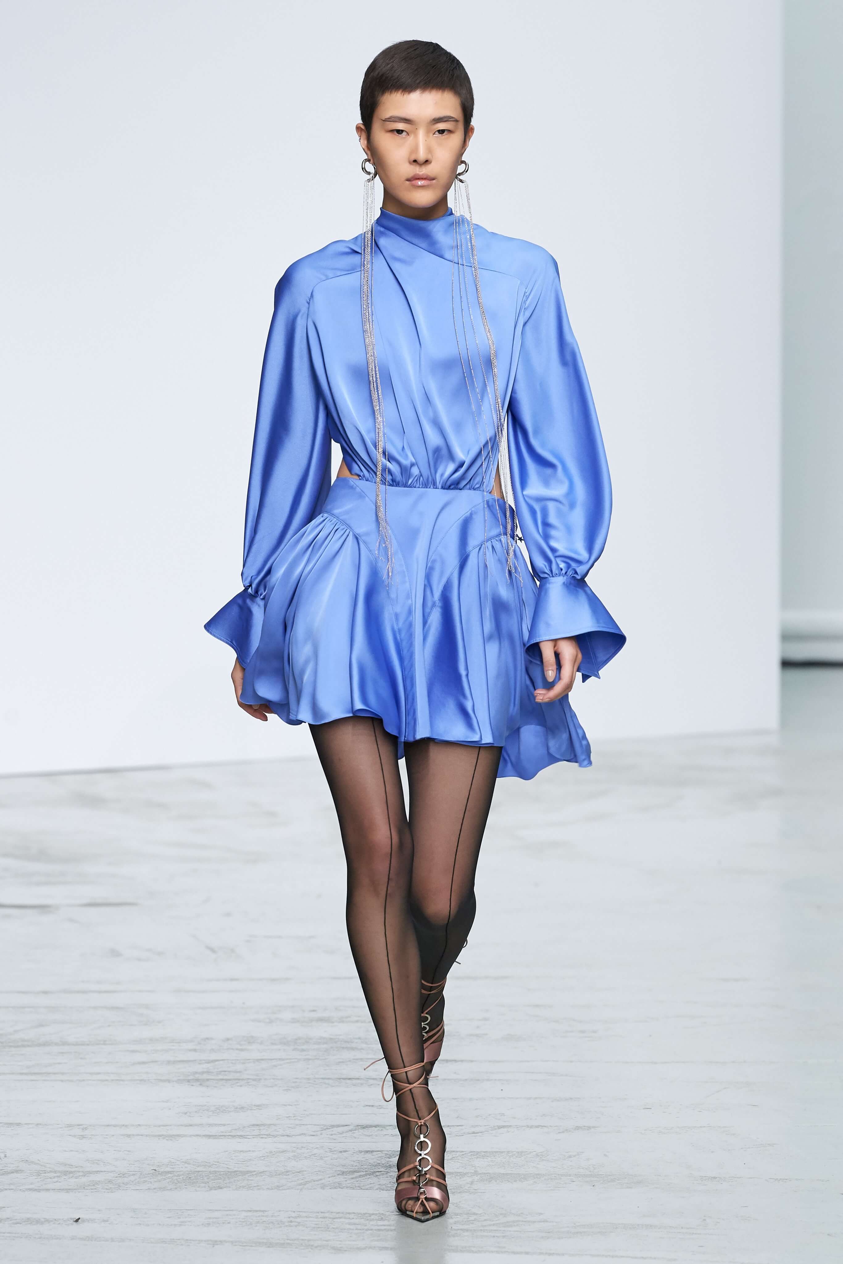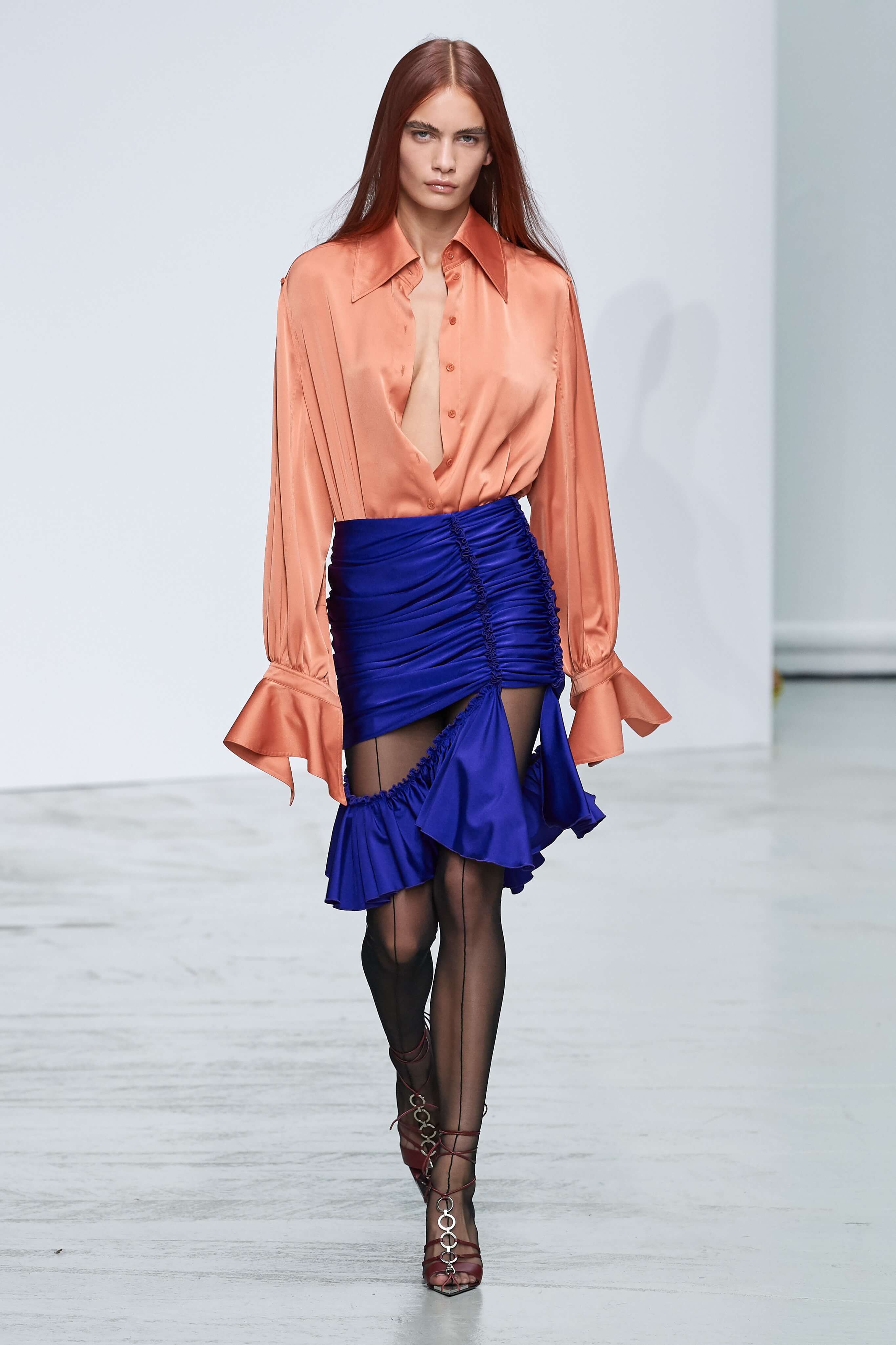 Супермодель Белла Хадид открыла показ в нательном, плотно облегающем прозрачном костюме из легинсов и корсета и укороченном жакете с острыми плечами. Следом за ней появилась модель в велосипедных легинсах с тиснением и воздушной блузе с пышными барочными рукавами, а за ней — девушка в белом жакете чистого силуэта и с перемычкой на груди. Все вещи в коллекции так или иначе объединяют в себе неуловимую сексуальность и интеллигентный шик. Блестящие атласные пальто, жакеты с прозрачными вставками, скульптурные костюмы и платья электрического синего оттенка, викторианские блузы из голубого шелка и футуристичные радужные лонгсливы и комбидрессы дополняли образы с готическими корсетными костюмами и перчатками, переплетающими грудь.