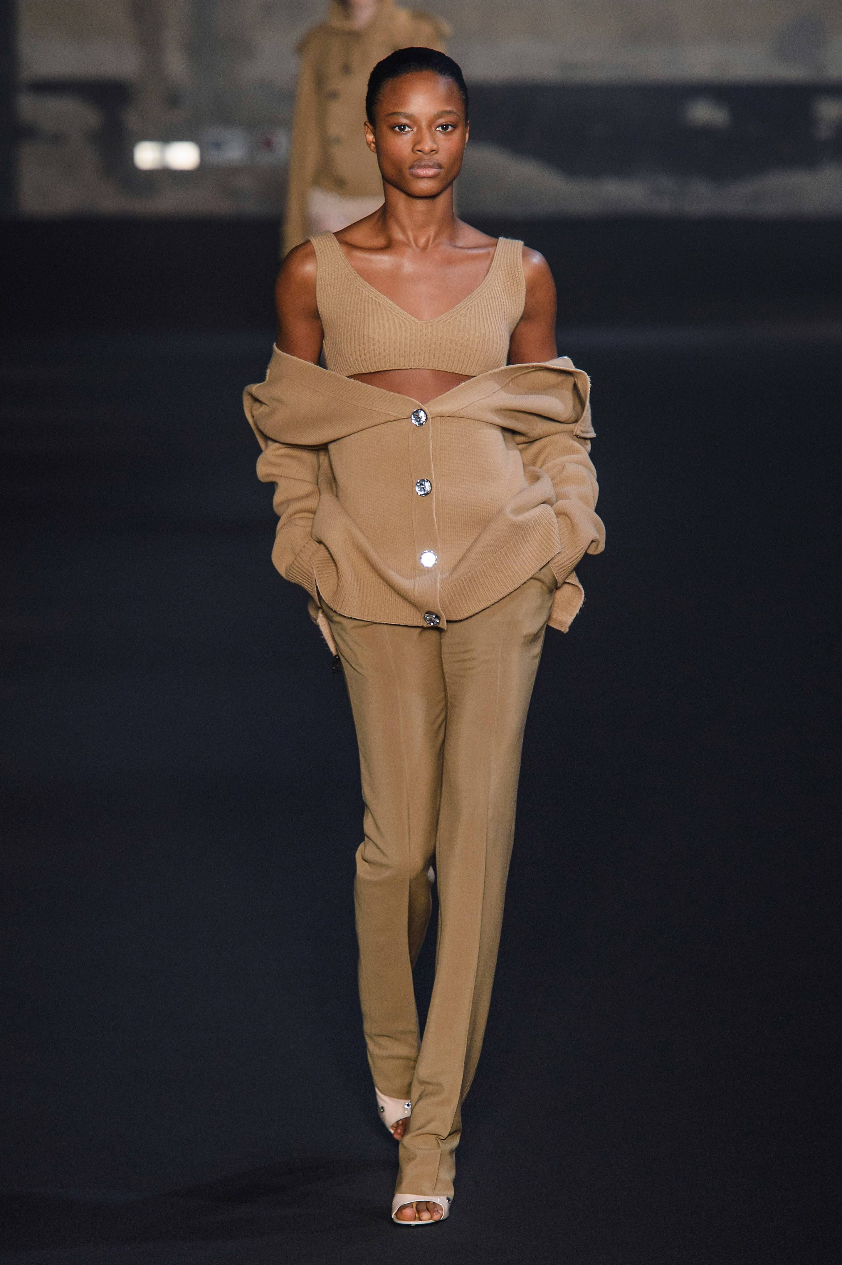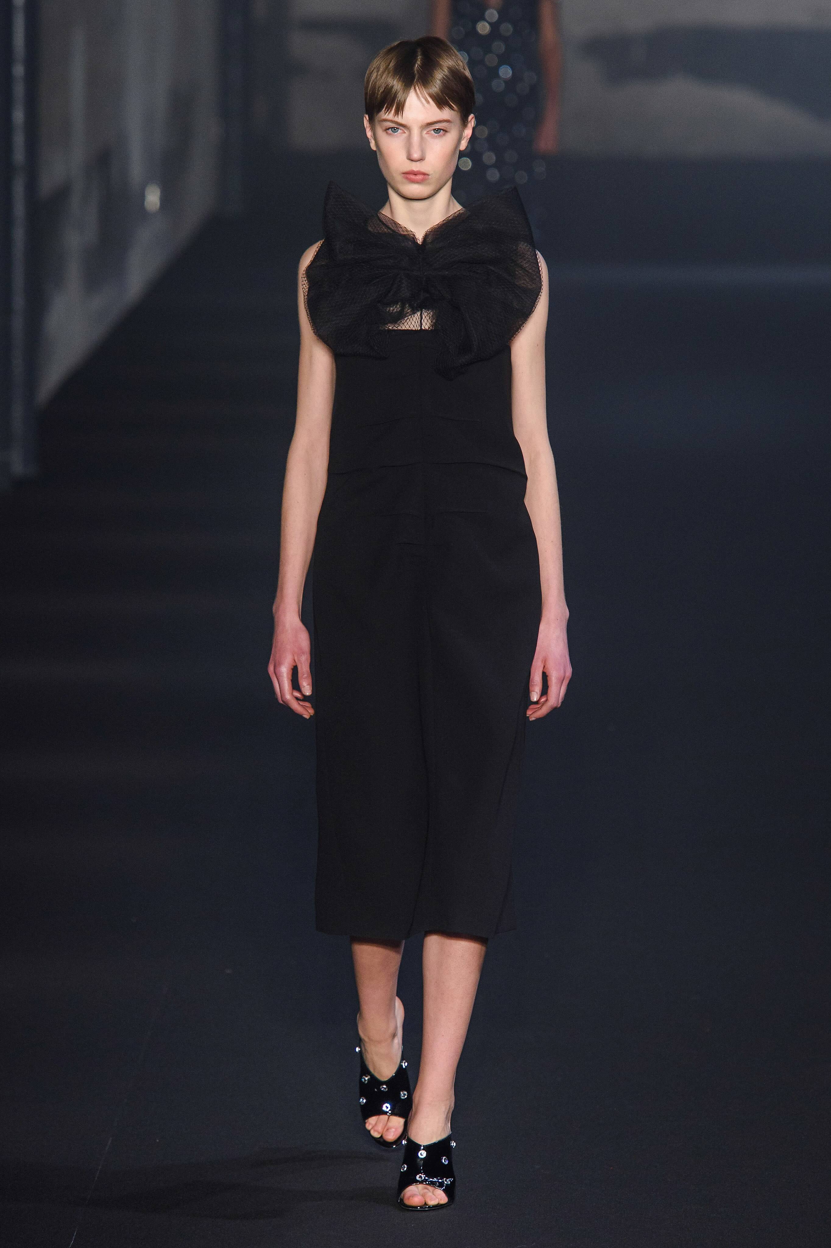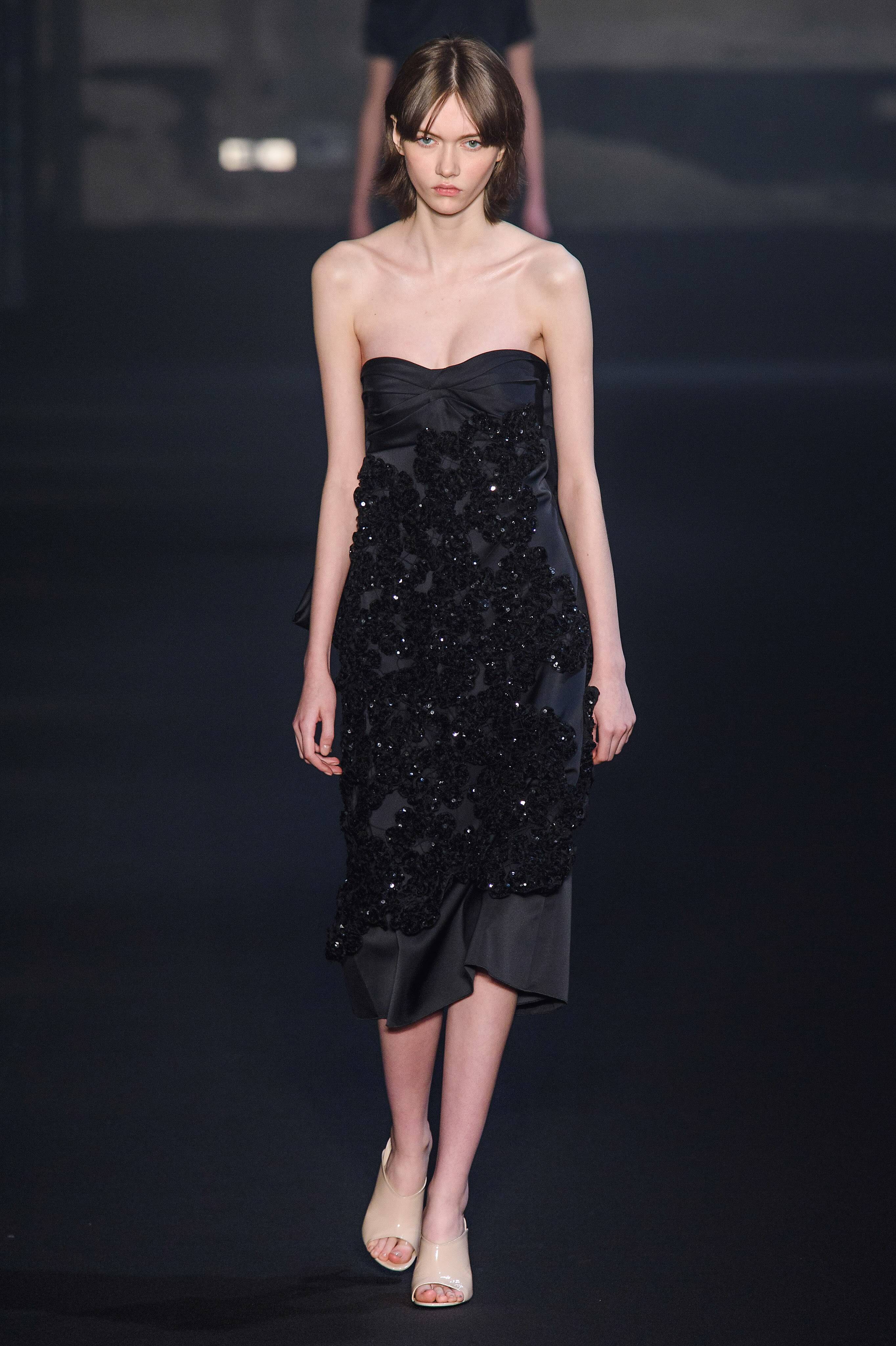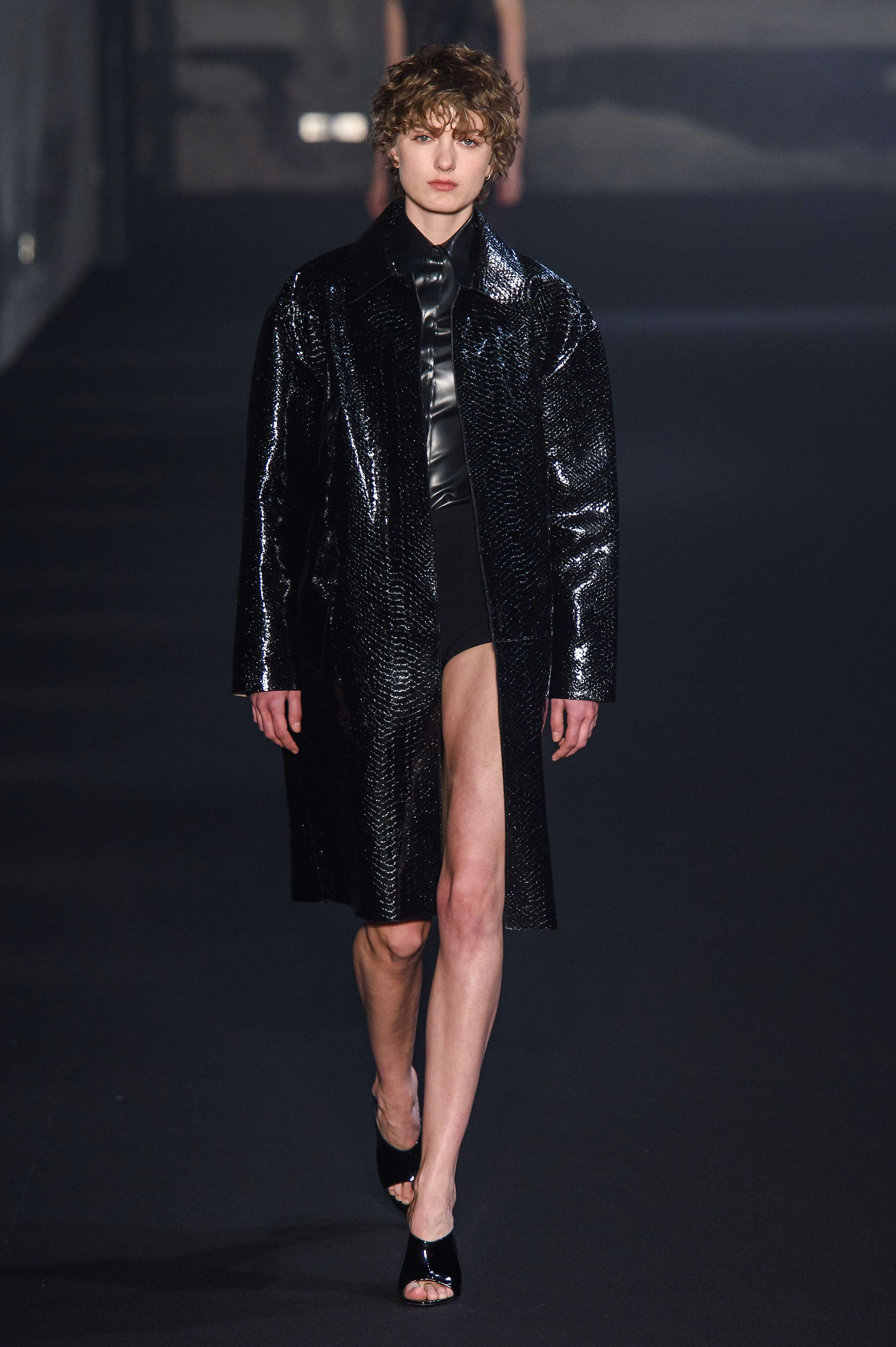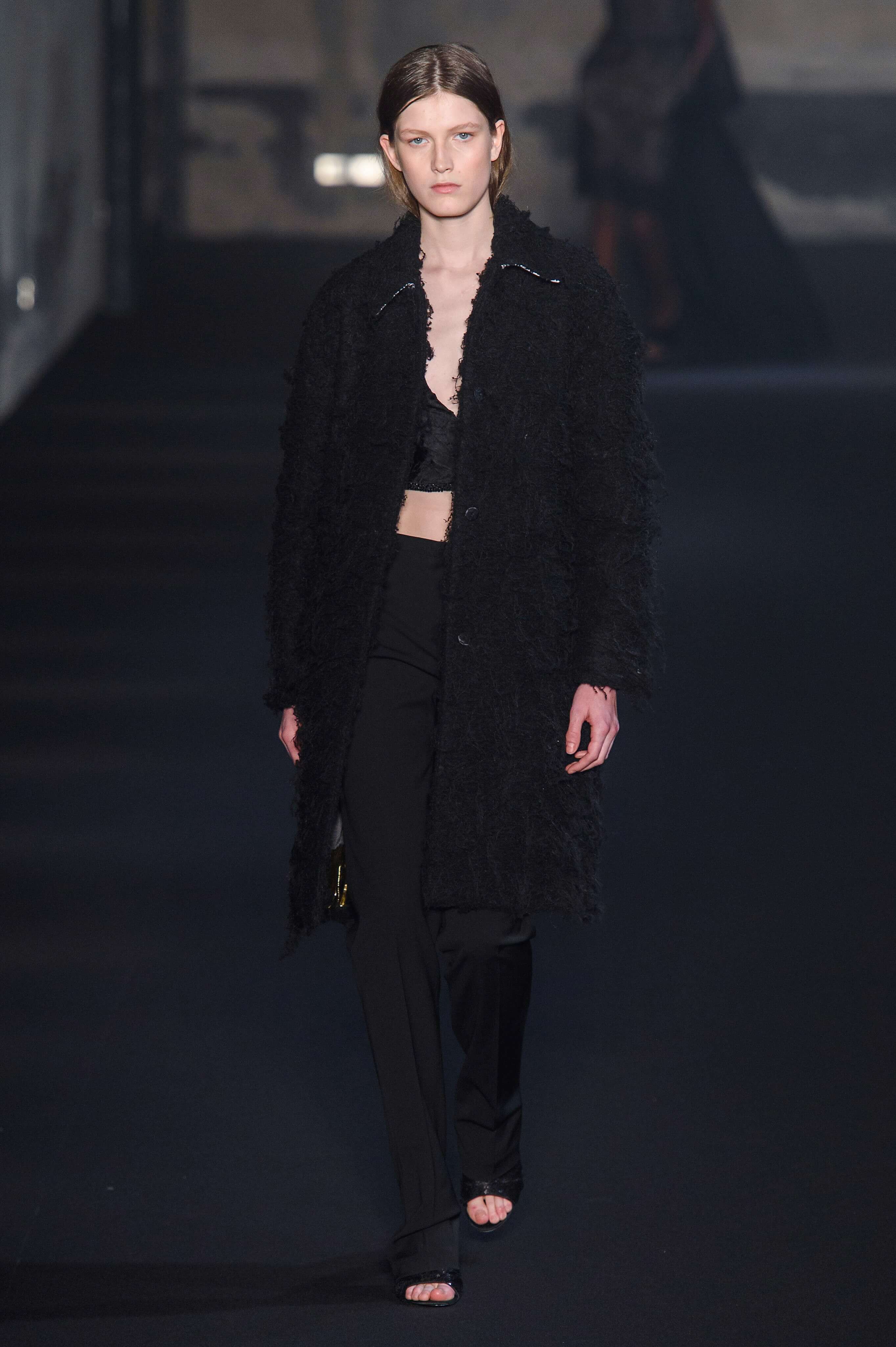 На деле же Алессандро дель Аква вдохновлялся эротикой: главным референсом послужил фильм Брайана де Пальмы “Бритва” (Dressed To Kill) 1980 года — стильный, но достаточно антифеминистский эротический триллер. Образы из фильма дель Аква адаптировал к современности, исследуя грани женской сексуальности без объективации тела. В коллекцию вошли деконструированные пальто со спущенными плечами, вязаные бра-топы, вещи из латекса и сетка, усыпанная камнями. В глазах мужчин одежда способна и соблазнять, и вызывать, и убеждать.