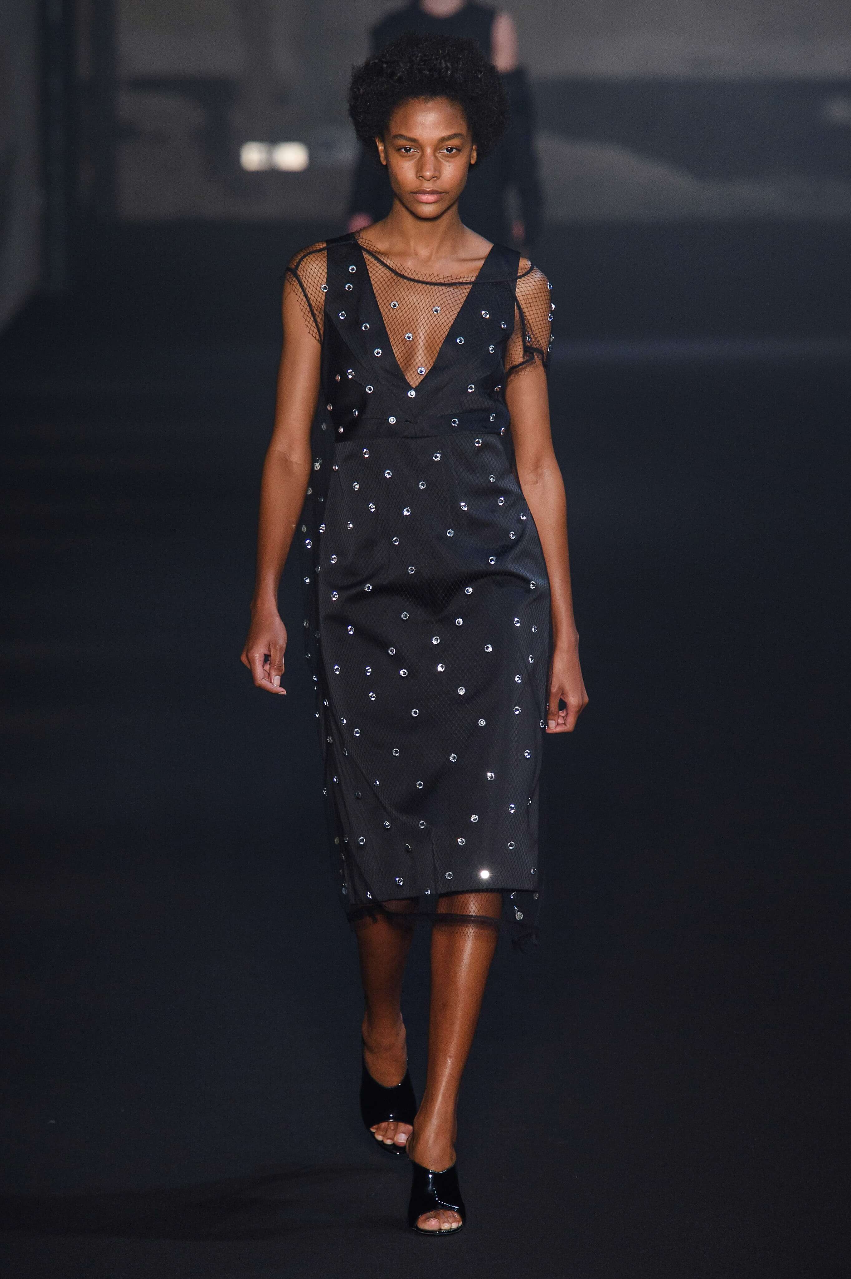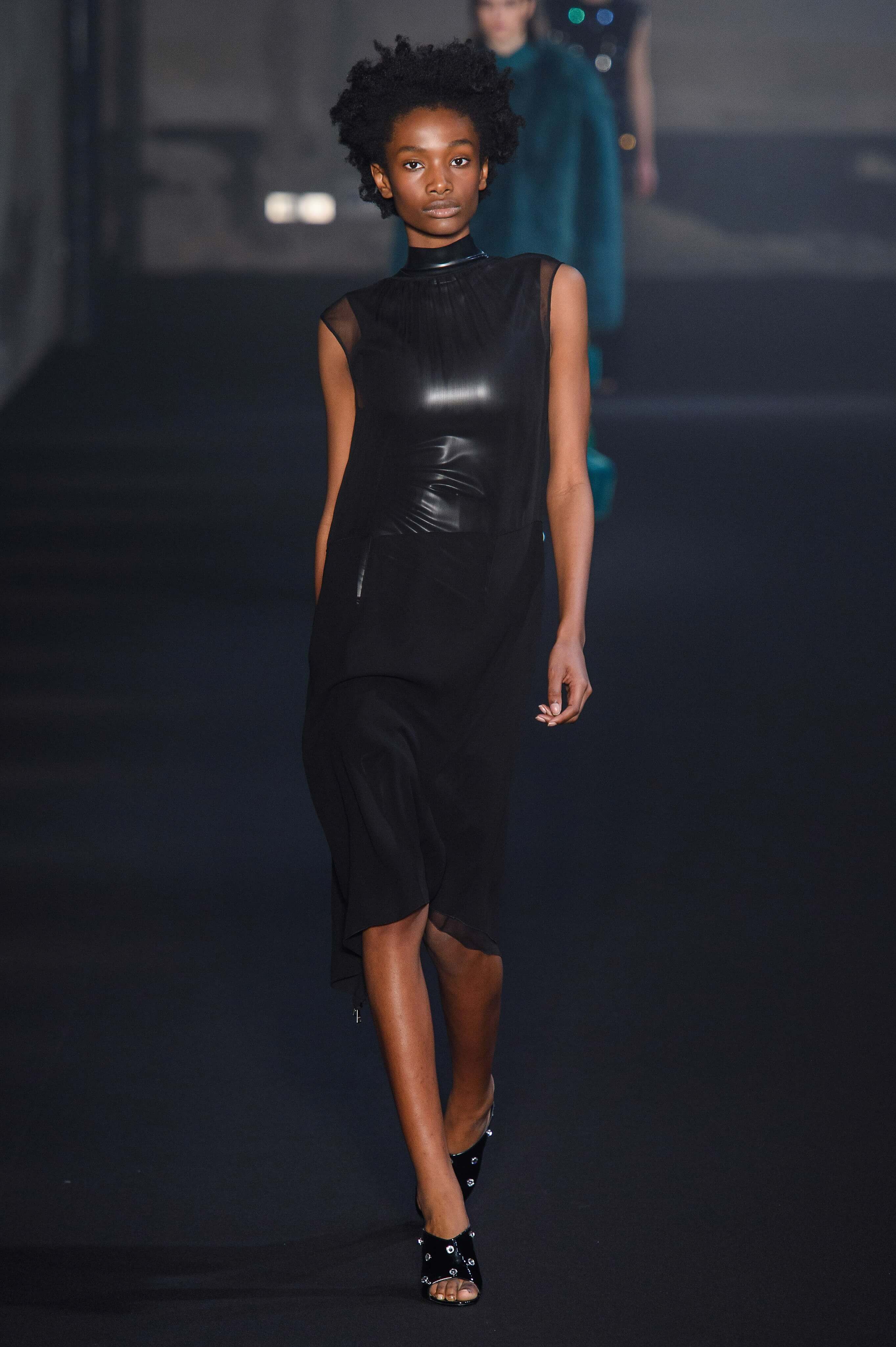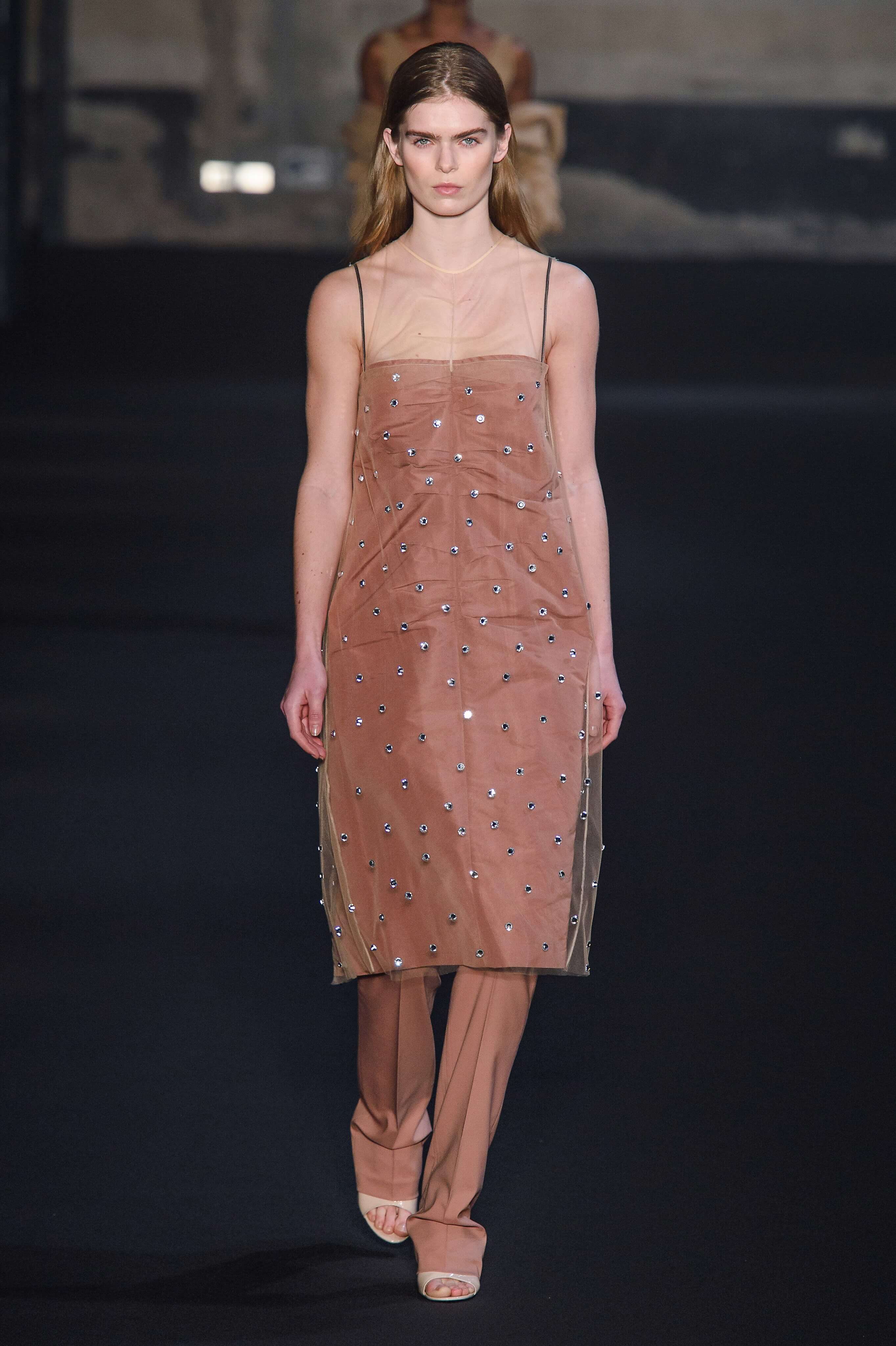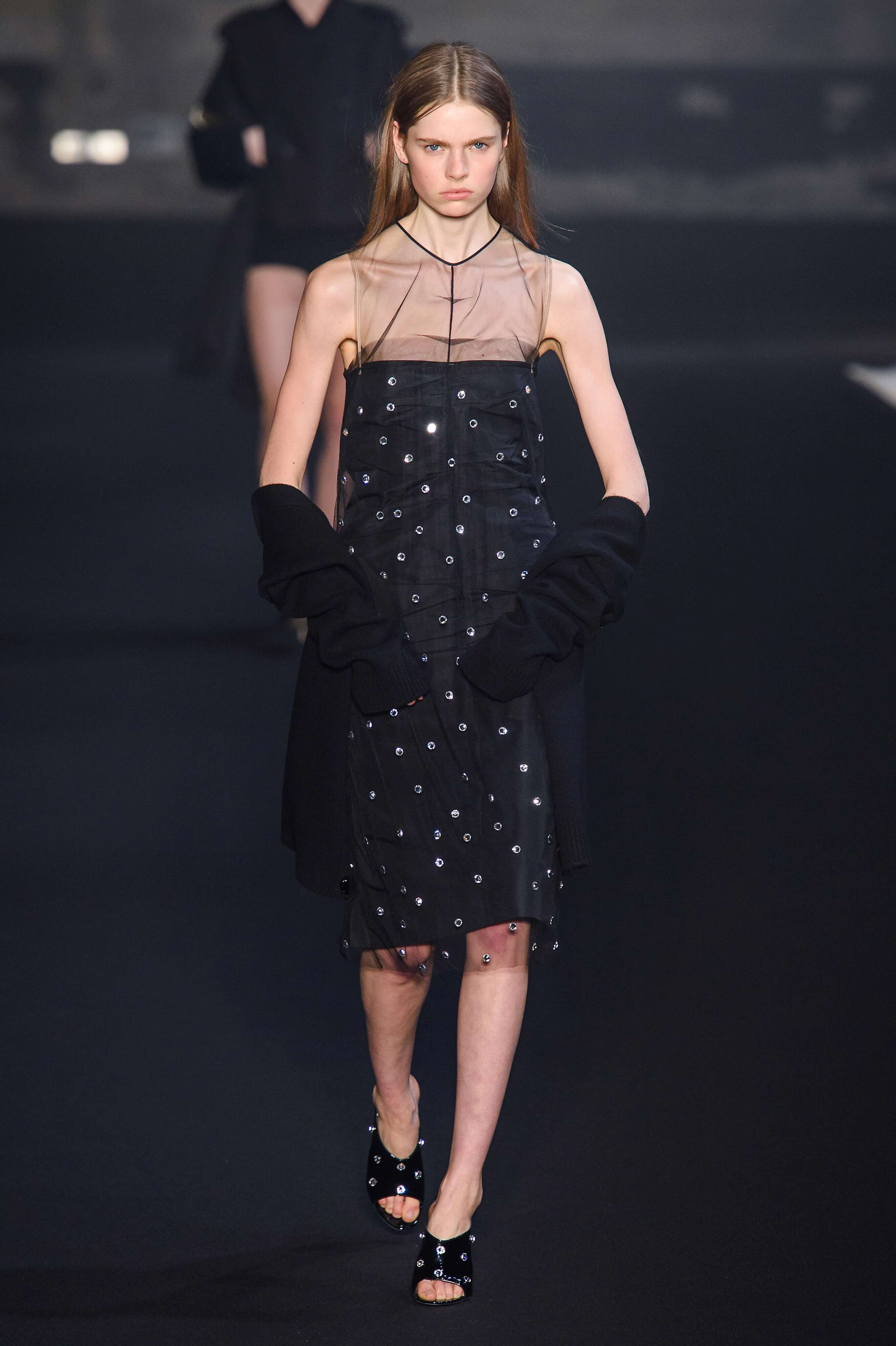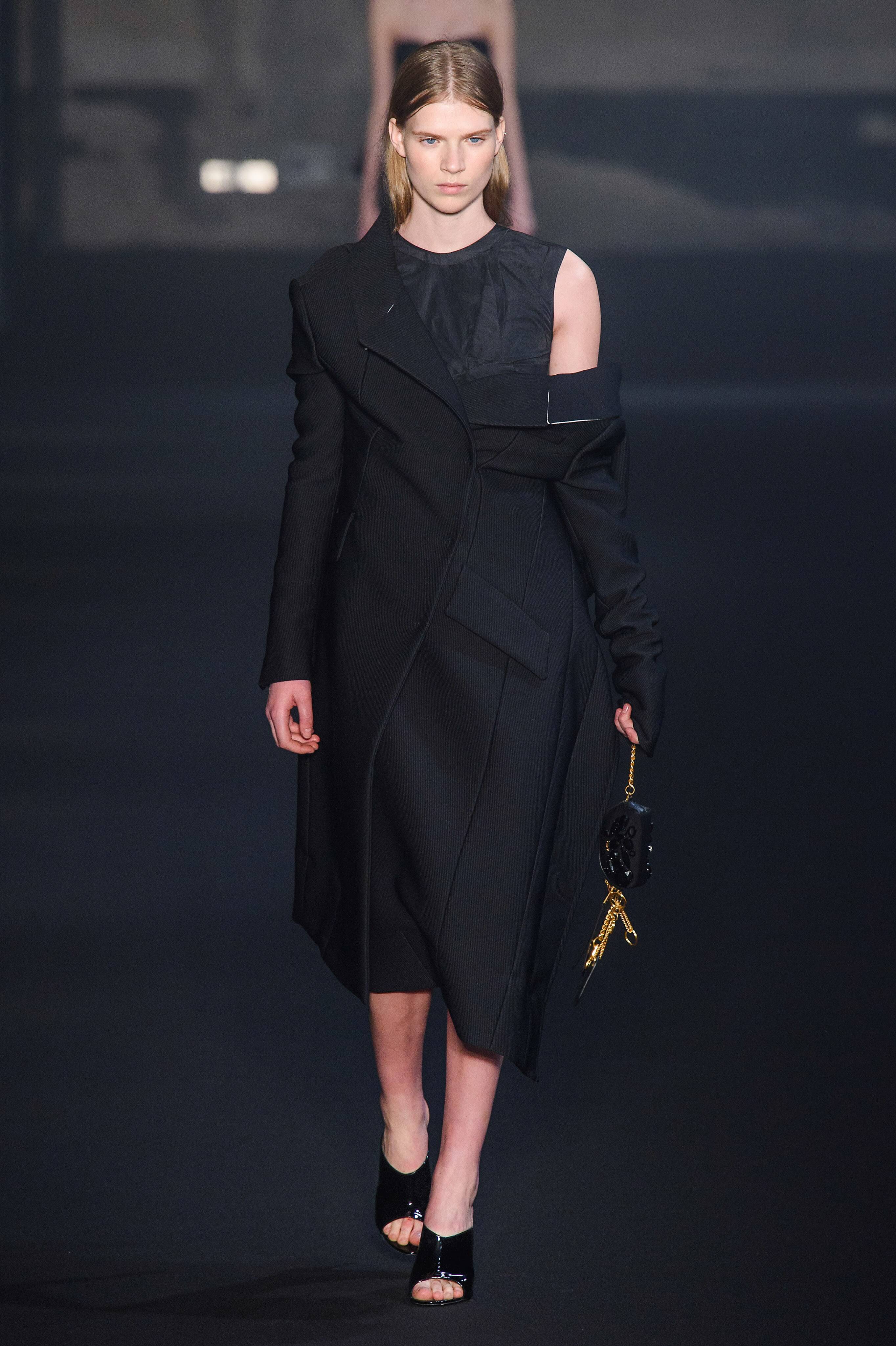 На деле же Алессандро дель Аква вдохновлялся эротикой: главным референсом послужил фильм Брайана де Пальмы “Бритва” (Dressed To Kill) 1980 года — стильный, но достаточно антифеминистский эротический триллер. Образы из фильма дель Аква адаптировал к современности, исследуя грани женской сексуальности без объективации тела. В коллекцию вошли деконструированные пальто со спущенными плечами, вязаные бра-топы, вещи из латекса и сетка, усыпанная камнями. В глазах мужчин одежда способна и соблазнять, и вызывать, и убеждать.