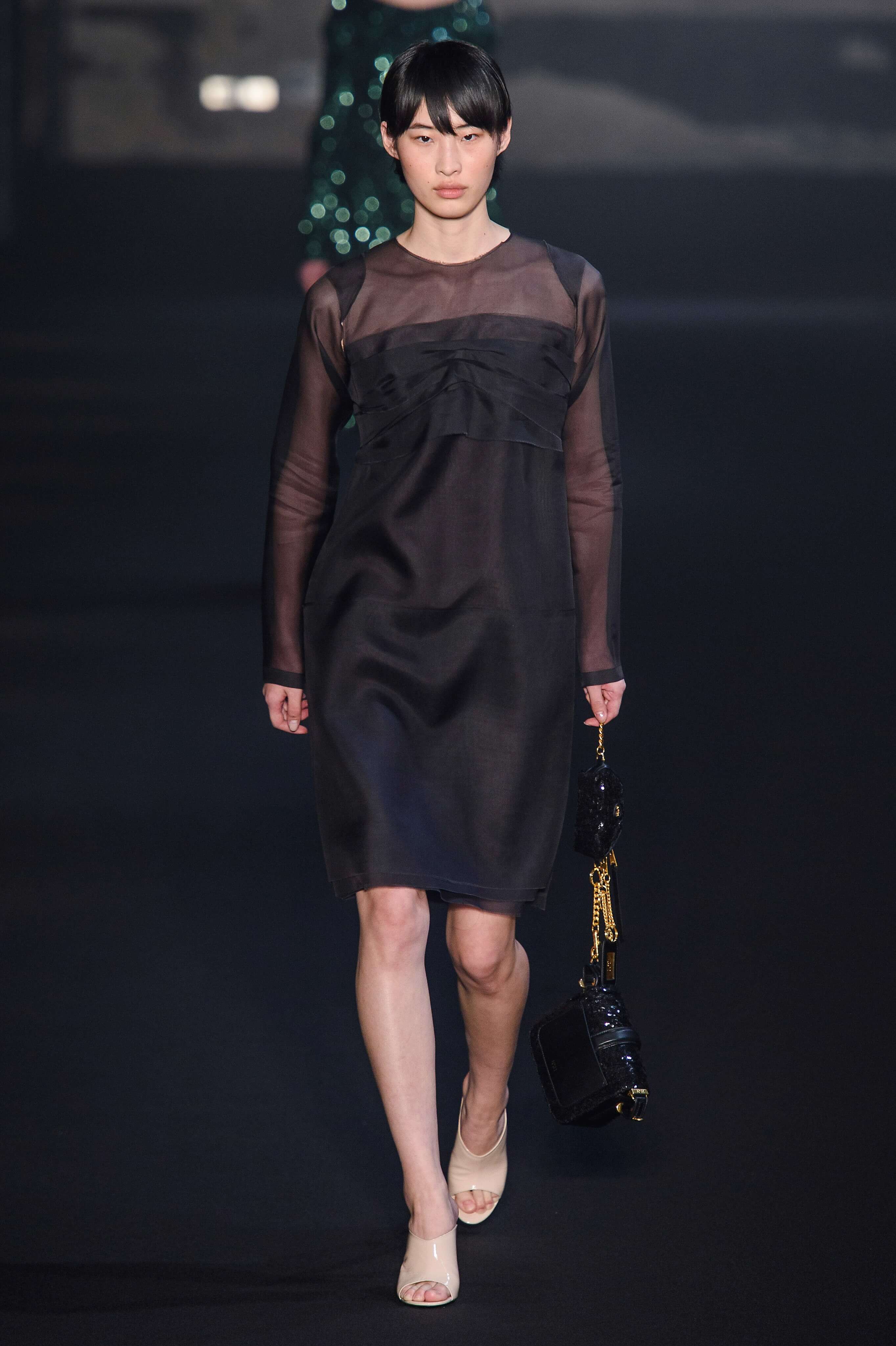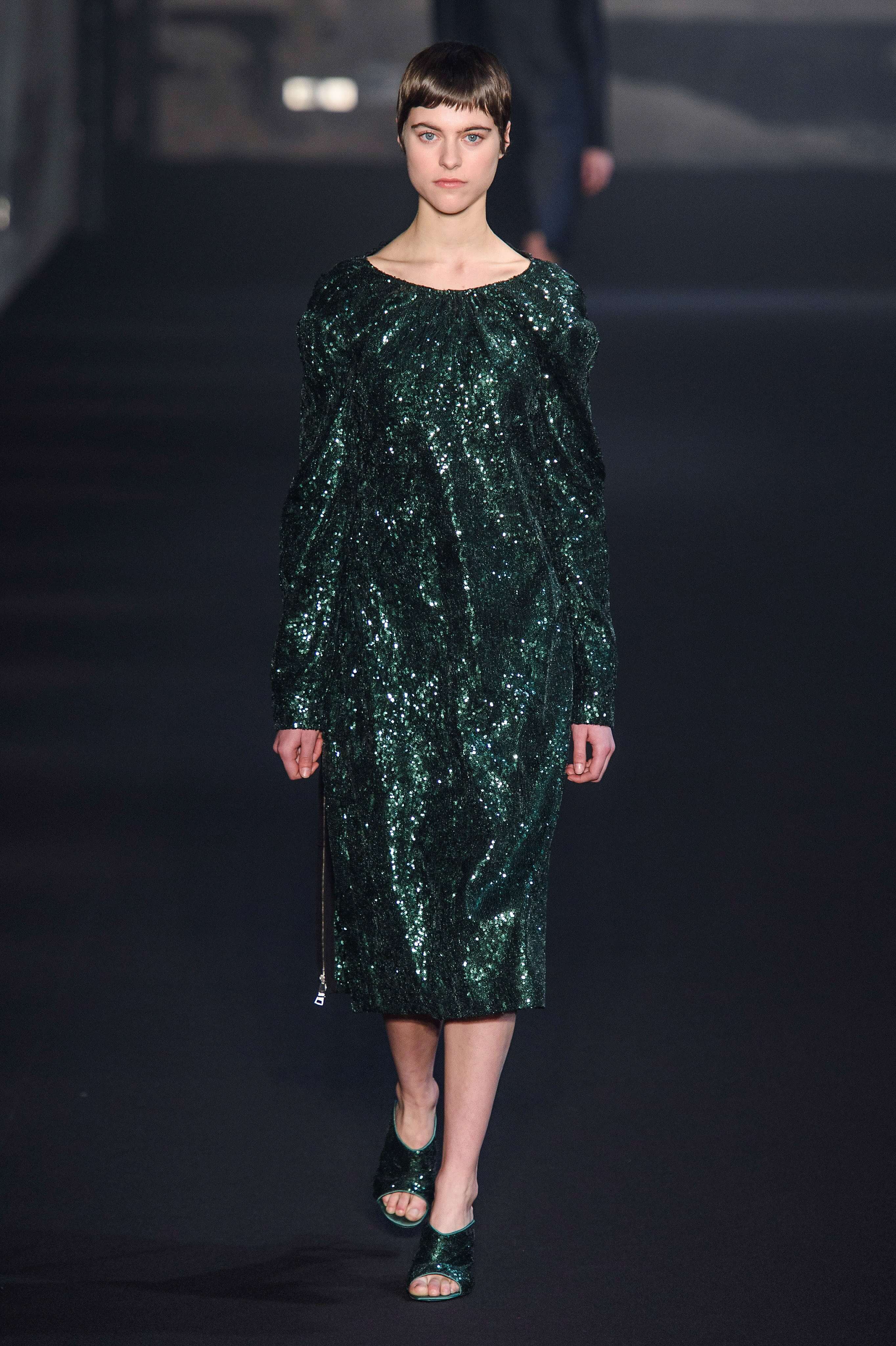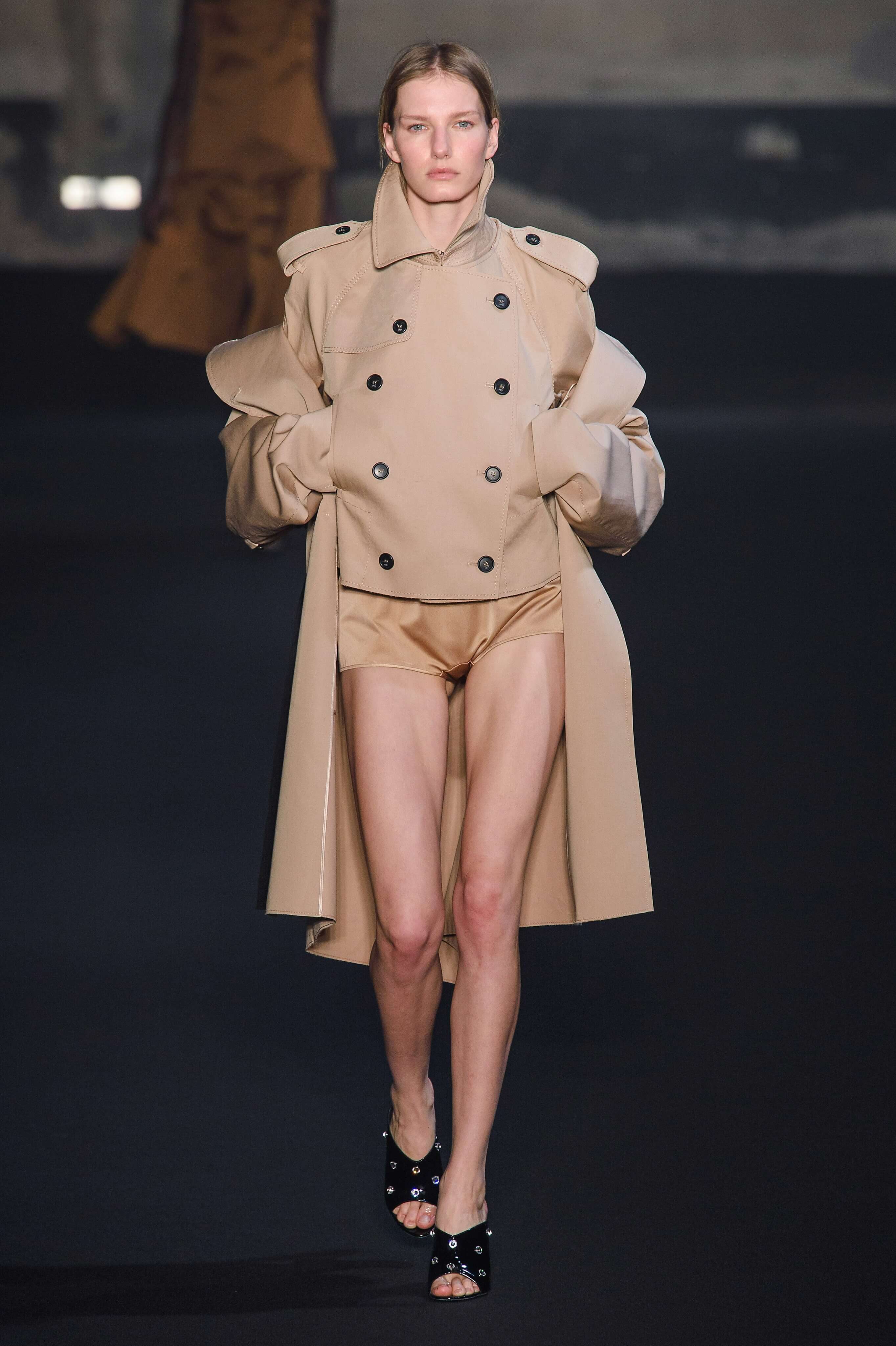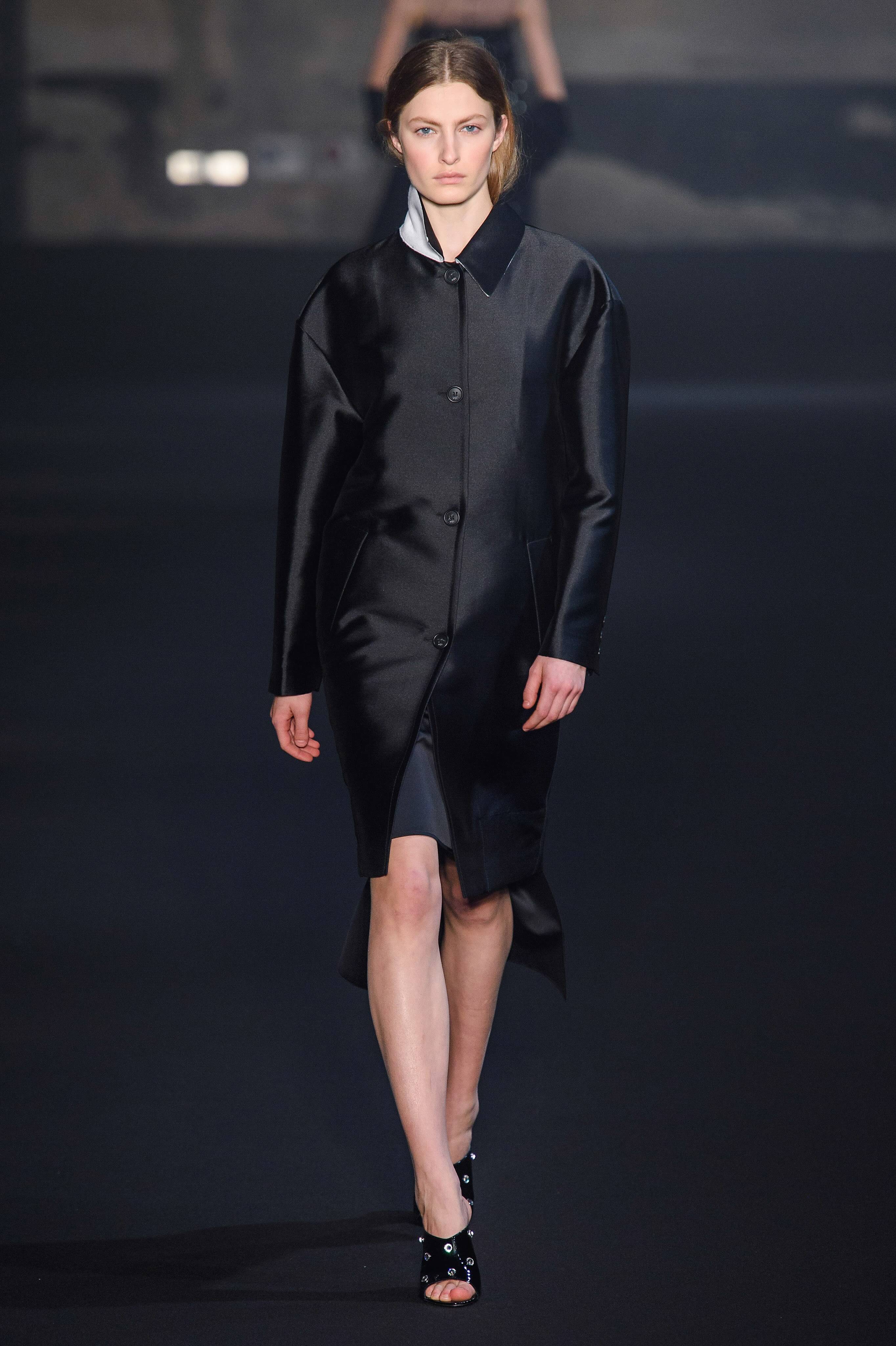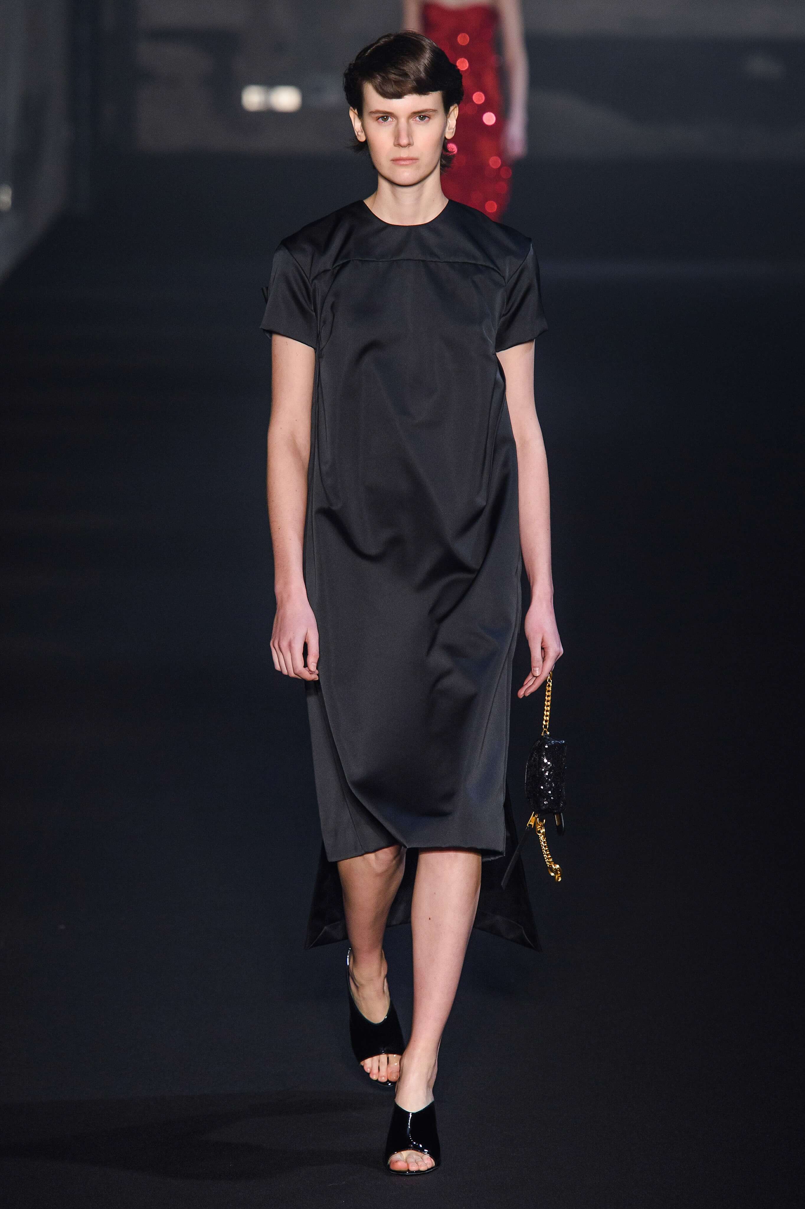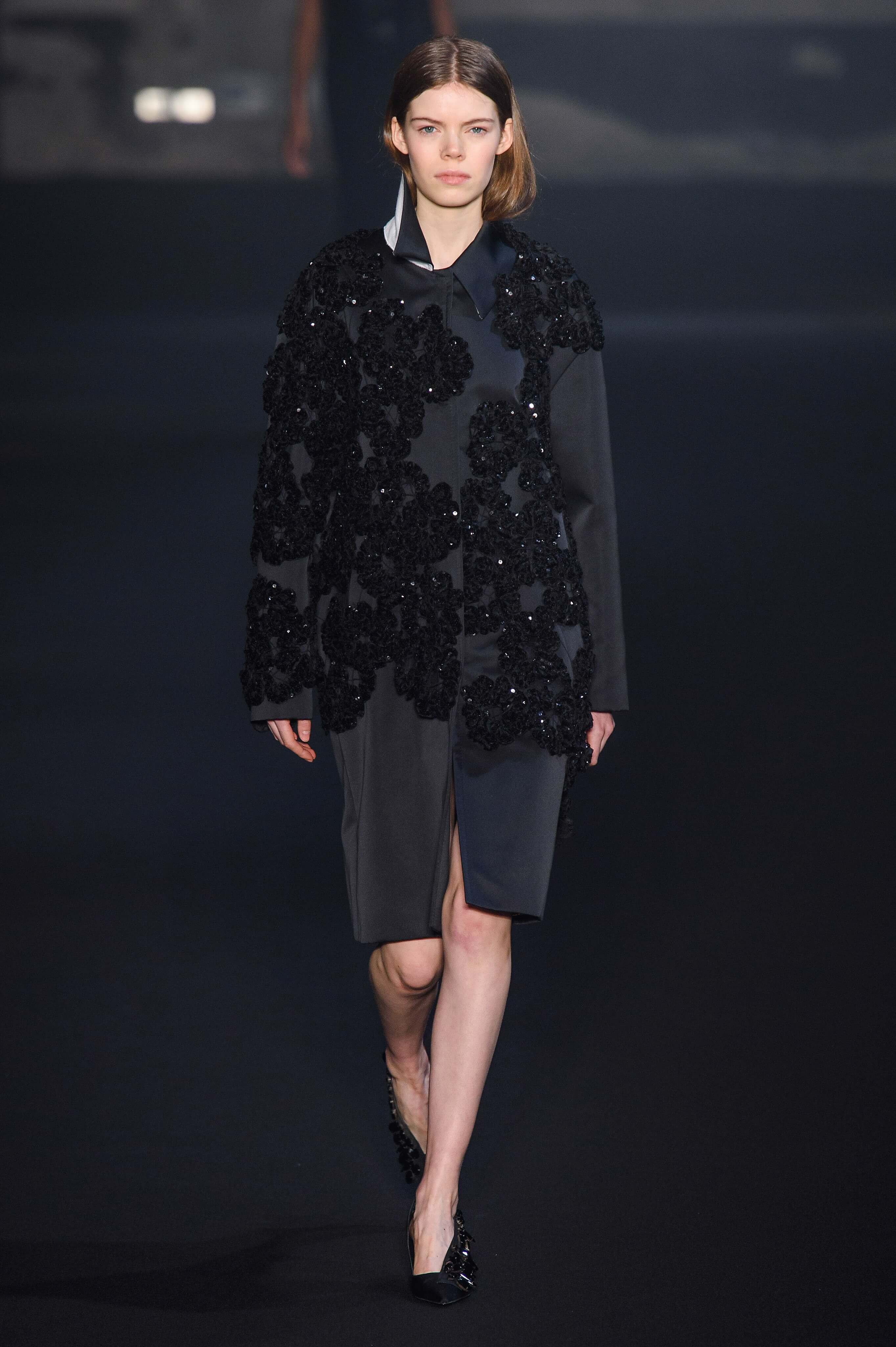 На деле же Алессандро дель Аква вдохновлялся эротикой: главным референсом послужил фильм Брайана де Пальмы “Бритва” (Dressed To Kill) 1980 года — стильный, но достаточно антифеминистский эротический триллер. Образы из фильма дель Аква адаптировал к современности, исследуя грани женской сексуальности без объективации тела. В коллекцию вошли деконструированные пальто со спущенными плечами, вязаные бра-топы, вещи из латекса и сетка, усыпанная камнями. В глазах мужчин одежда способна и соблазнять, и вызывать, и убеждать.