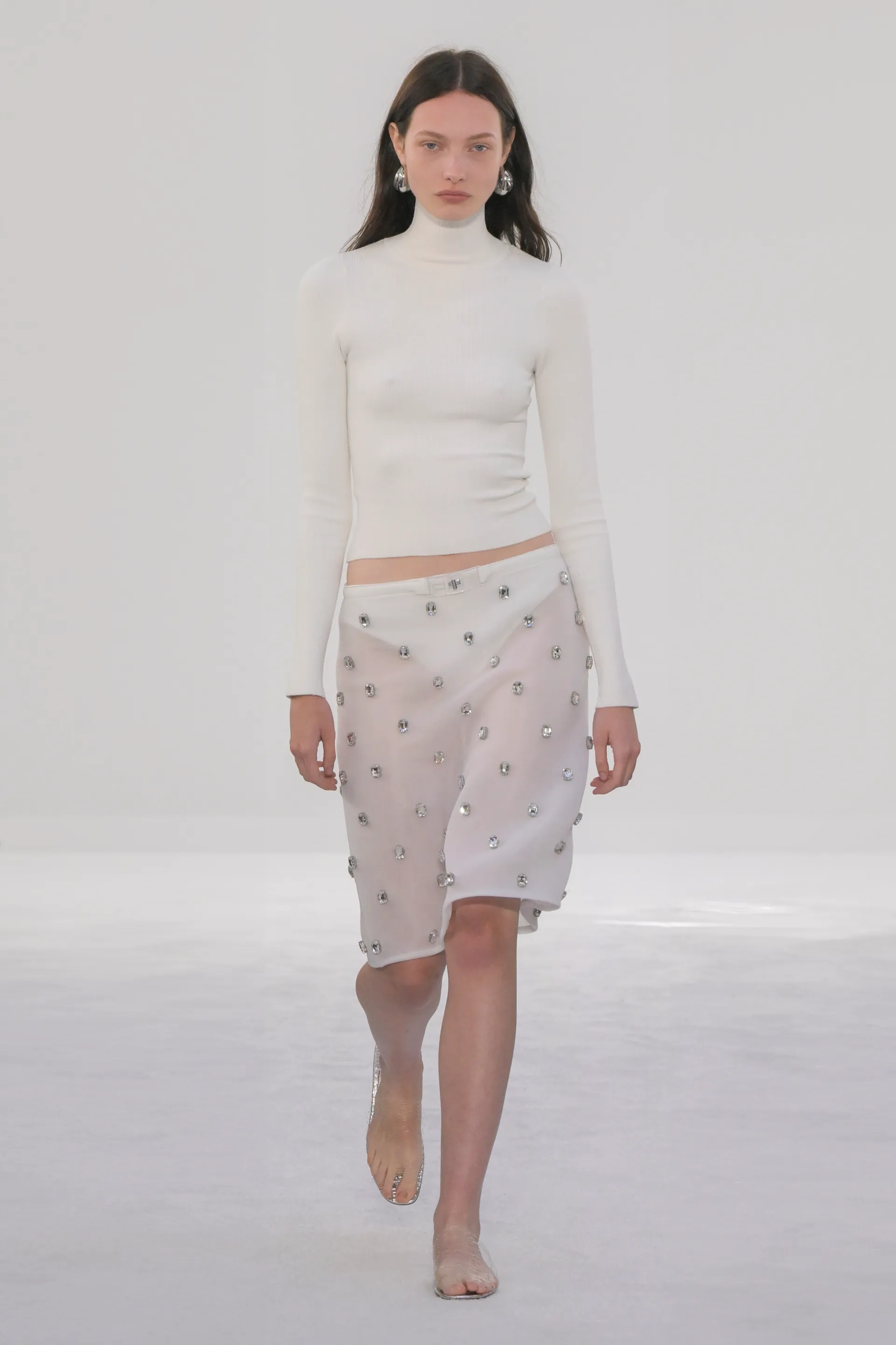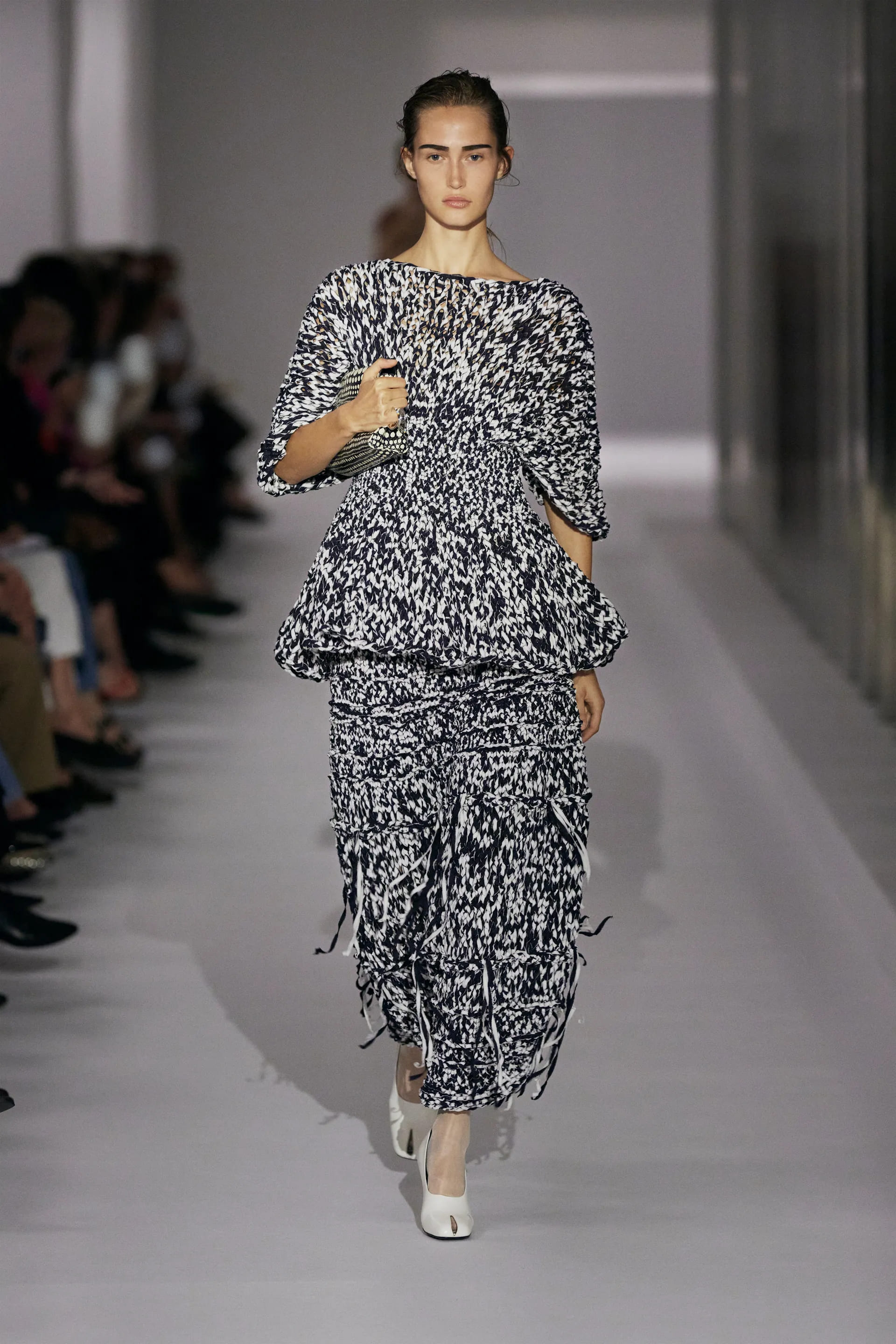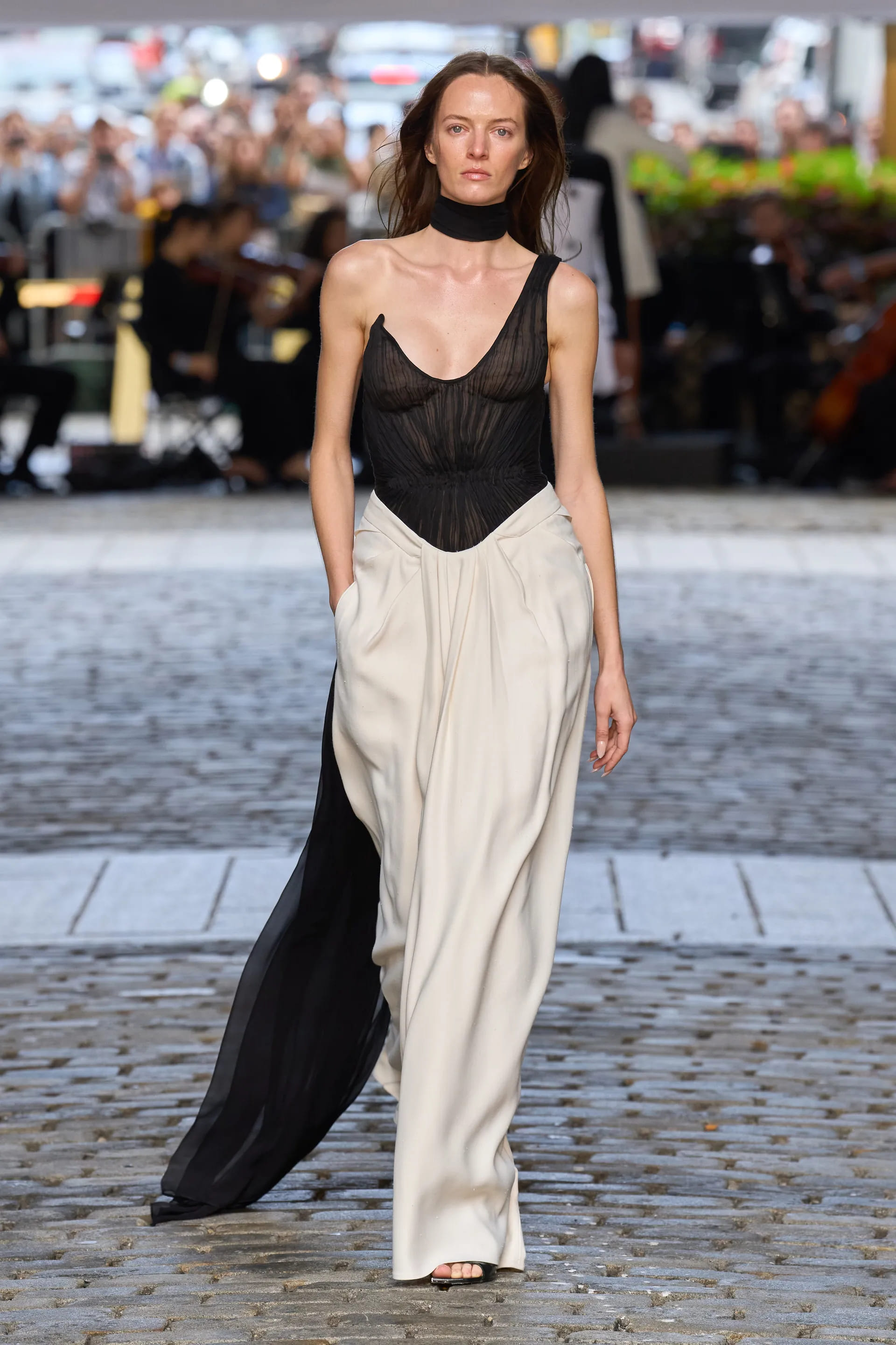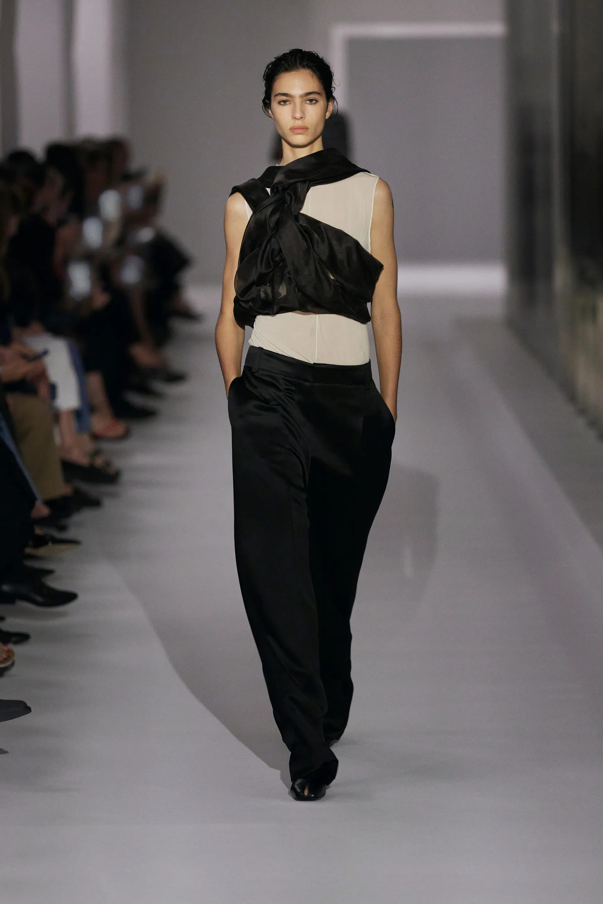 Загравали з лініями й Khaite. На нью-йоркському подіумі бренд показав експериментальні фасони, матеріали та принти. Що ж, напівпрозорі тканини, якими Khaite доповнювали все, що виявилося під рукою — від топів до брюк —, залишаються з нами щонайменше на один сезон.