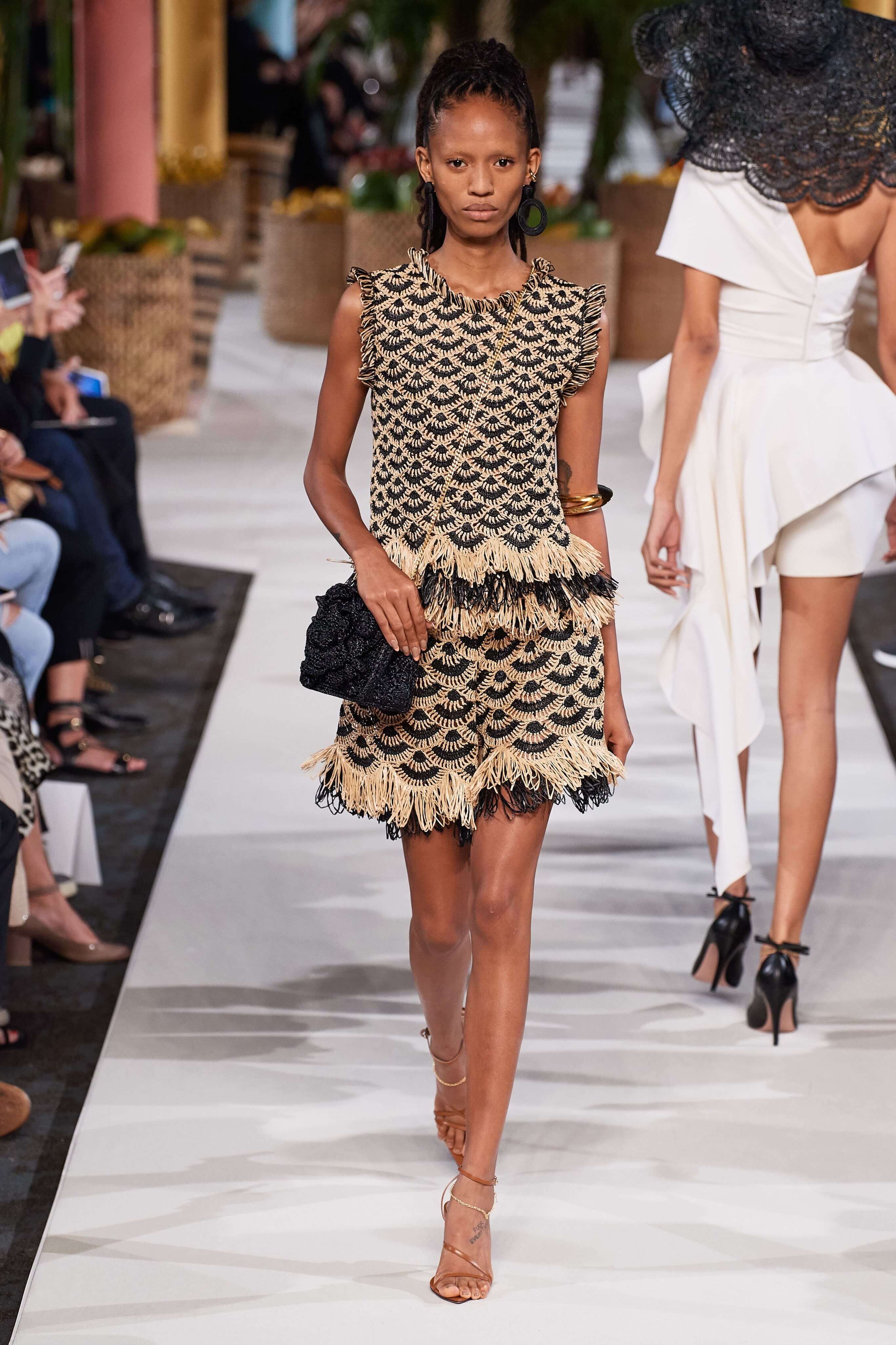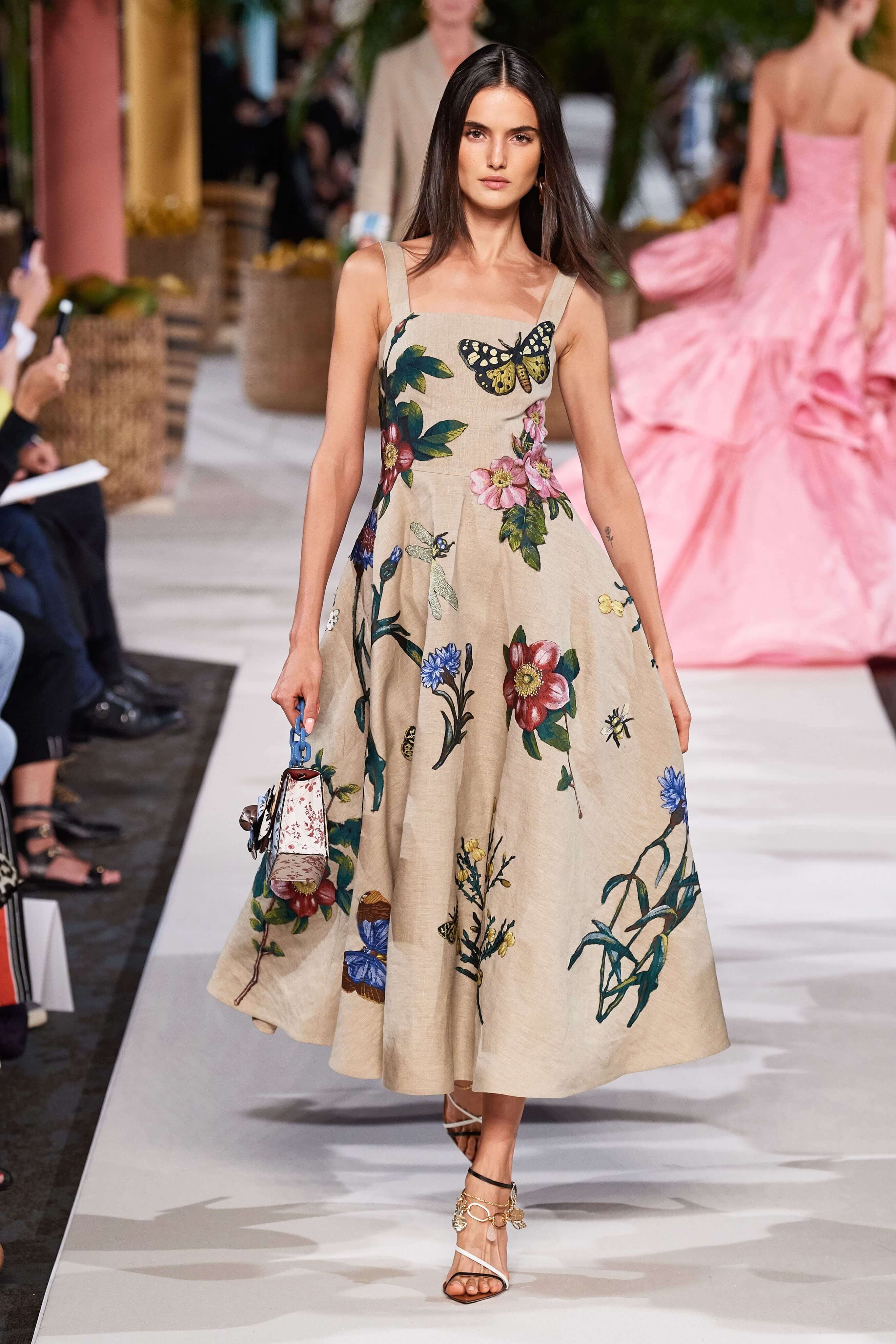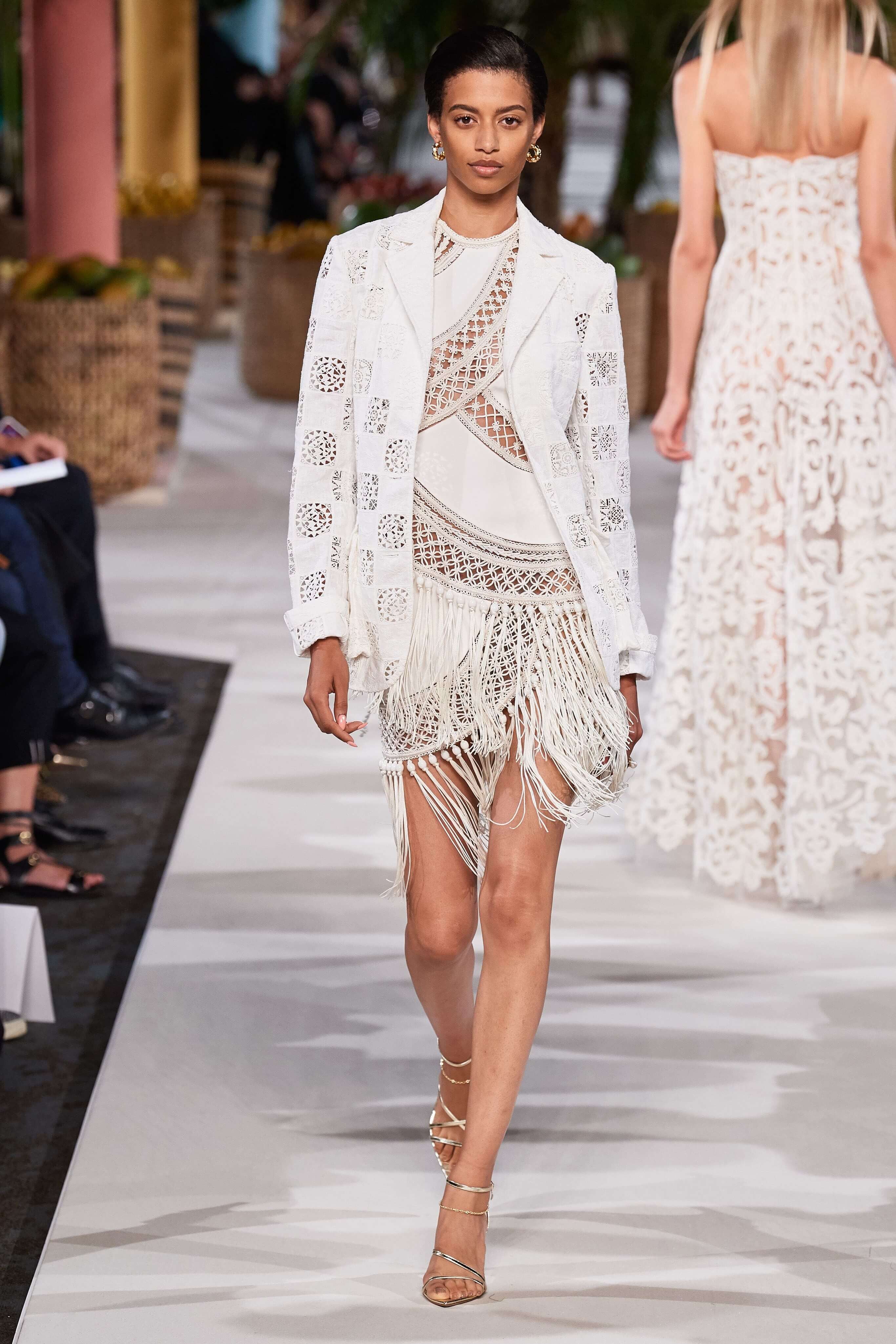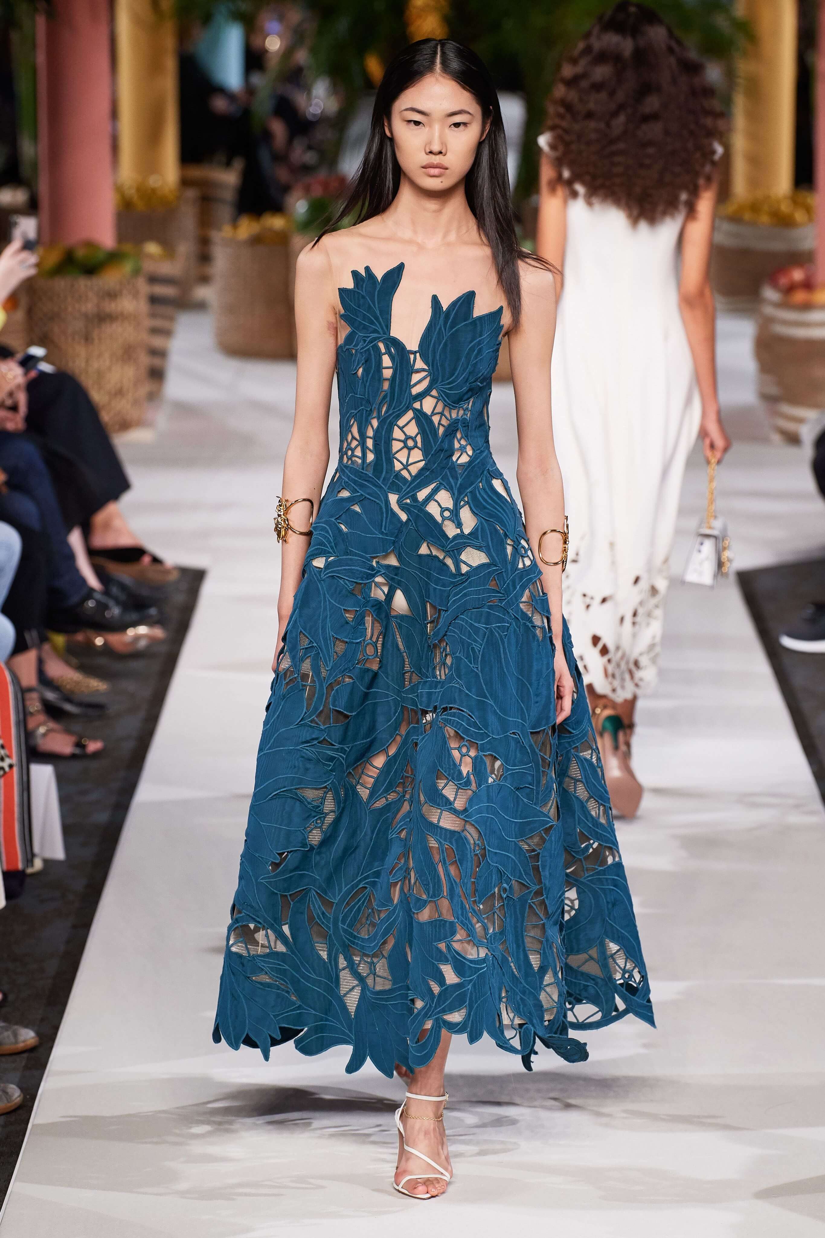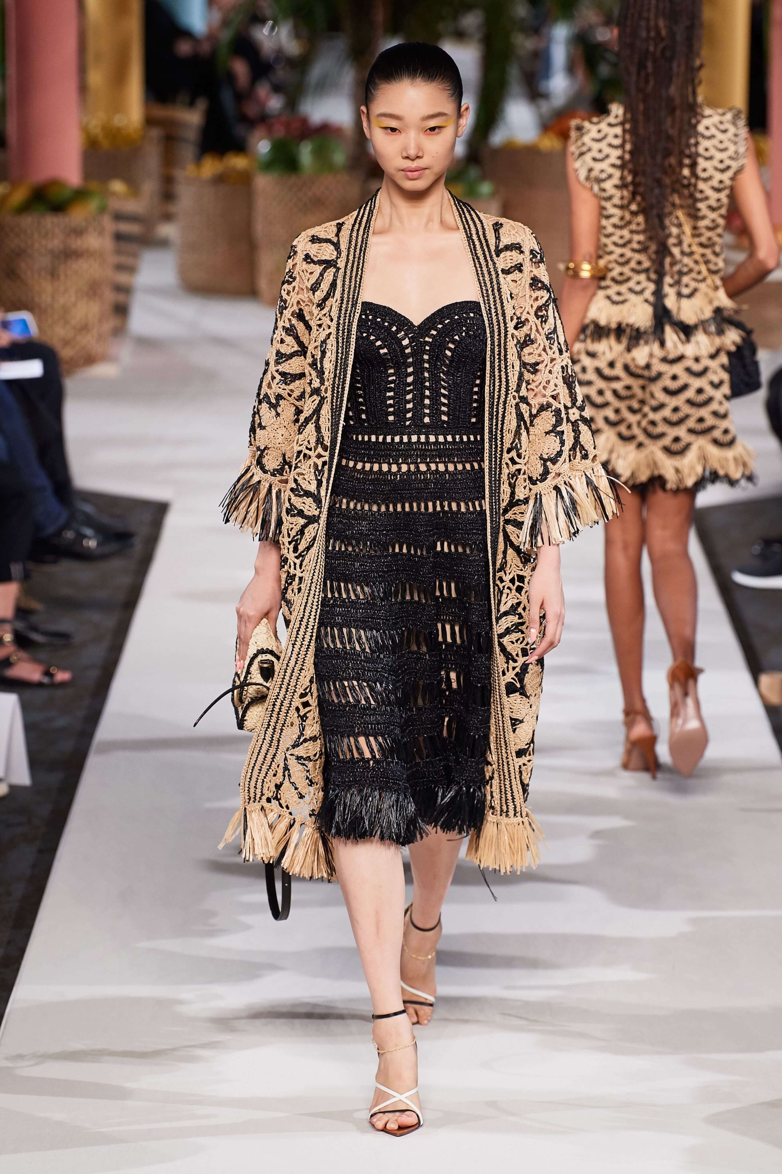 Дизайнеров Лауру Ким и Фернандо Гарсиа вдохновляют география и визуальная культура разных стран. В прошлых сезонах это были Марокко и Испания, на этот раз — родина сеньора де ла Ренты, Доминикана. Традиционную для бренда линию шелковых и атласных вечерних платьев дополнили жизнерадостные наряды в романтичном духе Латинской Америки: облегающие платья в полоску, как на карнавальной карусели, и с декором из разноцветных кисточек, драпированные юбки, мелко плиссированные платья и торжественные белые и черные халаты в пышных букетах цветов, завязанные на бёдрах огромными бантами мини и будто ритуальные шаманские платья-хламиды, украшенные длинными нитями бусин.