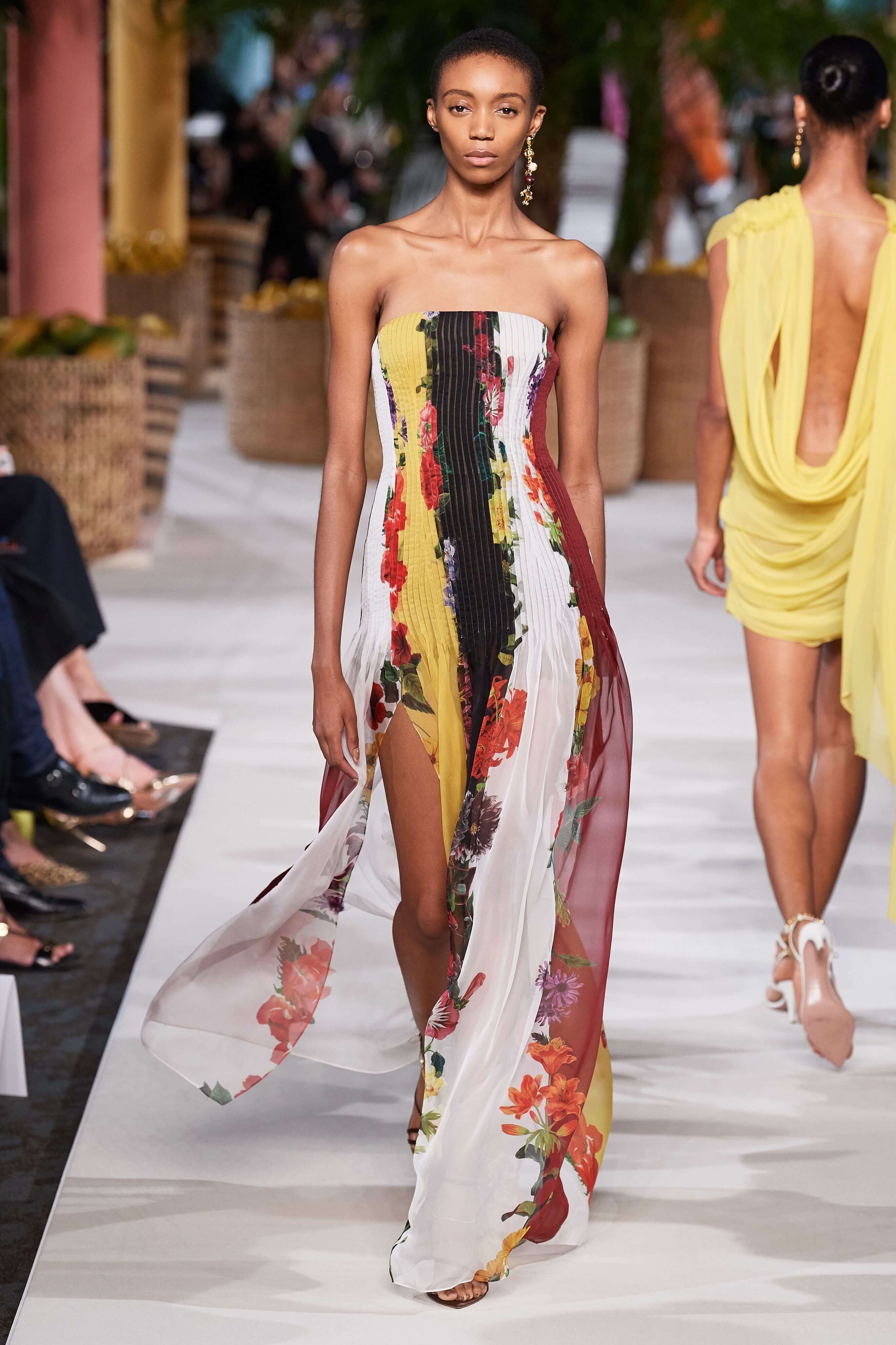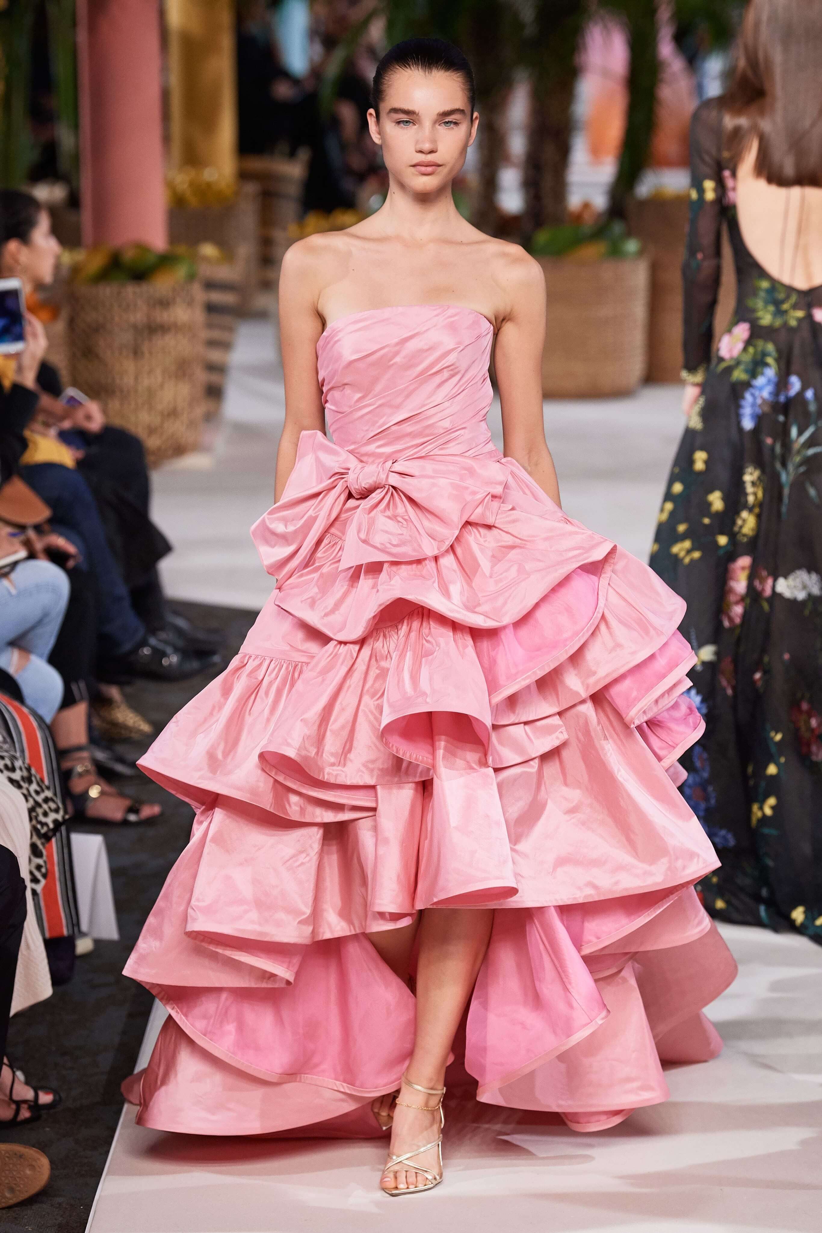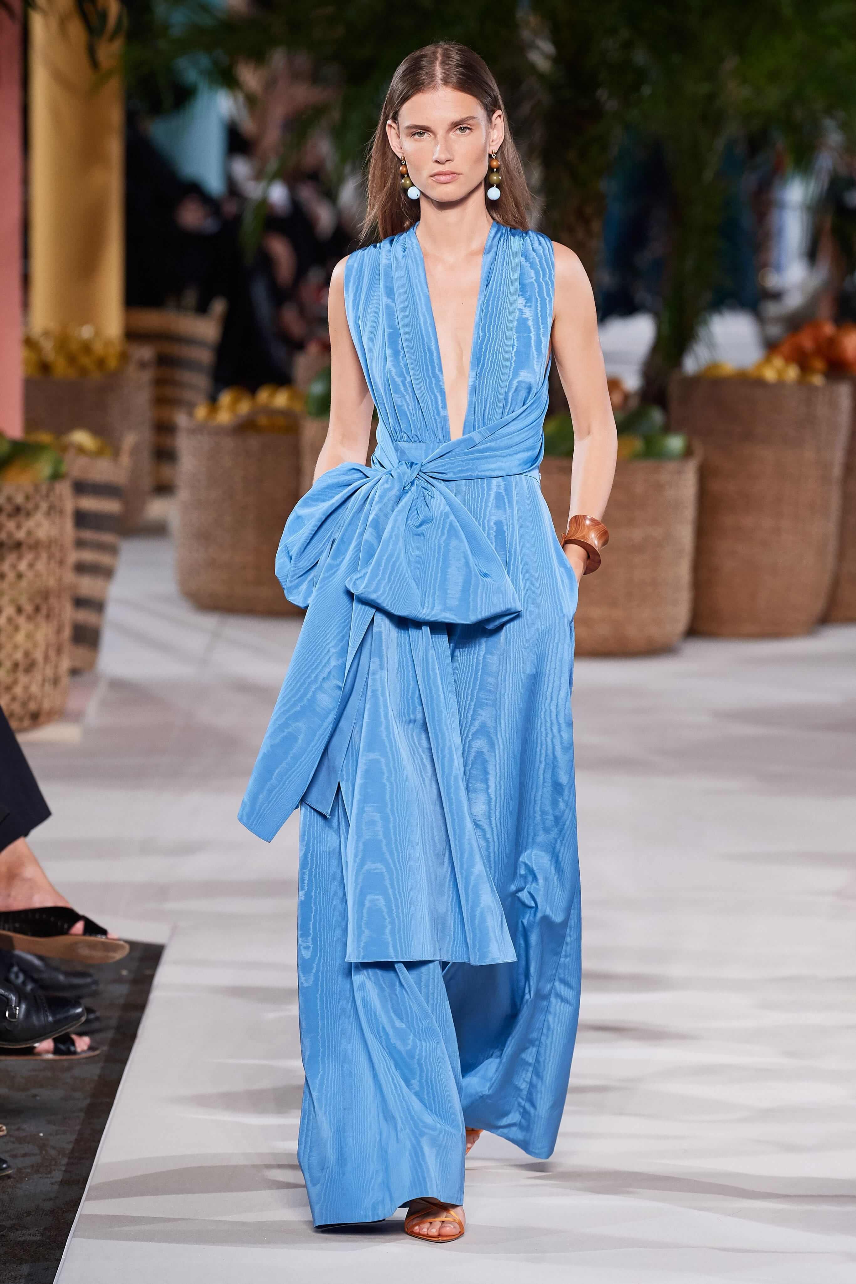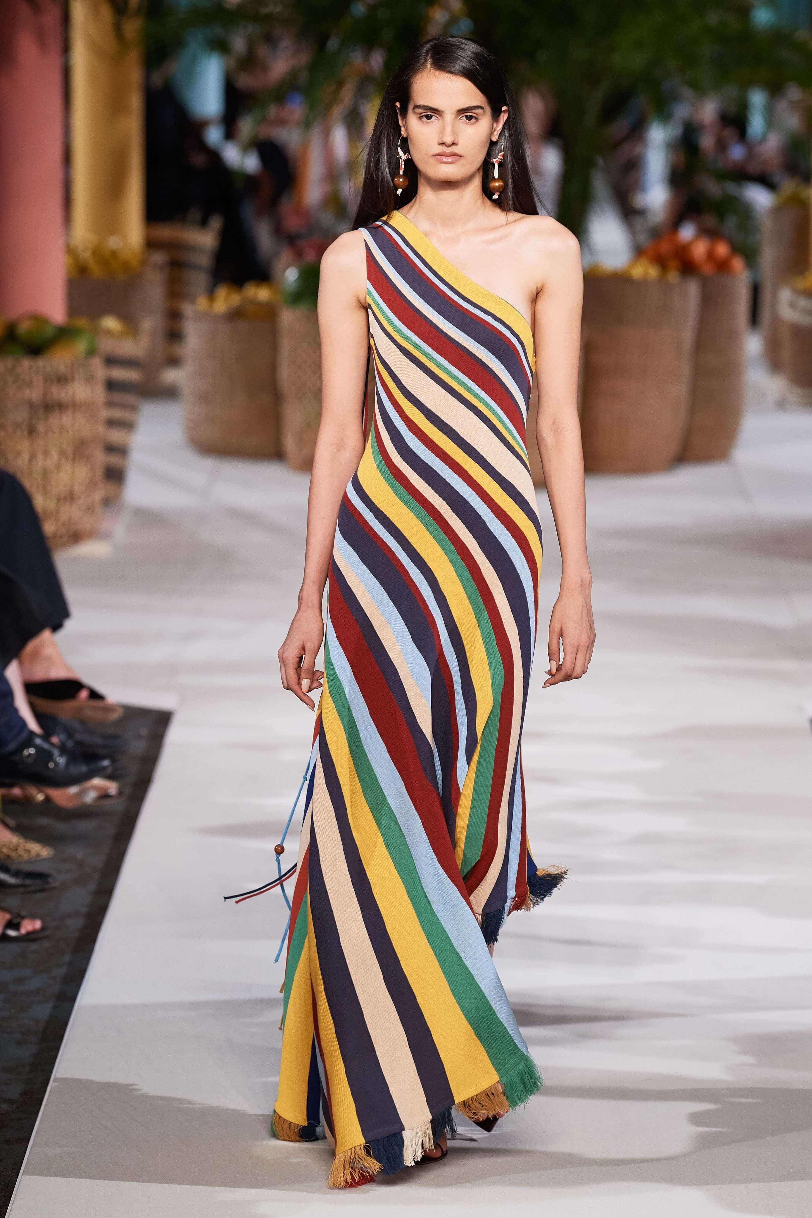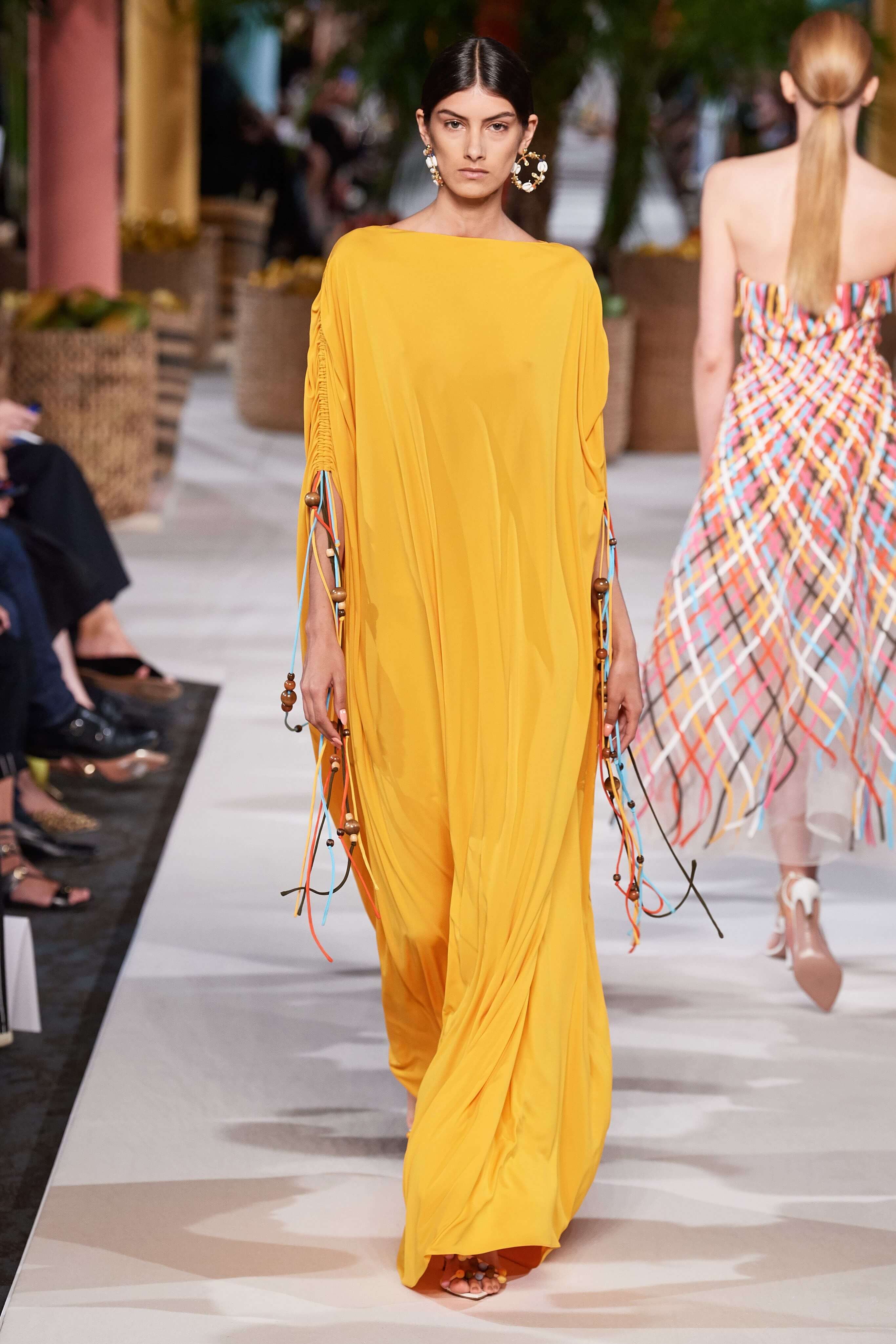 Дизайнеров Лауру Ким и Фернандо Гарсиа вдохновляют география и визуальная культура разных стран. В прошлых сезонах это были Марокко и Испания, на этот раз — родина сеньора де ла Ренты, Доминикана. Традиционную для бренда линию шелковых и атласных вечерних платьев дополнили жизнерадостные наряды в романтичном духе Латинской Америки: облегающие платья в полоску, как на карнавальной карусели, и с декором из разноцветных кисточек, драпированные юбки, мелко плиссированные платья и торжественные белые и черные халаты в пышных букетах цветов, завязанные на бёдрах огромными бантами мини и будто ритуальные шаманские платья-хламиды, украшенные длинными нитями бусин.