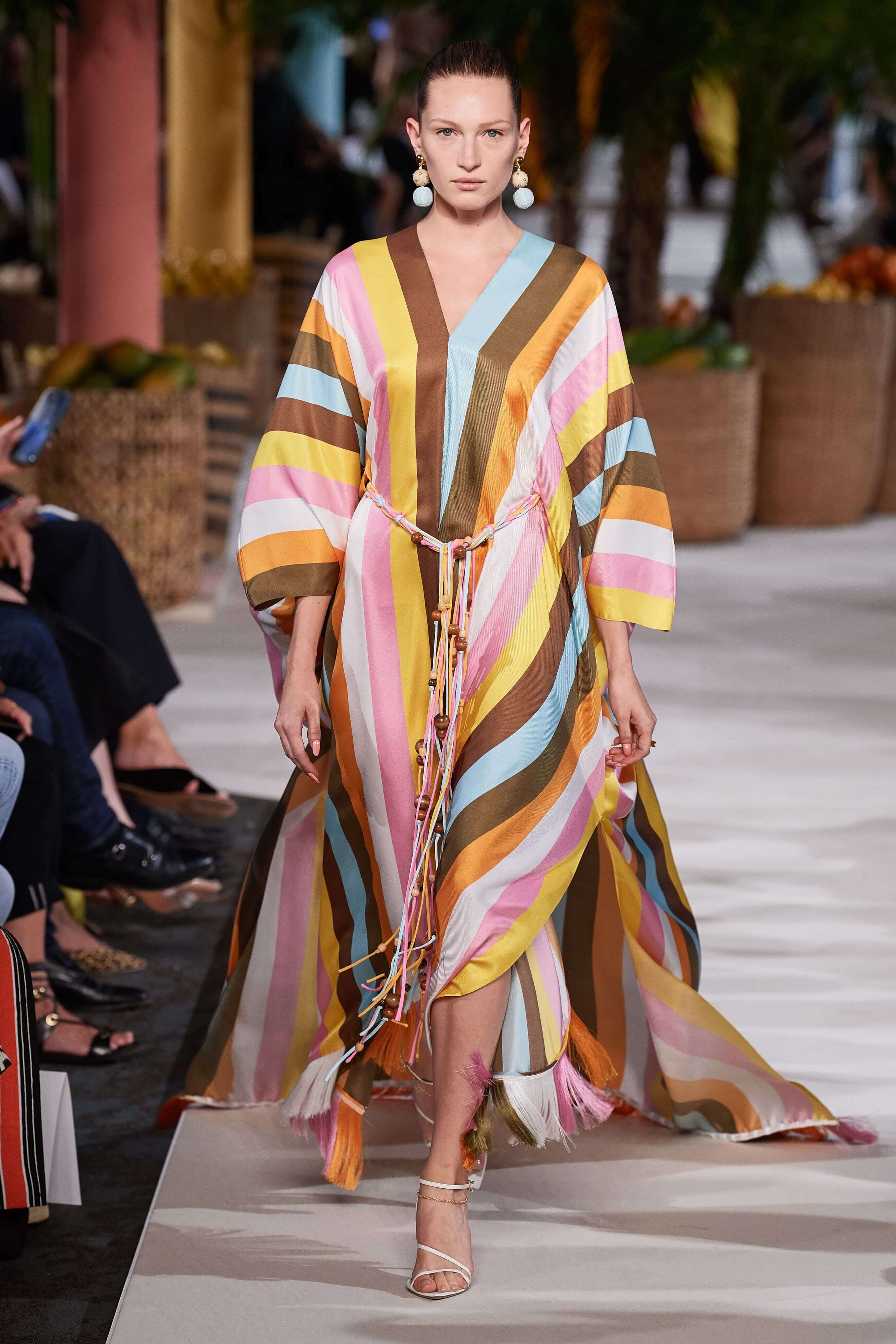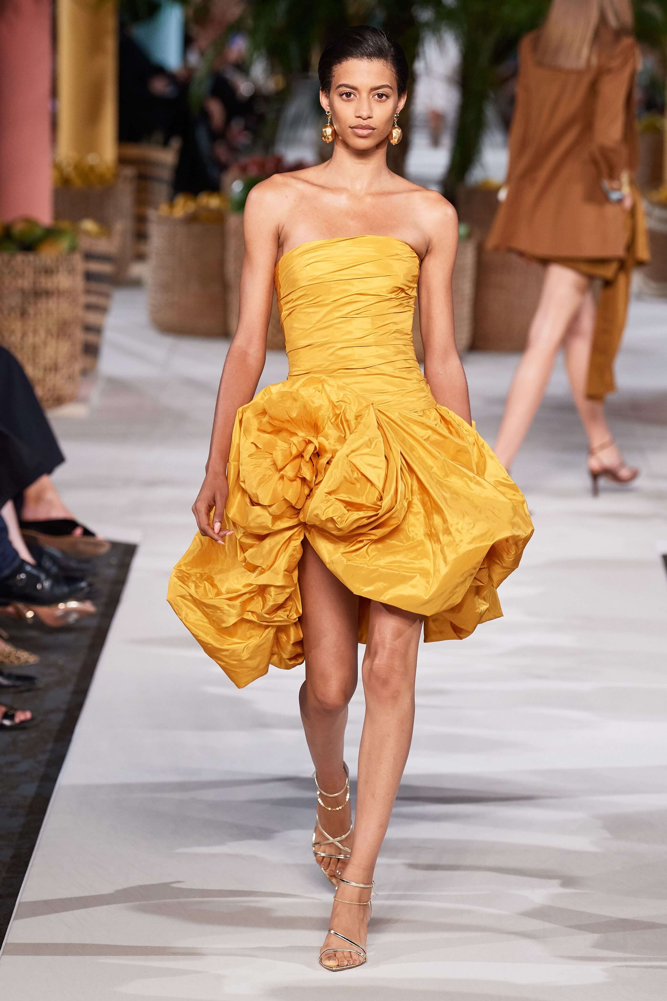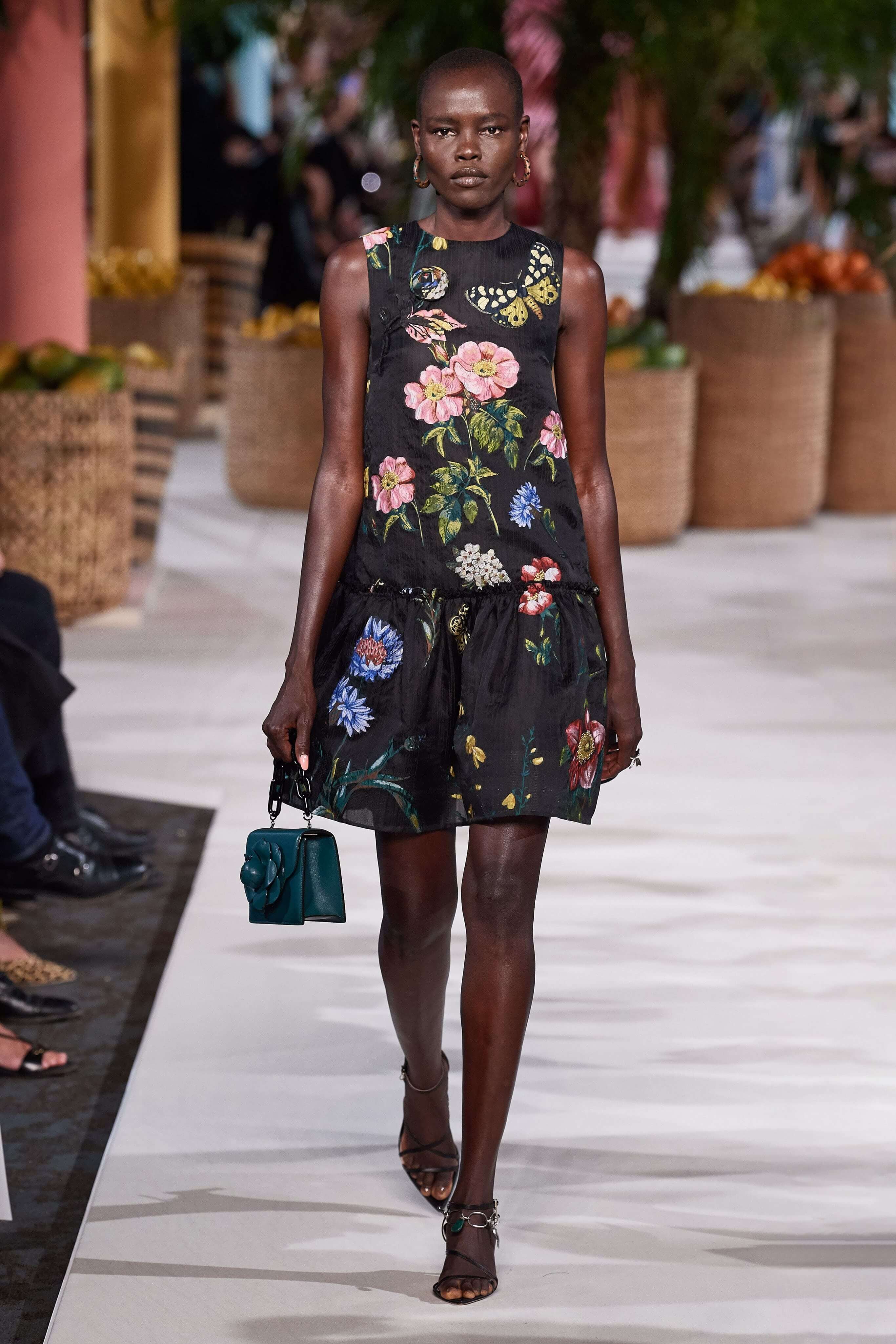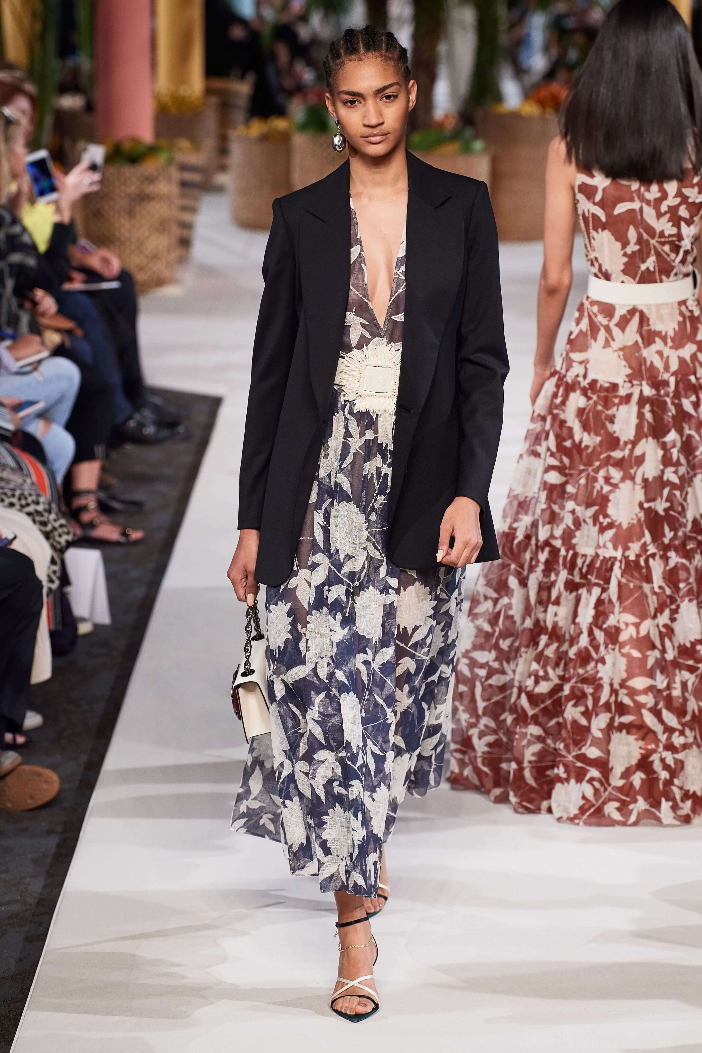 Дизайнеров Лауру Ким и Фернандо Гарсиа вдохновляют география и визуальная культура разных стран. В прошлых сезонах это были Марокко и Испания, на этот раз — родина сеньора де ла Ренты, Доминикана. Традиционную для бренда линию шелковых и атласных вечерних платьев дополнили жизнерадостные наряды в романтичном духе Латинской Америки: облегающие платья в полоску, как на карнавальной карусели, и с декором из разноцветных кисточек, драпированные юбки, мелко плиссированные платья и торжественные белые и черные халаты в пышных букетах цветов, завязанные на бёдрах огромными бантами мини и будто ритуальные шаманские платья-хламиды, украшенные длинными нитями бусин.