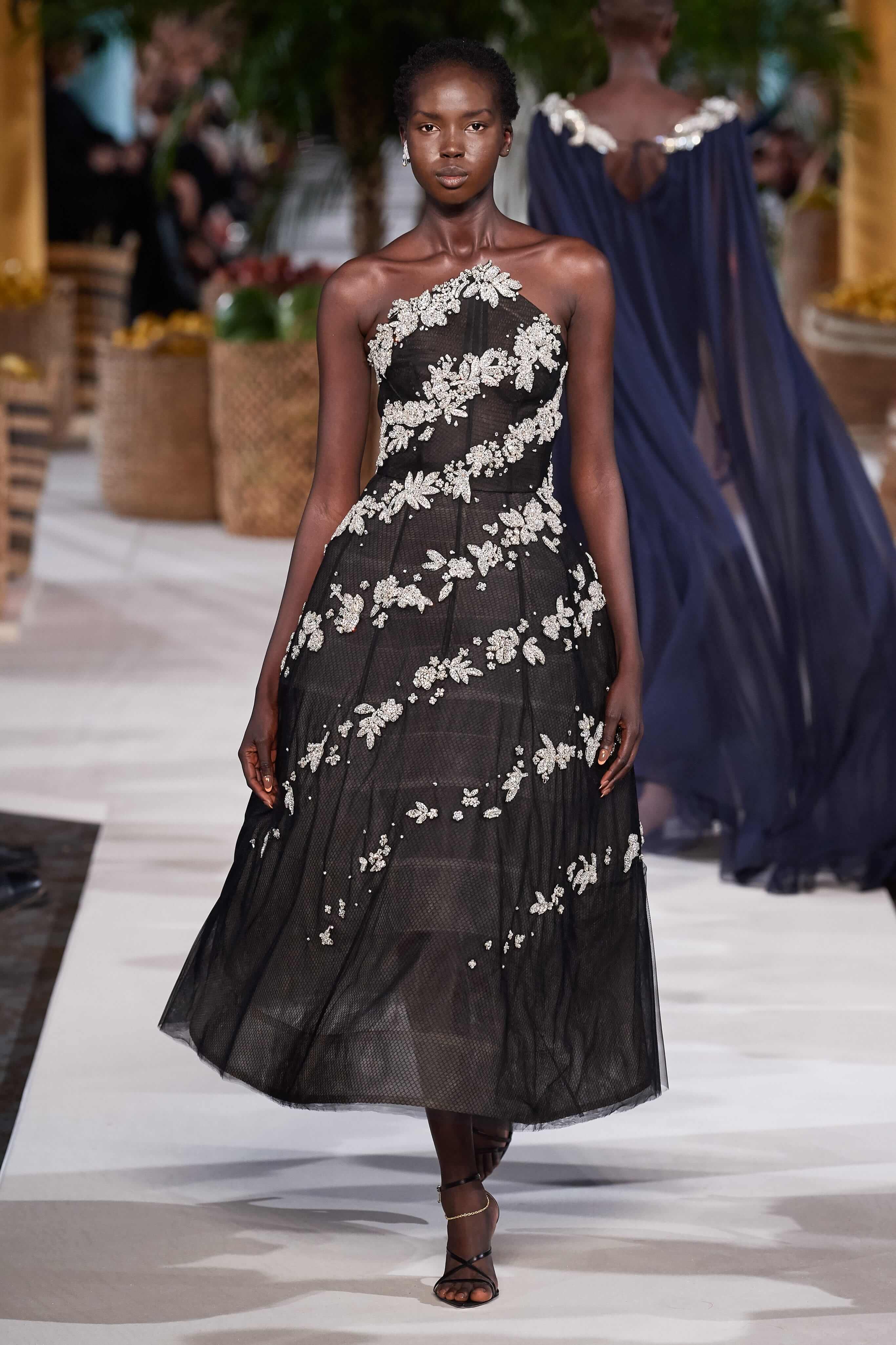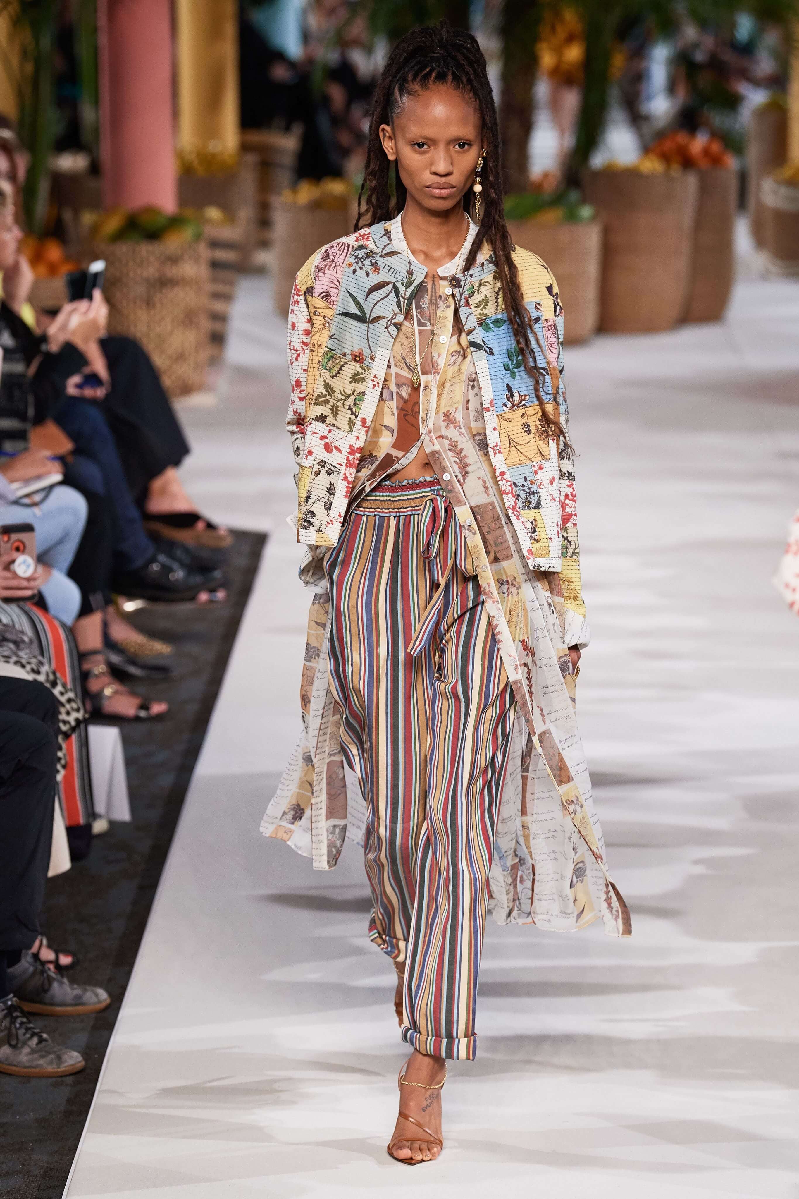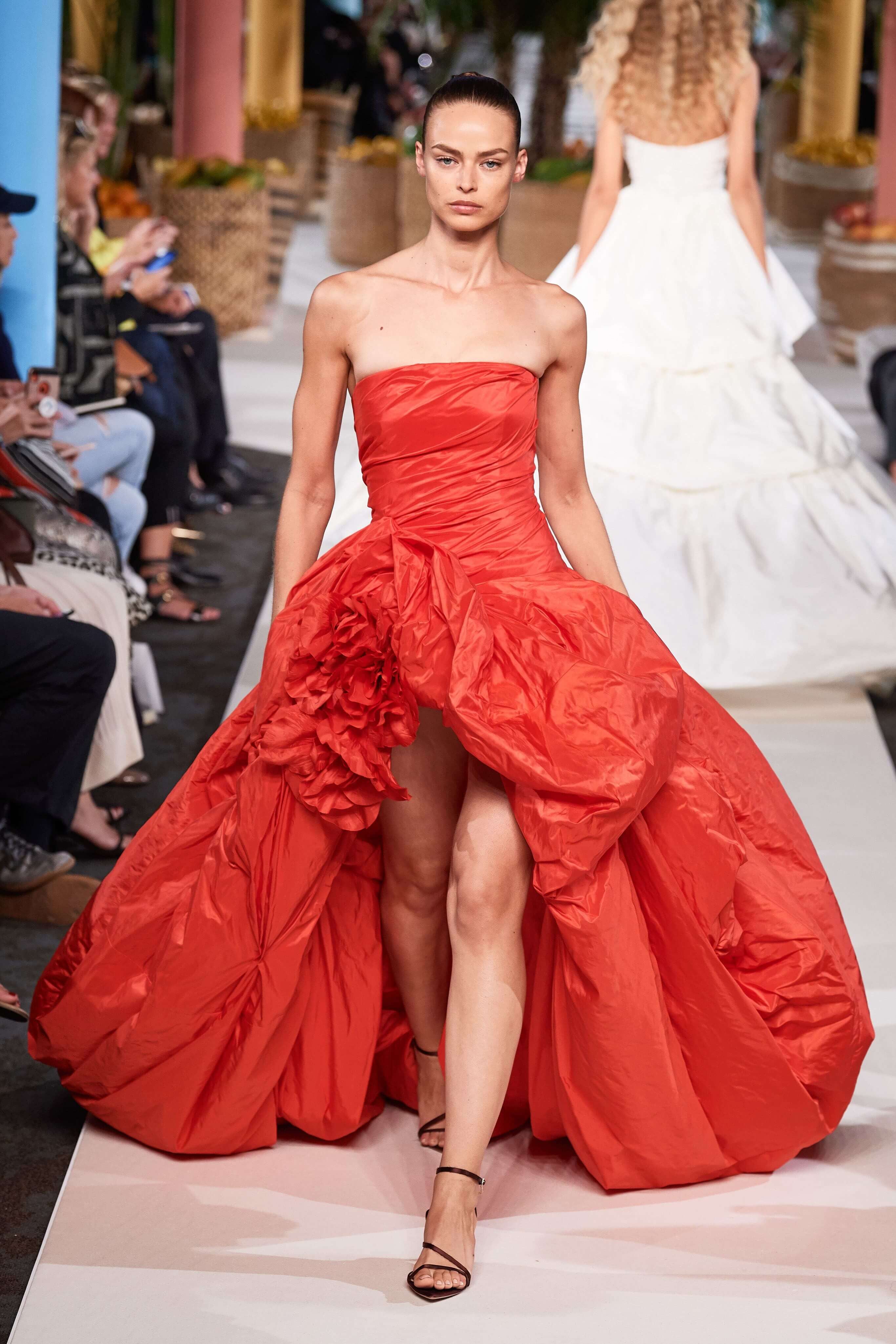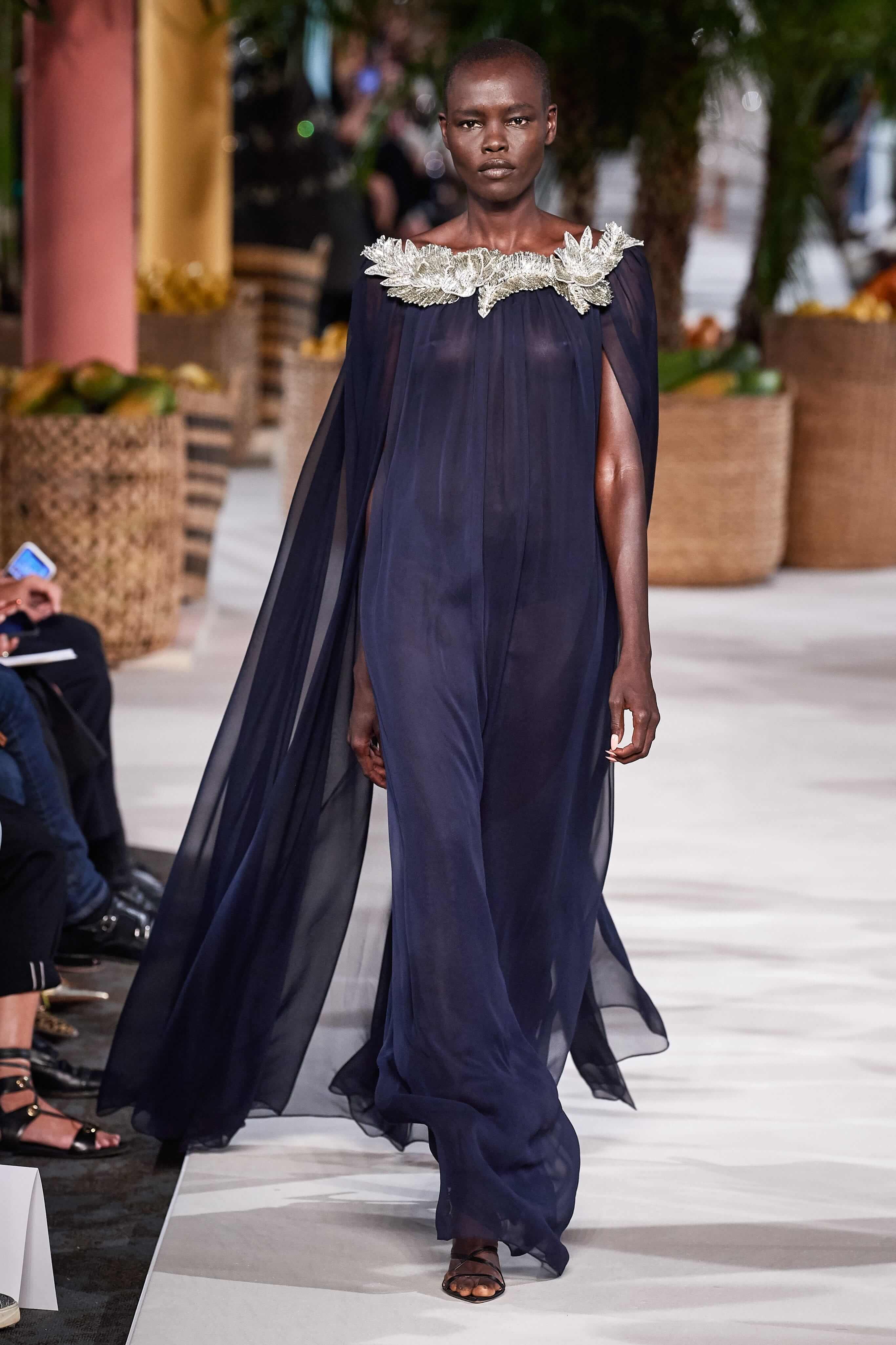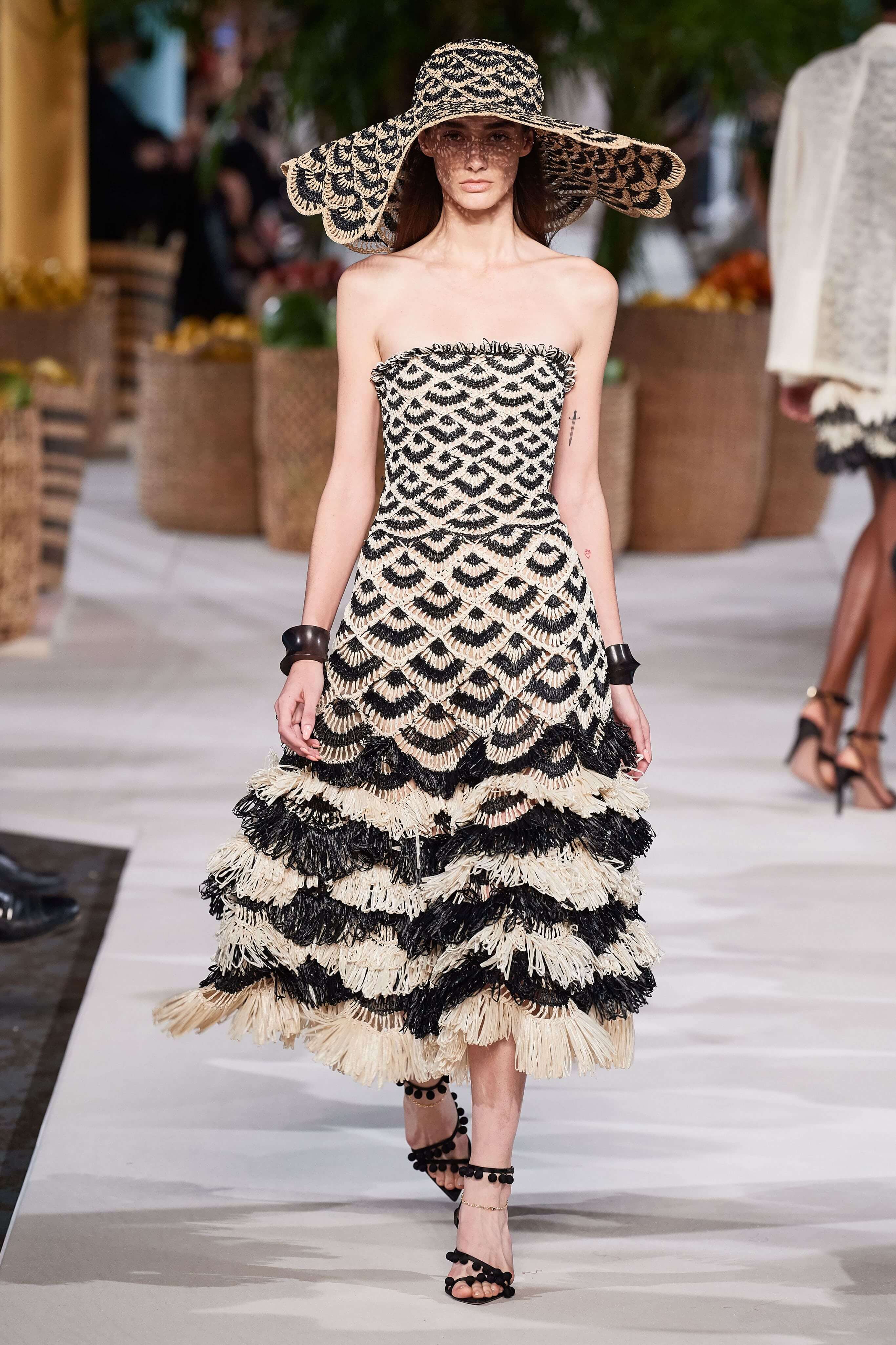 Дизайнеров Лауру Ким и Фернандо Гарсиа вдохновляют география и визуальная культура разных стран. В прошлых сезонах это были Марокко и Испания, на этот раз — родина сеньора де ла Ренты, Доминикана. Традиционную для бренда линию шелковых и атласных вечерних платьев дополнили жизнерадостные наряды в романтичном духе Латинской Америки: облегающие платья в полоску, как на карнавальной карусели, и с декором из разноцветных кисточек, драпированные юбки, мелко плиссированные платья и торжественные белые и черные халаты в пышных букетах цветов, завязанные на бёдрах огромными бантами мини и будто ритуальные шаманские платья-хламиды, украшенные длинными нитями бусин.