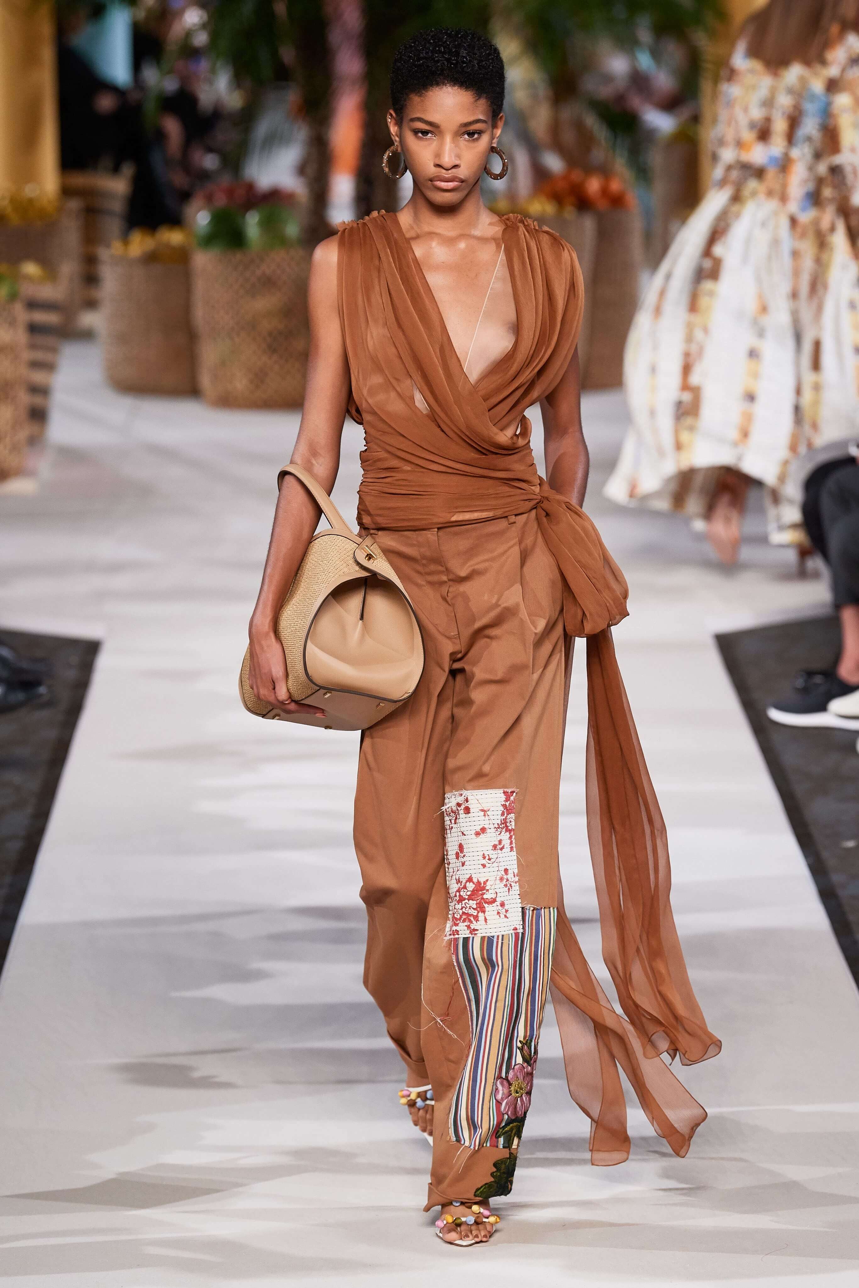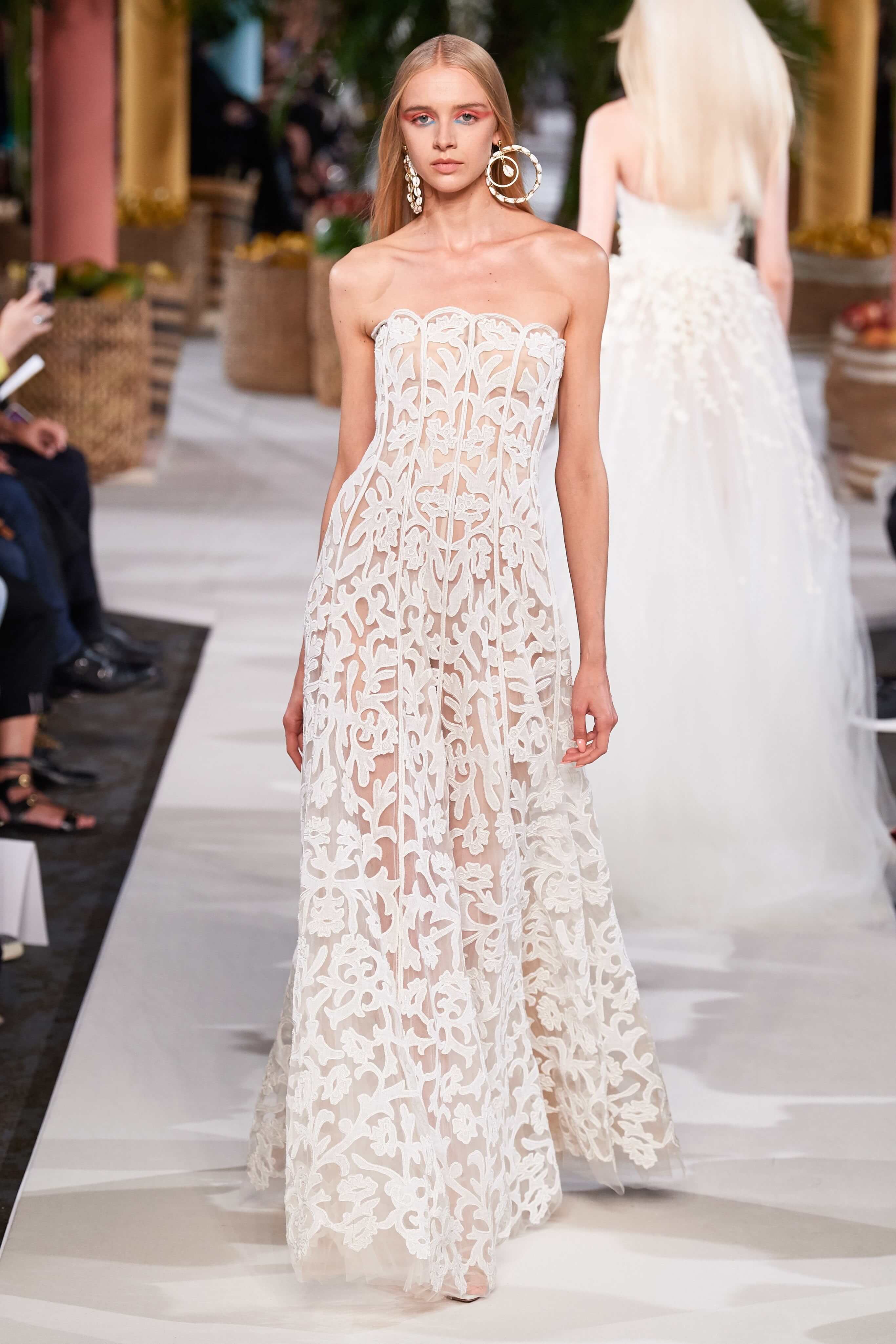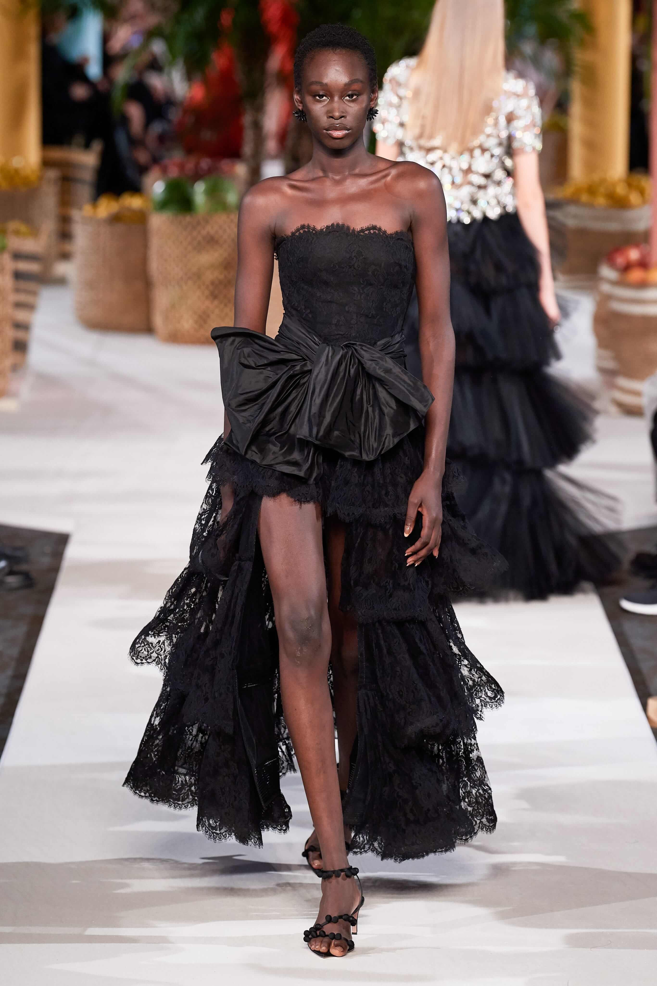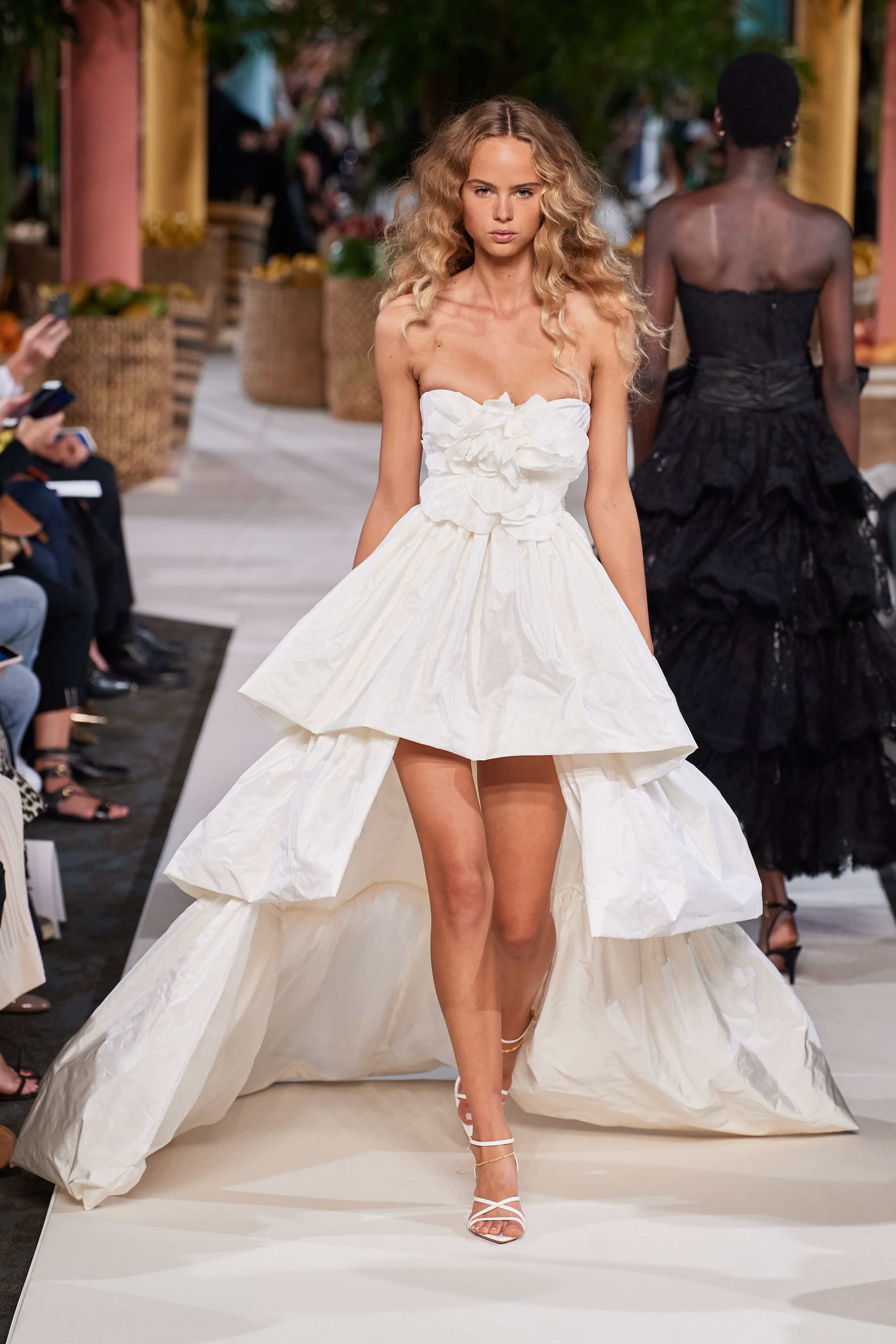 Модель Ирина Шейк вышла на подиум в свадебном платье драматичного черного цвета, а летящие платья в принтах "пэчворк" сменялись на показе нарядами пустынных оттенков и сдержанных фактур. Традиционную роскошь Oscar de la Renta дизайнерский дуэт воплотил в "резных" платьях и плащах из органзы с элементами шитого кружева. Вся коллекция выглядит как яркий всплеск радости и любви к жизни — разноцветная, карнавальная и бесконечно женственная.