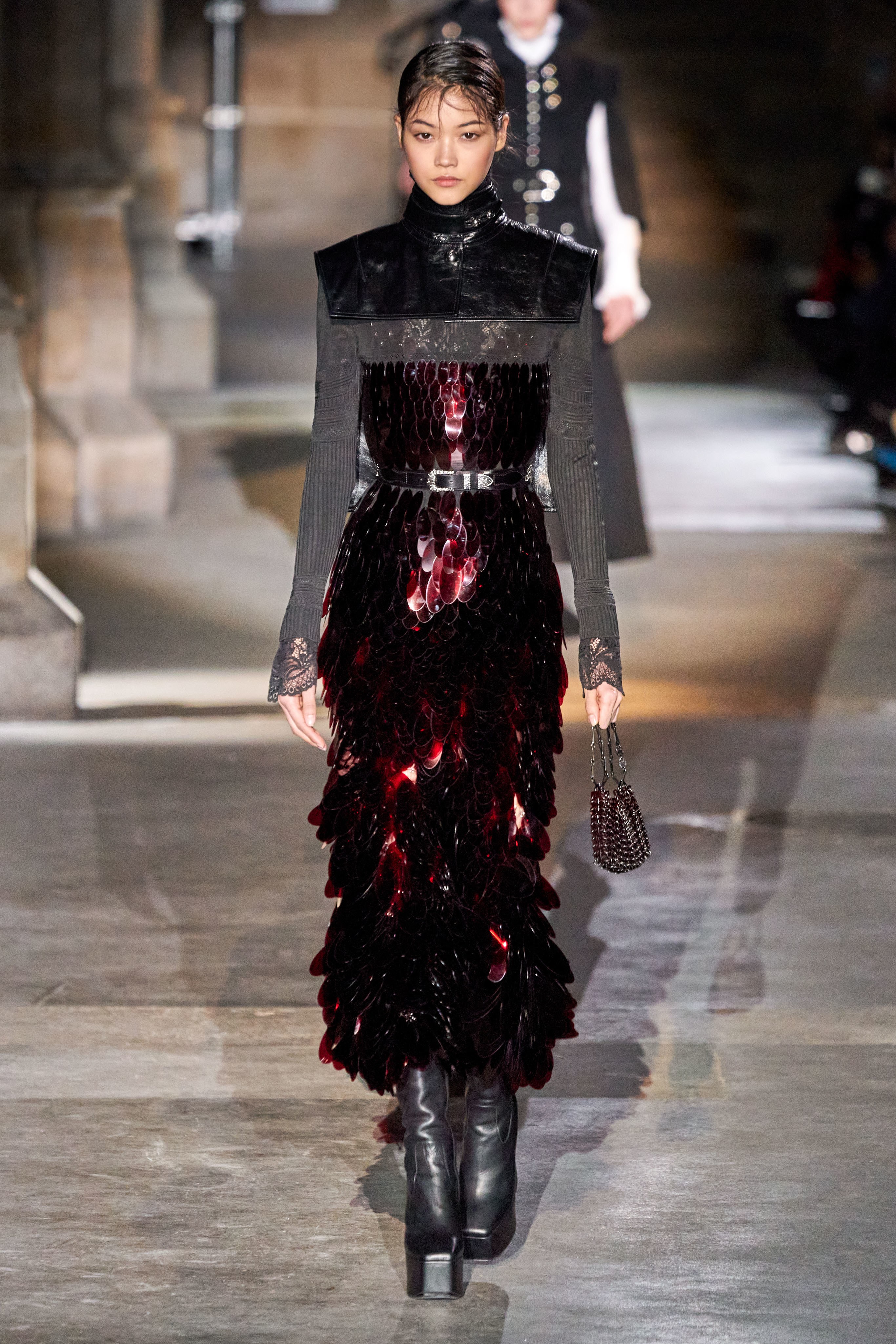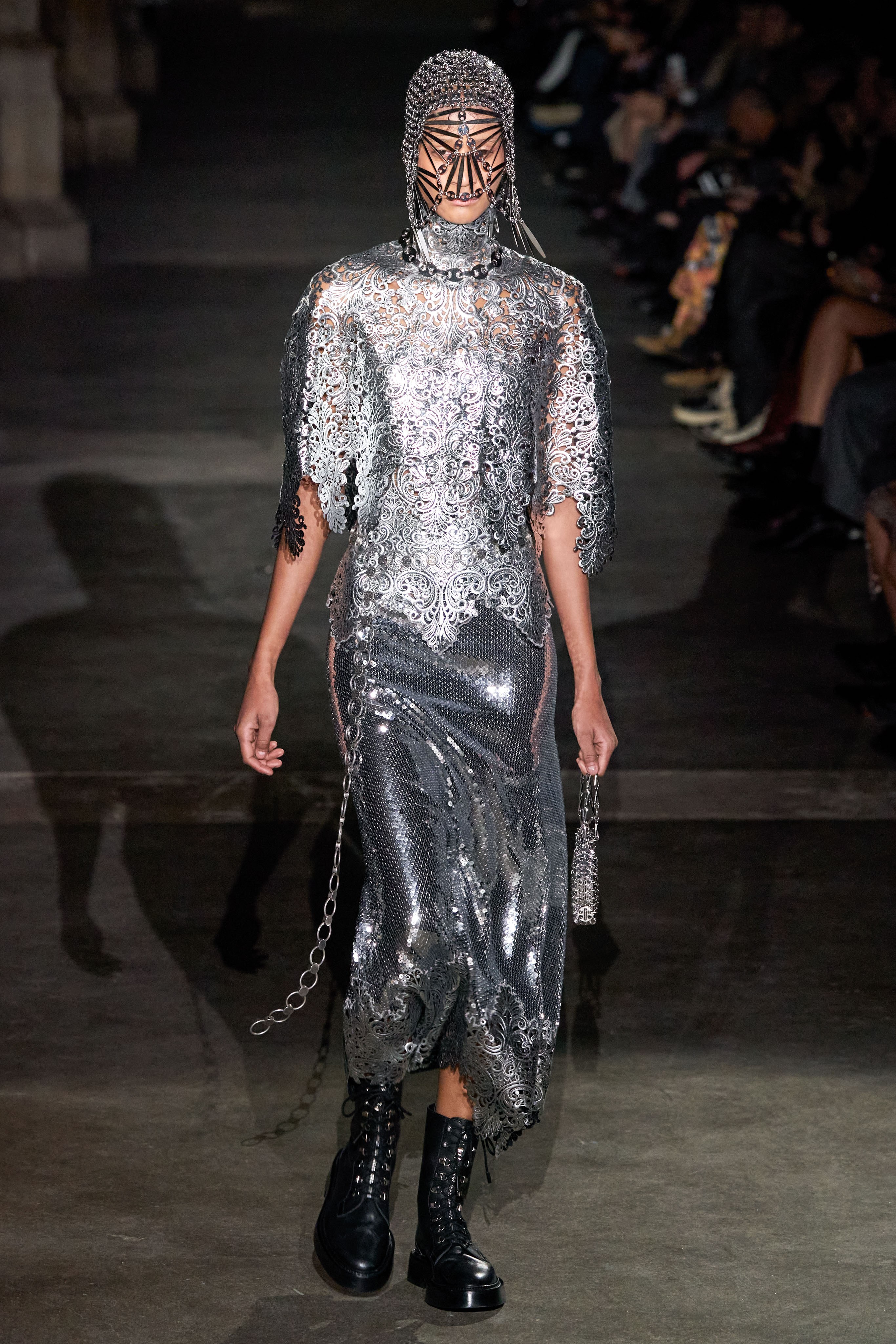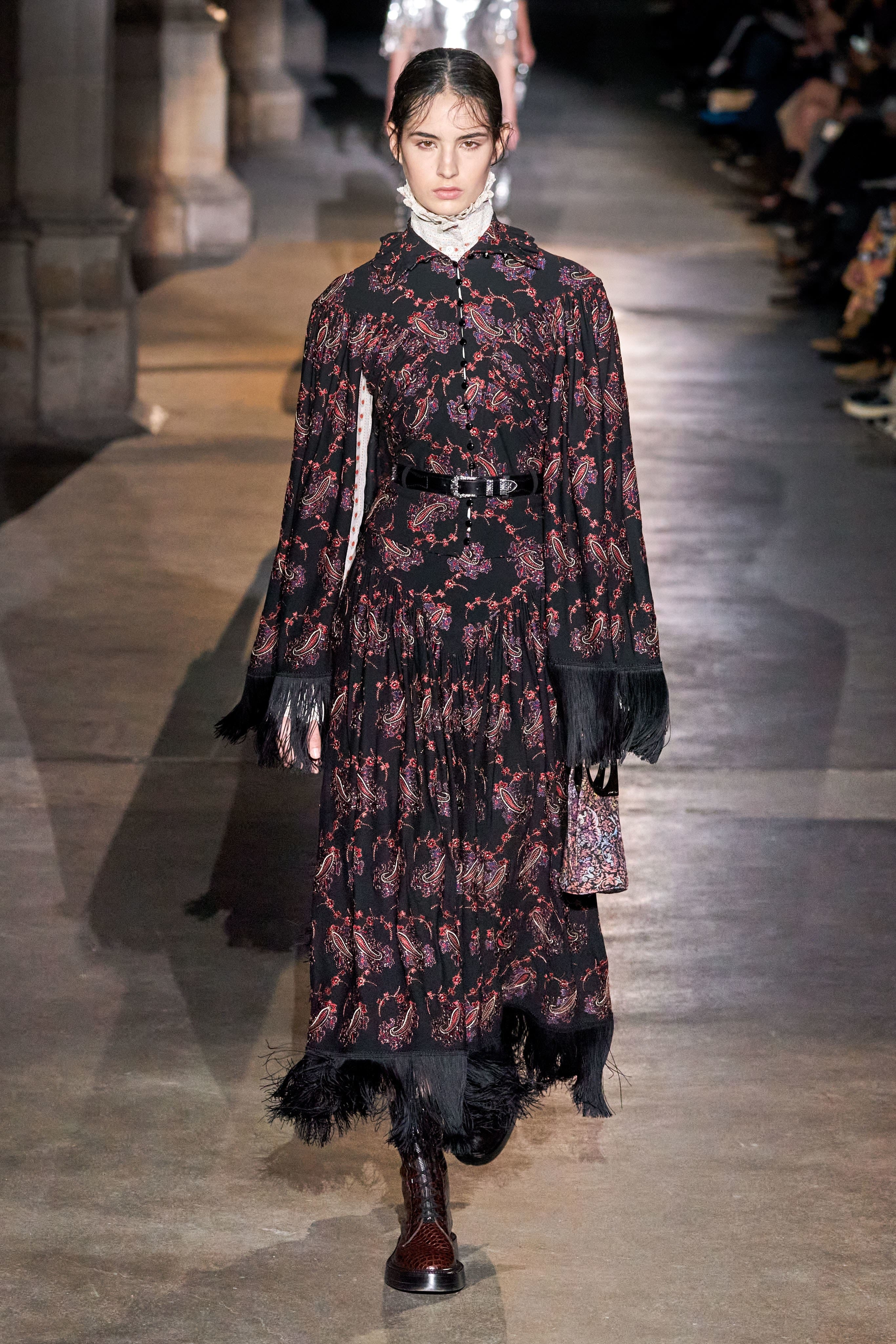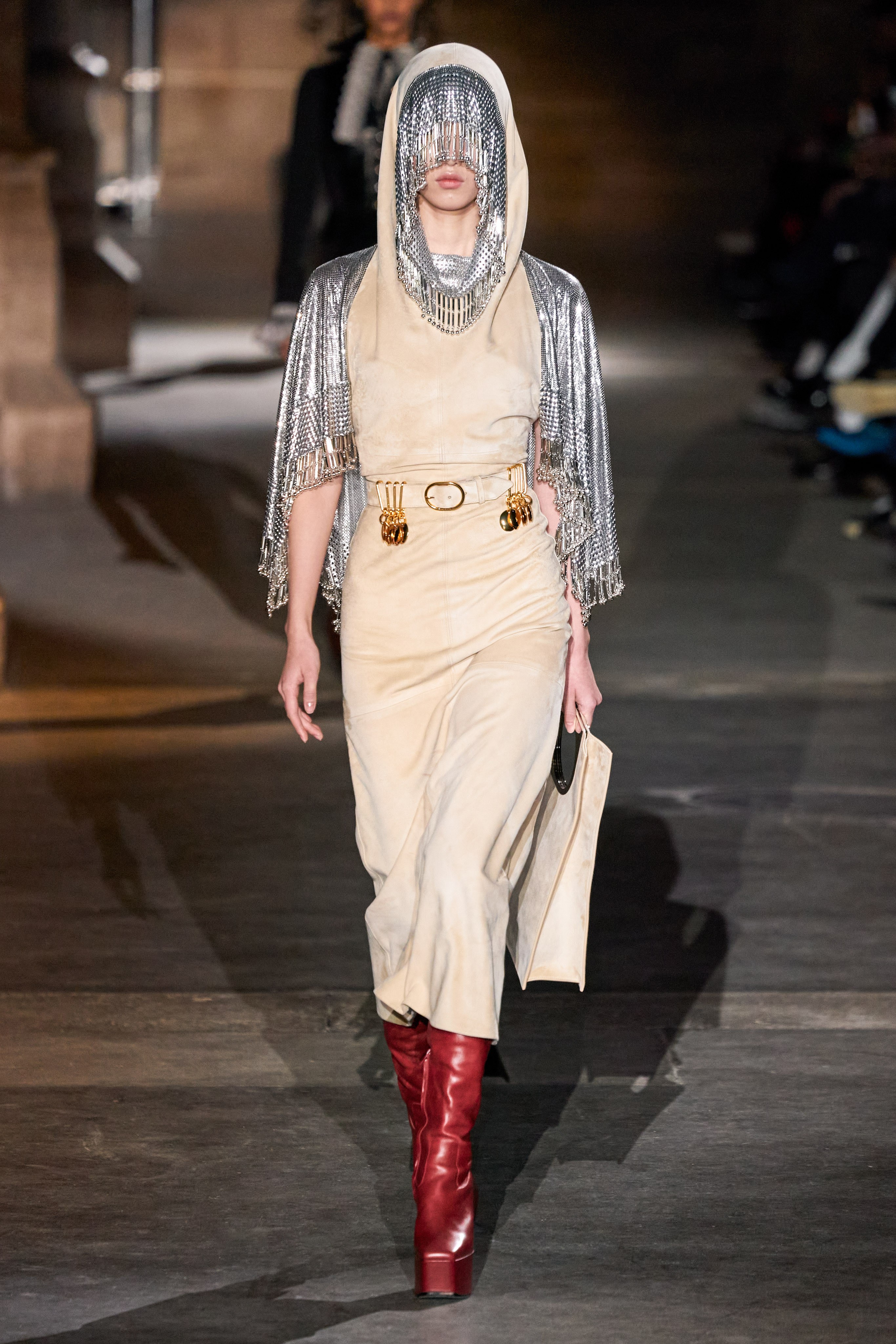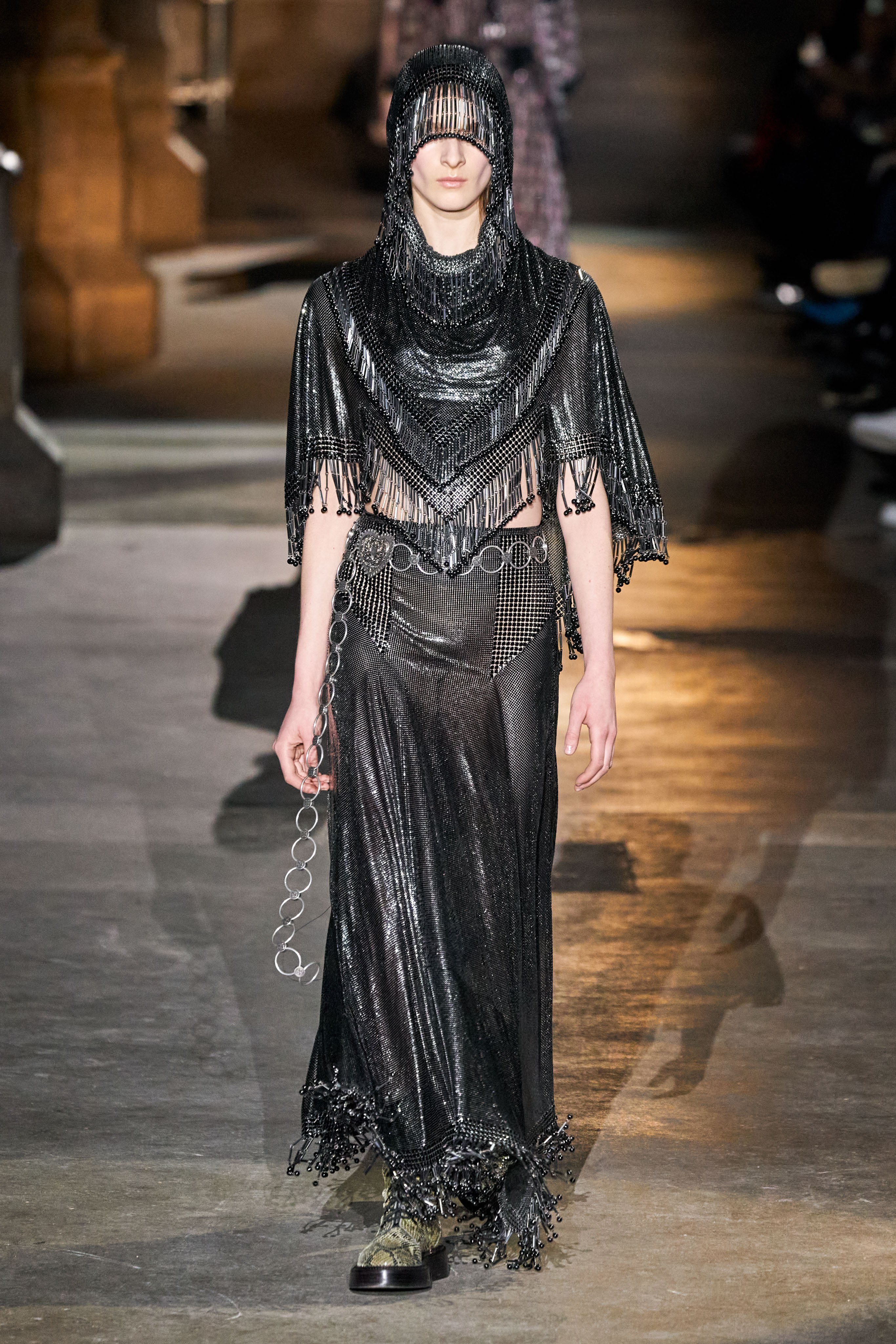 Ключевые элементы: структурные платья с кокетками и вышивкой, кольчуги, кожаные жилеты и юбки миди, кейпы, узкие пальто с вышивкой, брючные костюмы, шапочки-кольчуги и балаклавы.