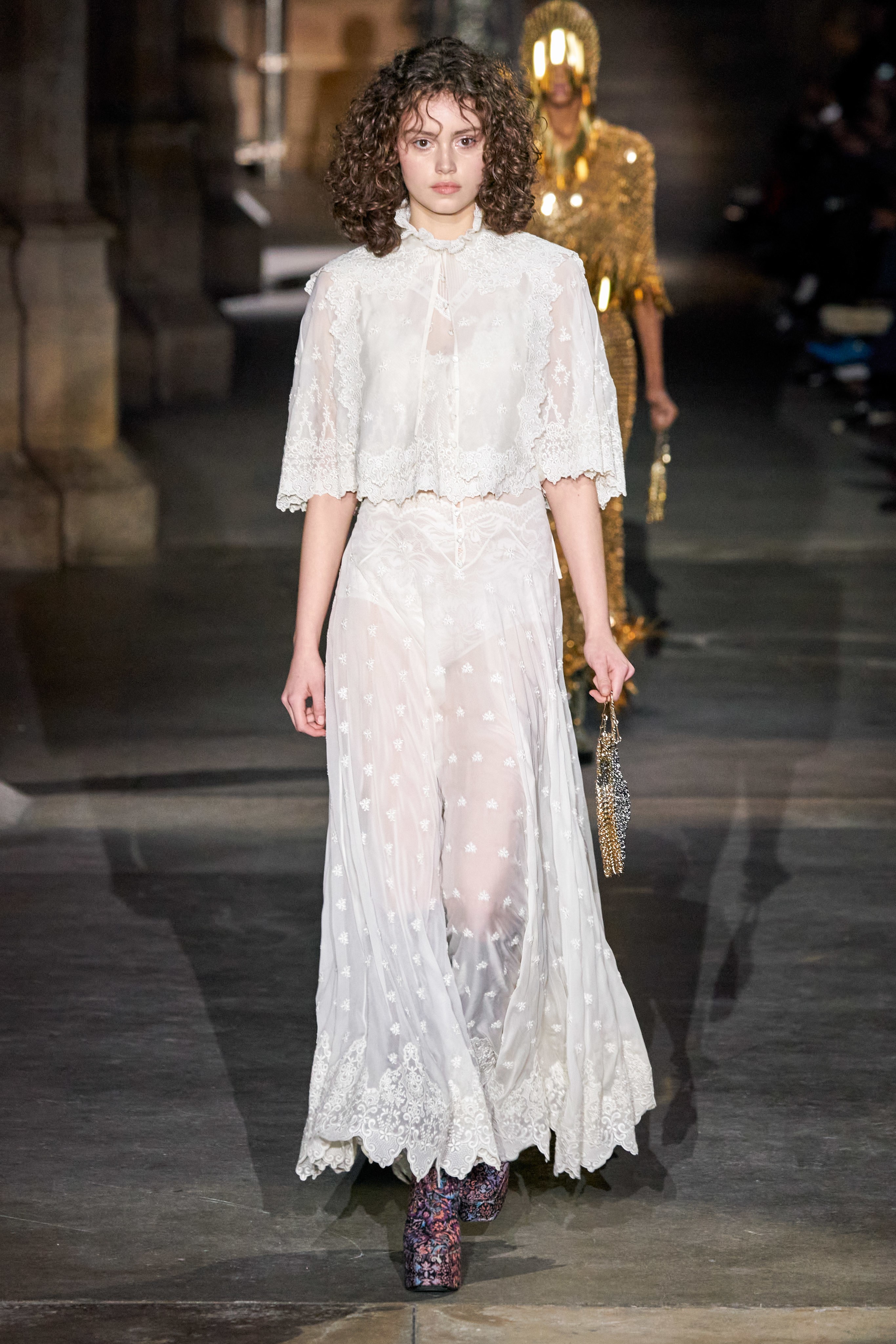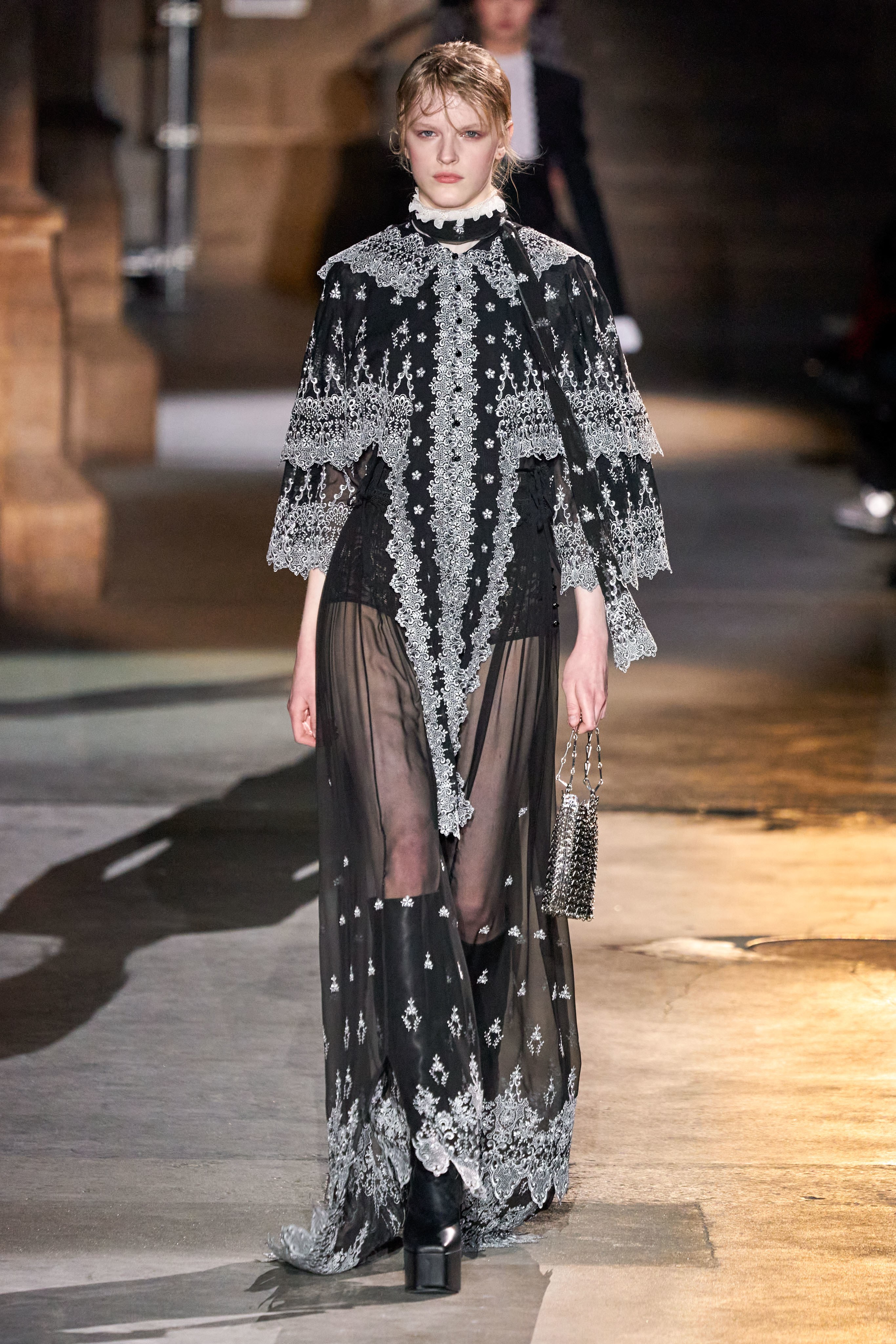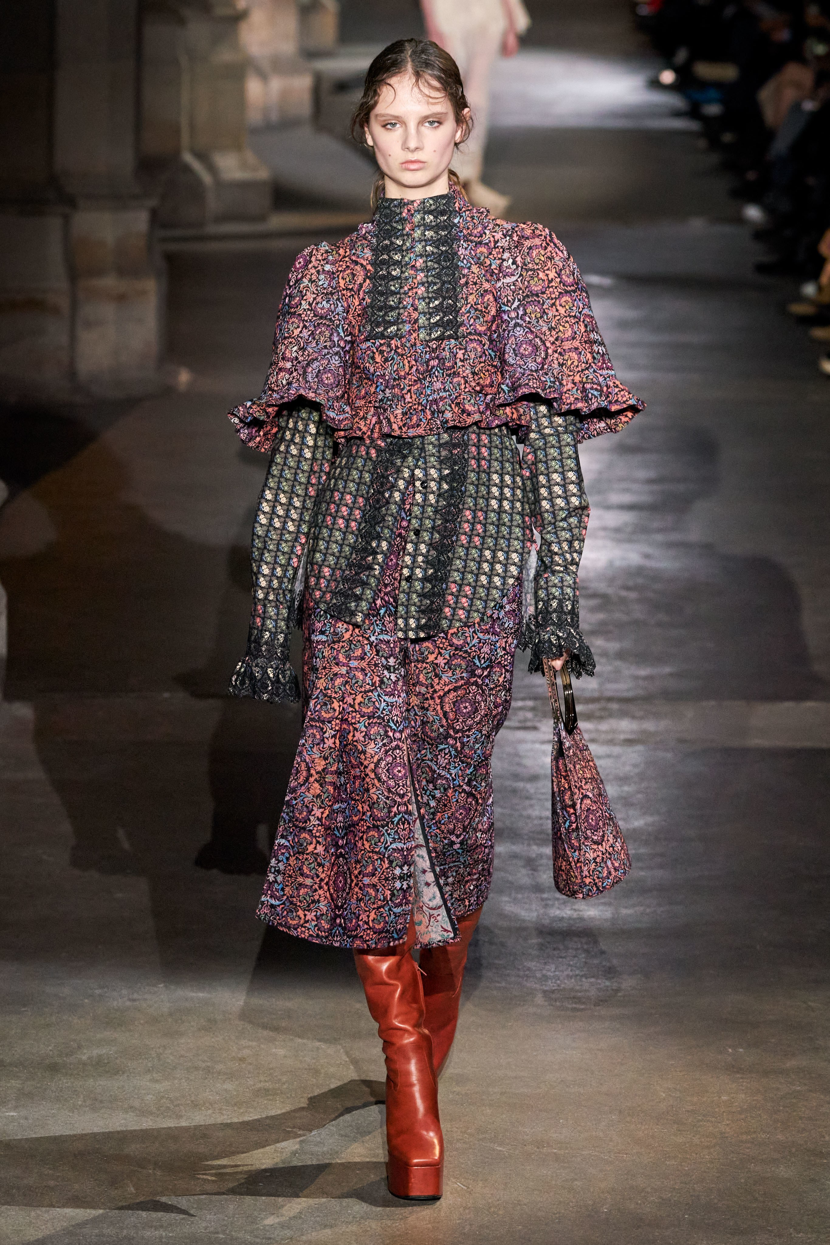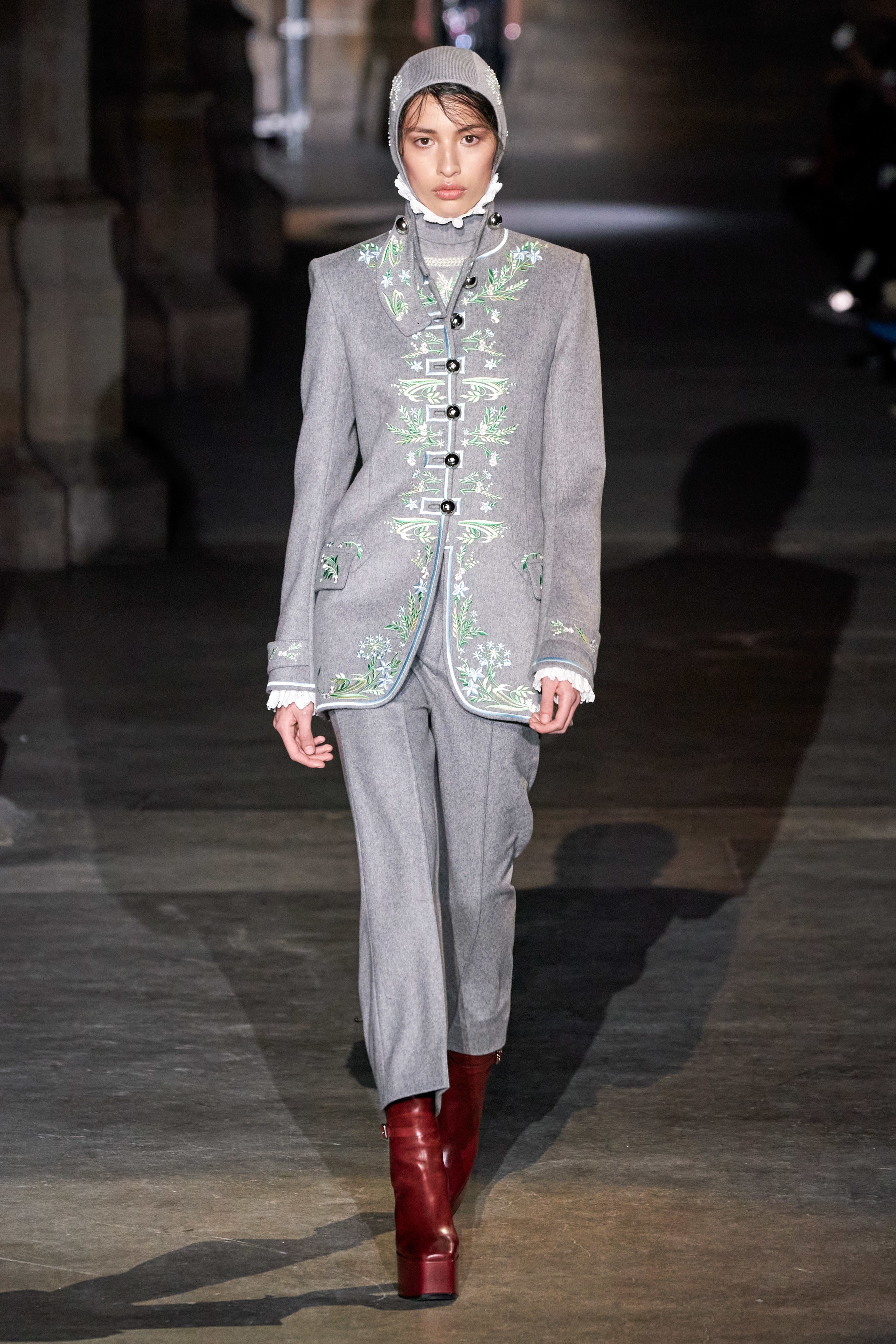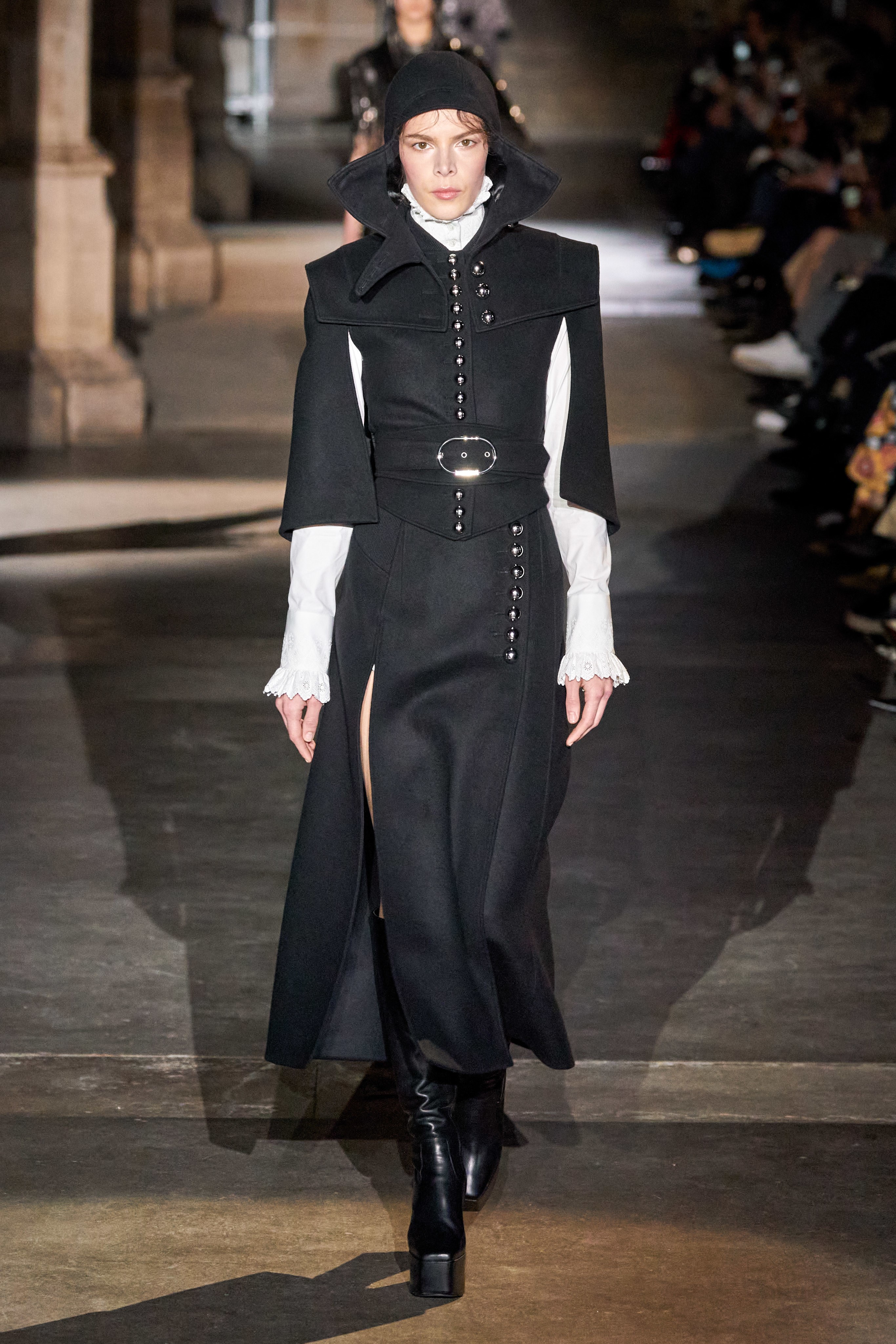 Ключевые элементы: структурные платья с кокетками и вышивкой, кольчуги, кожаные жилеты и юбки миди, кейпы, узкие пальто с вышивкой, брючные костюмы, шапочки-кольчуги и балаклавы.