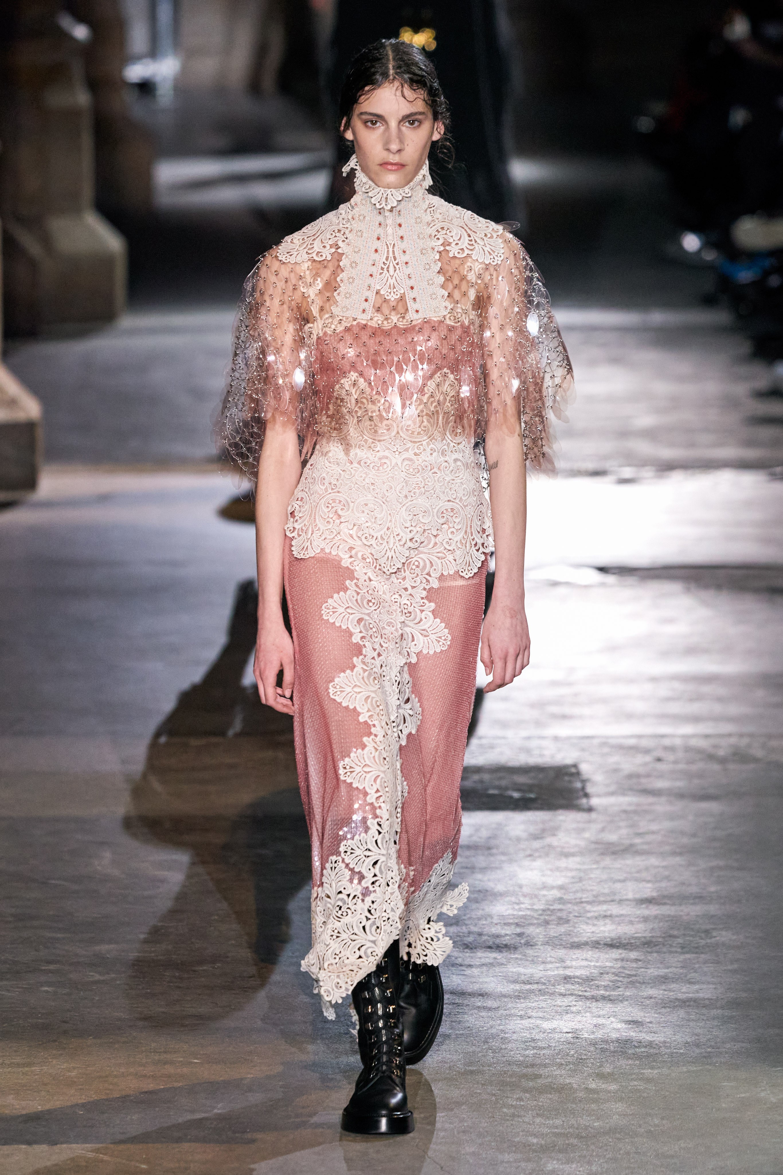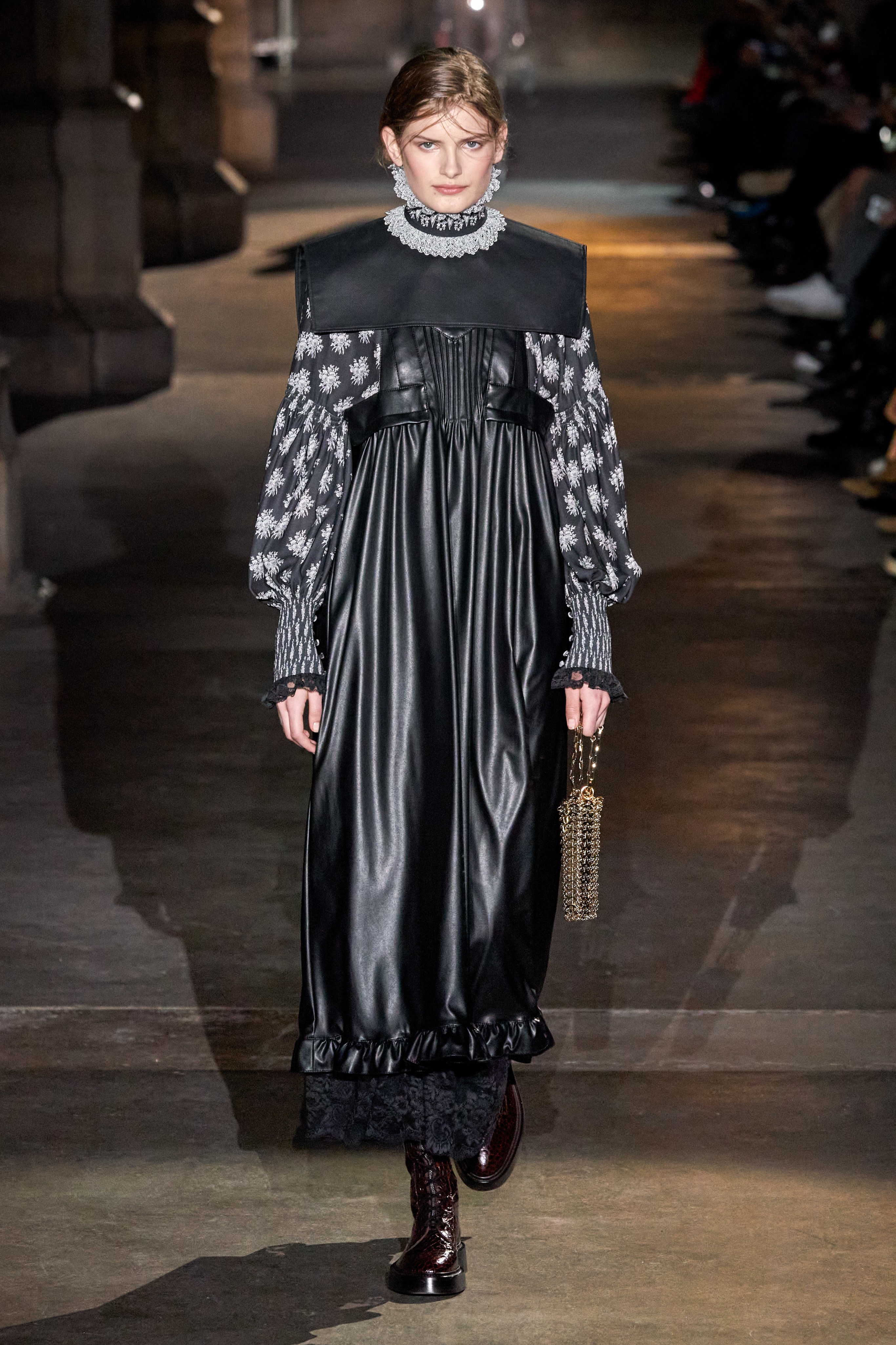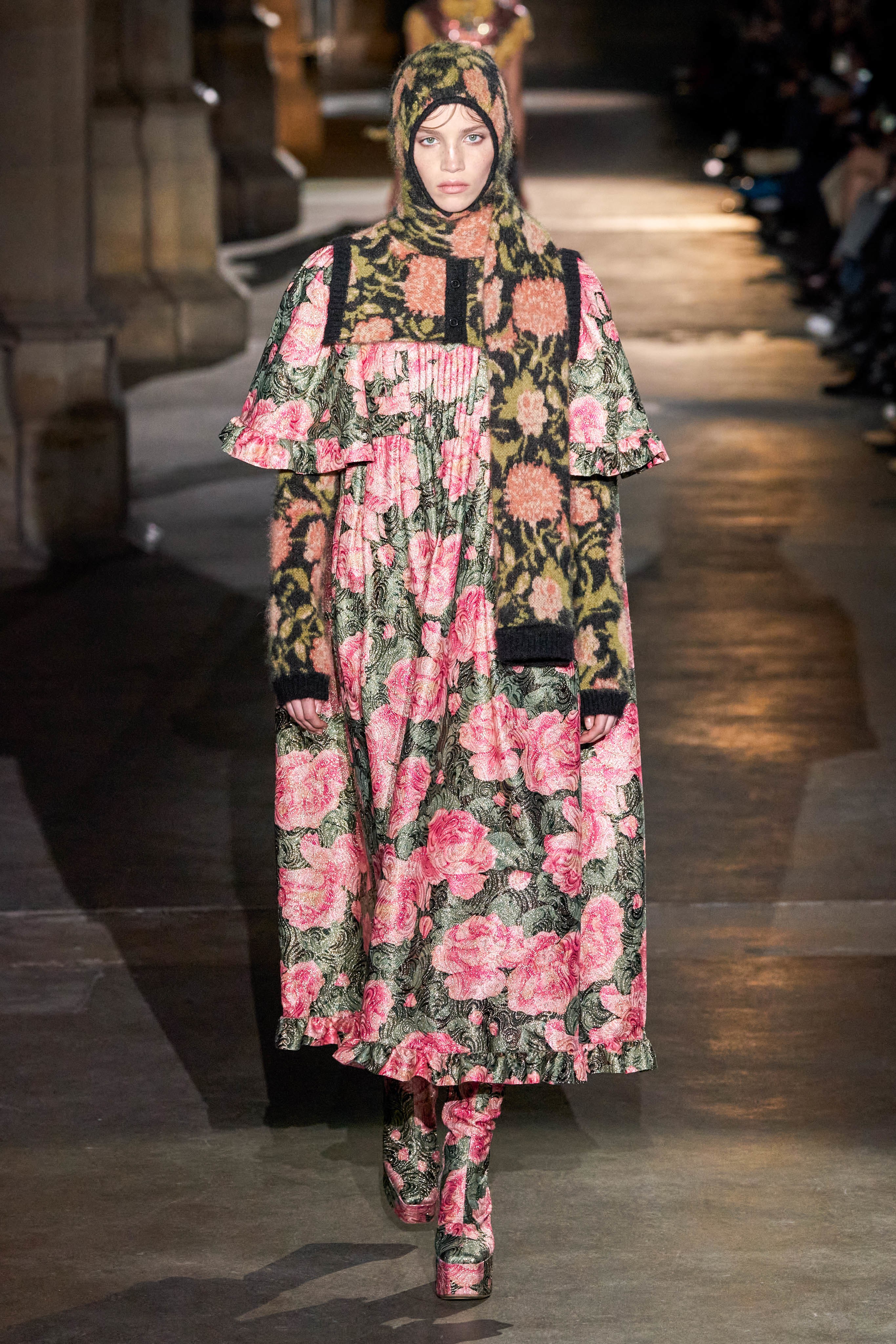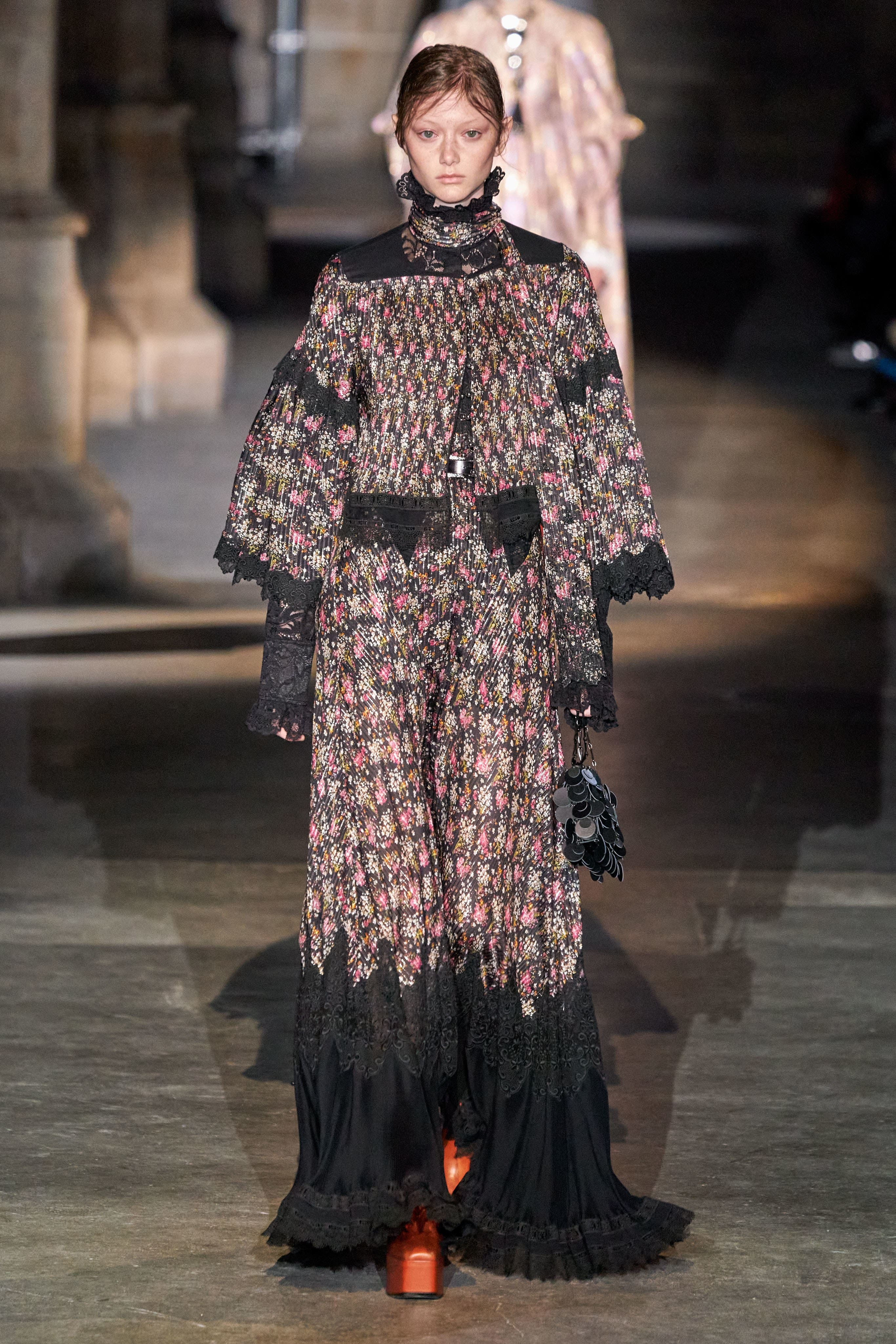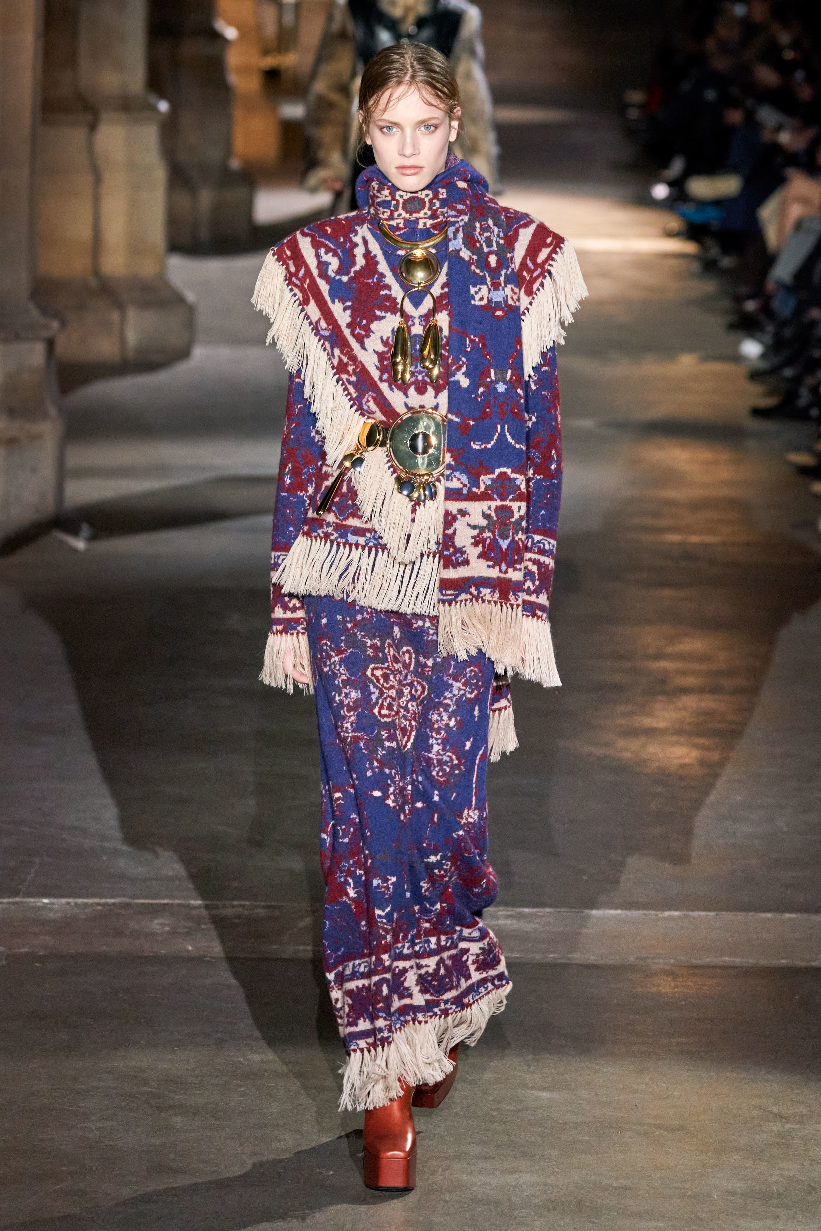 Ключевые элементы: структурные платья с кокетками и вышивкой, кольчуги, кожаные жилеты и юбки миди, кейпы, узкие пальто с вышивкой, брючные костюмы, шапочки-кольчуги и балаклавы.
