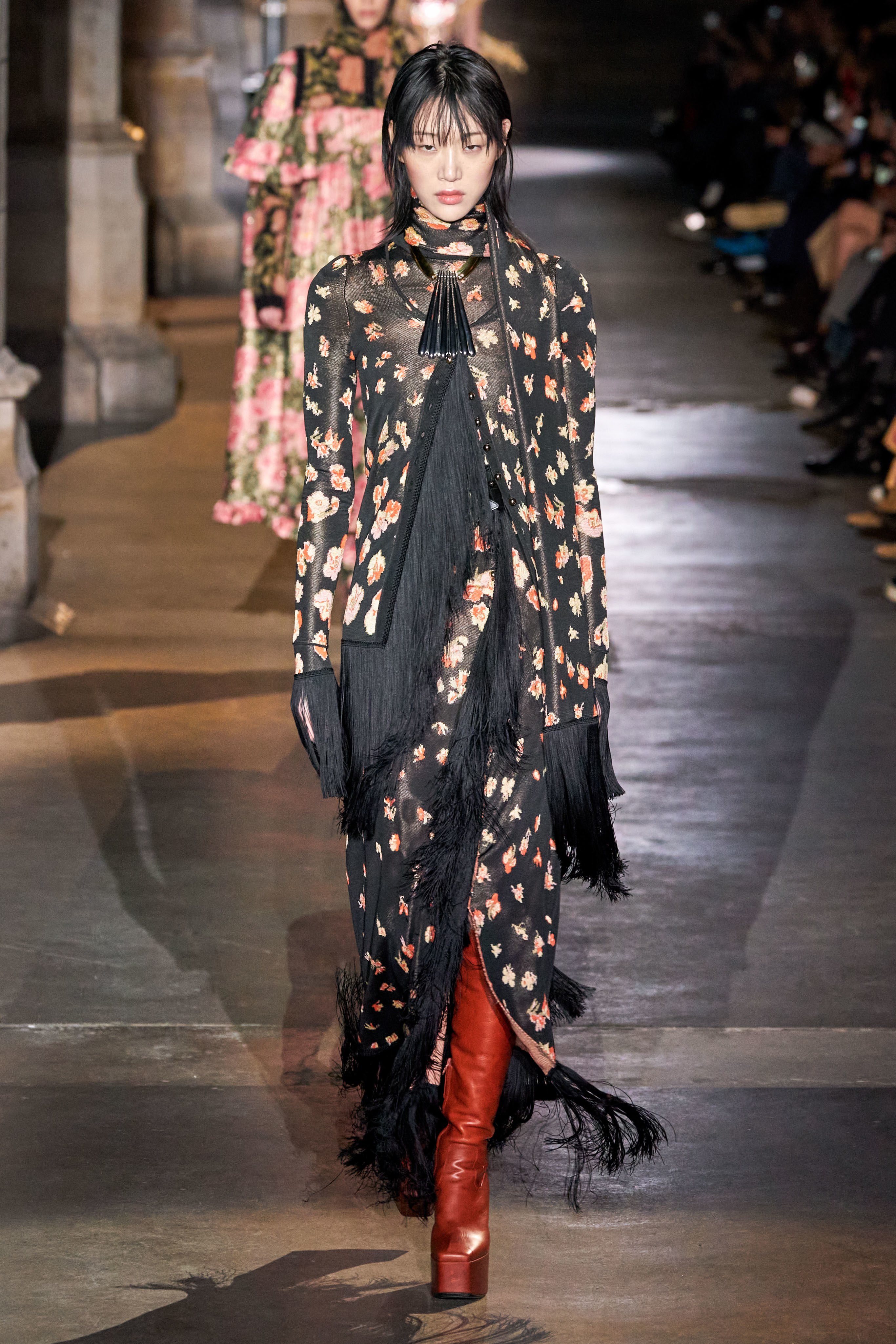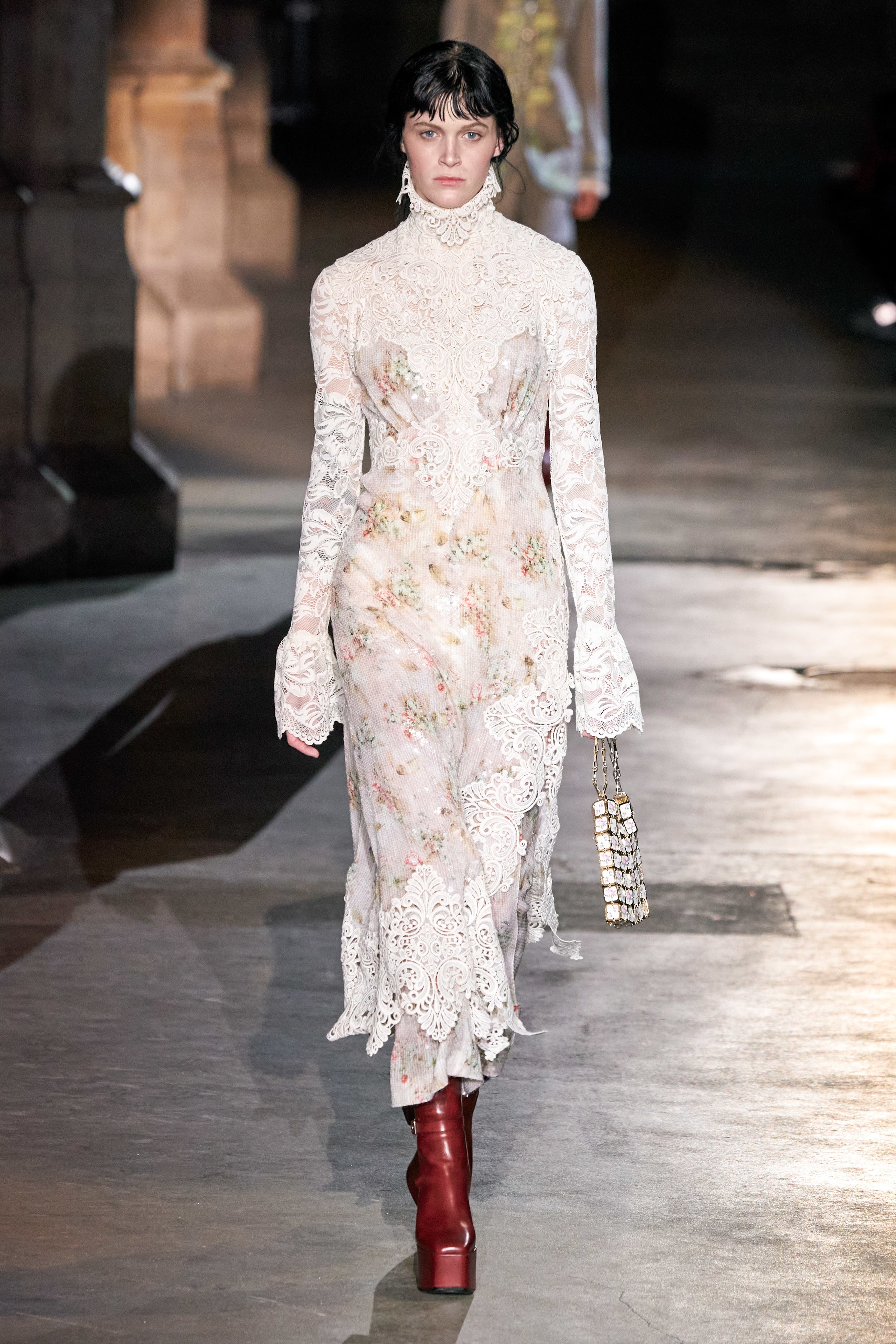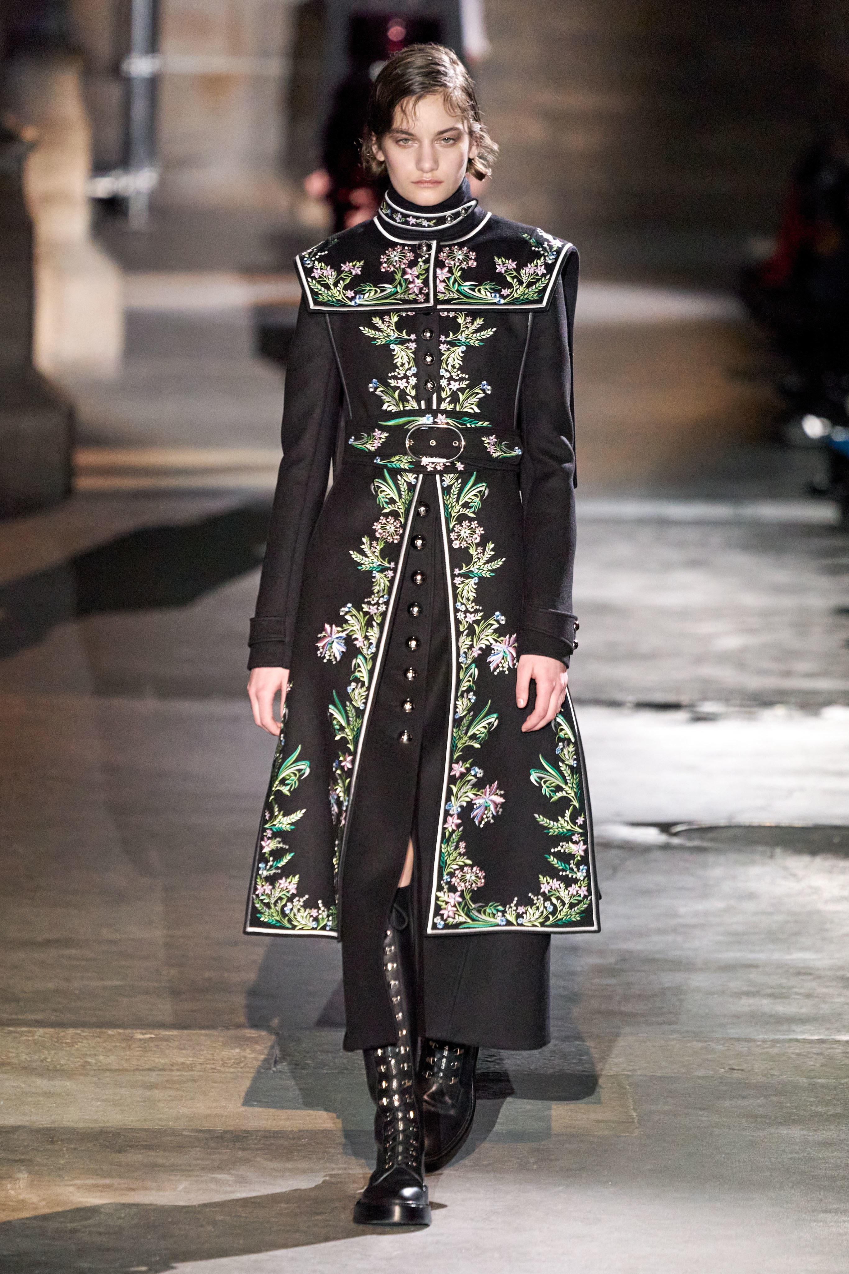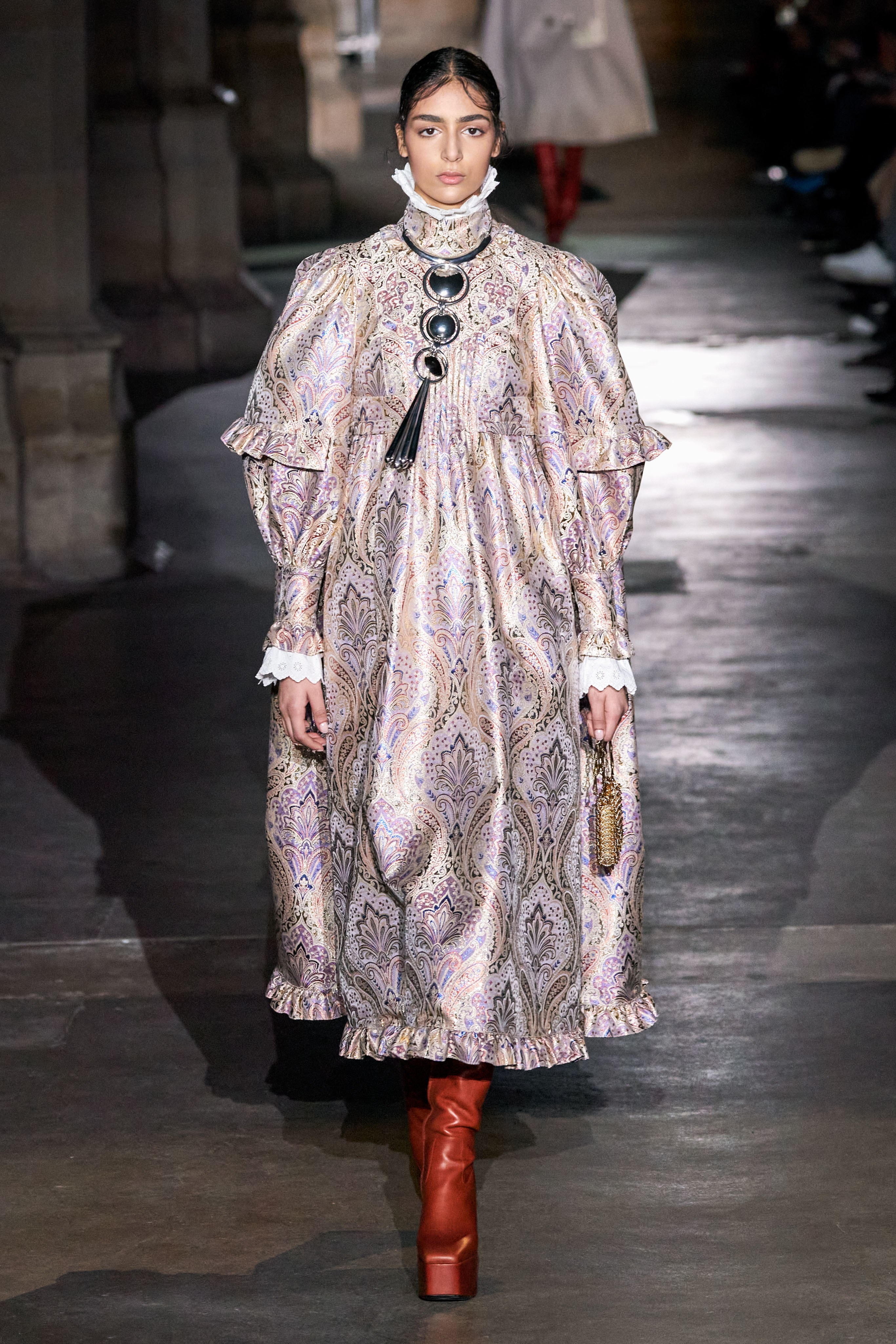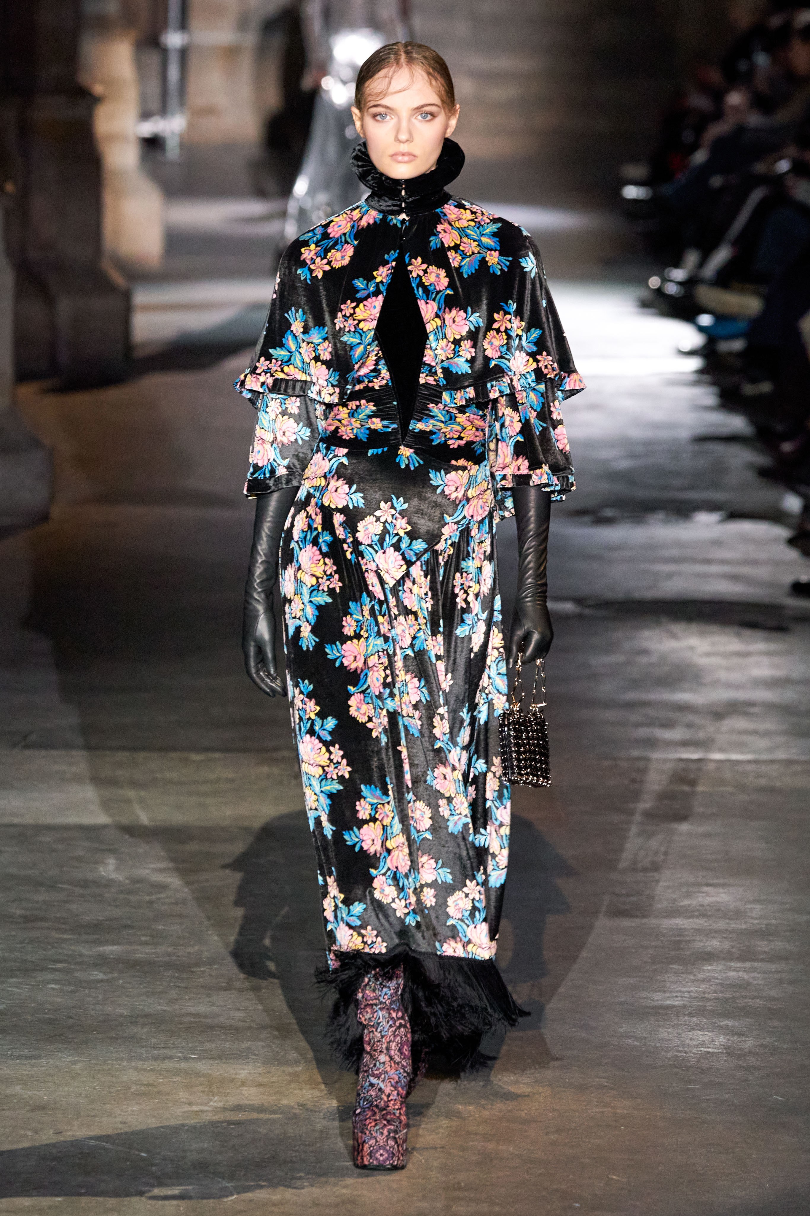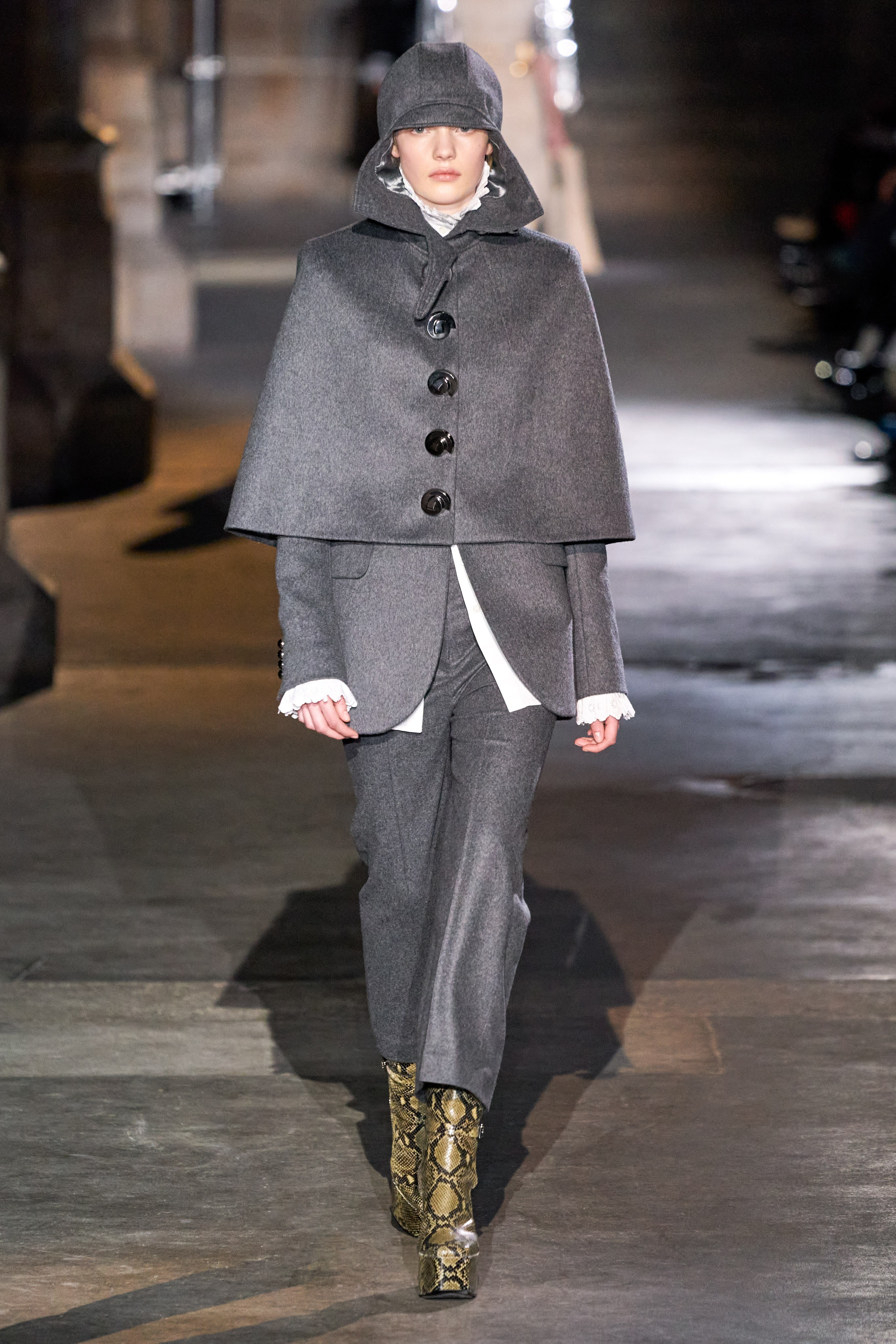 Ключевые элементы: структурные платья с кокетками и вышивкой, кольчуги, кожаные жилеты и юбки миди, кейпы, узкие пальто с вышивкой, брючные костюмы, шапочки-кольчуги и балаклавы.