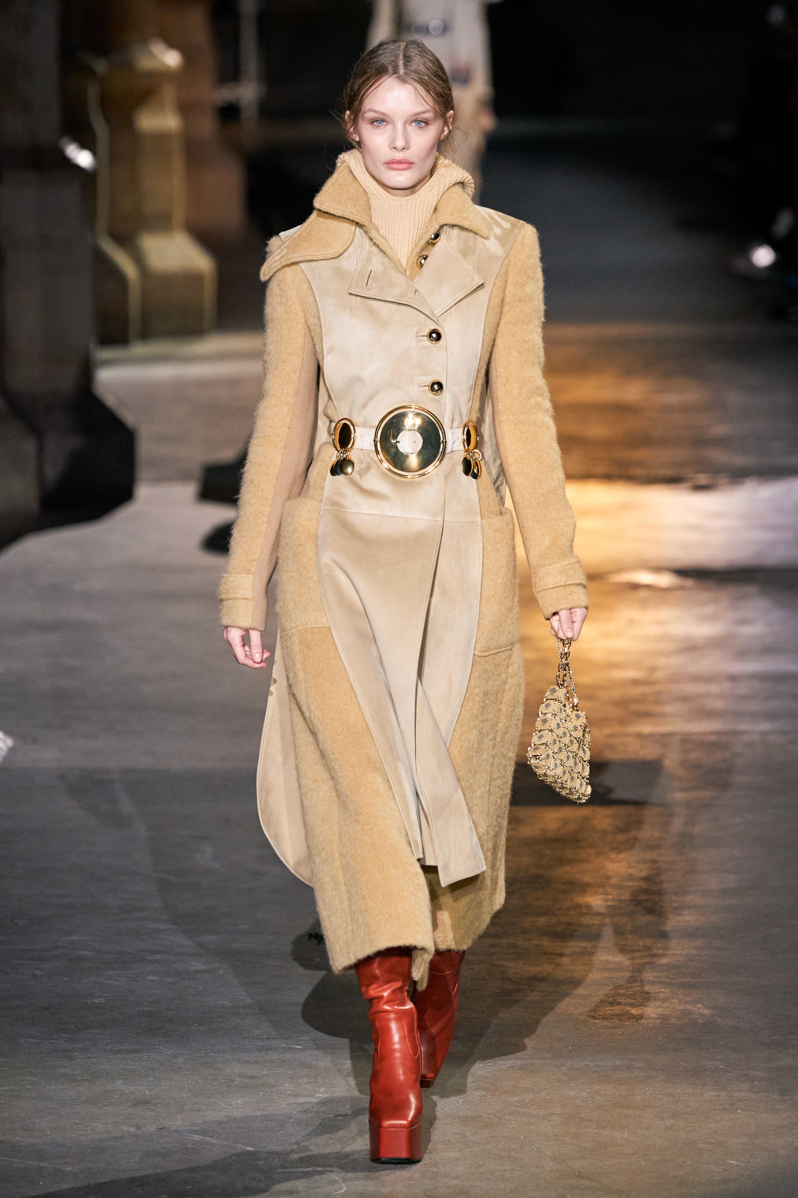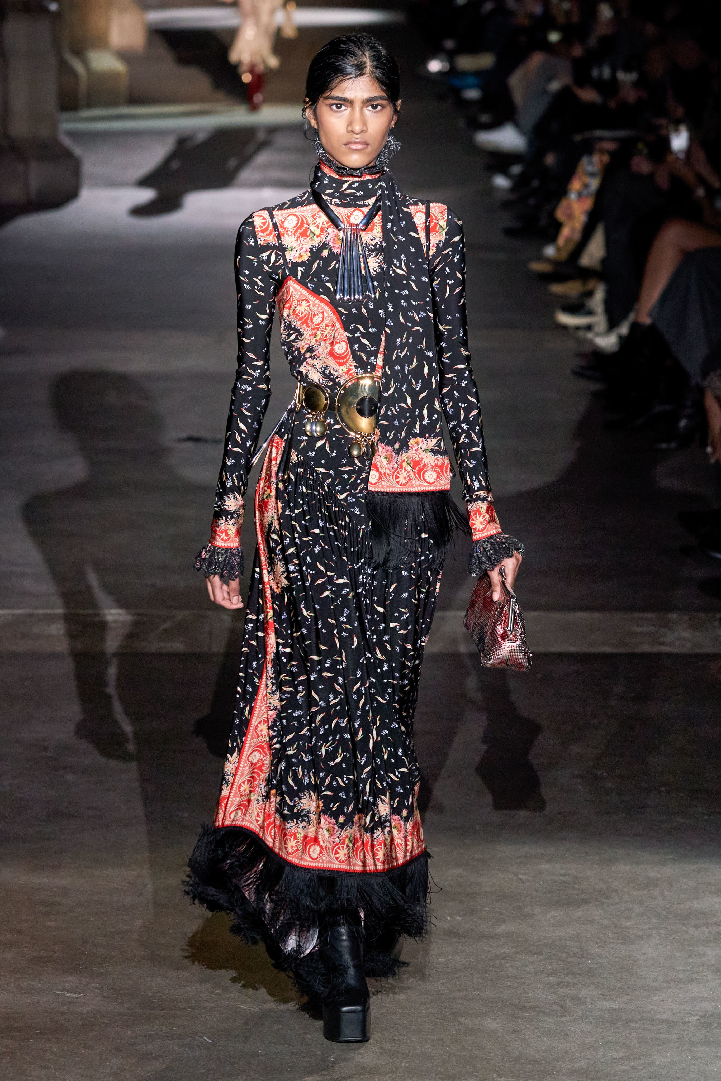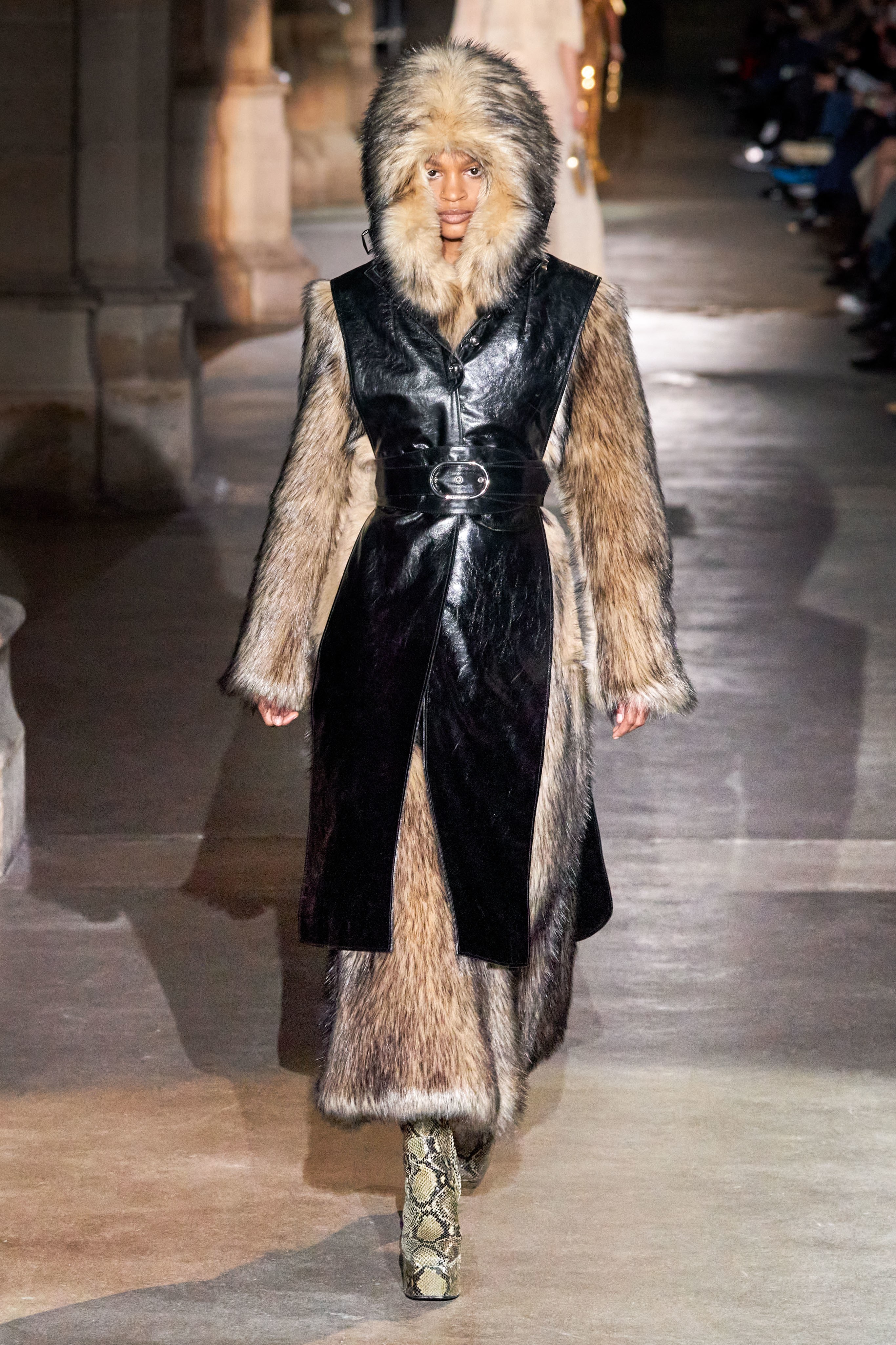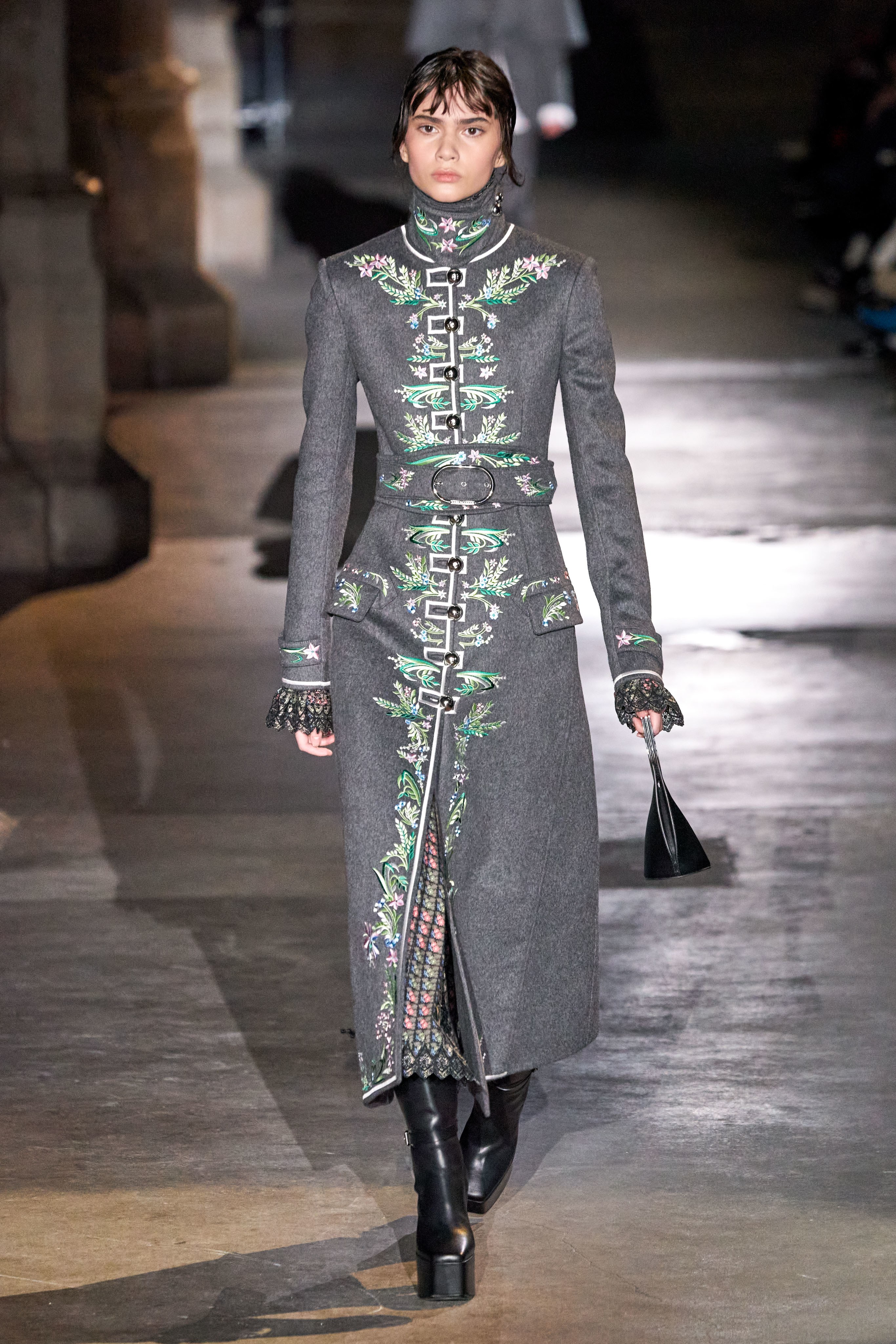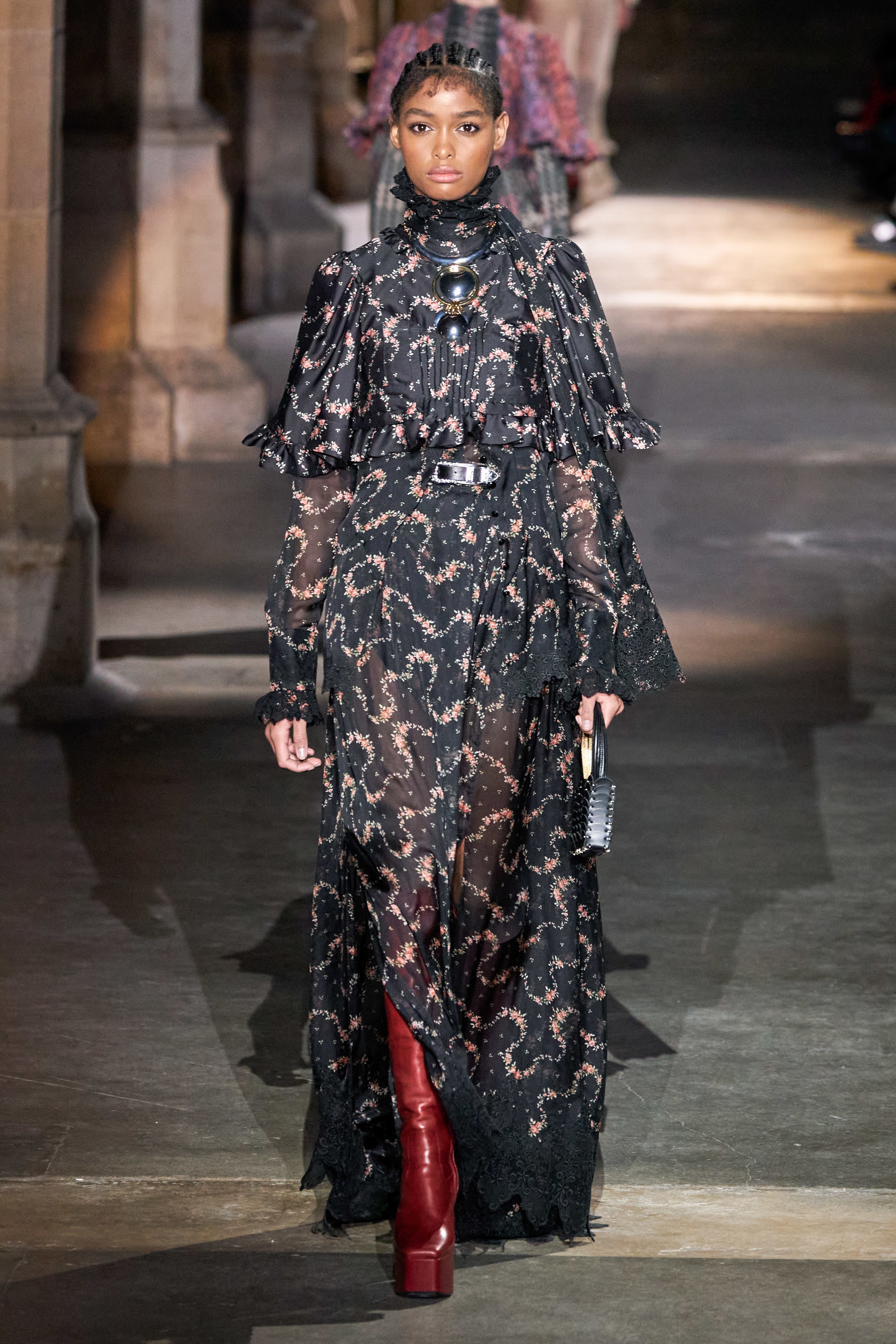 Ключевые элементы: структурные платья с кокетками и вышивкой, кольчуги, кожаные жилеты и юбки миди, кейпы, узкие пальто с вышивкой, брючные костюмы, шапочки-кольчуги и балаклавы.