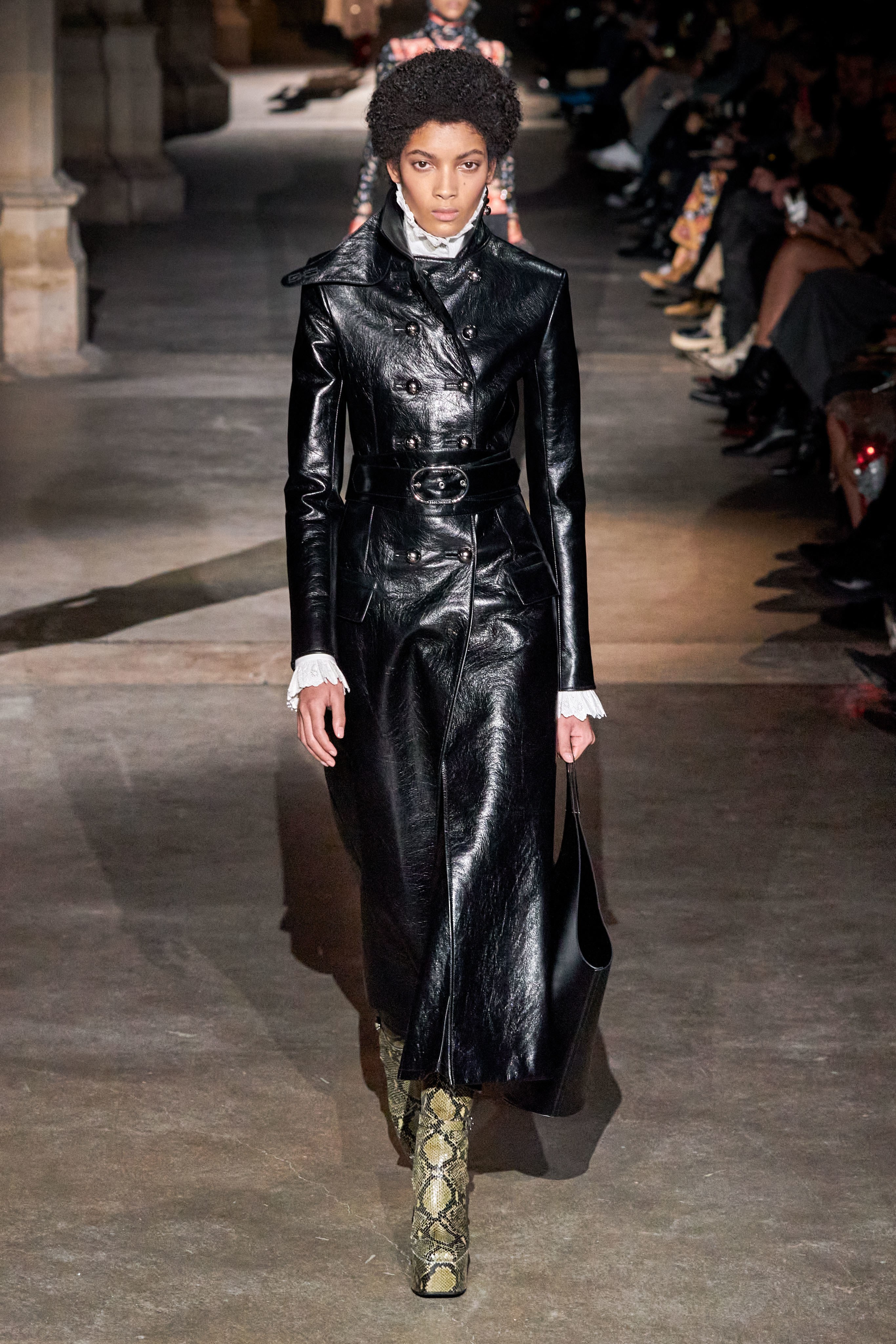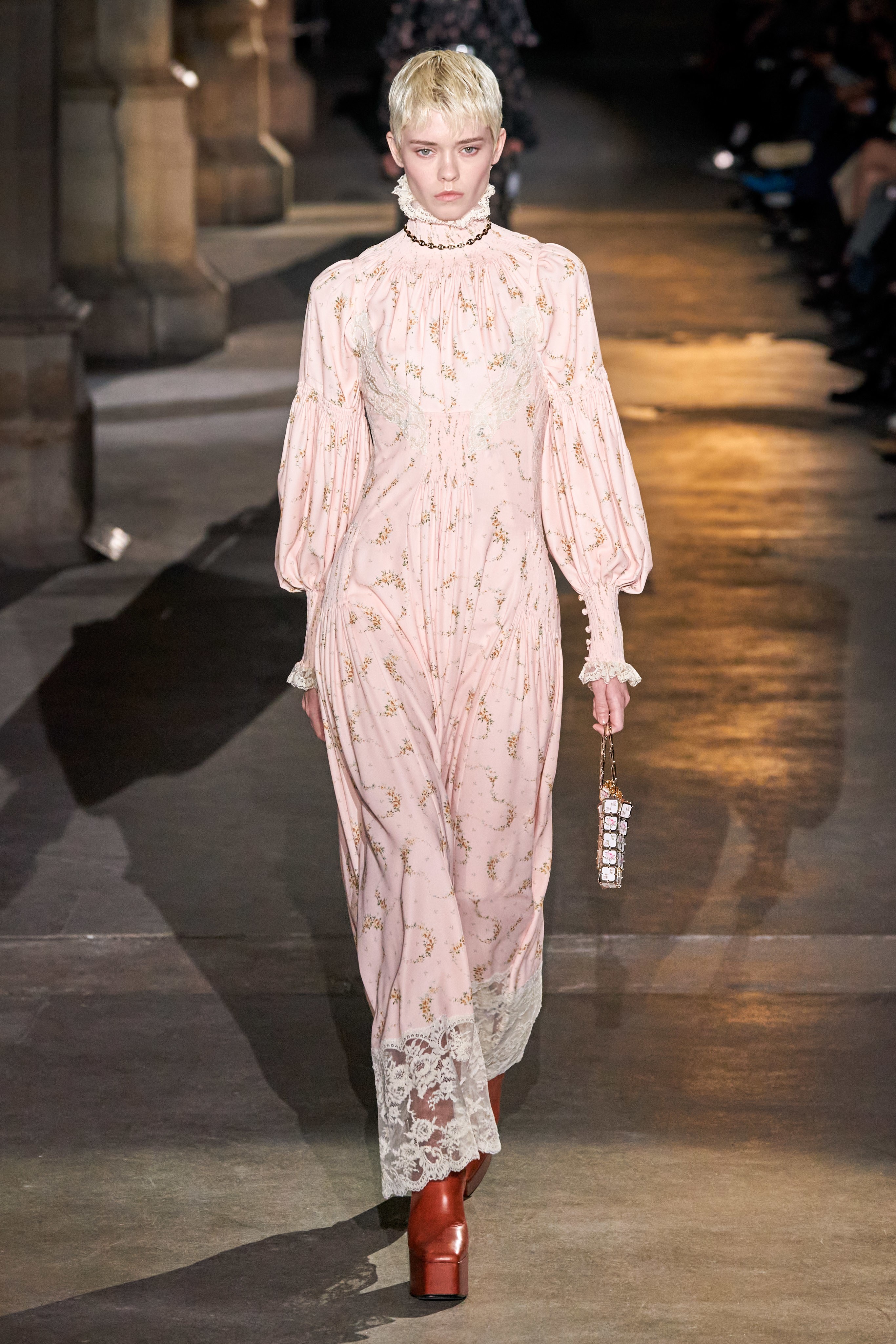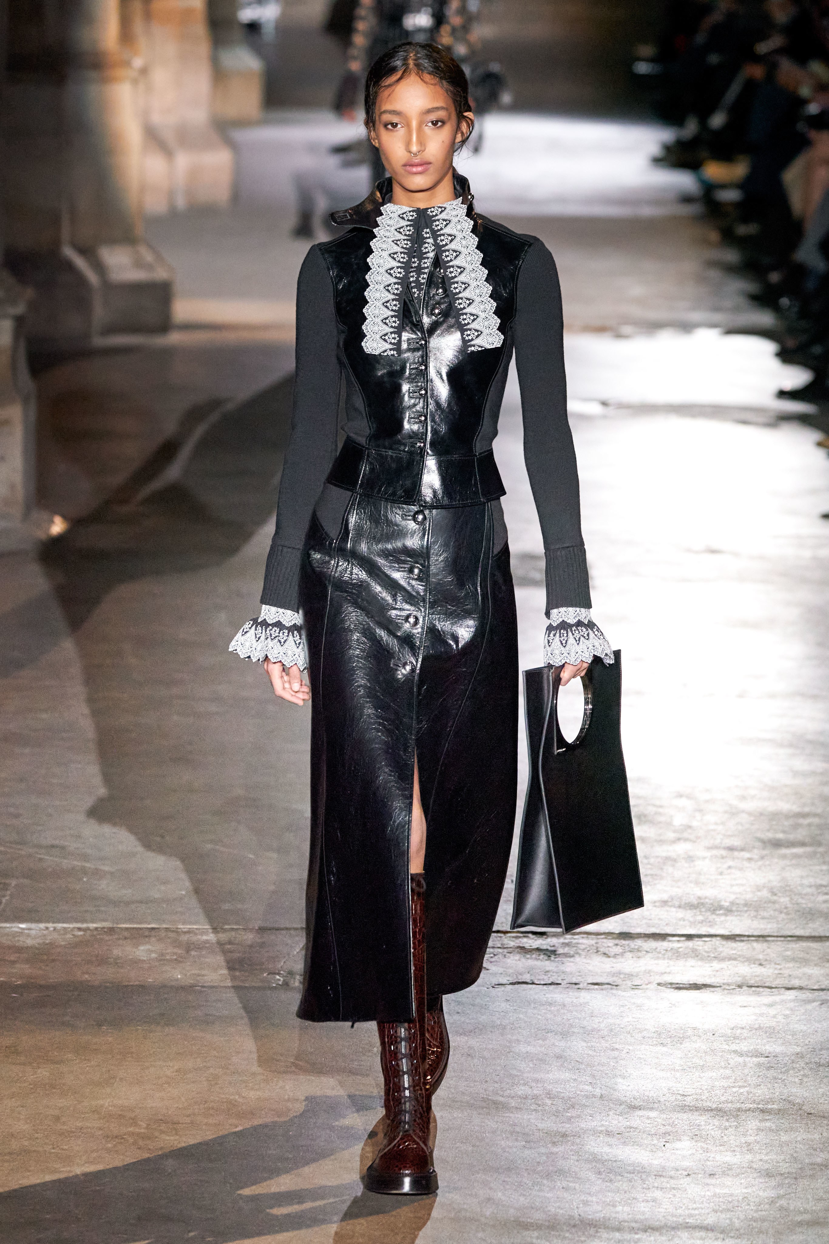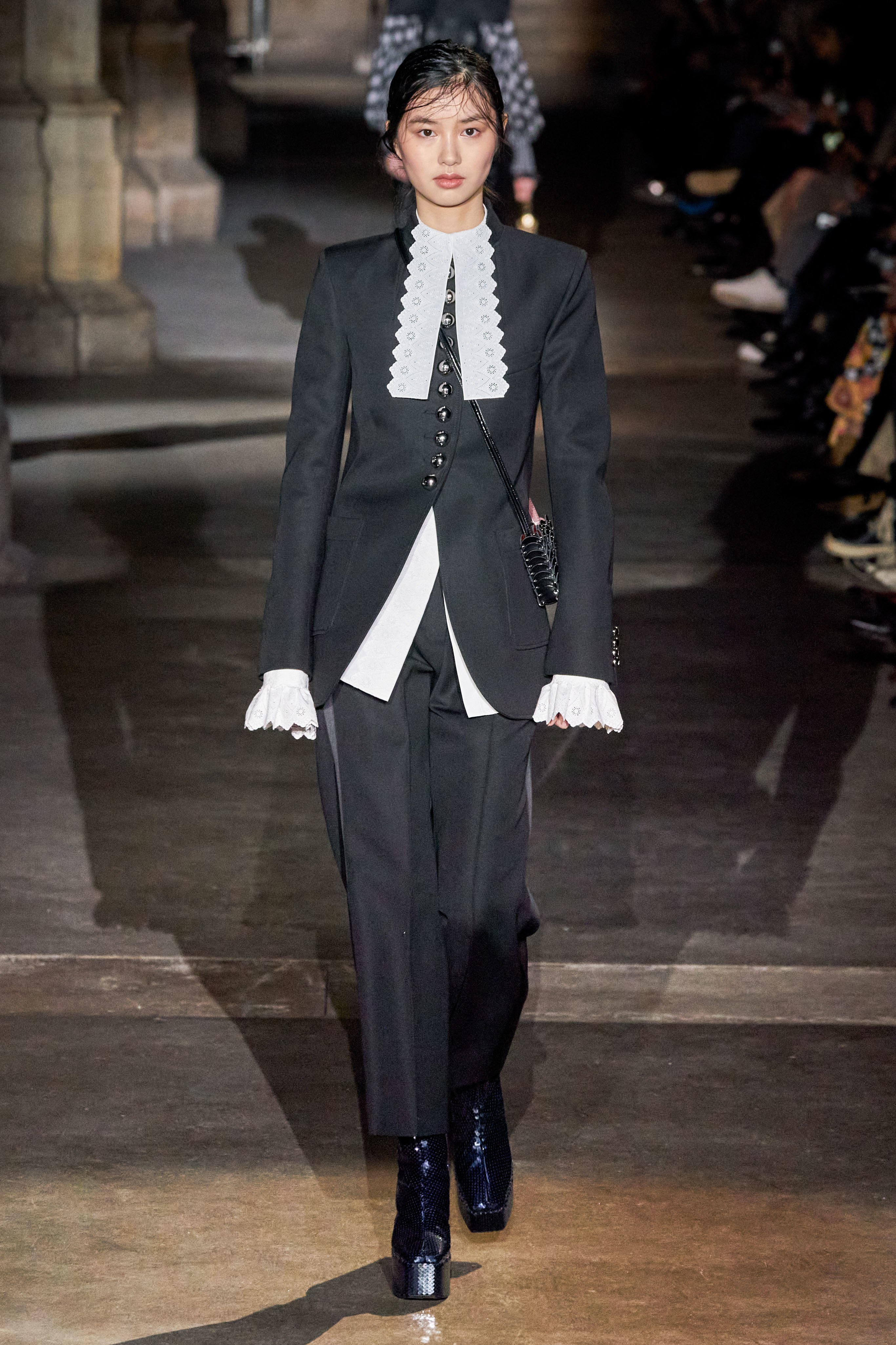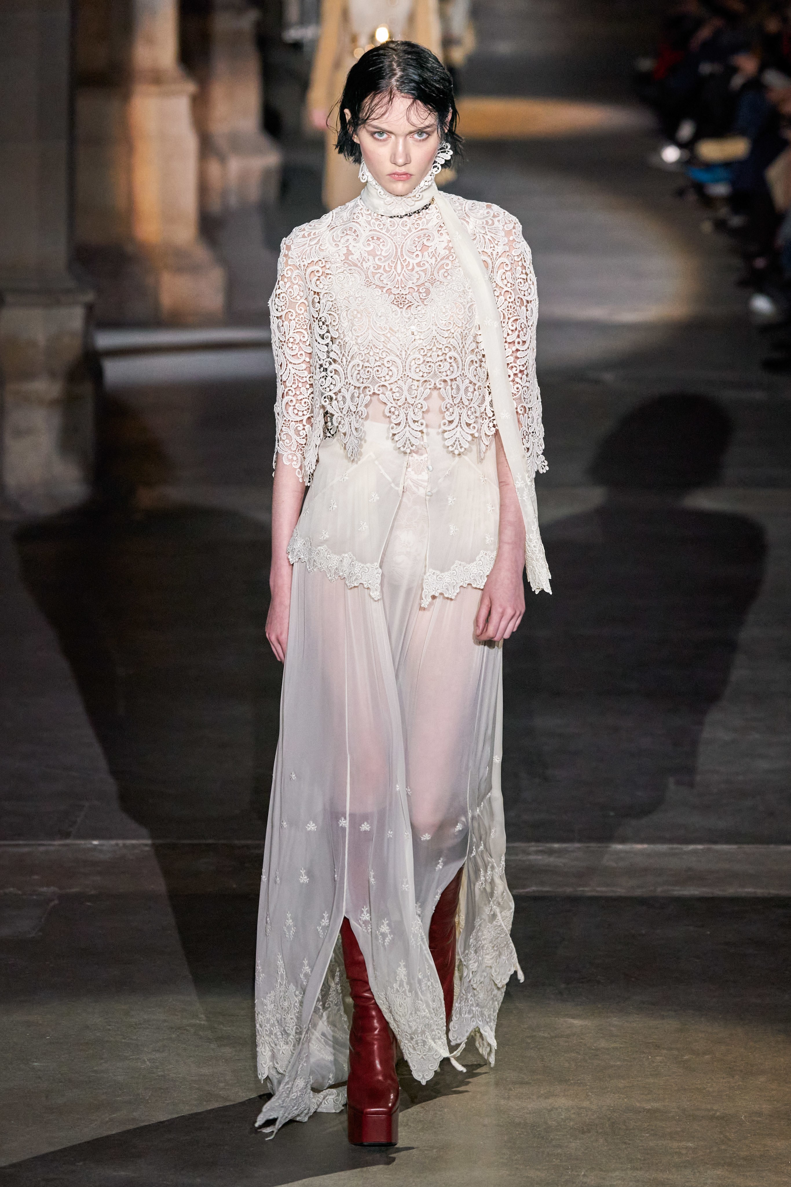 Ключевые элементы: структурные платья с кокетками и вышивкой, кольчуги, кожаные жилеты и юбки миди, кейпы, узкие пальто с вышивкой, брючные костюмы, шапочки-кольчуги и балаклавы.