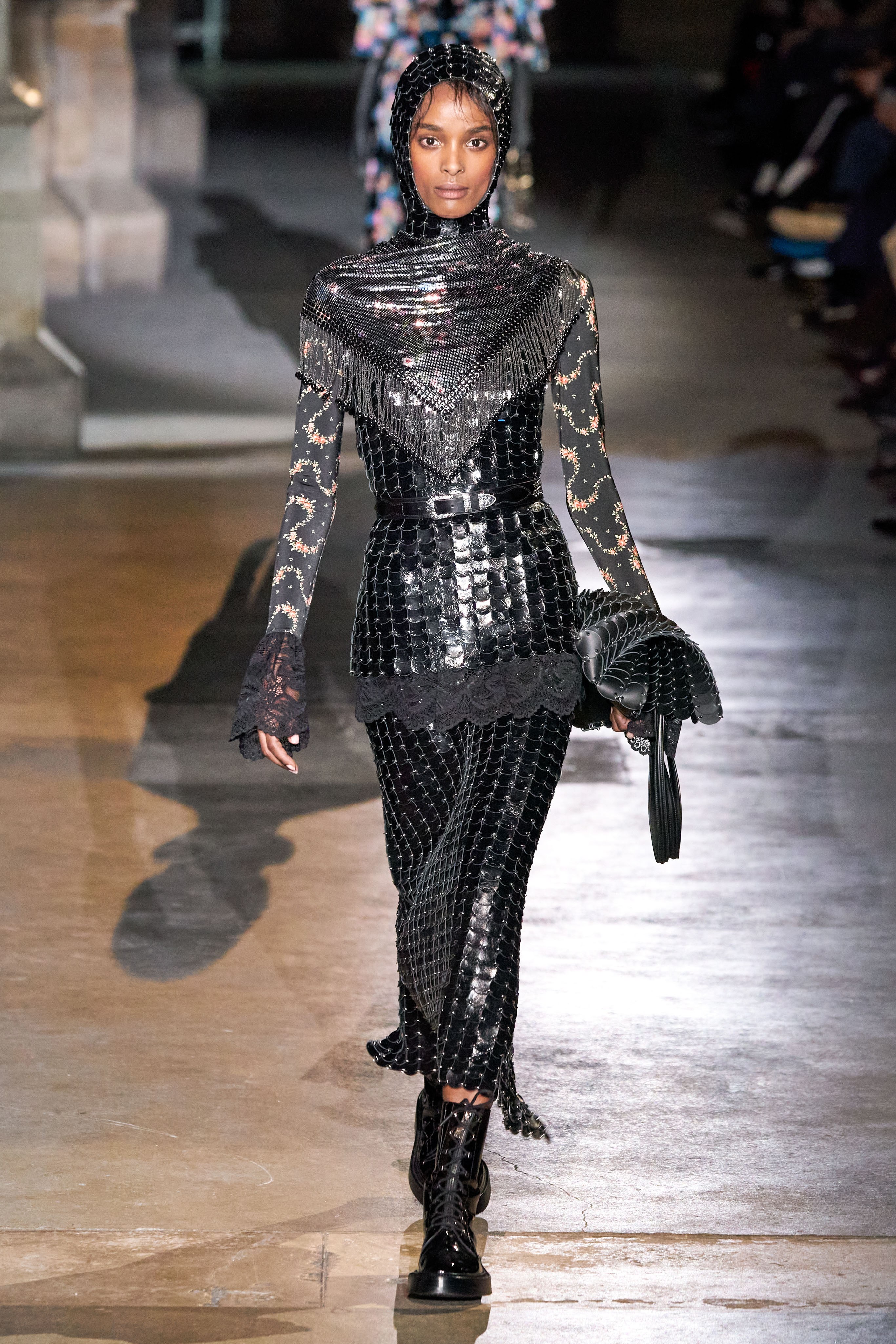 Будущей осенью многие дизайнеры предлагают нам вдохновляться далёкими временами королей, рыцарей и принцесс, препарируя модную летопись тех времён. Жюльен Доссена - один из этих дизайнеров. Для модного дома Paco Rabanne Доссена создал коллекцию платьев и костюмов, напоминающих геральдические накидки, которые надевали поверх лат, и сами доспехи. Среди кольчужных нарядов на подиуме появлялись также платья с пышными рукавами и жесткими кокетками, расшитые богатым орнаментом, шелковые наряды в пол с гофрированными воротами-стойками, кафтаны с отделенными рукавами и капюшонами, совсем как у героев фэнтезийно-исторических произведений, и вечерние платья, расшитые пайетками. В коллекции преобладают приглушенные оттенки серого, бронзового и черного, которые разбавляют натуральные бежевый, пудровый и красный. Как и в прошлых сезонах, в работе Жюльена Доссена угадываются буржуазные 60-е, с их безудержными экспериментами, гламурным романтизмом и идеями покорения космоса.
