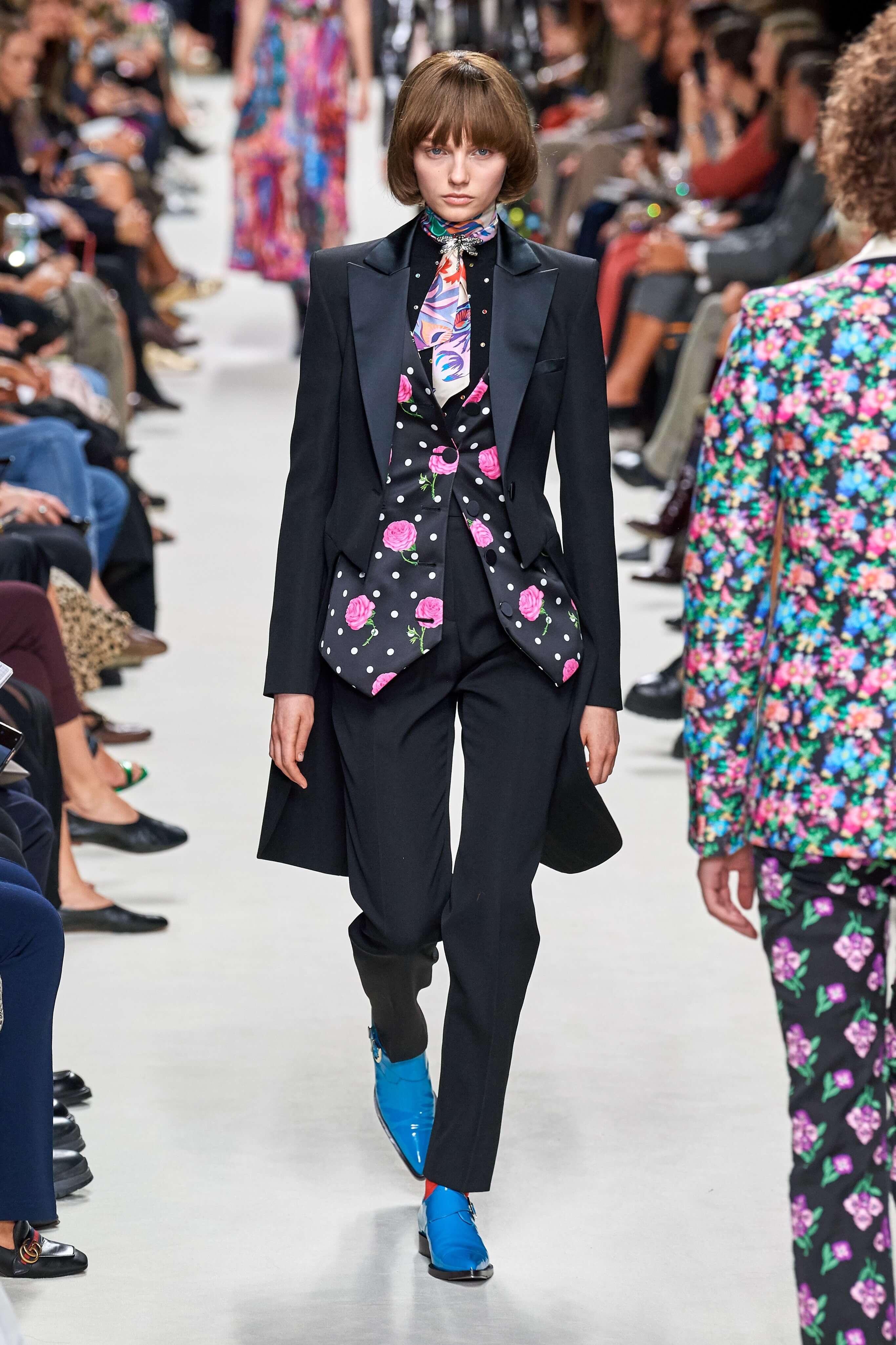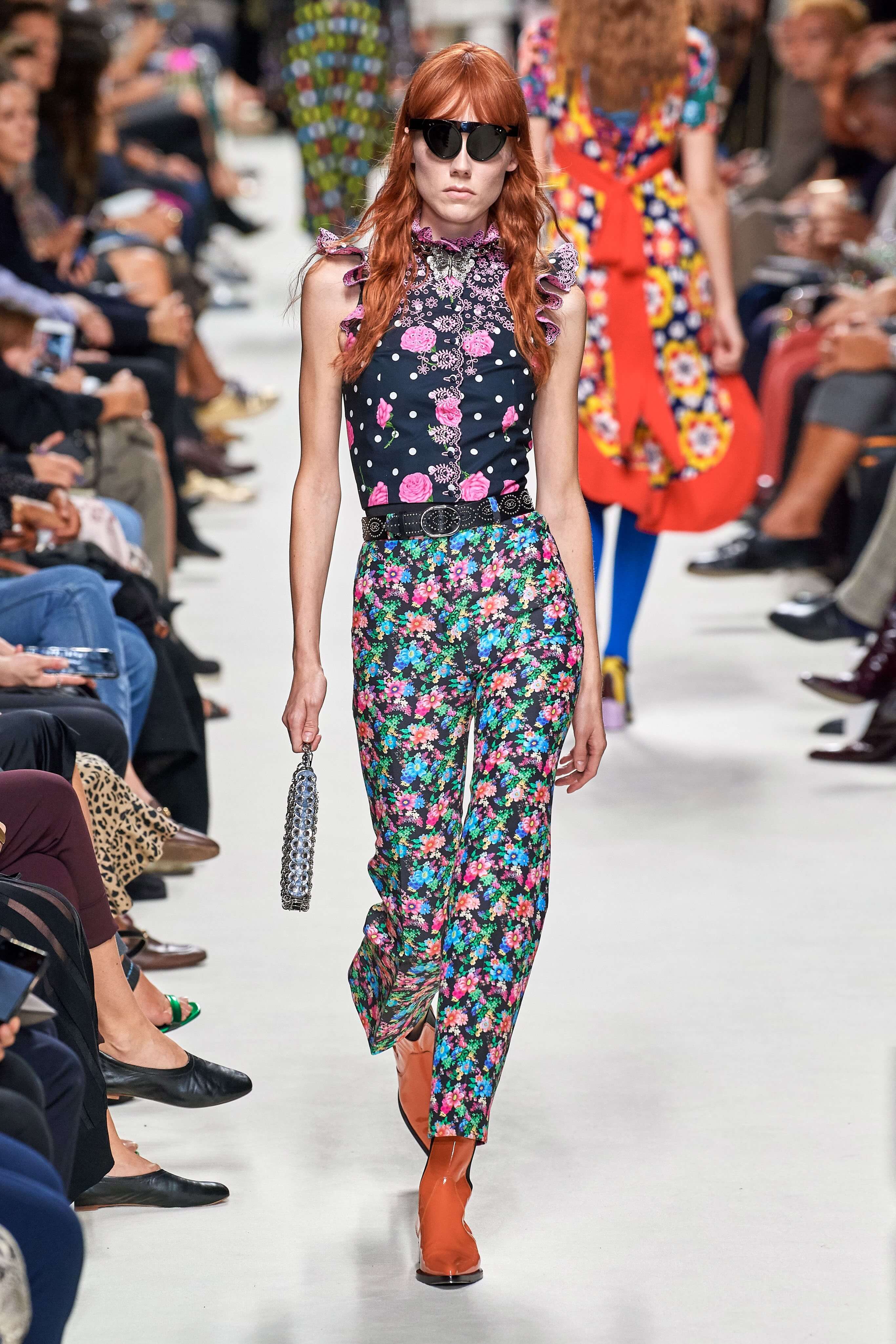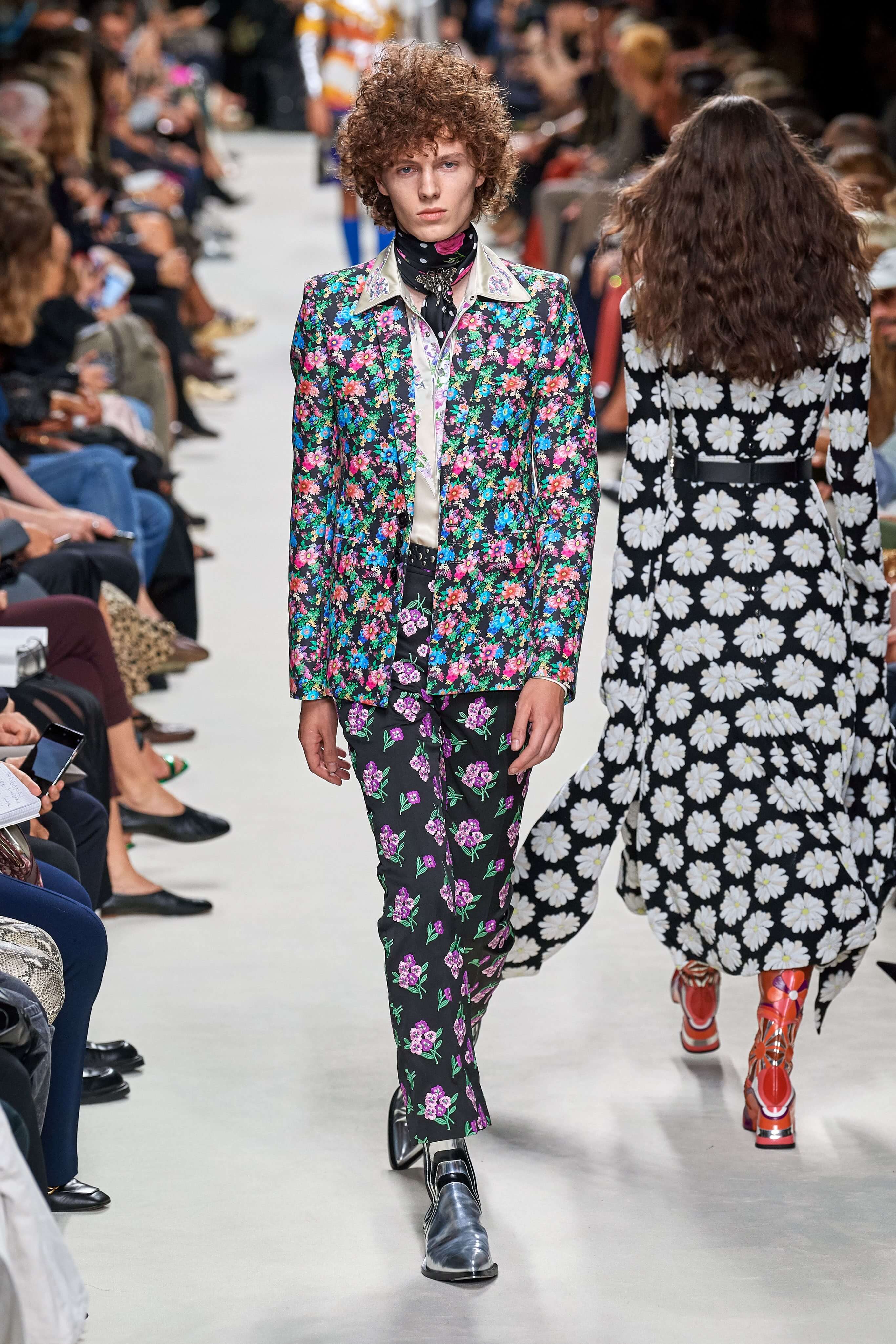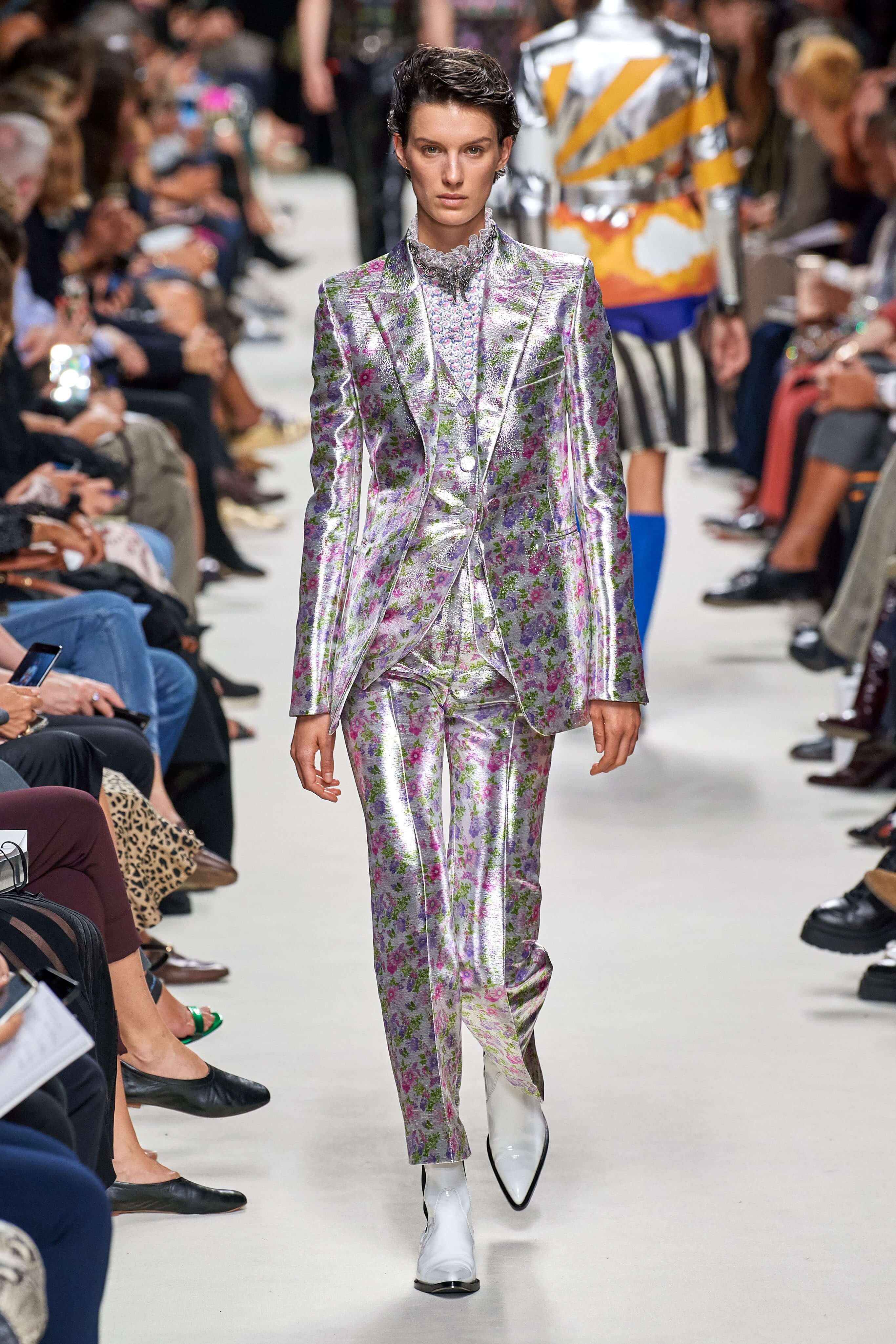 Доссена интегрировал в новую коллекцию все знаковые элементы двух десятилетий безудержных модных экспериментов - здесь и контрастные острые воротники на белых пиджаках, и вязаные джемперы поверх рубашек, викторианские платья и платья-кольчуги, надетые поверх спортивных топов. Цветочного принта в коллекции действительно много - он расположен на брюках, блузах и платьях, а завершают картину кожаные жакеты в духе вестерн с изображениями космических тел, брюки модов, как у Франсуази Арди и Принца, сочетание красного с фиолетовым и костюмы в клетку, и из плотной металлизированной тафты.