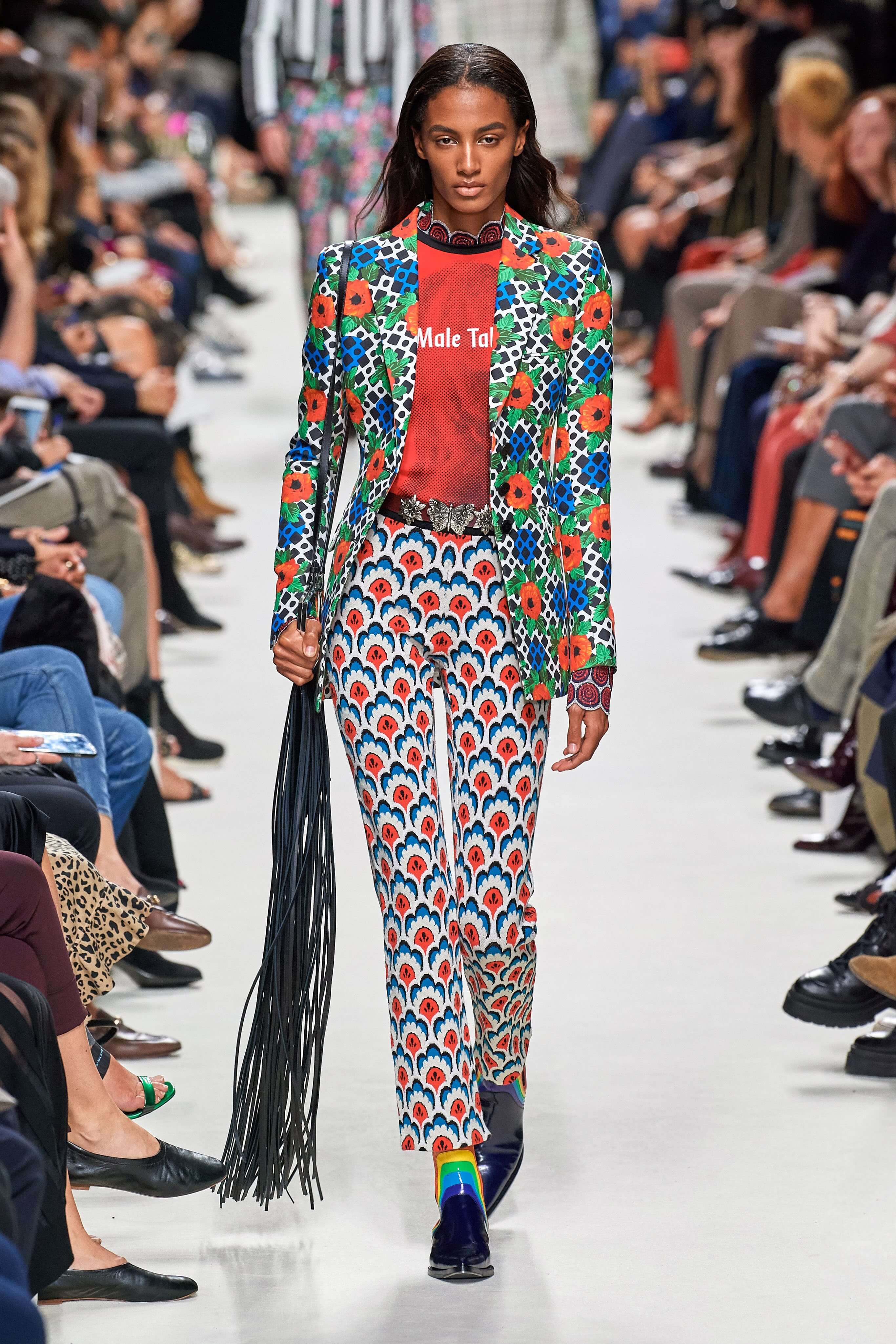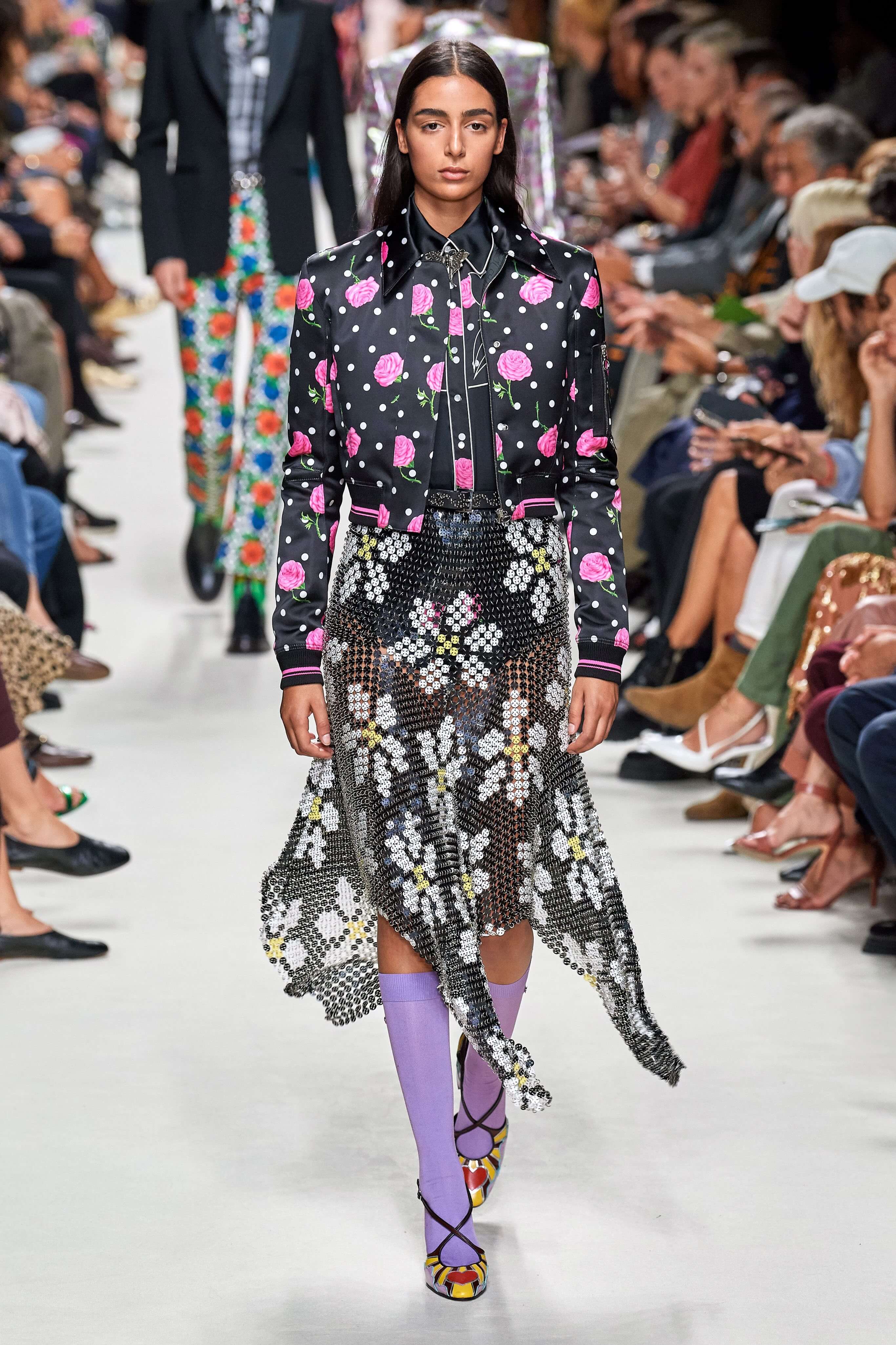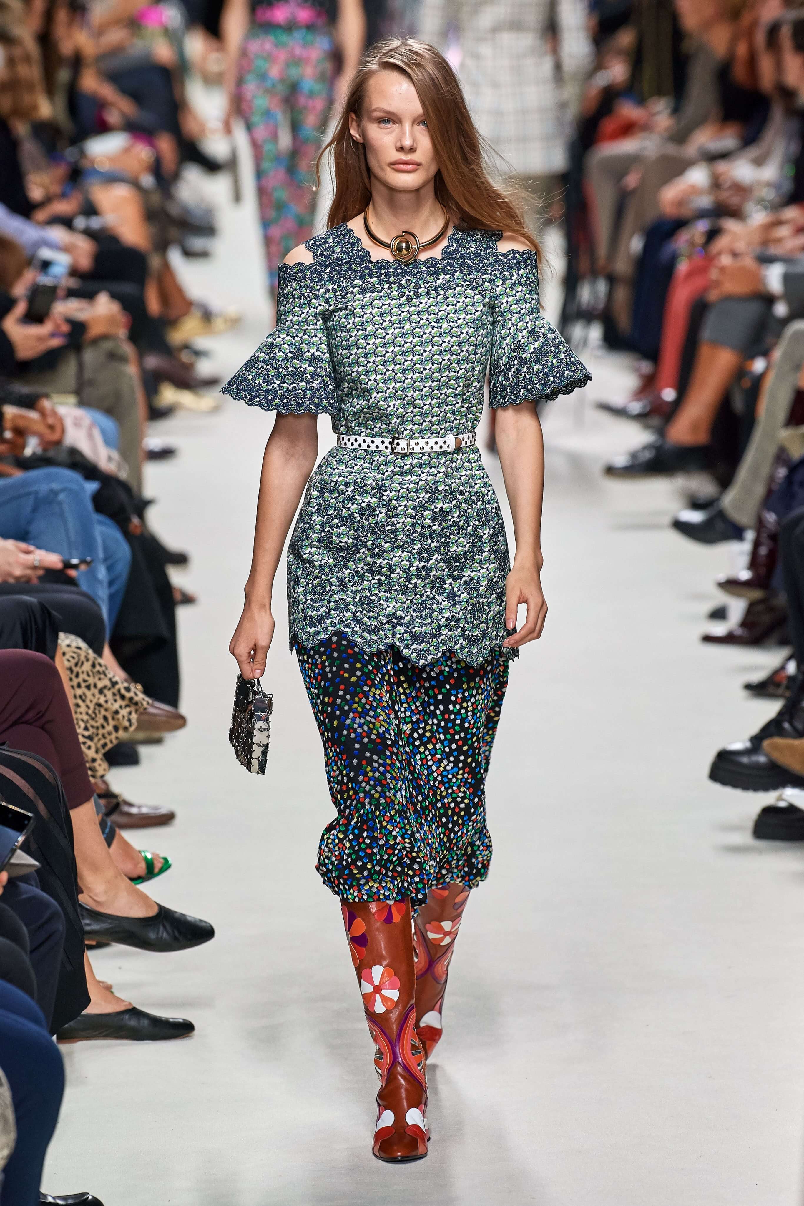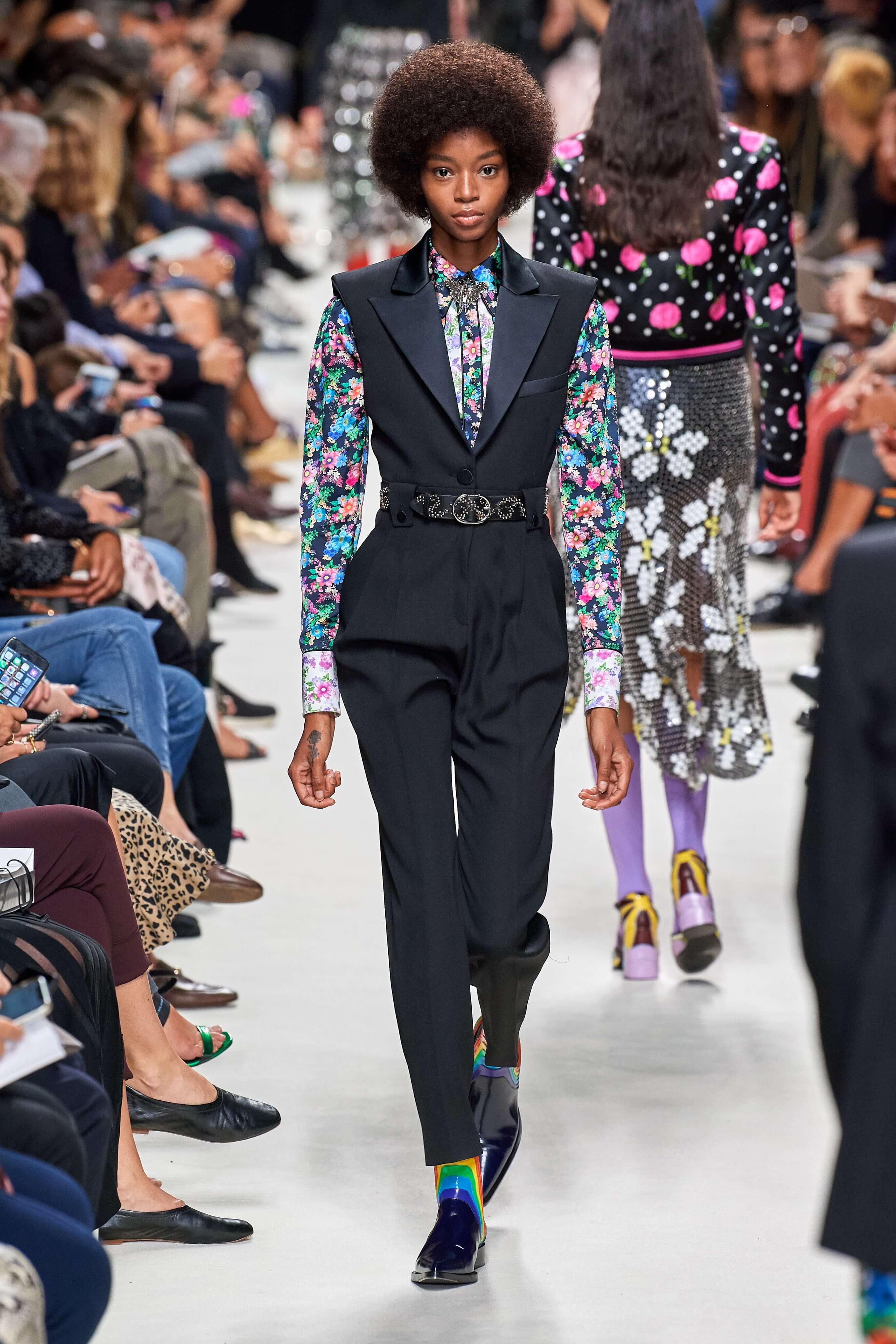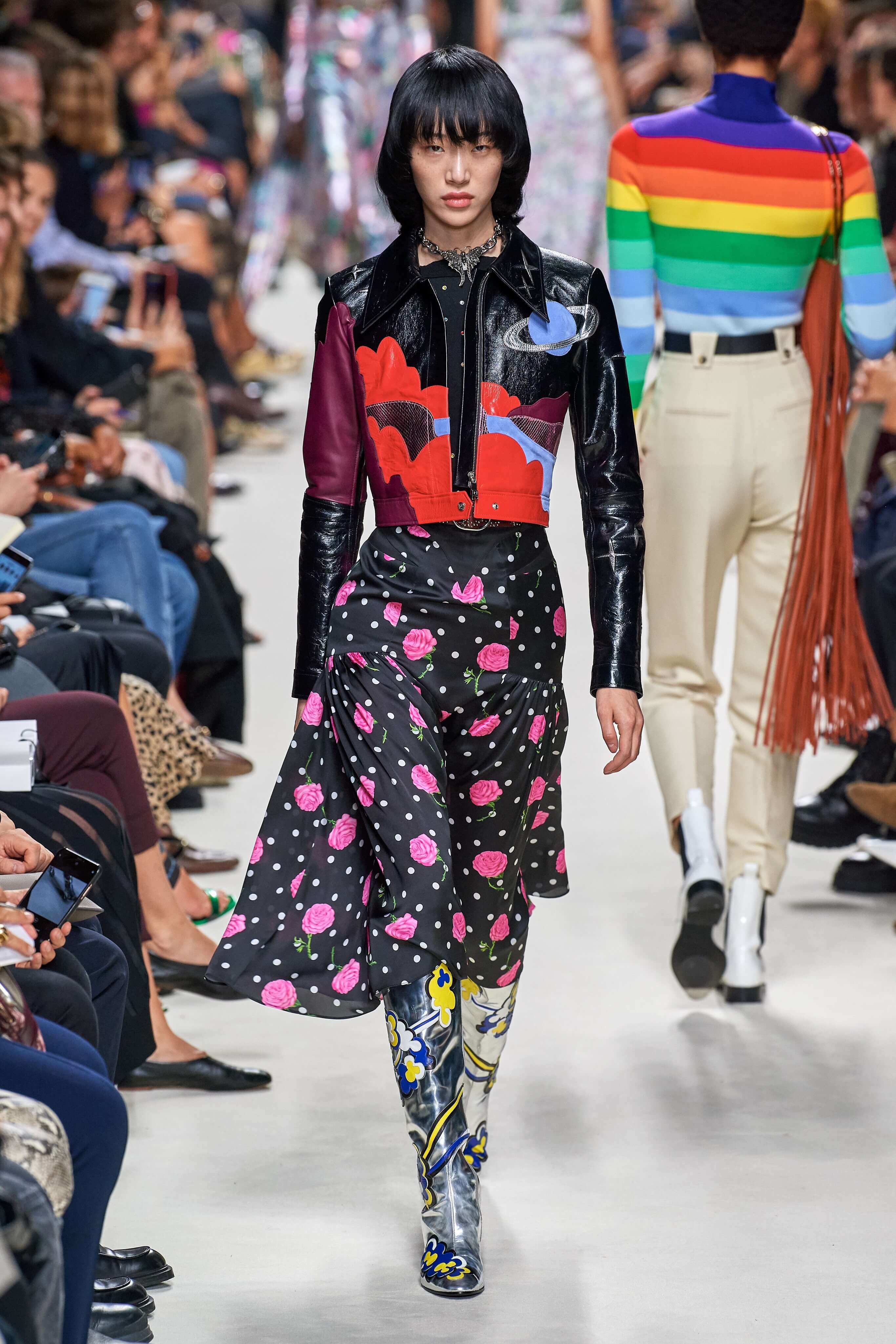 Доссена интегрировал в новую коллекцию все знаковые элементы двух десятилетий безудержных модных экспериментов - здесь и контрастные острые воротники на белых пиджаках, и вязаные джемперы поверх рубашек, викторианские платья и платья-кольчуги, надетые поверх спортивных топов. Цветочного принта в коллекции действительно много - он расположен на брюках, блузах и платьях, а завершают картину кожаные жакеты в духе вестерн с изображениями космических тел, брюки модов, как у Франсуази Арди и Принца, сочетание красного с фиолетовым и костюмы в клетку, и из плотной металлизированной тафты.