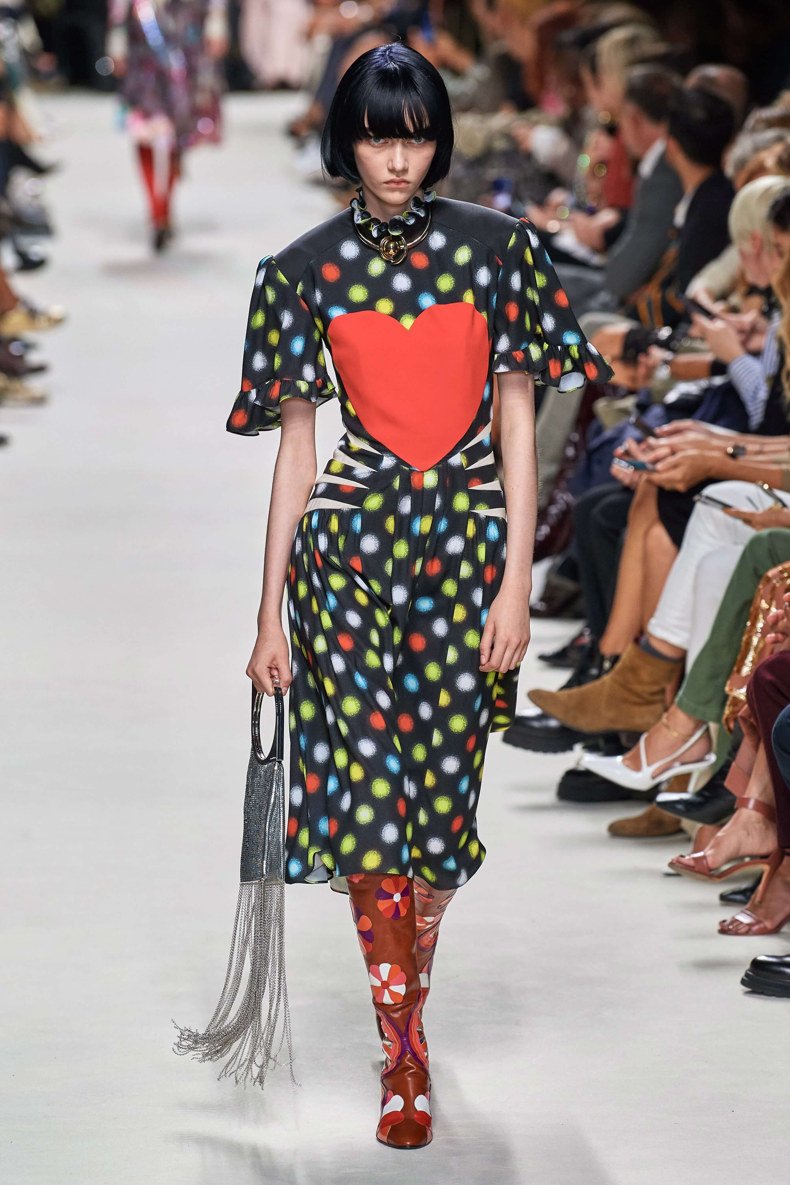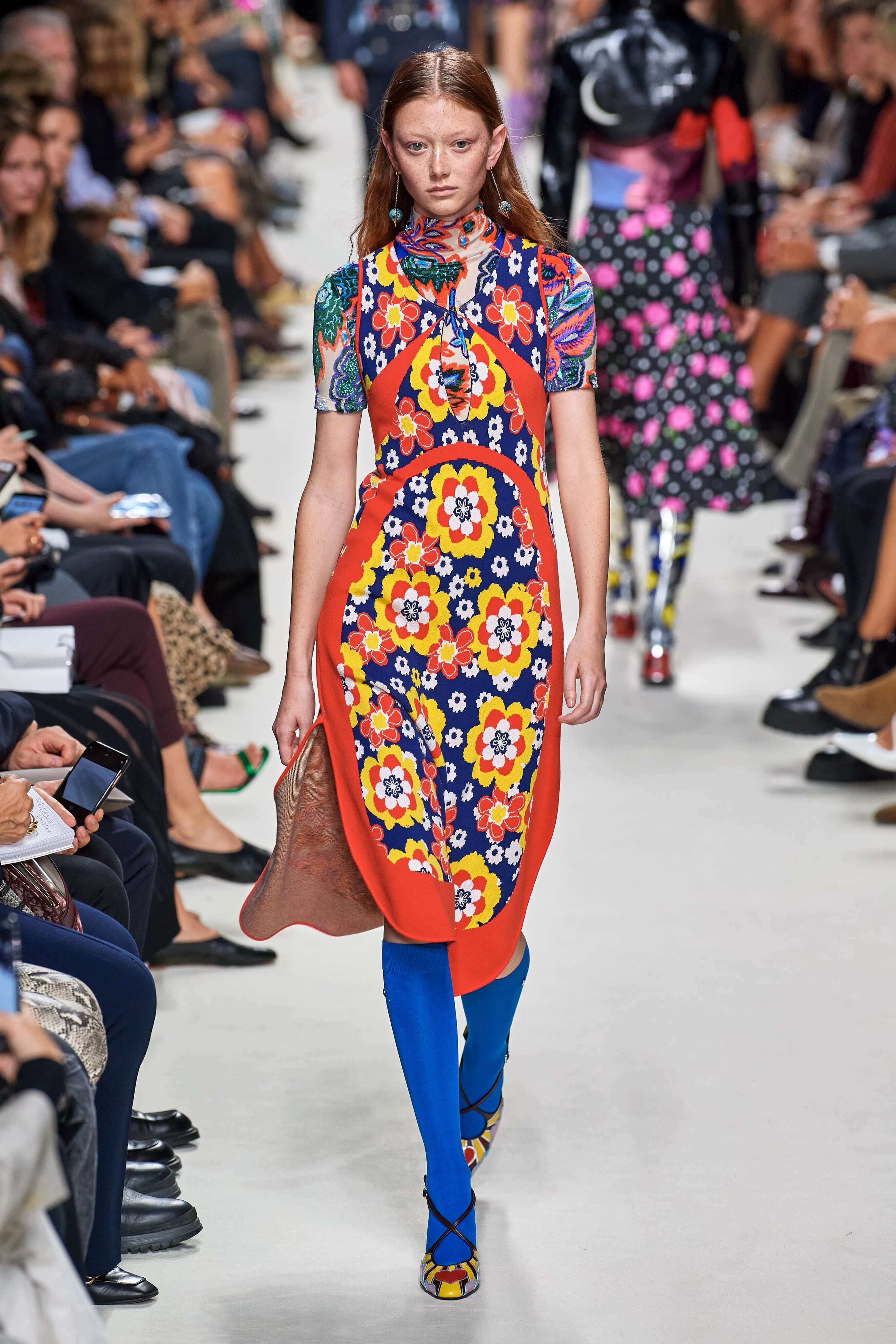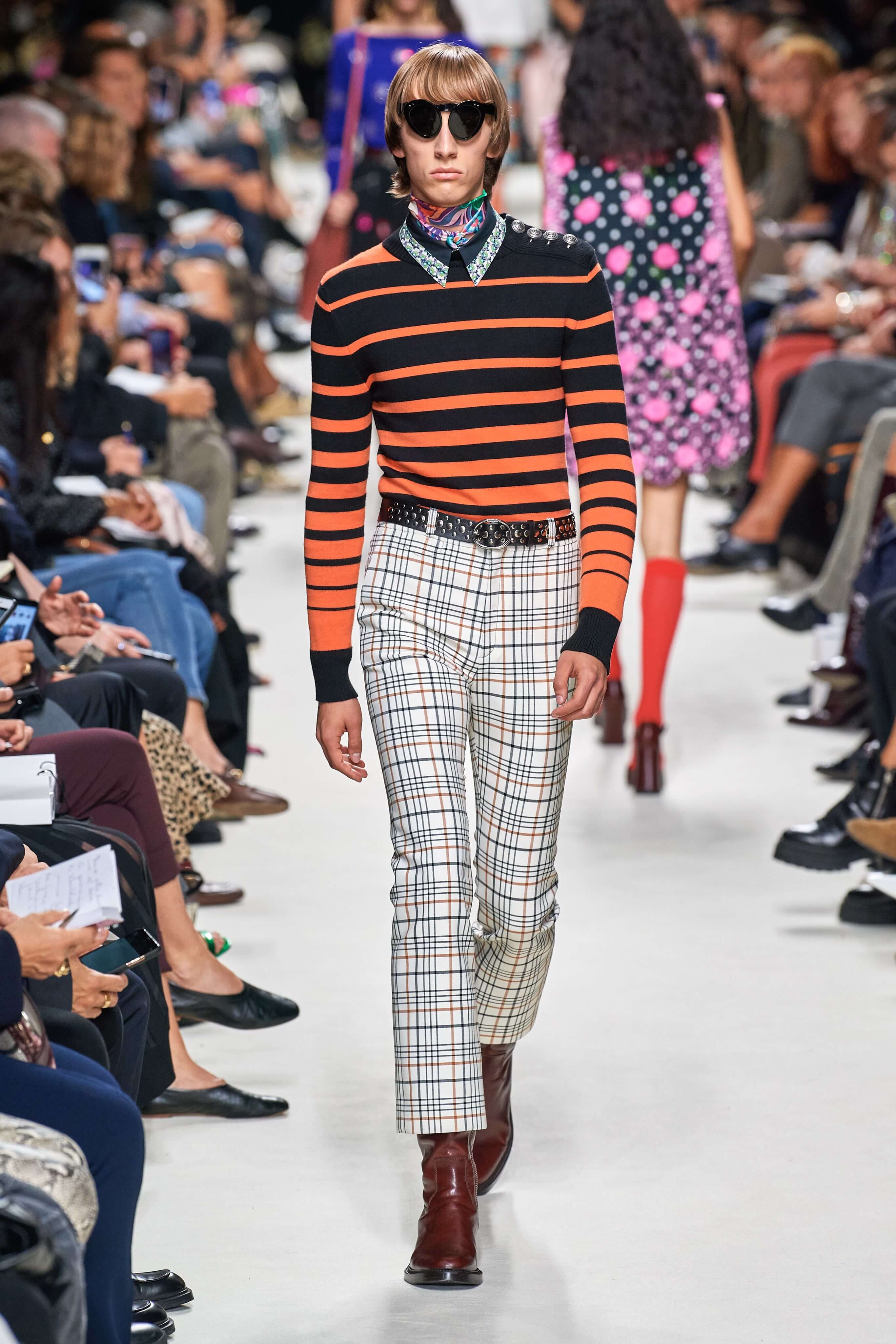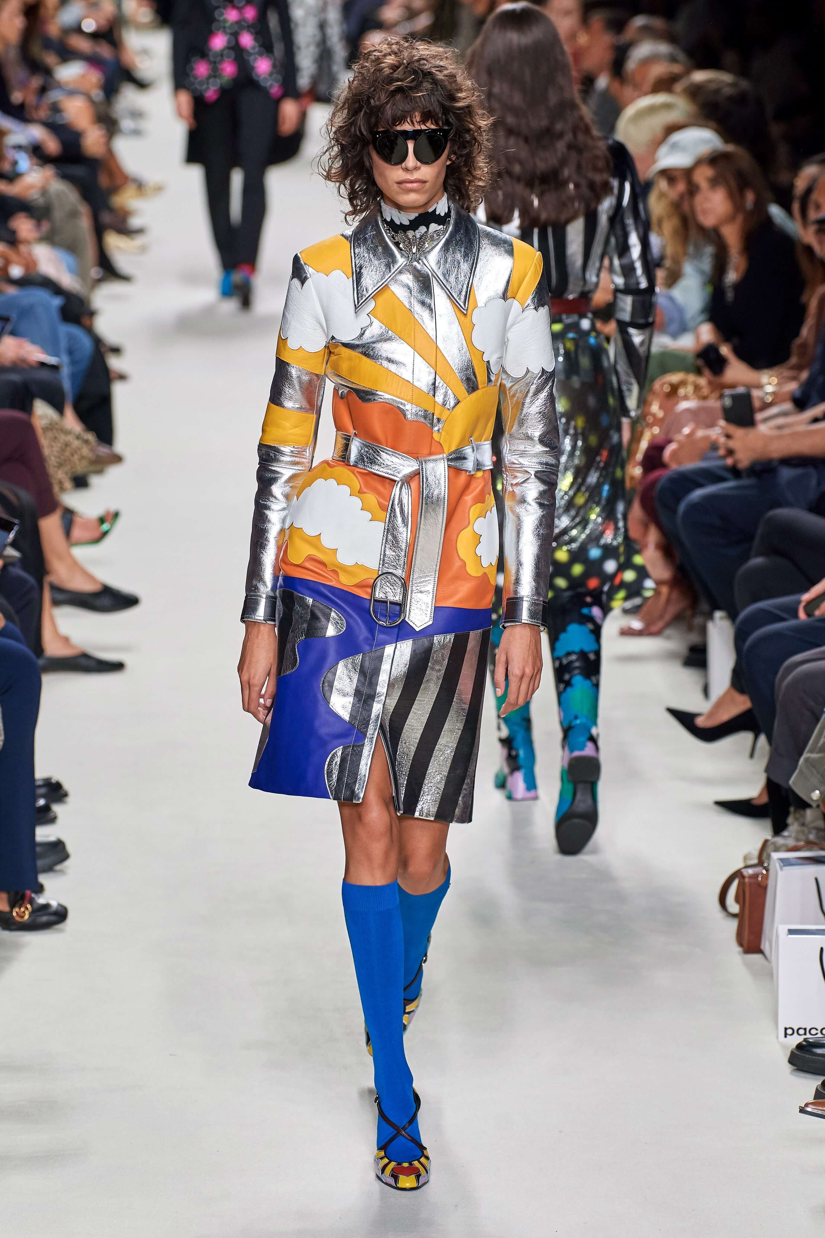 Доссена интегрировал в новую коллекцию все знаковые элементы двух десятилетий безудержных модных экспериментов - здесь и контрастные острые воротники на белых пиджаках, и вязаные джемперы поверх рубашек, викторианские платья и платья-кольчуги, надетые поверх спортивных топов. Цветочного принта в коллекции действительно много - он расположен на брюках, блузах и платьях, а завершают картину кожаные жакеты в духе вестерн с изображениями космических тел, брюки модов, как у Франсуази Арди и Принца, сочетание красного с фиолетовым и костюмы в клетку, и из плотной металлизированной тафты.