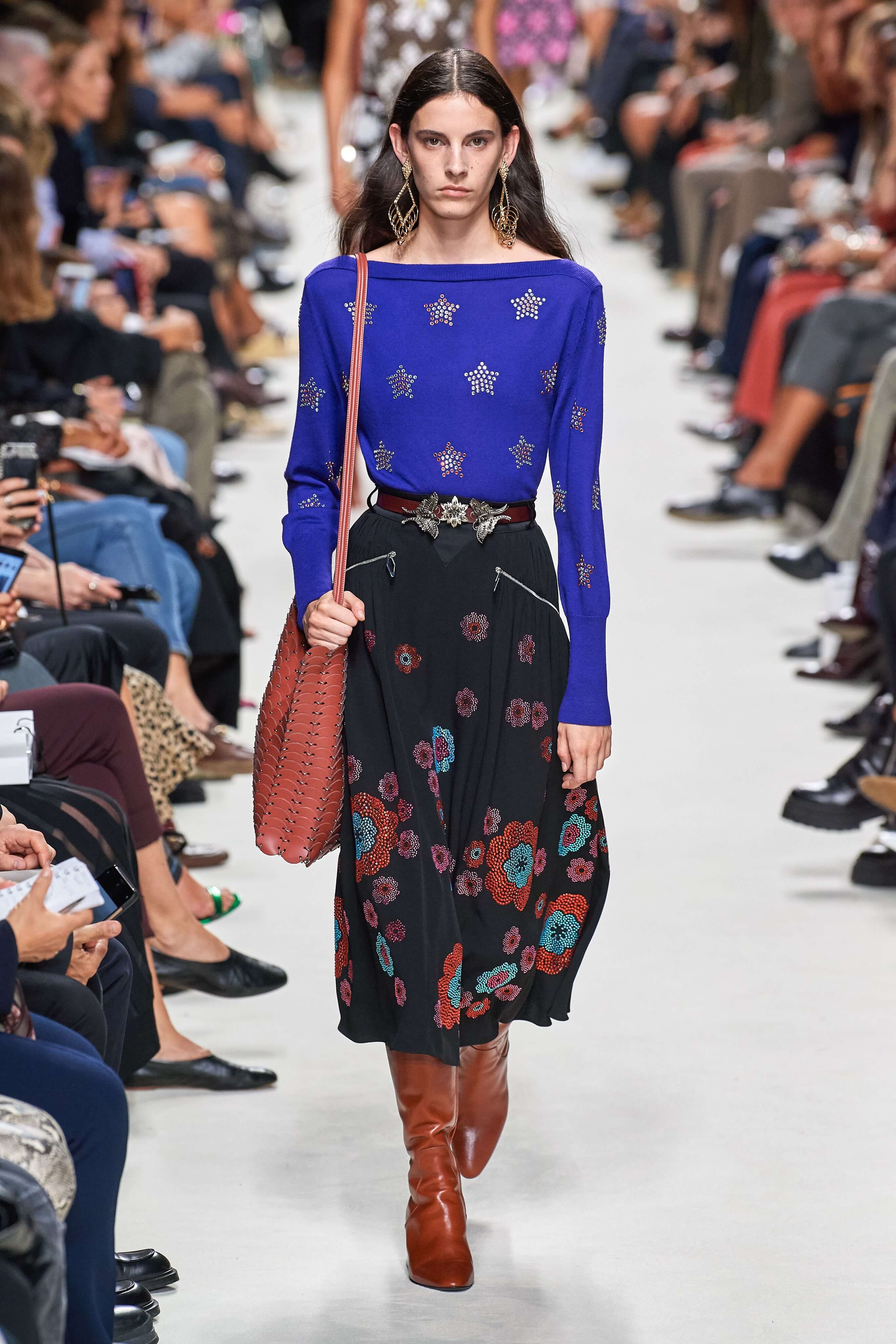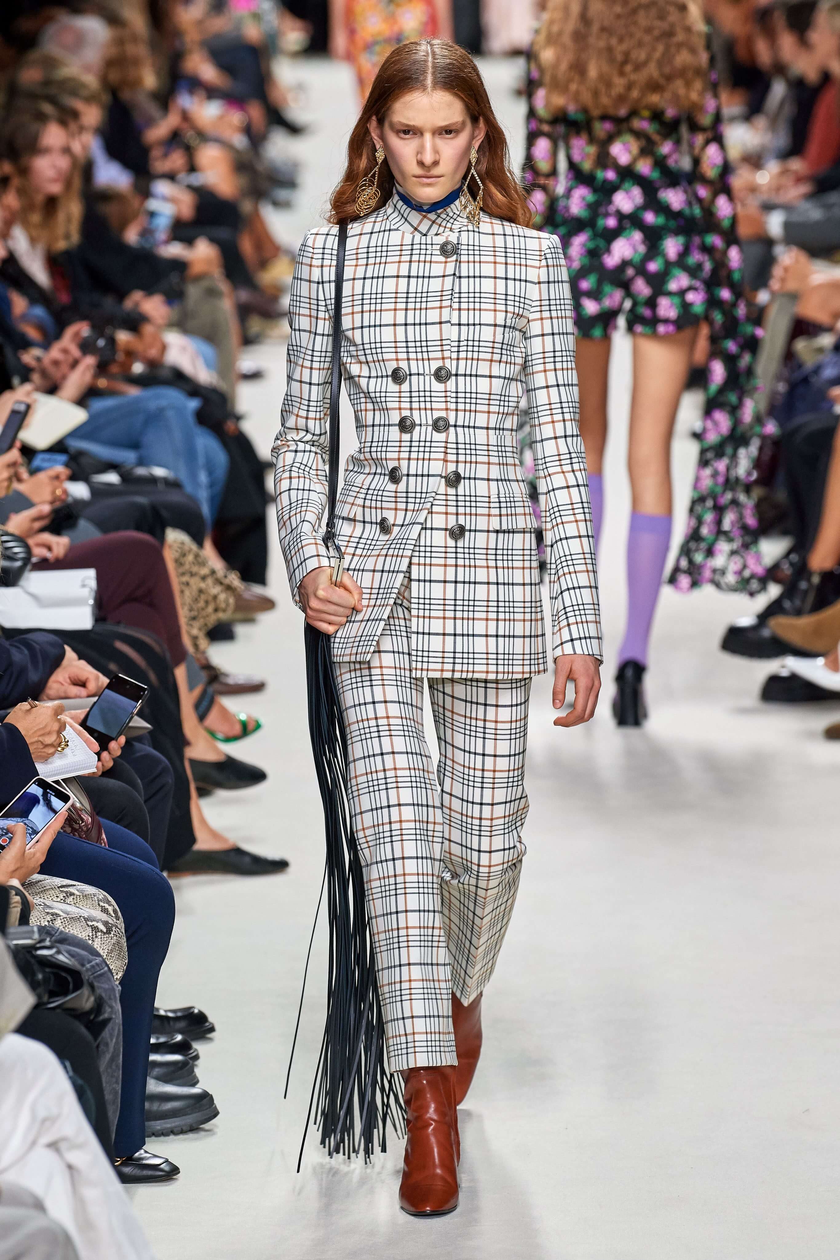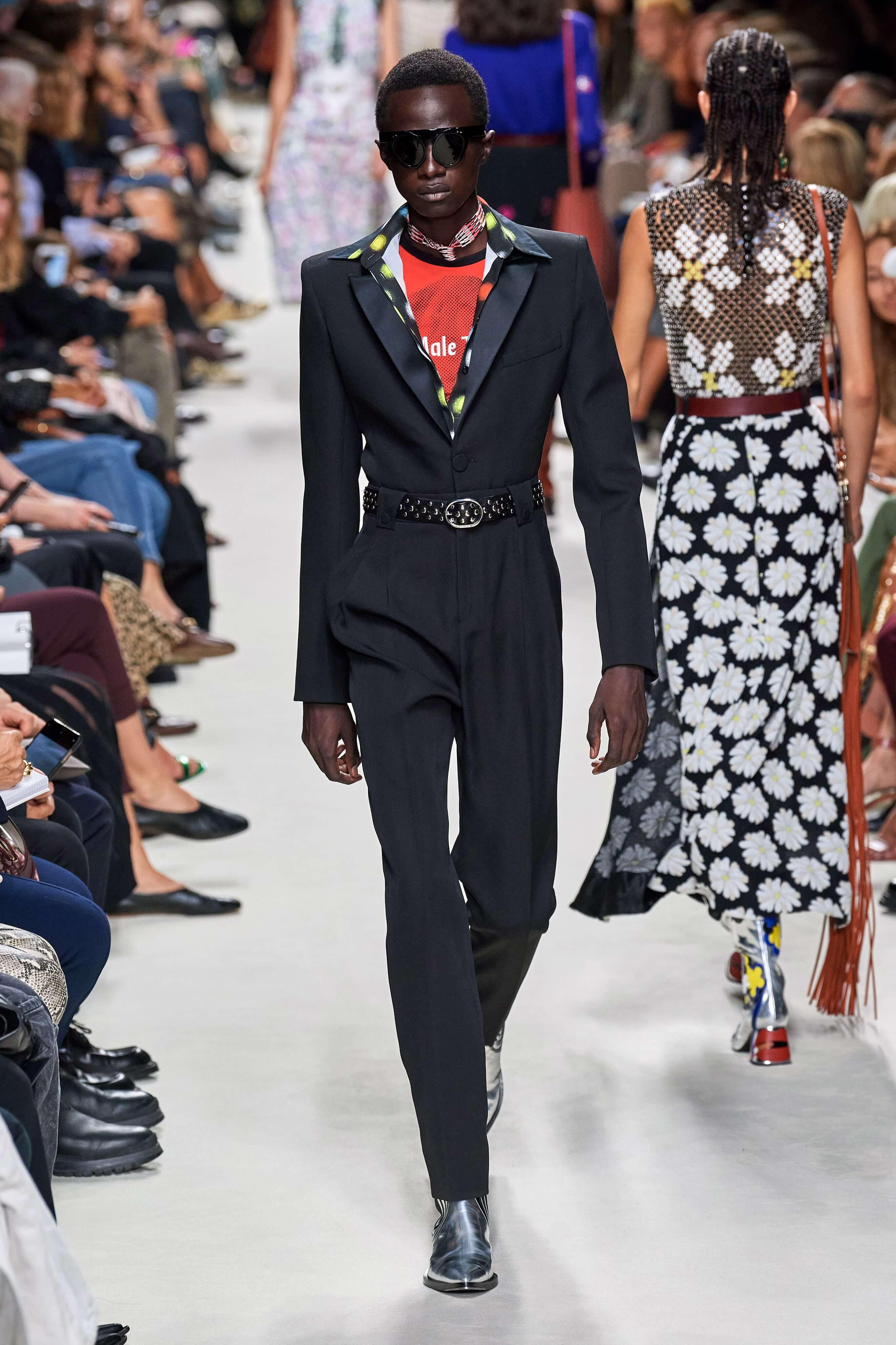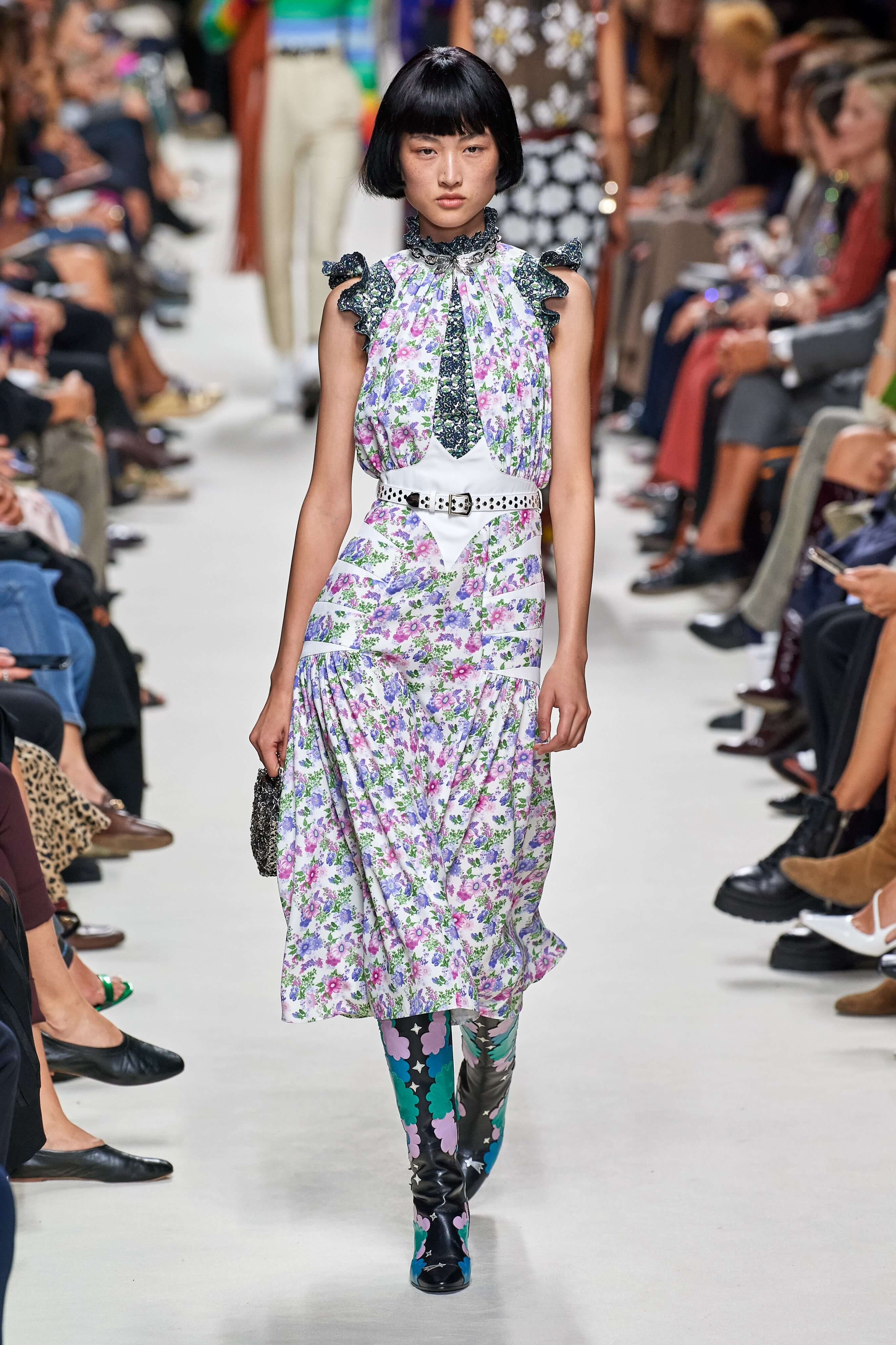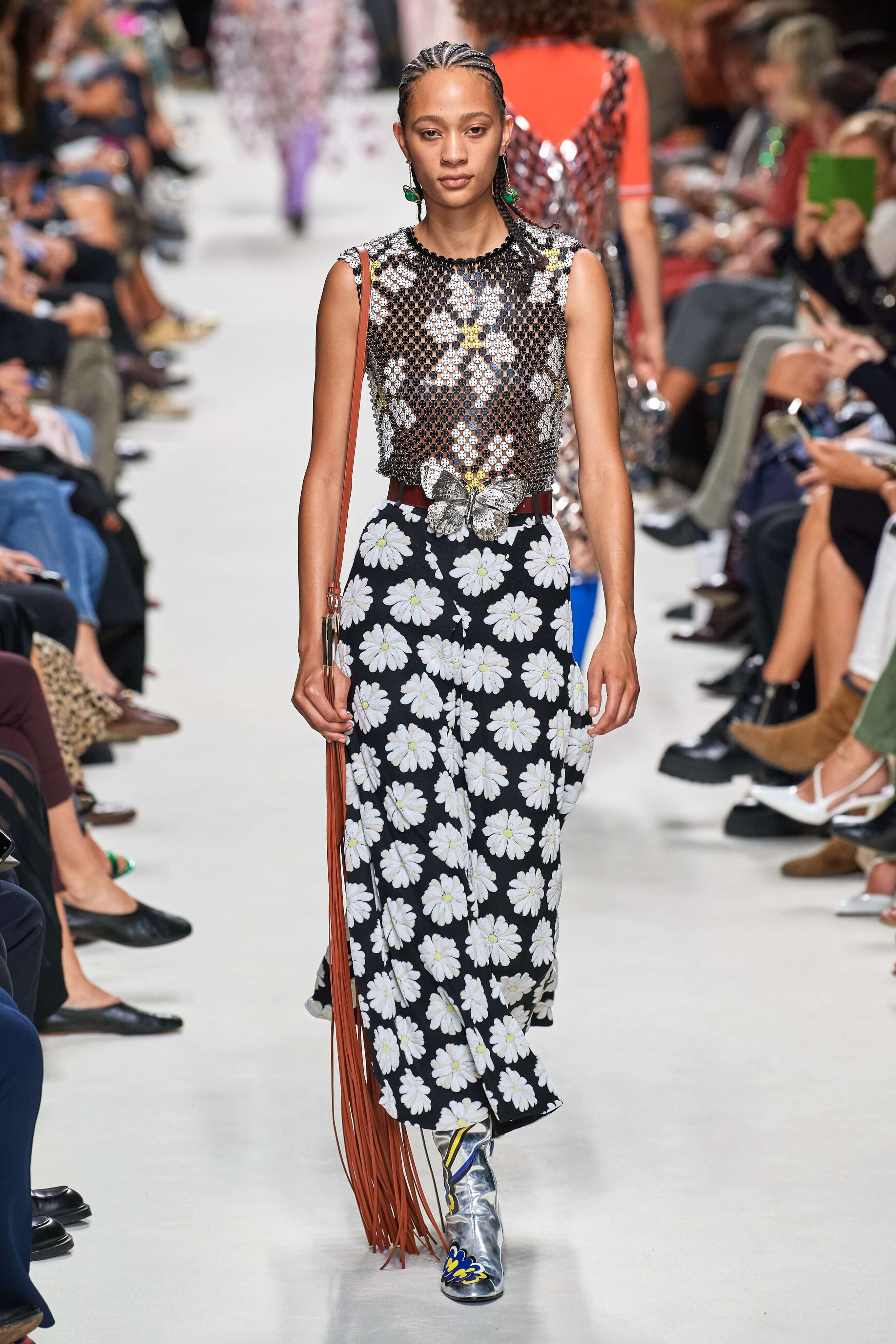 Доссена интегрировал в новую коллекцию все знаковые элементы двух десятилетий безудержных модных экспериментов - здесь и контрастные острые воротники на белых пиджаках, и вязаные джемперы поверх рубашек, викторианские платья и платья-кольчуги, надетые поверх спортивных топов. Цветочного принта в коллекции действительно много - он расположен на брюках, блузах и платьях, а завершают картину кожаные жакеты в духе вестерн с изображениями космических тел, брюки модов, как у Франсуази Арди и Принца, сочетание красного с фиолетовым и костюмы в клетку, и из плотной металлизированной тафты.