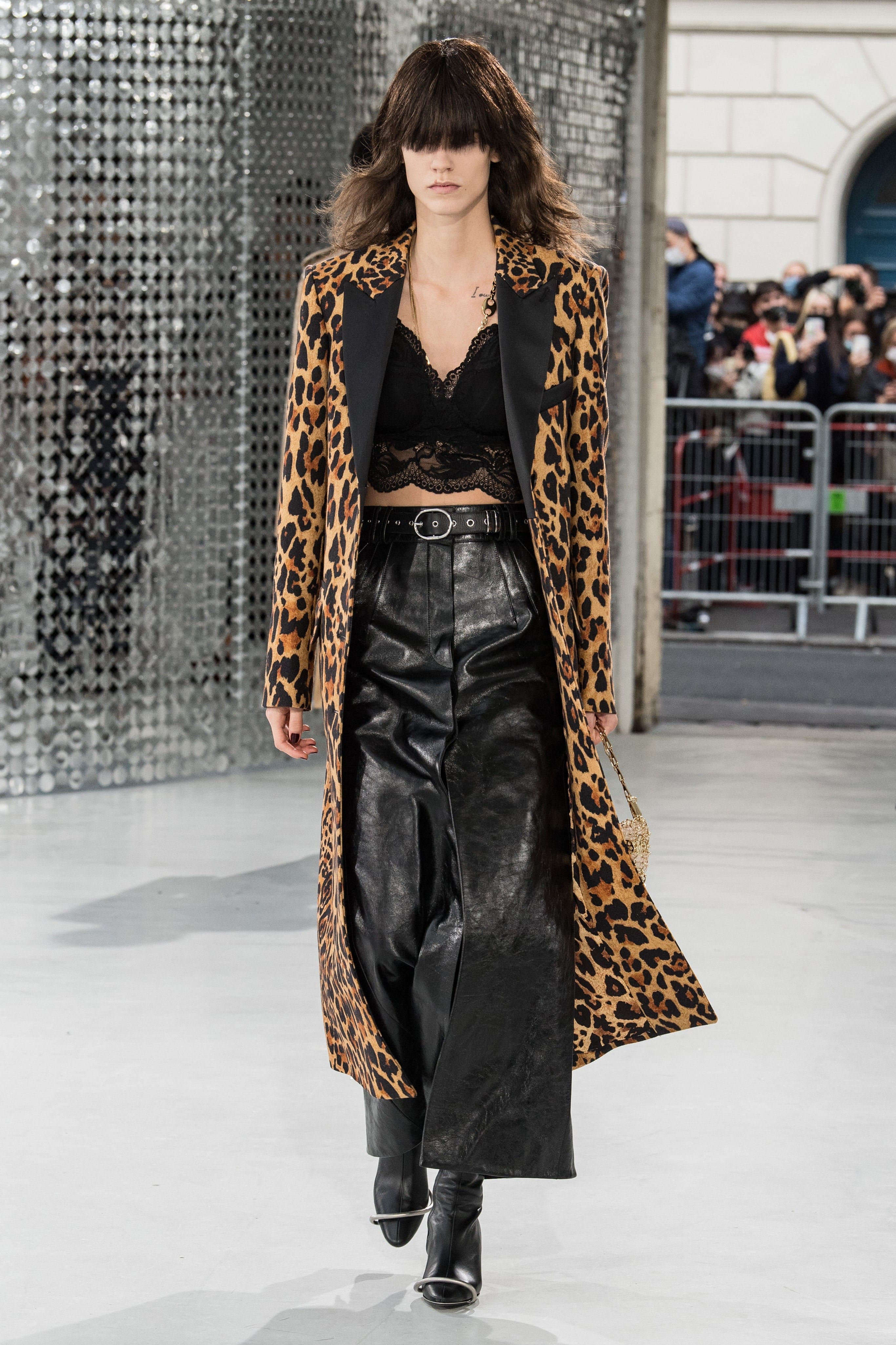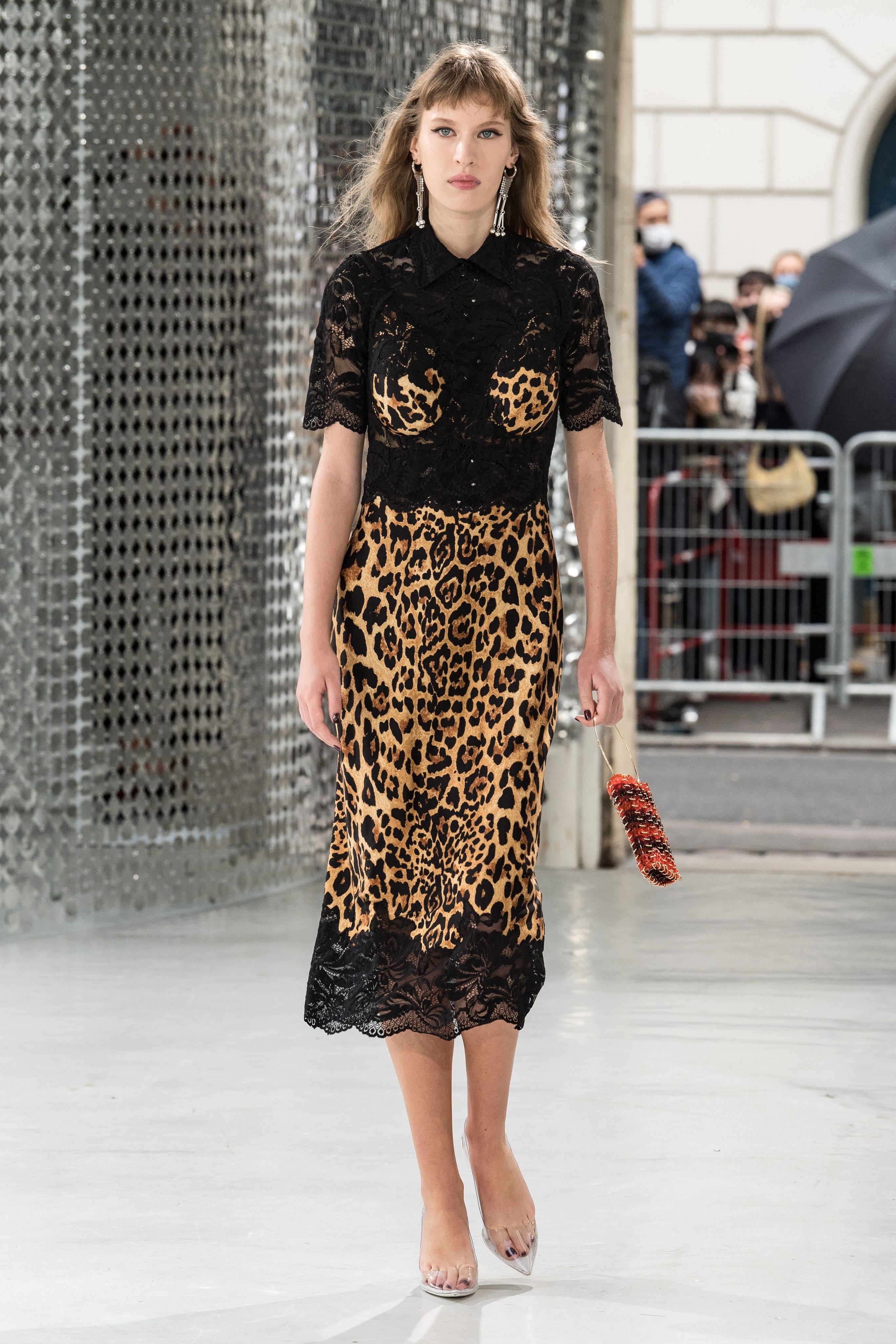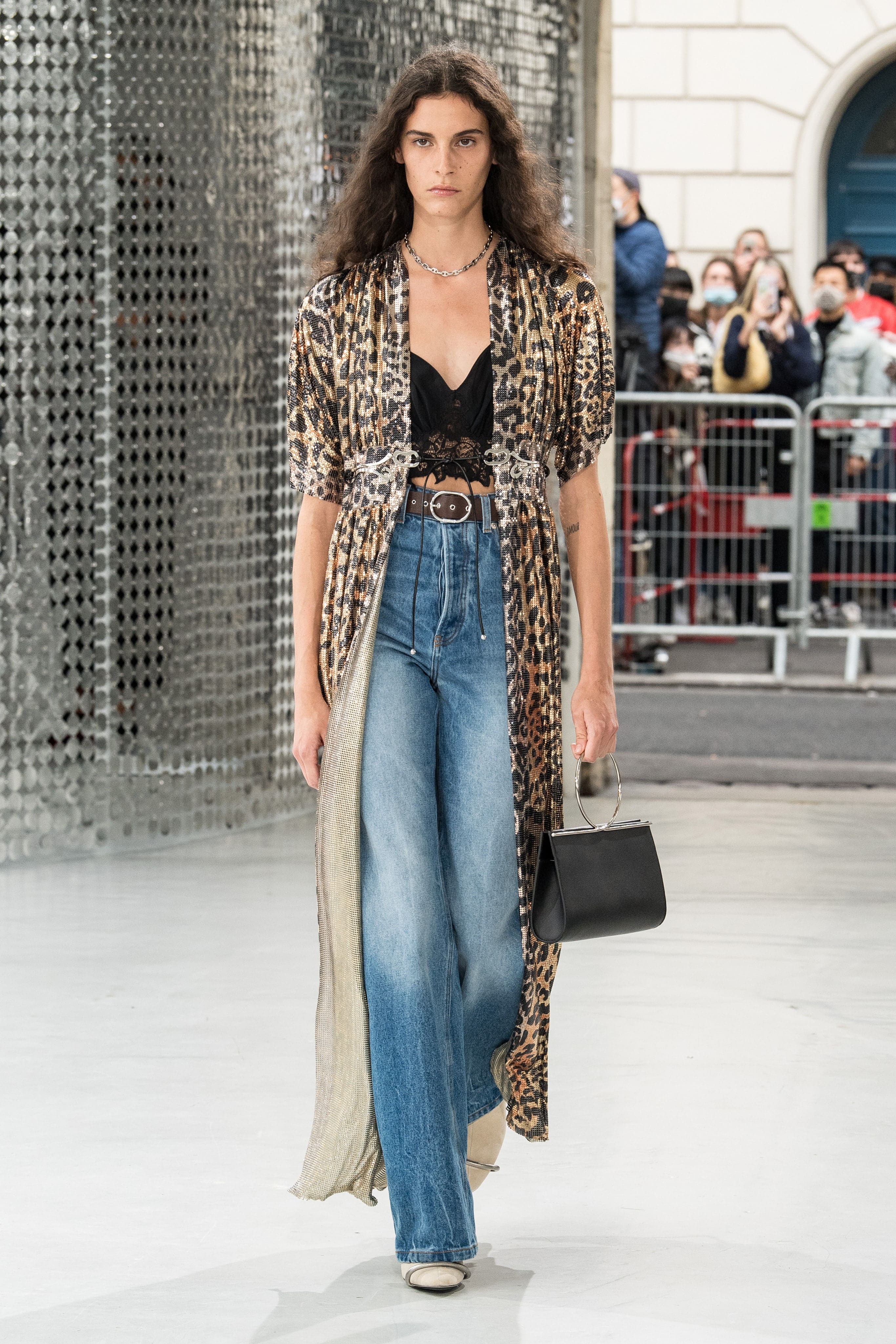 Отсюда буржуазные платья из кружева, надетые поверх леопардовых топов, а утонченные блузы в пайетках модели носят с джинсами и сюртуками. Сочетание брюк в клетку, прозрачной майки из угольно-черного гипюра и трикотажного кардигана и вовсе балансирует на грани панка и гранж-эстетики. Ироничная игра в "барахолку" удалась дизайнеру блестяще в буквальном смысле — леопардовые пальто, кожаные брюки и повседневные юбки миди сменяли воинственные платья-кольчуги, золотые струящиеся комбинезоны и расшитые орнаментами шелковые наряды.