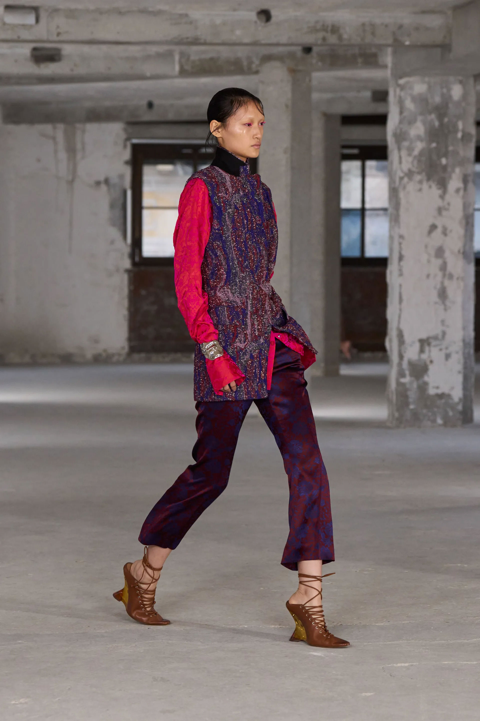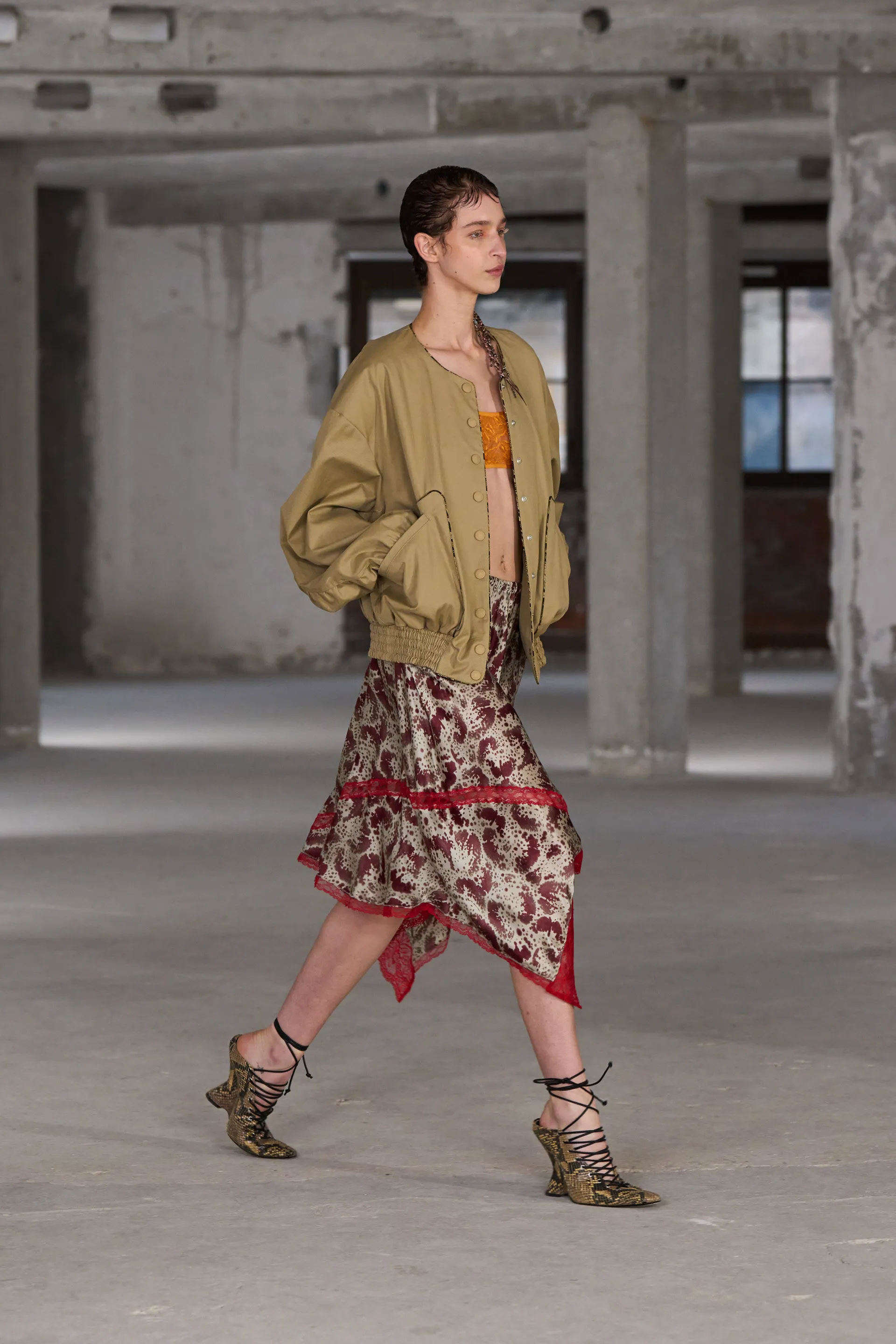 Креативна студія Dries Van Noten, яка займалася розробкою колекції в очікуванні нового дизайнера бренду, представила архівні творіння Ван Нотена в сучасній інтерпретації. На подіумі з’явилися принтовані сукні та блузи, жакардові жакети, брюки зі стразами, а також тренчі, реалізовані в різноманітних матеріалах. Кольорова палітра колекції spring-summer — 2025 надихала на віру в щасливе майбутнє Dries Van Noten: тут – глибокі відтінки рожевого, зеленого, помаранчевого та фіолетового.