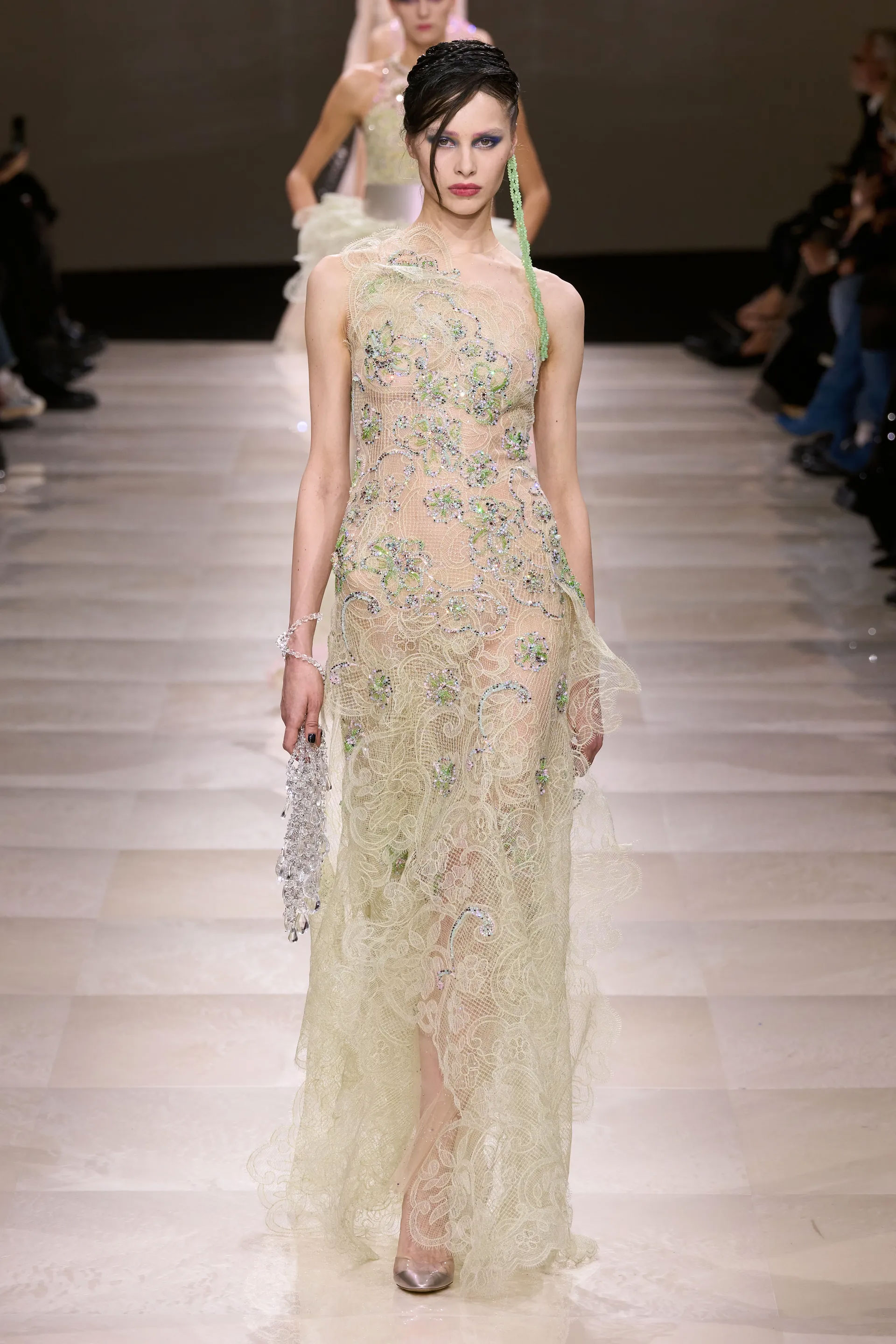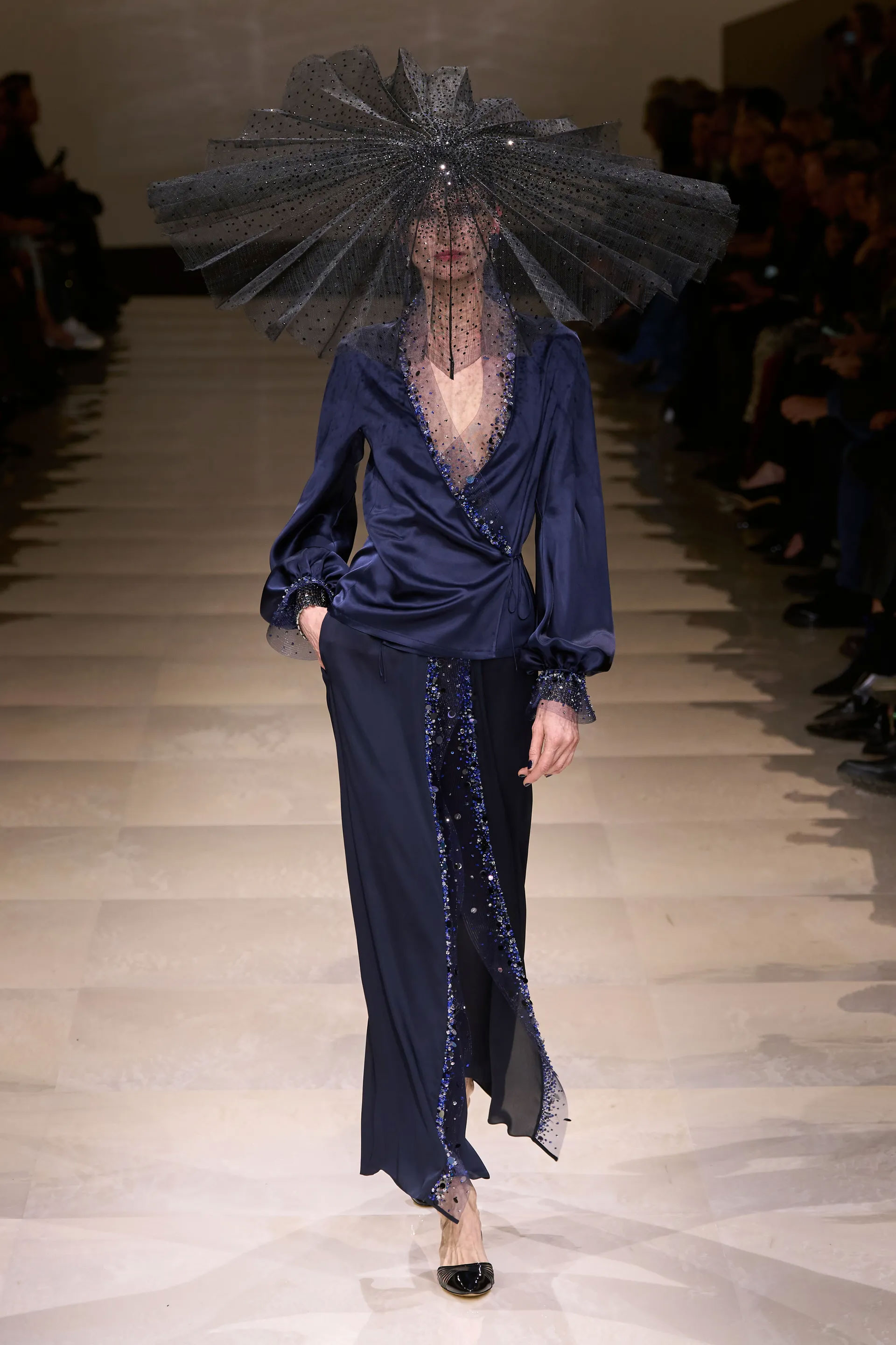 У кутюрній колекції весна-літо 2024 дизайнер Джорджіо Армані надихався різноманітністю культур — від Заходу до Сходу. Вишукані образи ілюстрували образ мандрівниці, життя якої складається з яскравих подорожей, що, звичайно, залишили слід на її світогляді й житті. Силуети ансамблів вирізнялися формами — від приталених, витягнутих до пишності з вибірковим об’ємом. Пастельні образи з ніжним мереживом і лелітками поєднувалися з шовком, а наприкінці колекції моделі демонстрували варіативність фактур із прозорими деталями в чорному й темно-синіх відтінках.