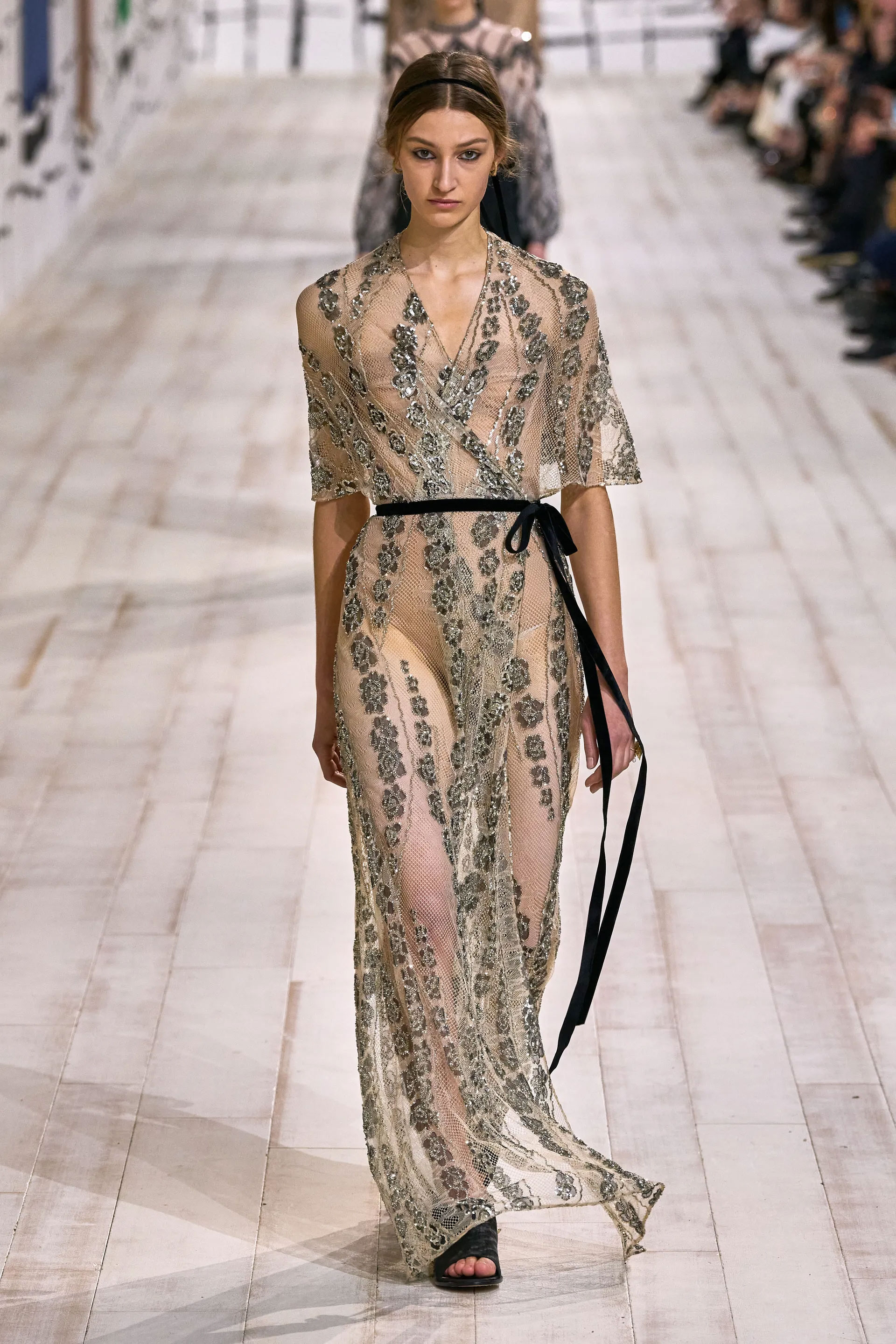 Продовжуючи тему аури, яка проходить крізь високу моду, креативна директорка модного Дому Марія Грації К’юрі звернулася до історії Dior. Для дизайнерки концепція «аури» — це натхнення передусім культовими творіннями, що в сучасній інтерпретації набувають нових форм. Так, у кутюрній колекції весна-літо 2024 Марія Грація К’юрі відтворила сукню La Cigale в муаровій тканині й звернулася до архітектурної елегантності — багатошарових широких спідниць, структурних штанів і піджаків та суконь із деталями й силуетами архівного Dior.