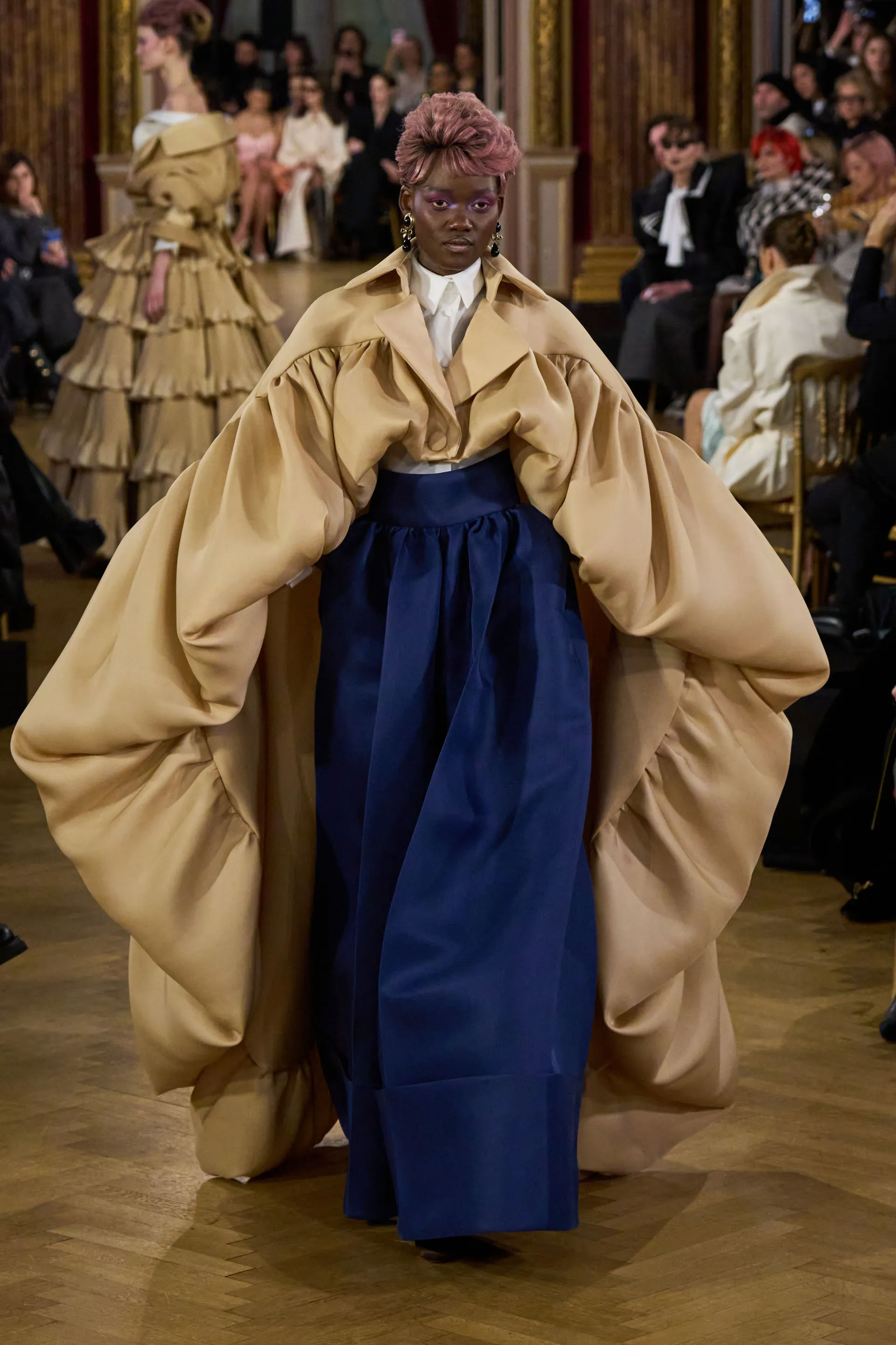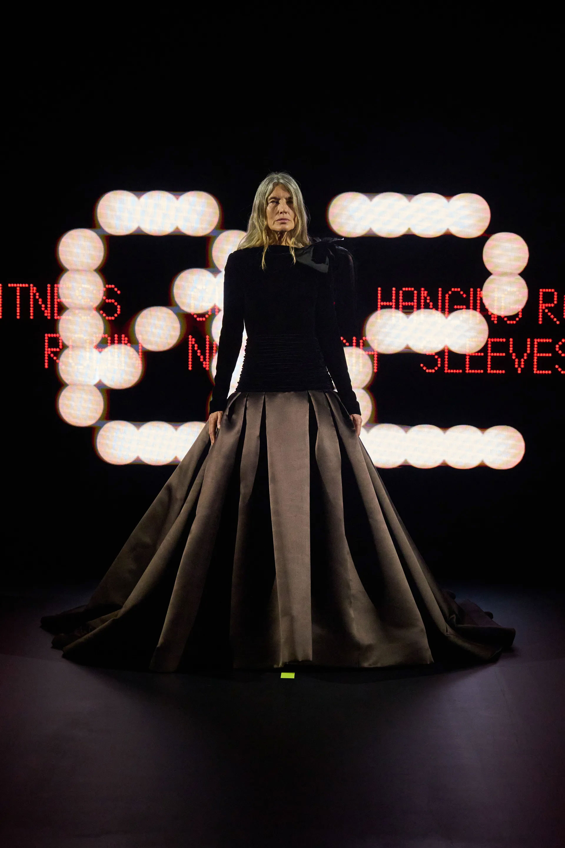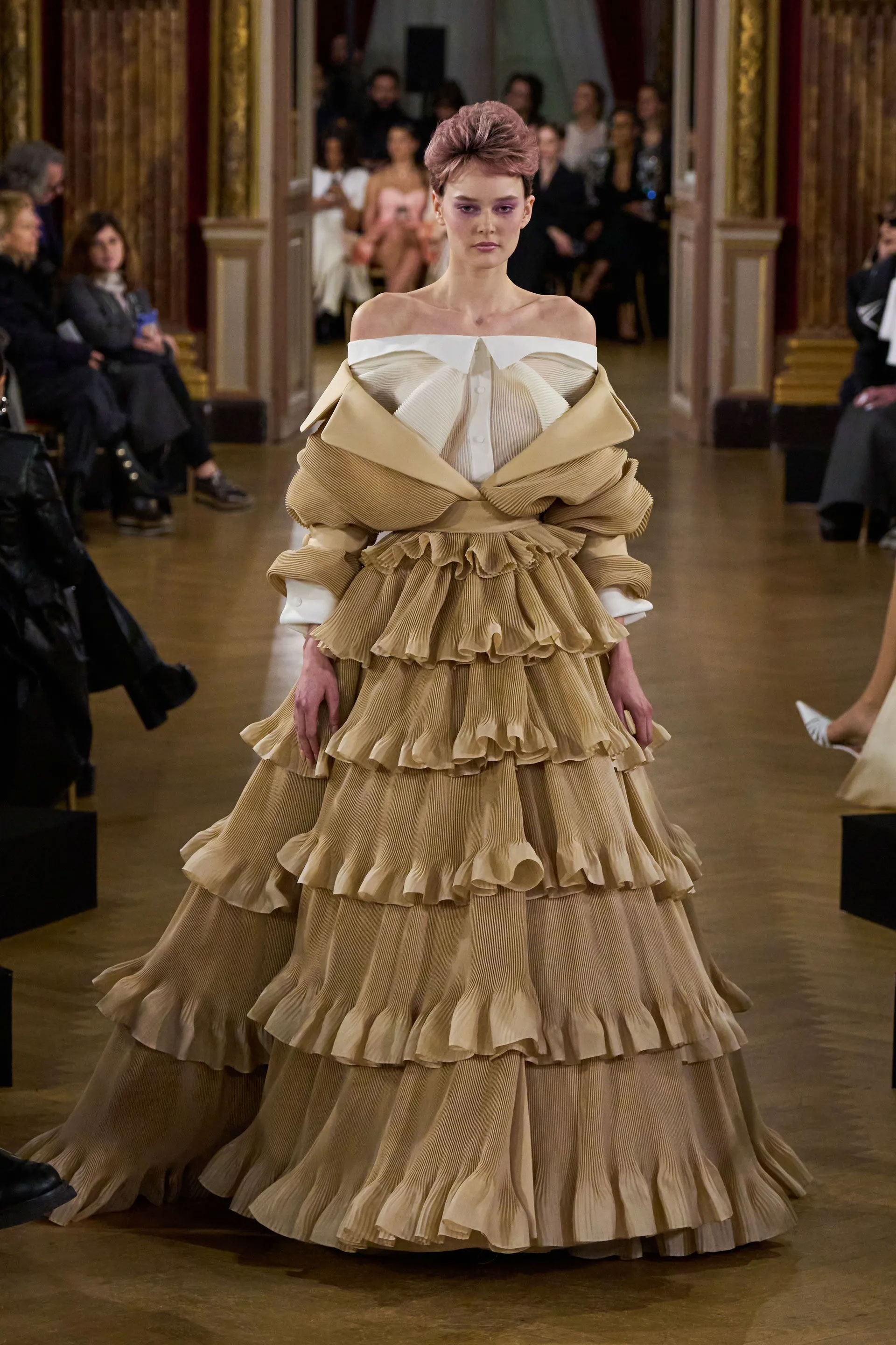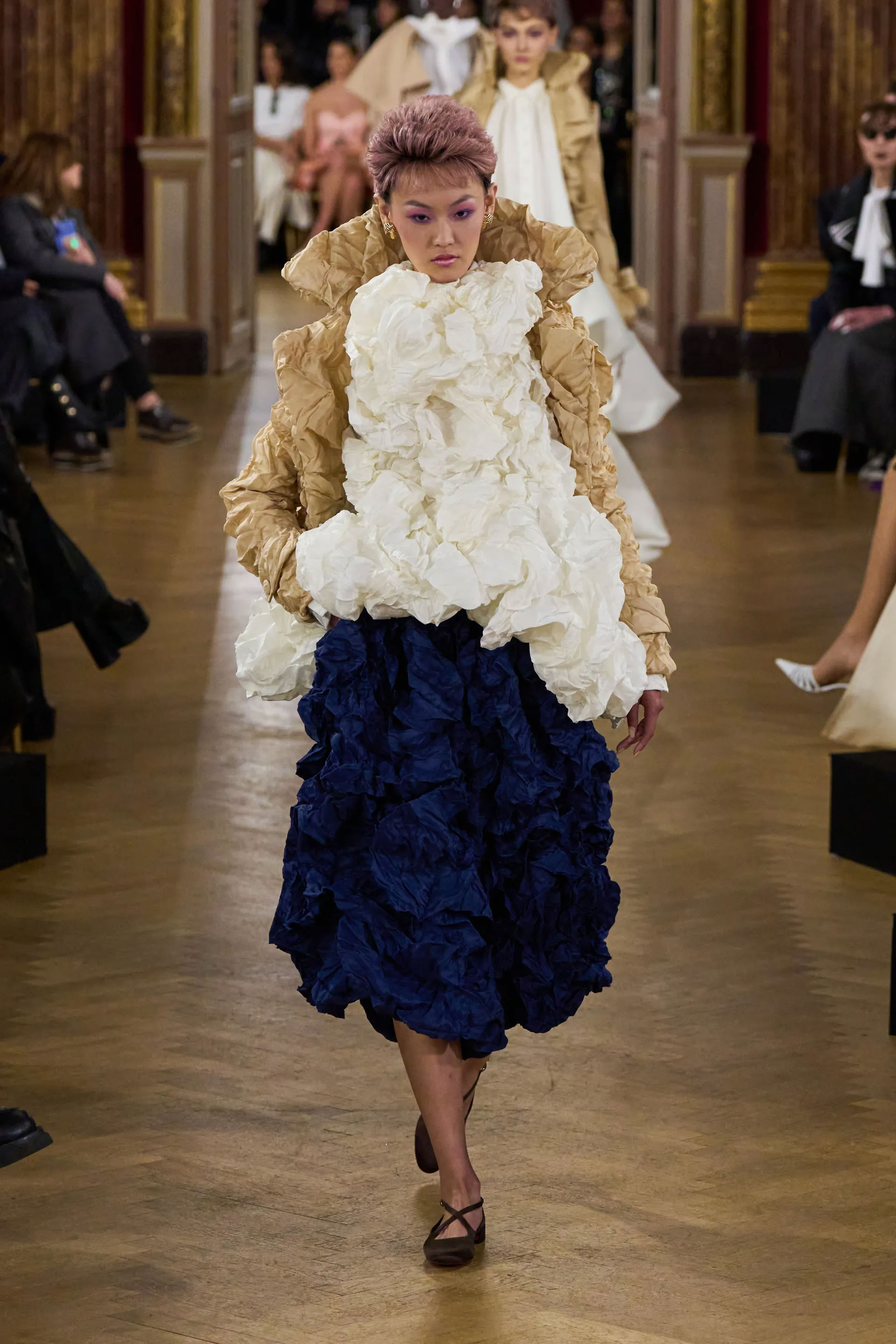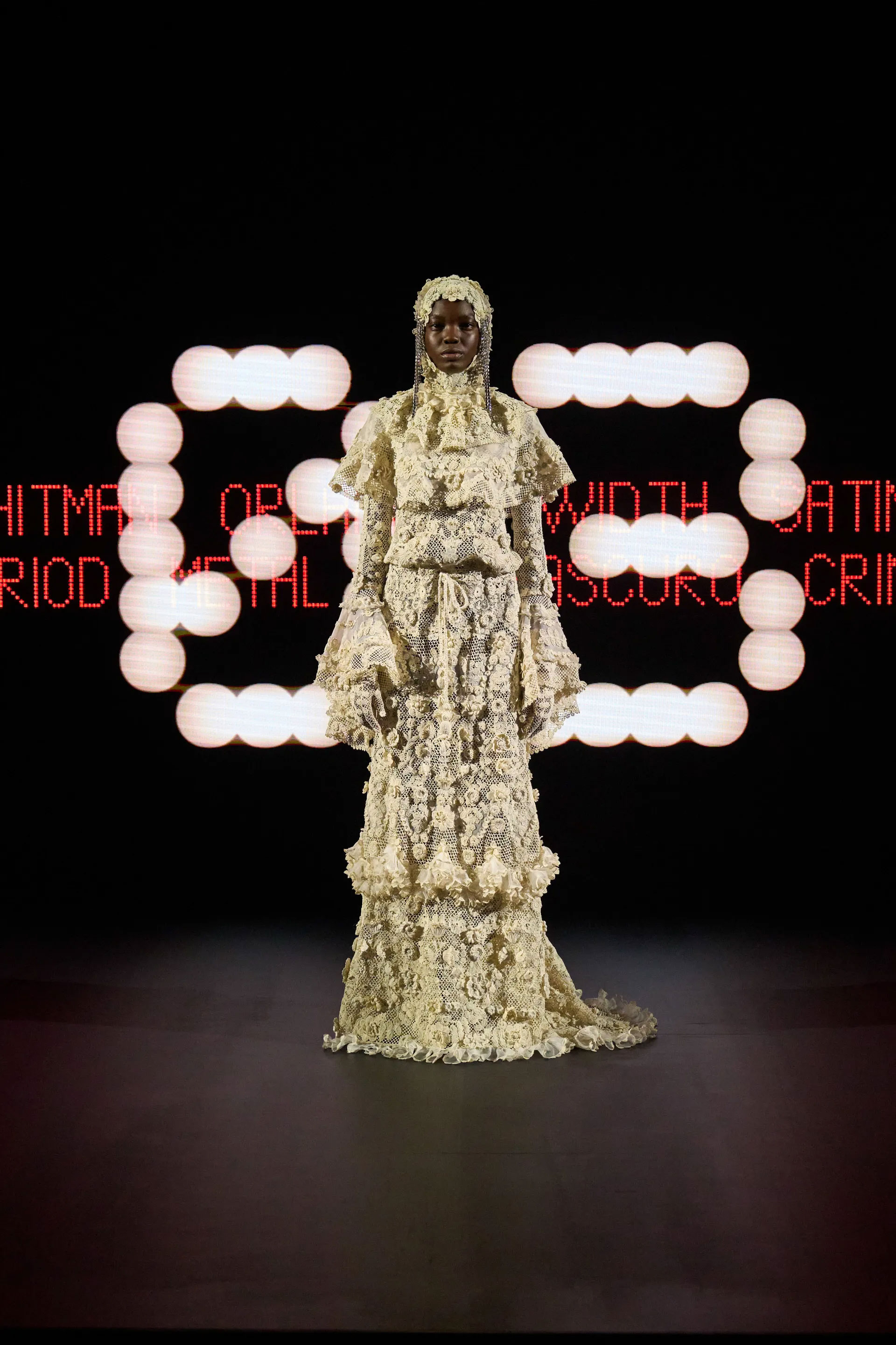 Короткі, довгі, барокові, мінімалістичні, з рюшами чи без — усі 27 образів були об’єднані однією тканиною, шовковим газаром (всього 900 метрів), і голосом, згенерованим штучним інтелектом, що представляв їх. Такий вибір відсилає до кутюрної колекції Victor & Rolf весна-літо 1999 «Blacklight», створеної повністю з останніх залишків шовкового газару, зробленого в співпраці Крістобаля Баленсіаги зі швейцарським виробником Abraham. Доповнювали нові кутюрні образи коричневі атласні туфлі Christian Louboutin і вінтажні прикраси.