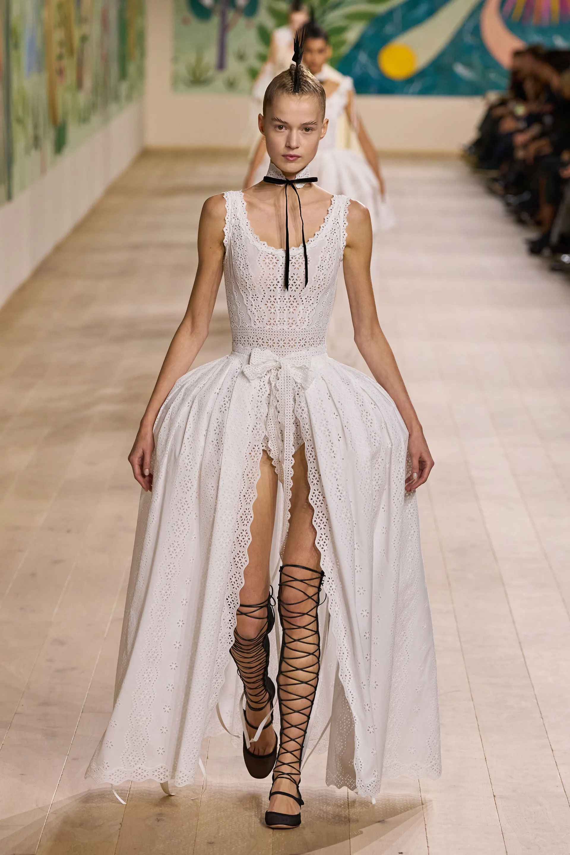 У новій колекції Марія Грація К’юрі також інтерпретувала спадщину модного дому: колекцію Trapèze 1958 року Іва Сен-Лорана для Dior, створену за баченням дитячого одягу, і силует Cigale Крістіана Діора. Якими ж постали на подіумі героїні модної «Аліси в Дивокраї»? Вони крокували з гребенеподібними зачісками в сучасній версії криноліна, вишитих квітами «клітках», романтичних прозорих блузках, фраку, шортах-блумерах і пір’ї з органзи.