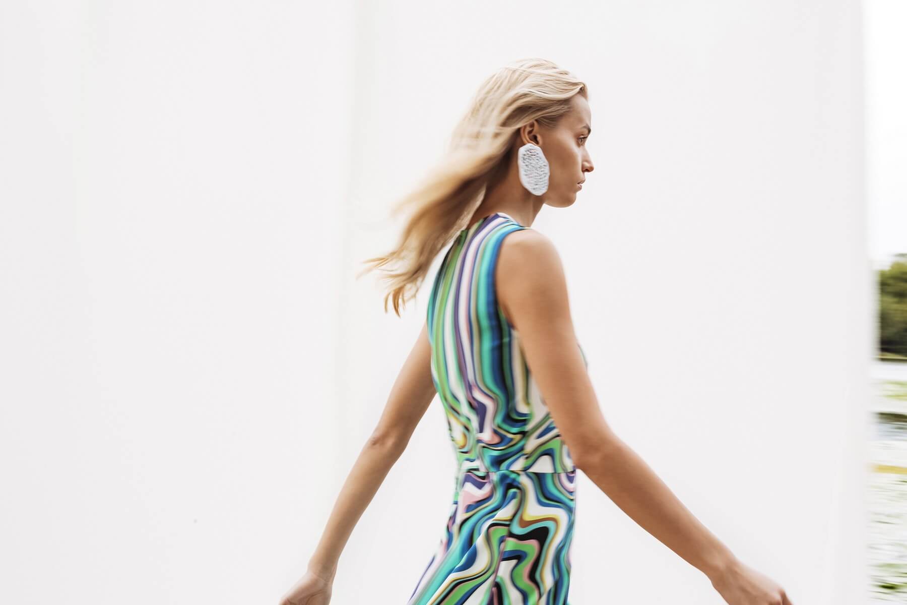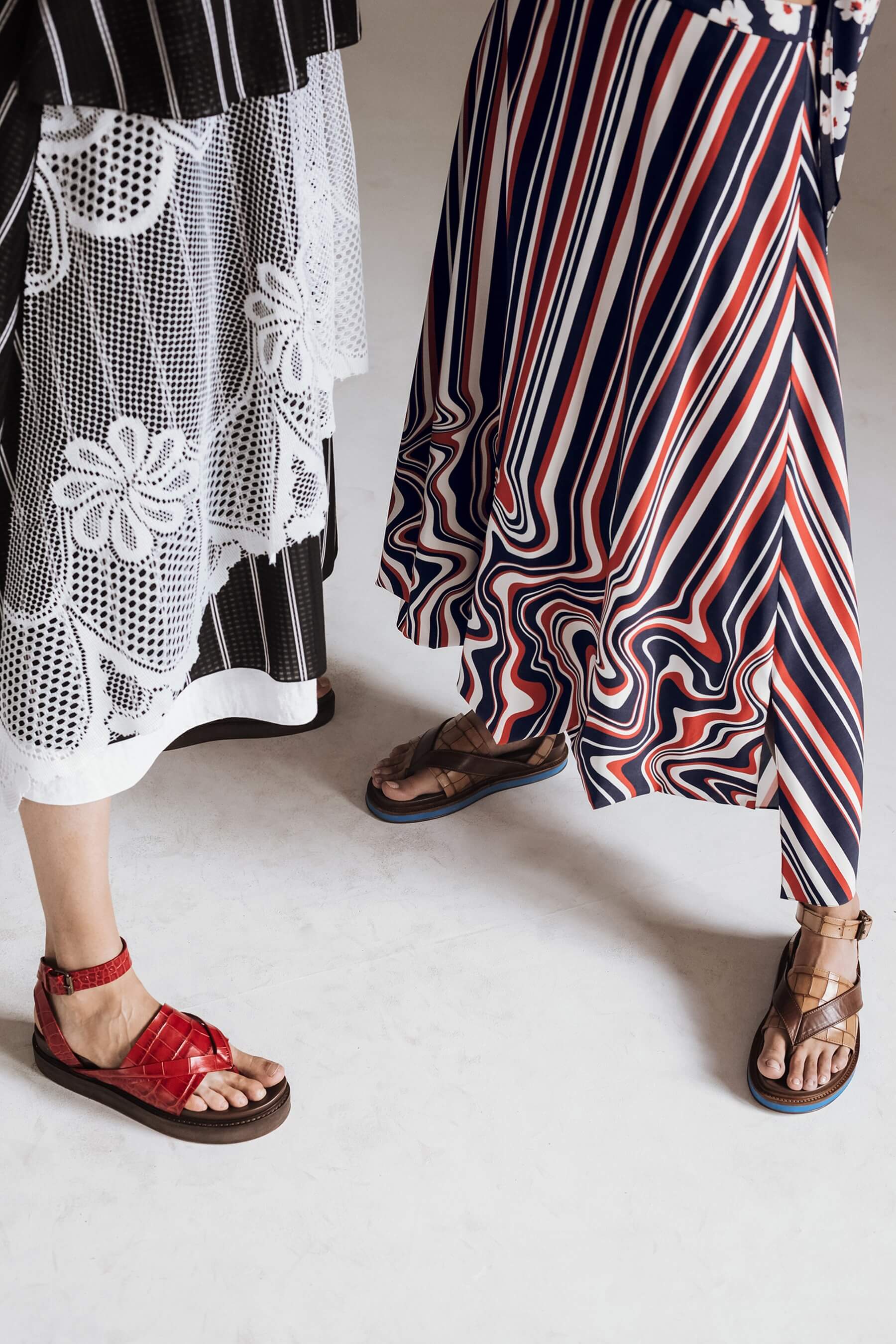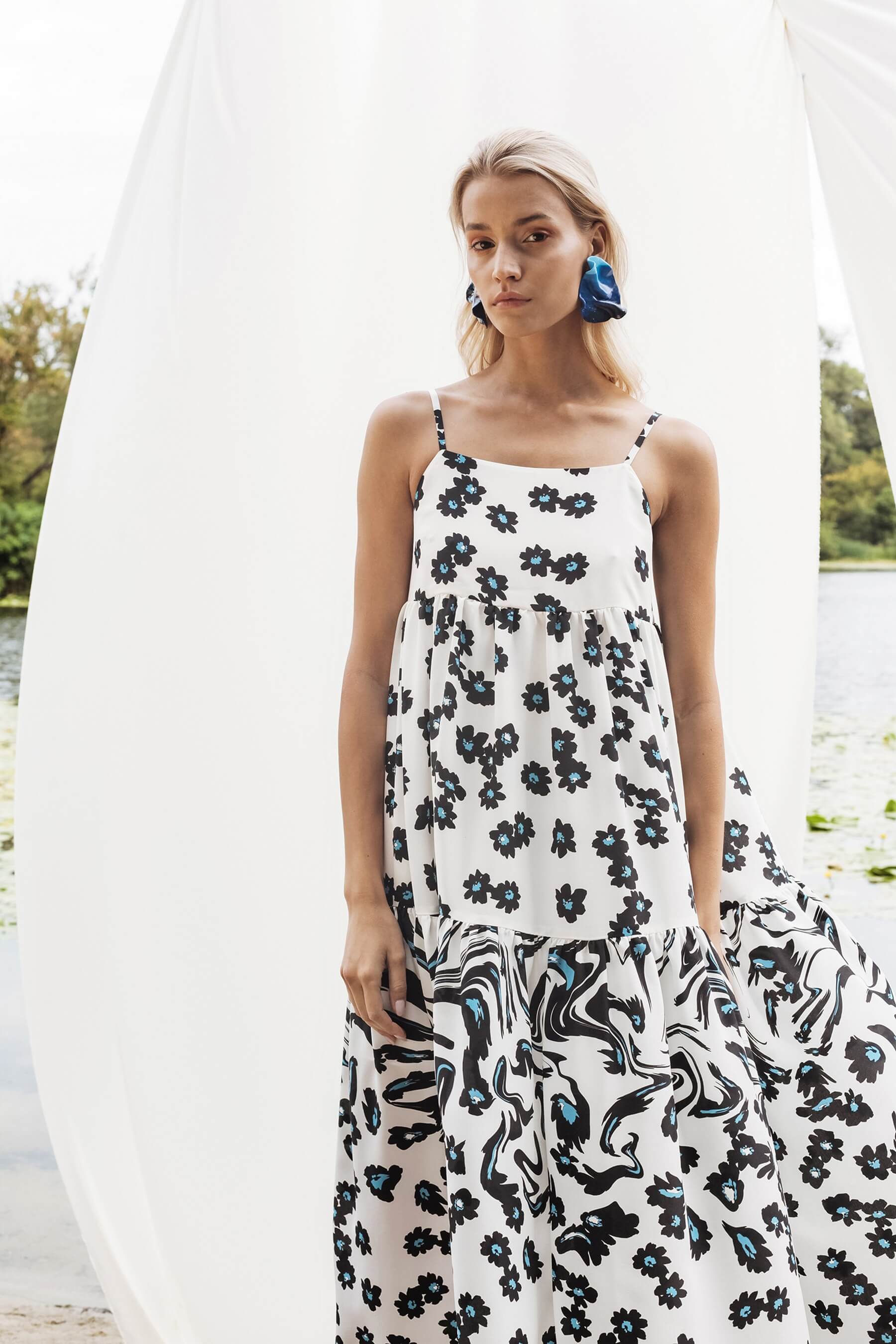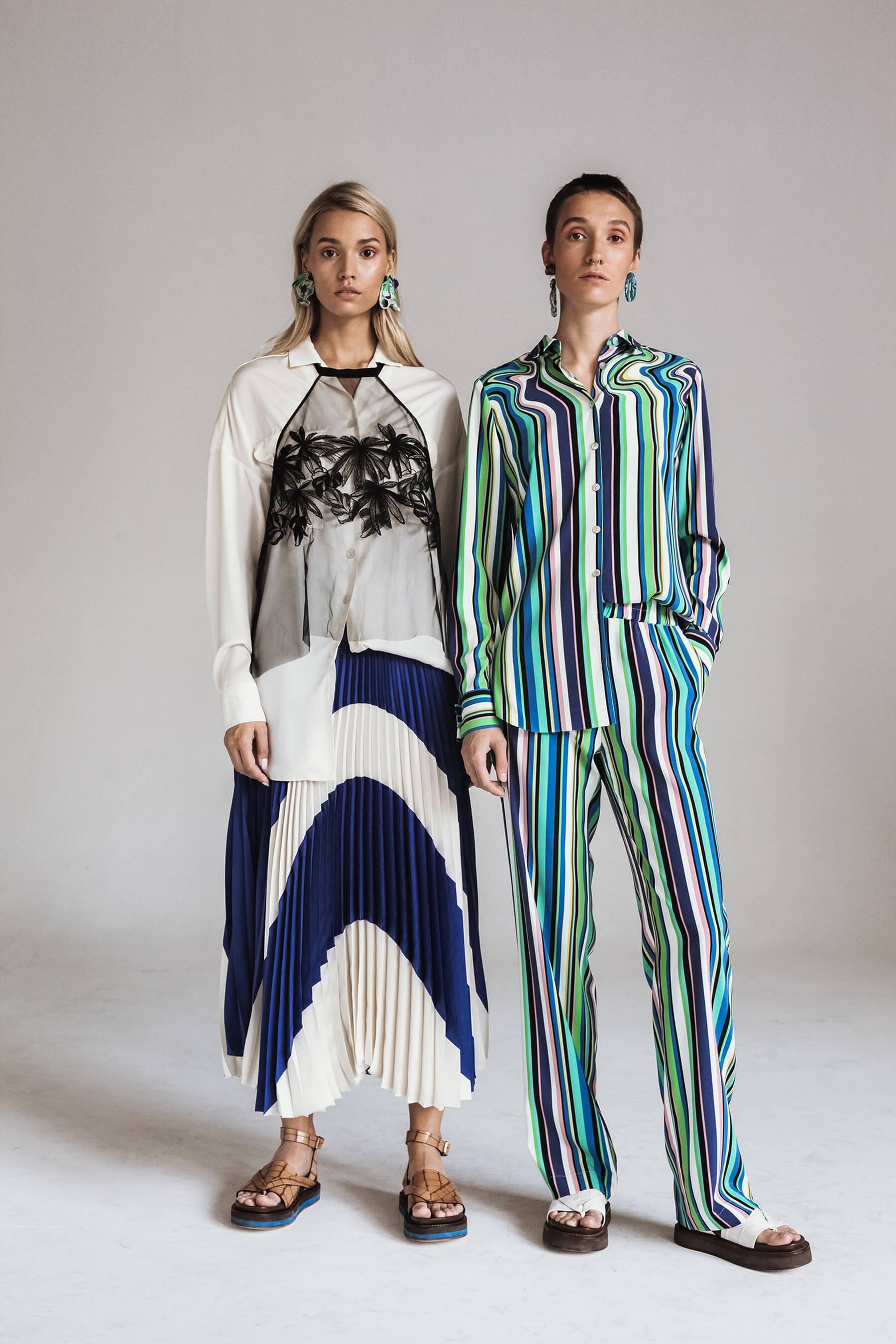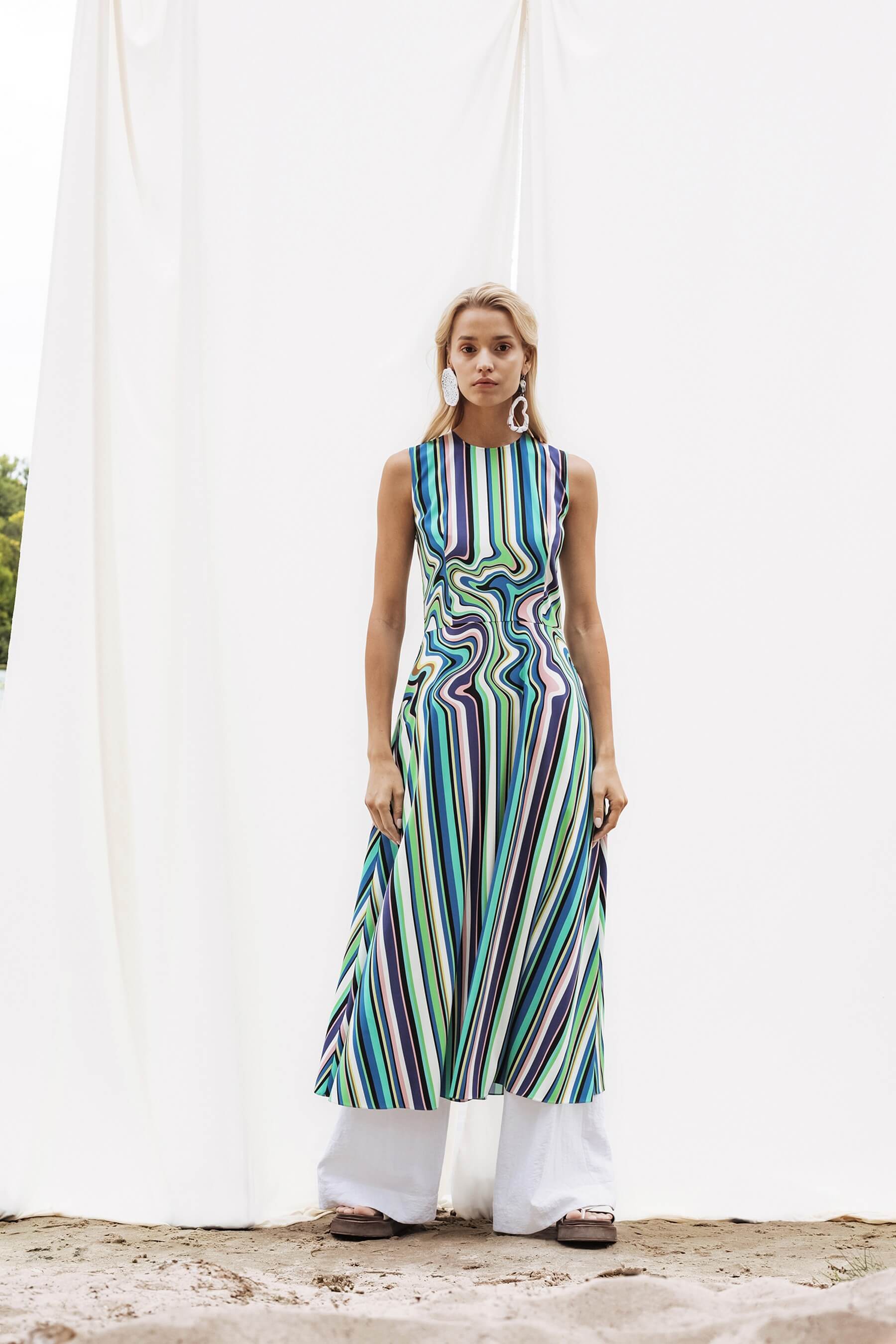 Побережья Нормандии и Бретани с их вольными ландшафтами и фактурами стали источниками вдохновения — нежные и лаконичные платья выполнены в цветах западного неба, пряностей французских южных рынков или вовсе имитируют дощатые фасады пляжных домиков в нормандском стиле "коломбаж" — синие, в полоску.