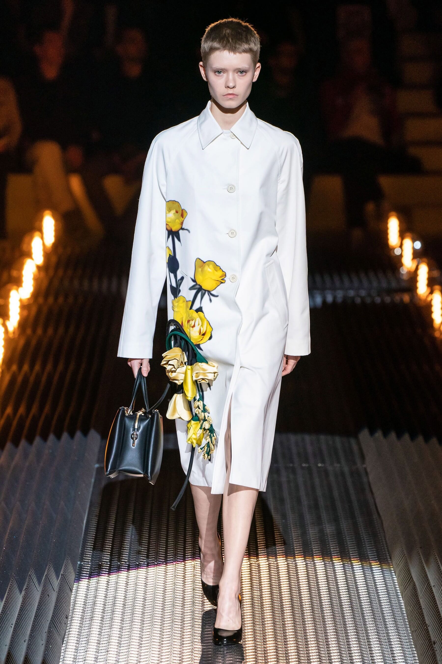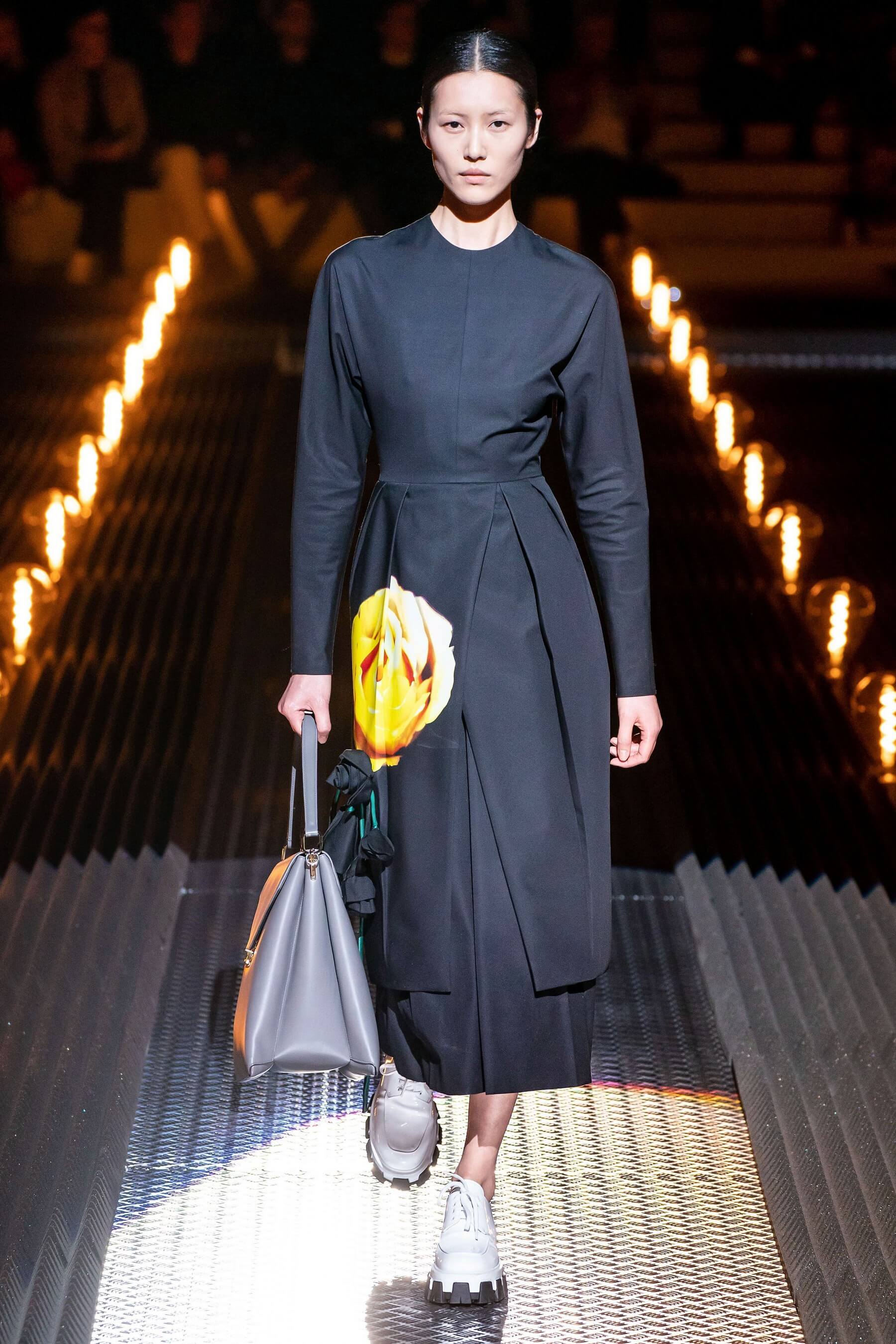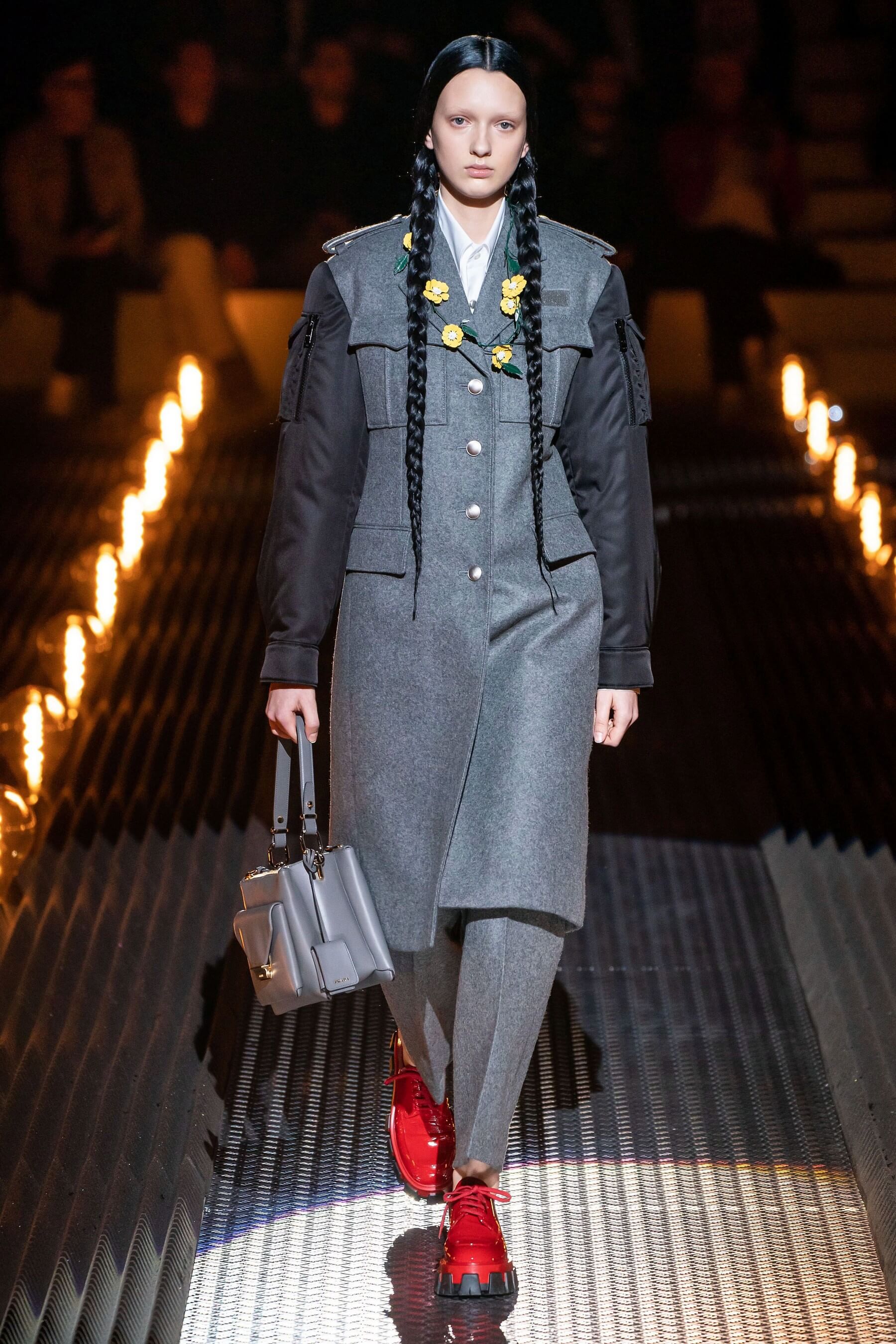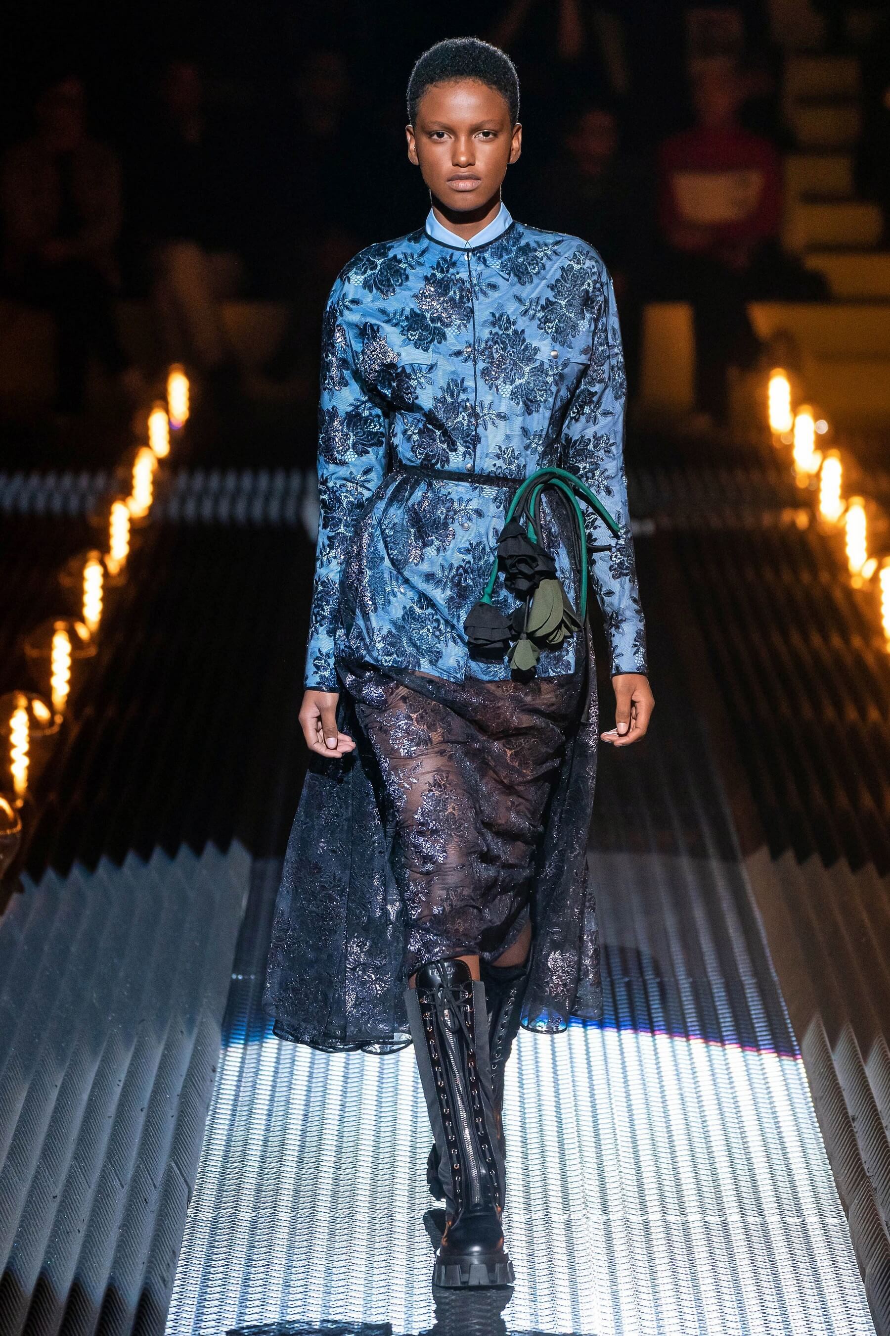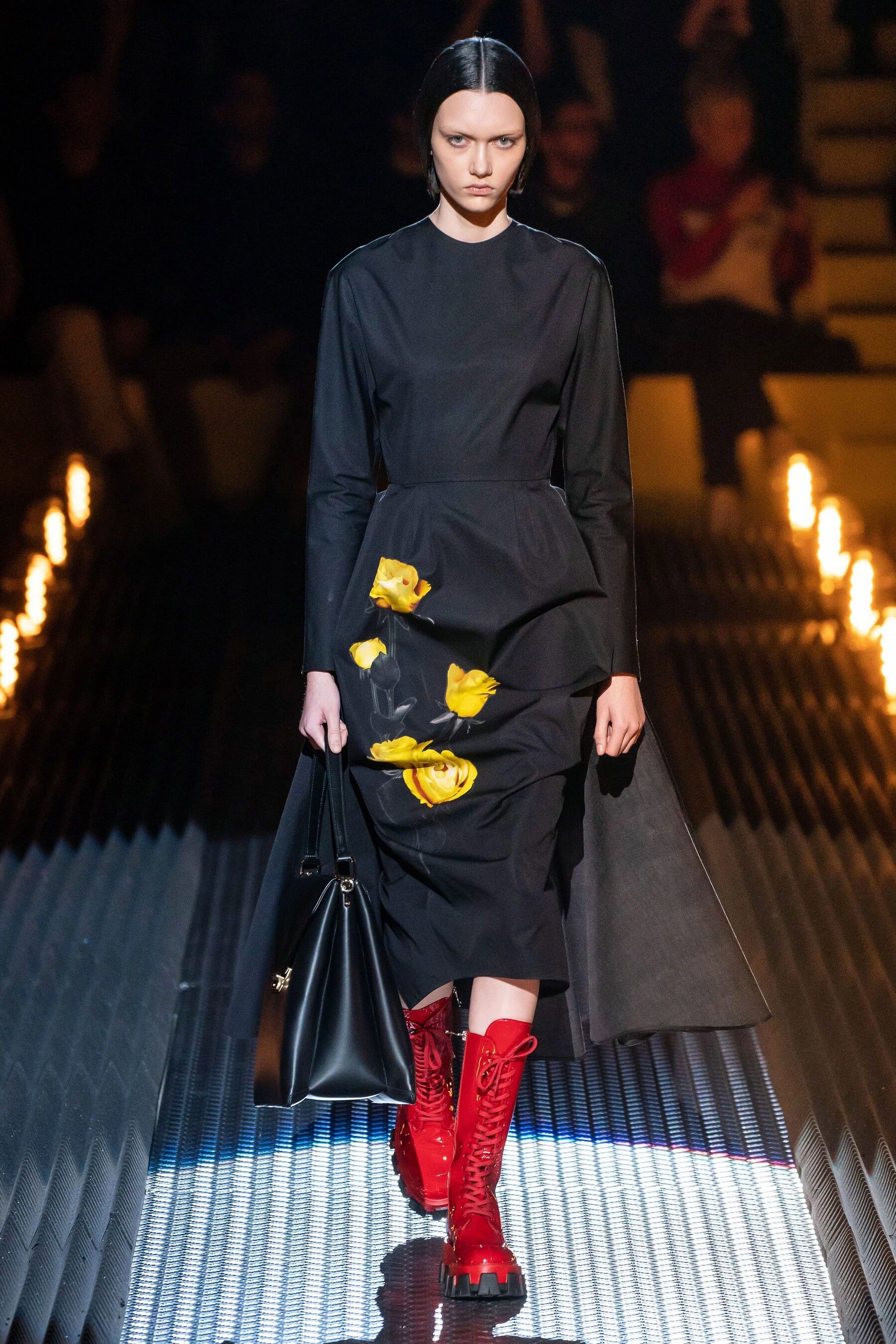 В новой коллекции Миучча Прада иносказательно подчеркивает контраст между тёмной, таинственной красотой и красотой очевидной, явной. Юбки и платья украшали принты и аппликации в виде роз и тюльпанов, кое-где желтых, а кое-где траурно-черных, поверх милитаризированных пальто были накинуты эфемерные кейпы из гипюра, а на некоторых куртках и платьях расположен рисунок: головы монстра Франкенштейна и его невесты, наводивших ужас на зрителей, в исполнении Бориса Карлоффа и Эльзы Ланчестер. Тугие косы на ровный пробор у моделей — отсылка к персонажу "Семейки Аддамс" Уэнздей Аддамс. Показ прошел в помещении Fondazione Prada, а готика стала продолжением темы мужского шоу Prada, показанного в январе.