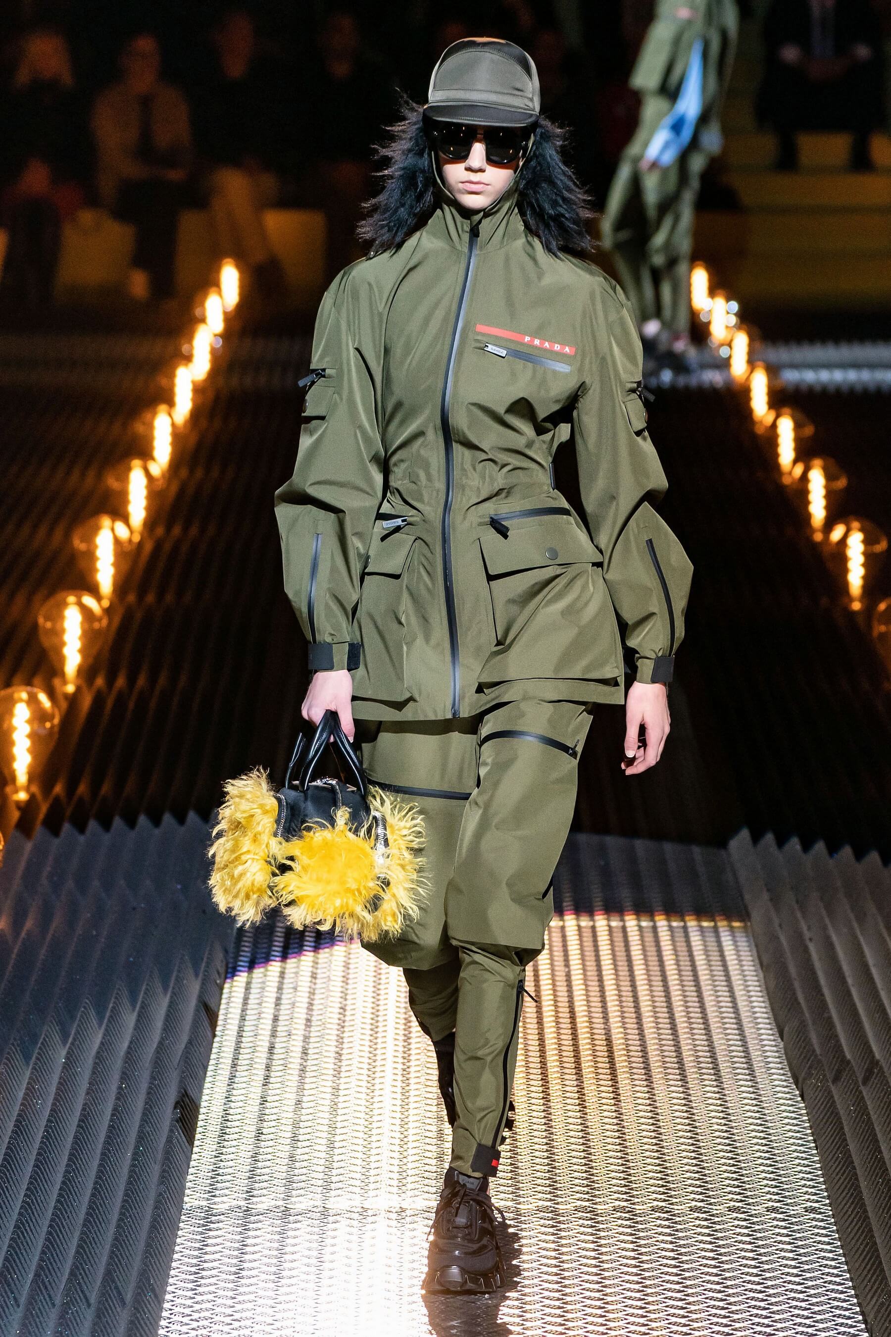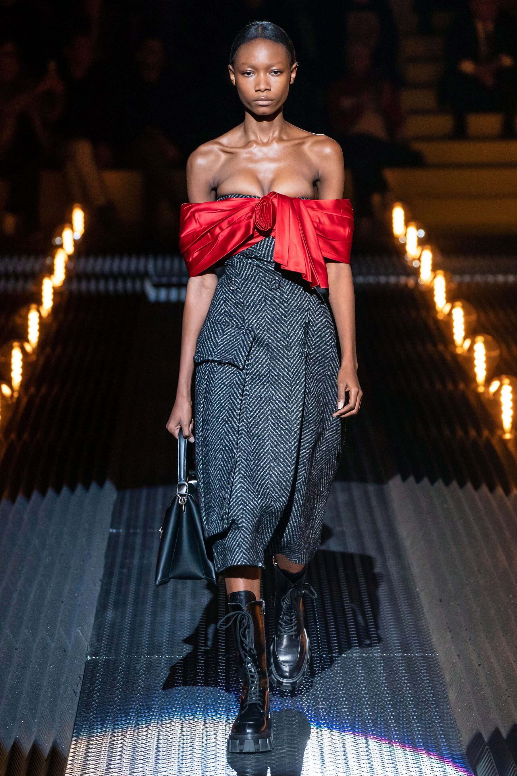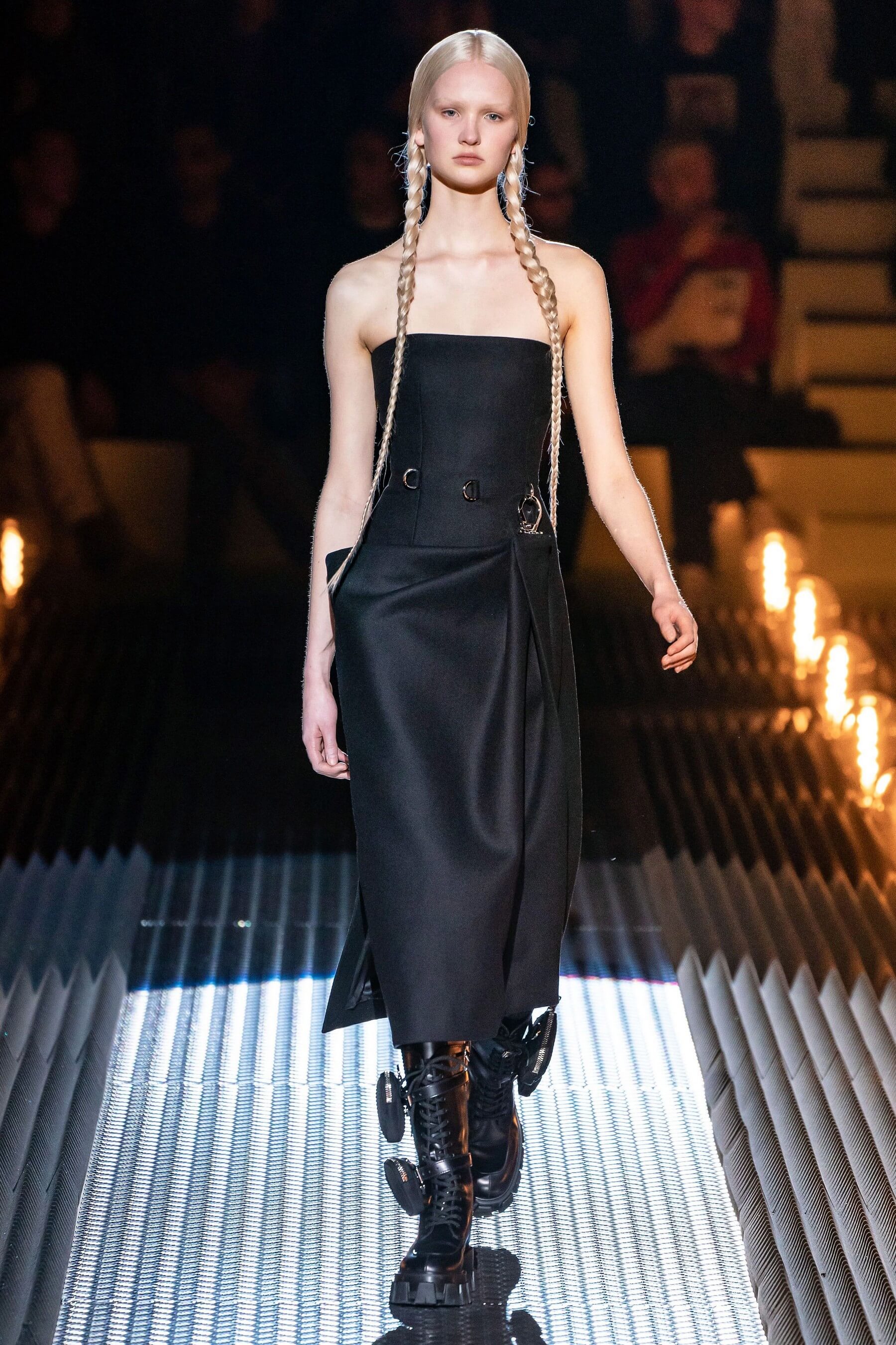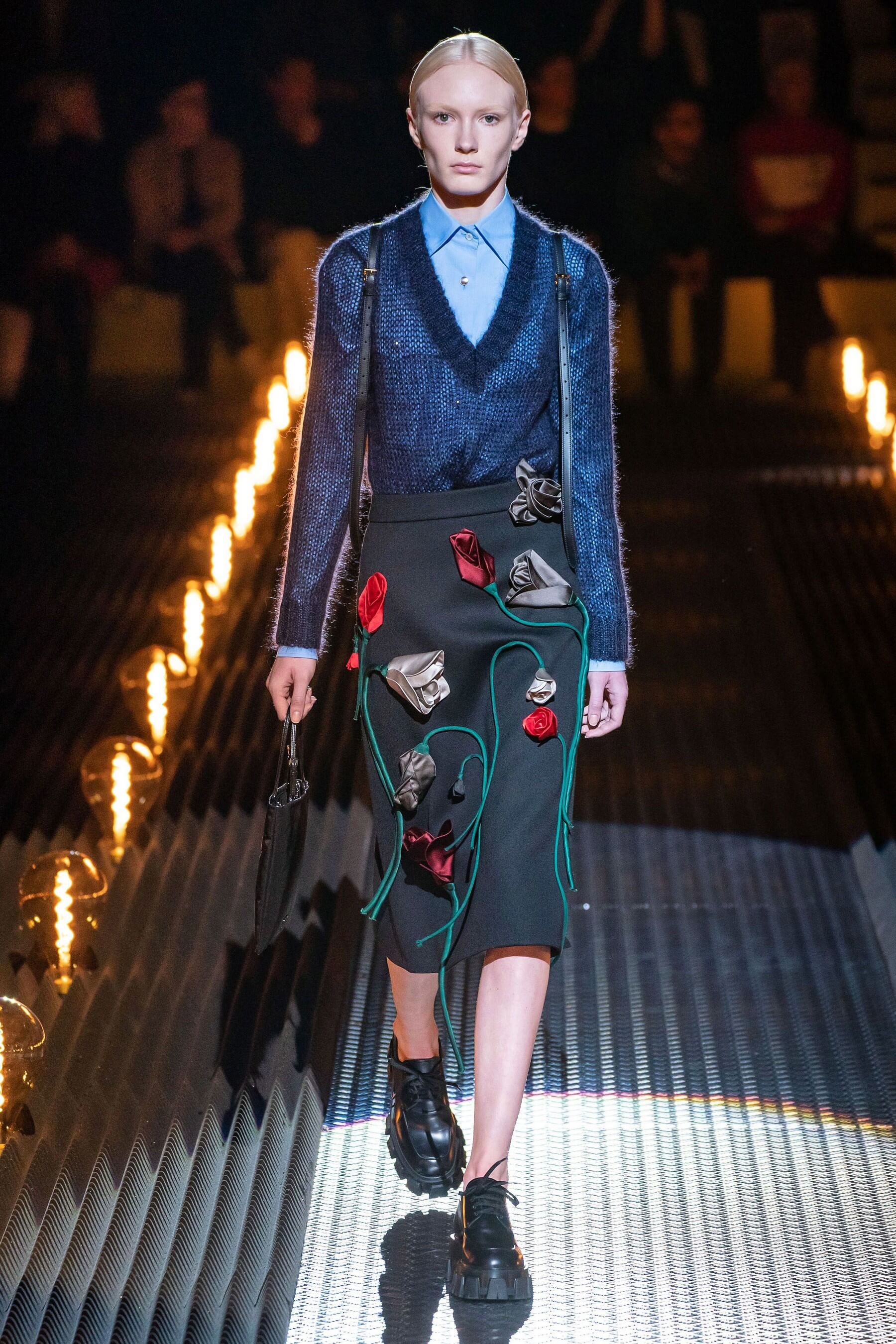 В новой коллекции Миучча Прада иносказательно подчеркивает контраст между тёмной, таинственной красотой и красотой очевидной, явной. Юбки и платья украшали принты и аппликации в виде роз и тюльпанов, кое-где желтых, а кое-где траурно-черных, поверх милитаризированных пальто были накинуты эфемерные кейпы из гипюра, а на некоторых куртках и платьях расположен рисунок: головы монстра Франкенштейна и его невесты, наводивших ужас на зрителей, в исполнении Бориса Карлоффа и Эльзы Ланчестер. Тугие косы на ровный пробор у моделей — отсылка к персонажу "Семейки Аддамс" Уэнздей Аддамс. Показ прошел в помещении Fondazione Prada, а готика стала продолжением темы мужского шоу Prada, показанного в январе.