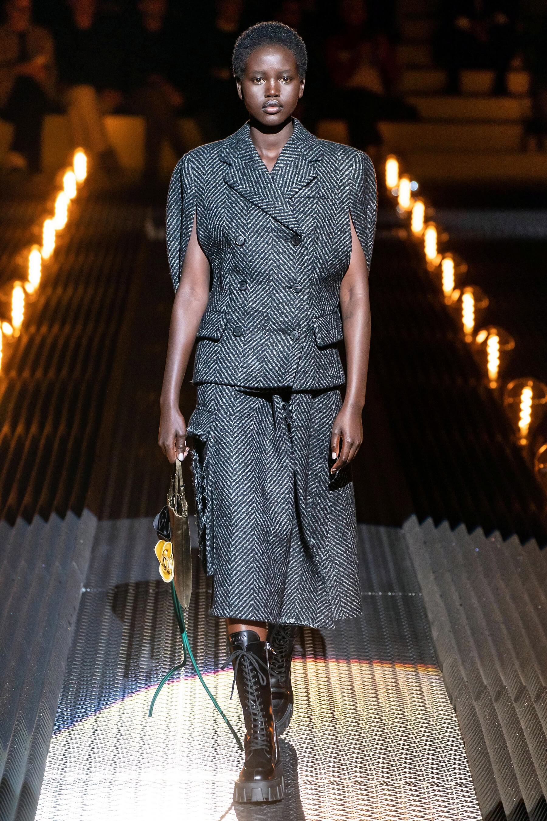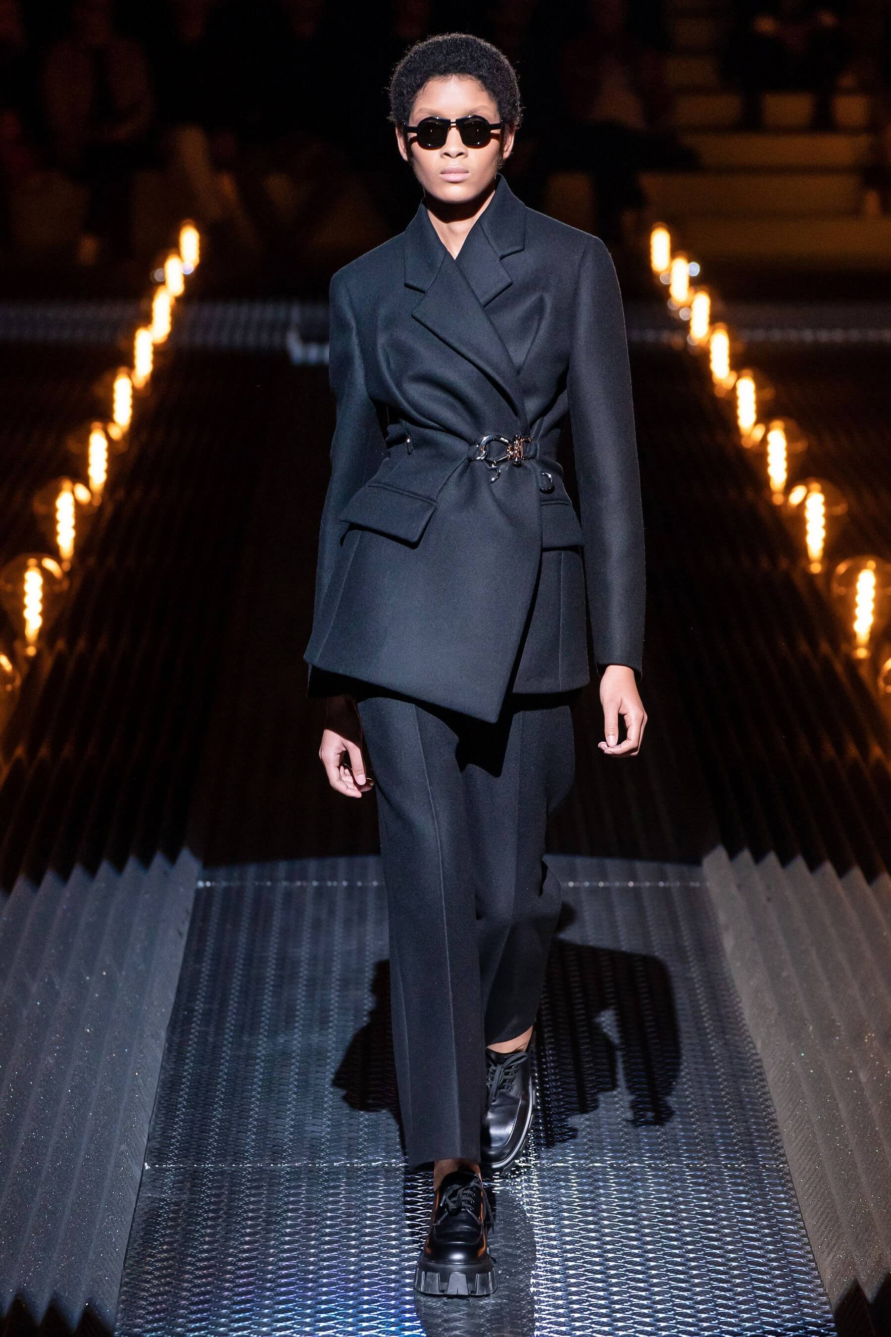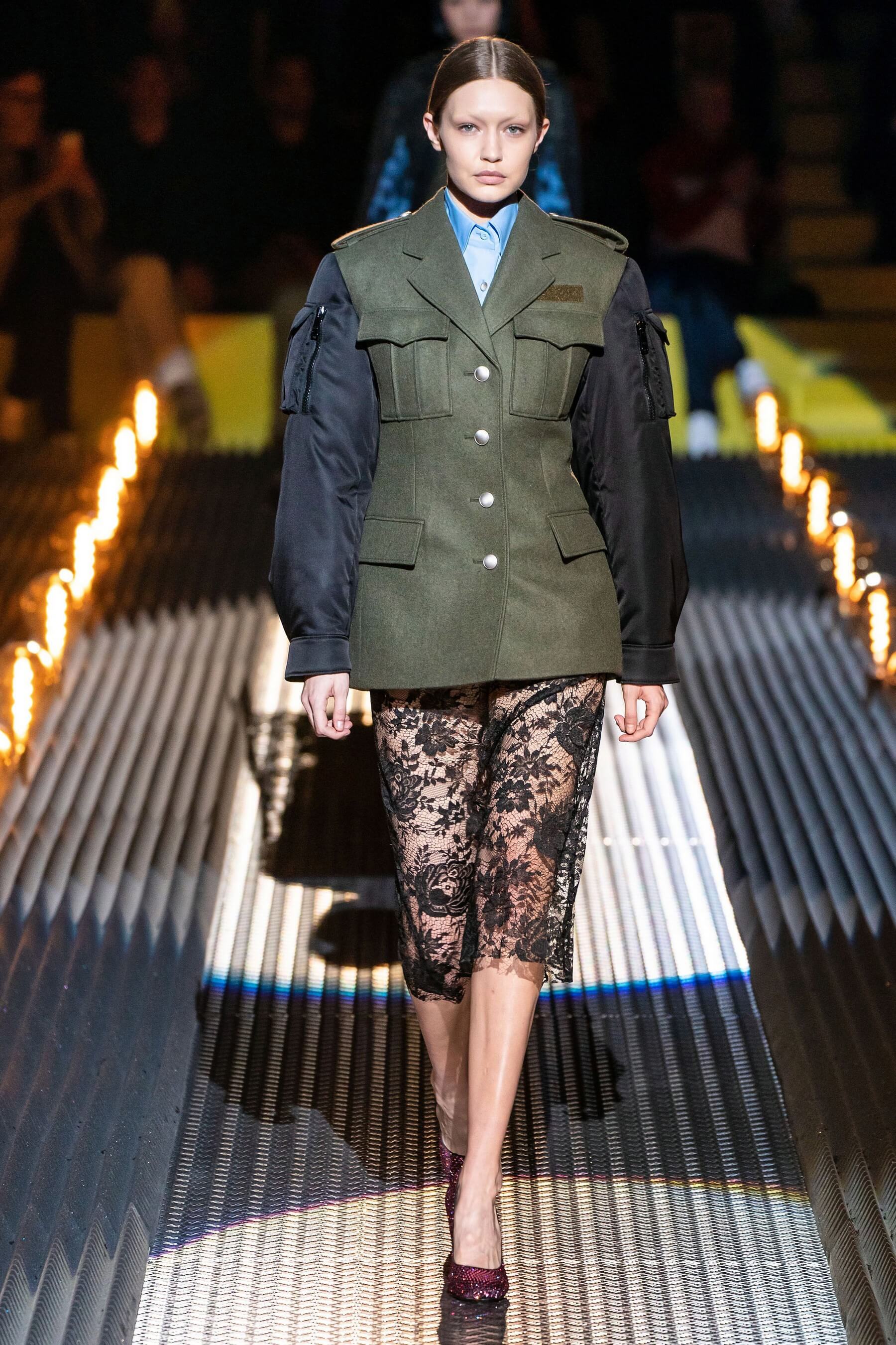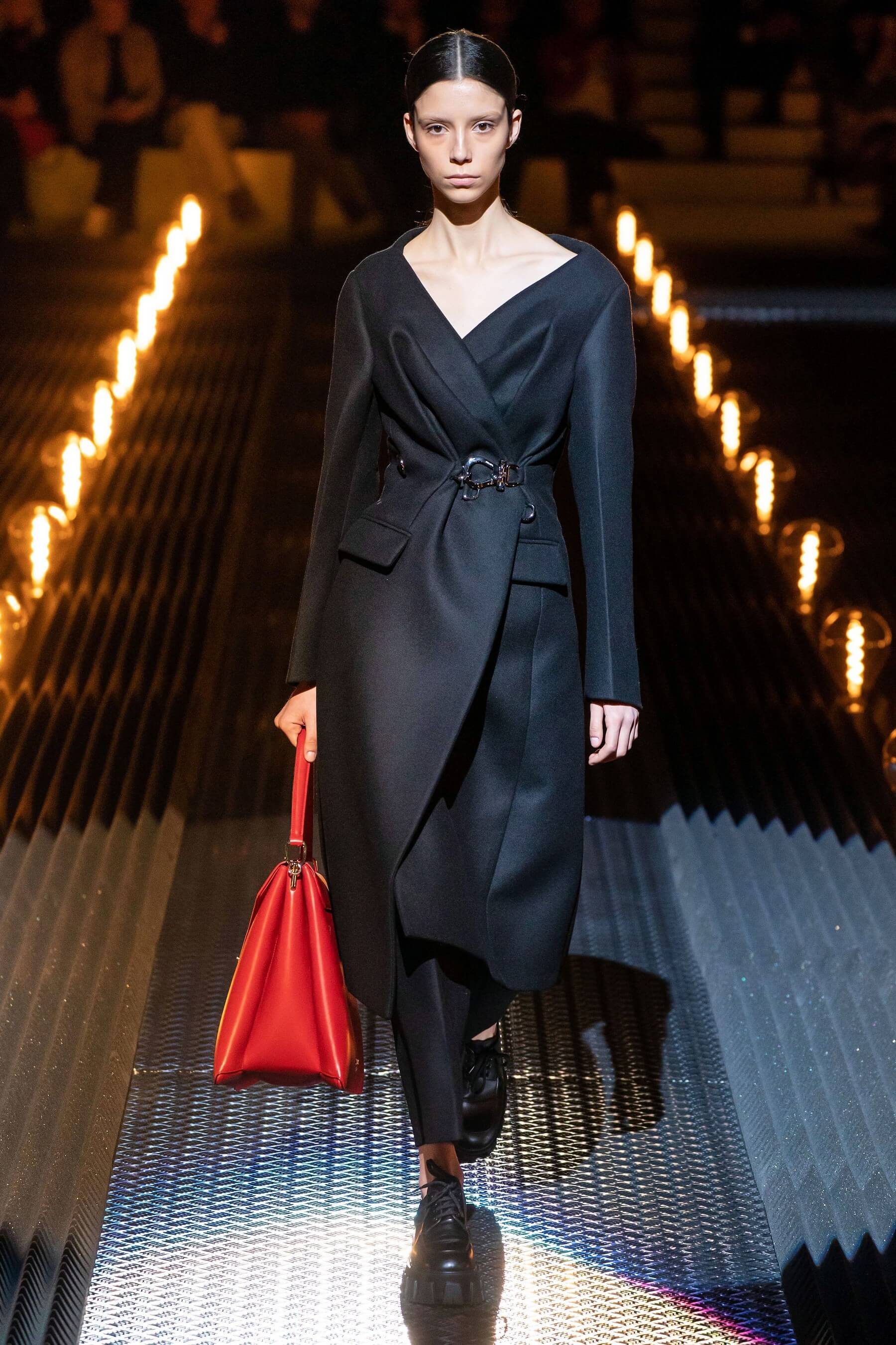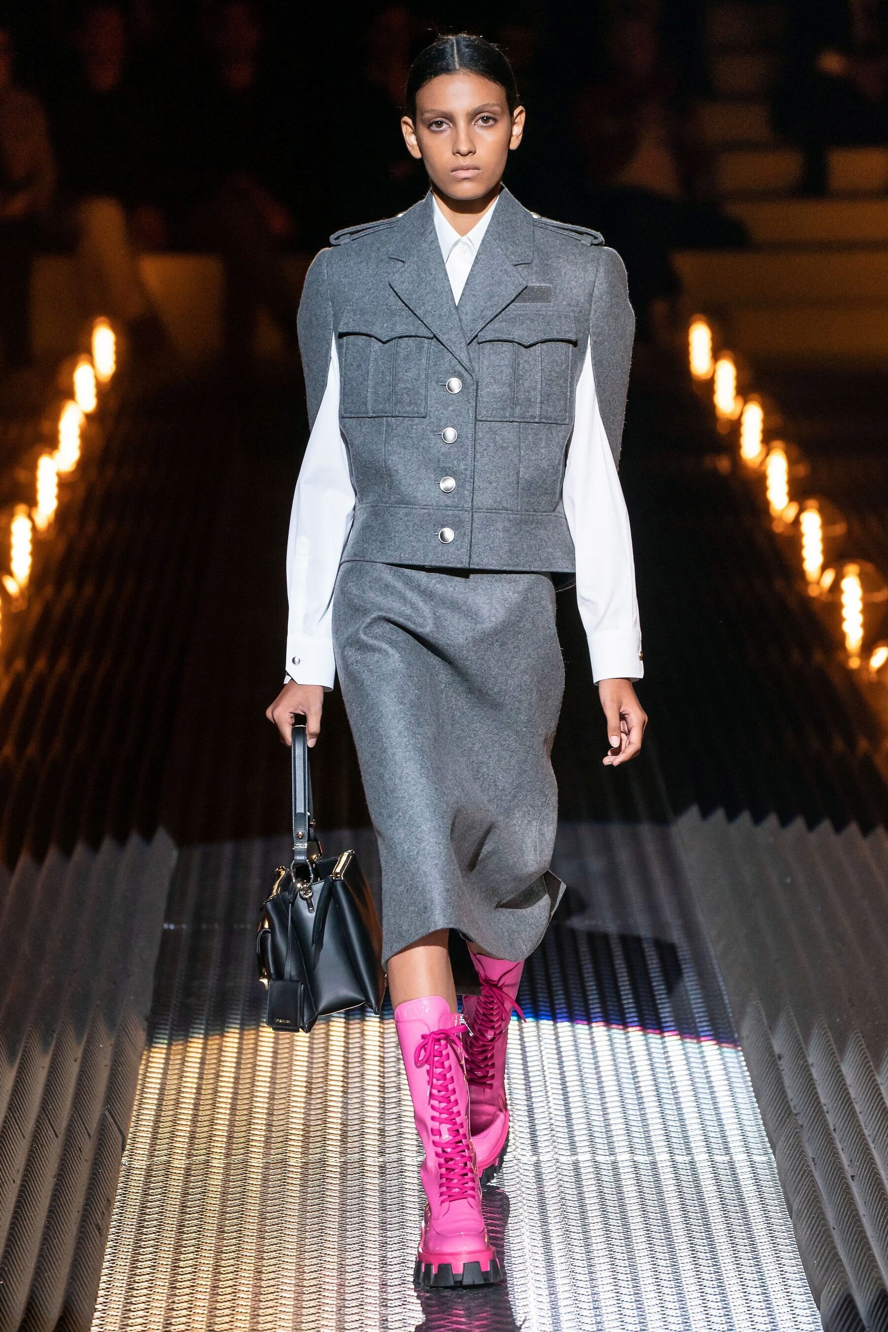 В новой коллекции Миучча Прада иносказательно подчеркивает контраст между тёмной, таинственной красотой и красотой очевидной, явной. Юбки и платья украшали принты и аппликации в виде роз и тюльпанов, кое-где желтых, а кое-где траурно-черных, поверх милитаризированных пальто были накинуты эфемерные кейпы из гипюра, а на некоторых куртках и платьях расположен рисунок: головы монстра Франкенштейна и его невесты, наводивших ужас на зрителей, в исполнении Бориса Карлоффа и Эльзы Ланчестер. Тугие косы на ровный пробор у моделей — отсылка к персонажу "Семейки Аддамс" Уэнздей Аддамс. Показ прошел в помещении Fondazione Prada, а готика стала продолжением темы мужского шоу Prada, показанного в январе.