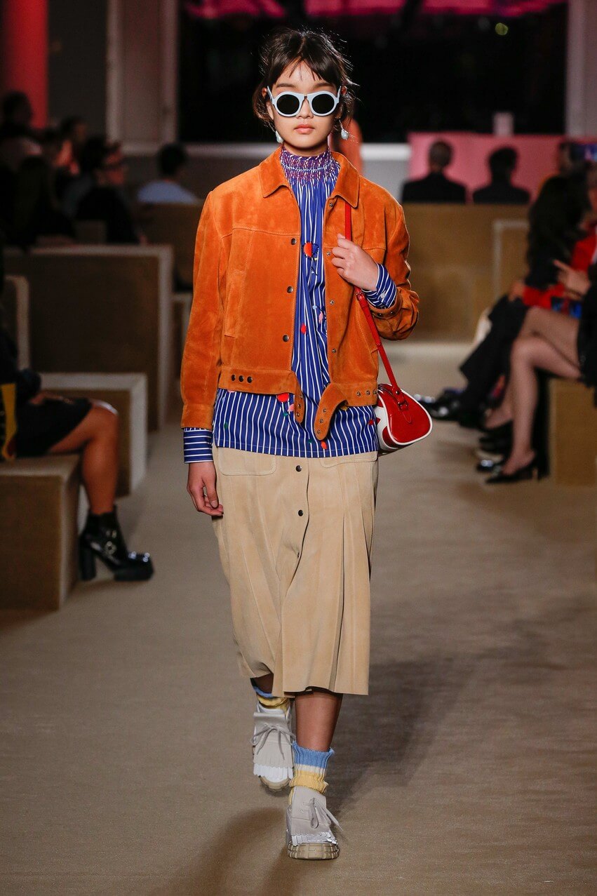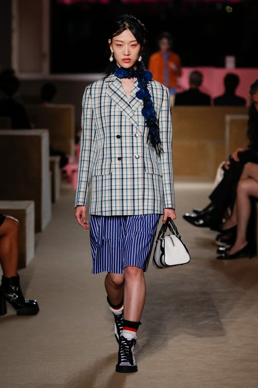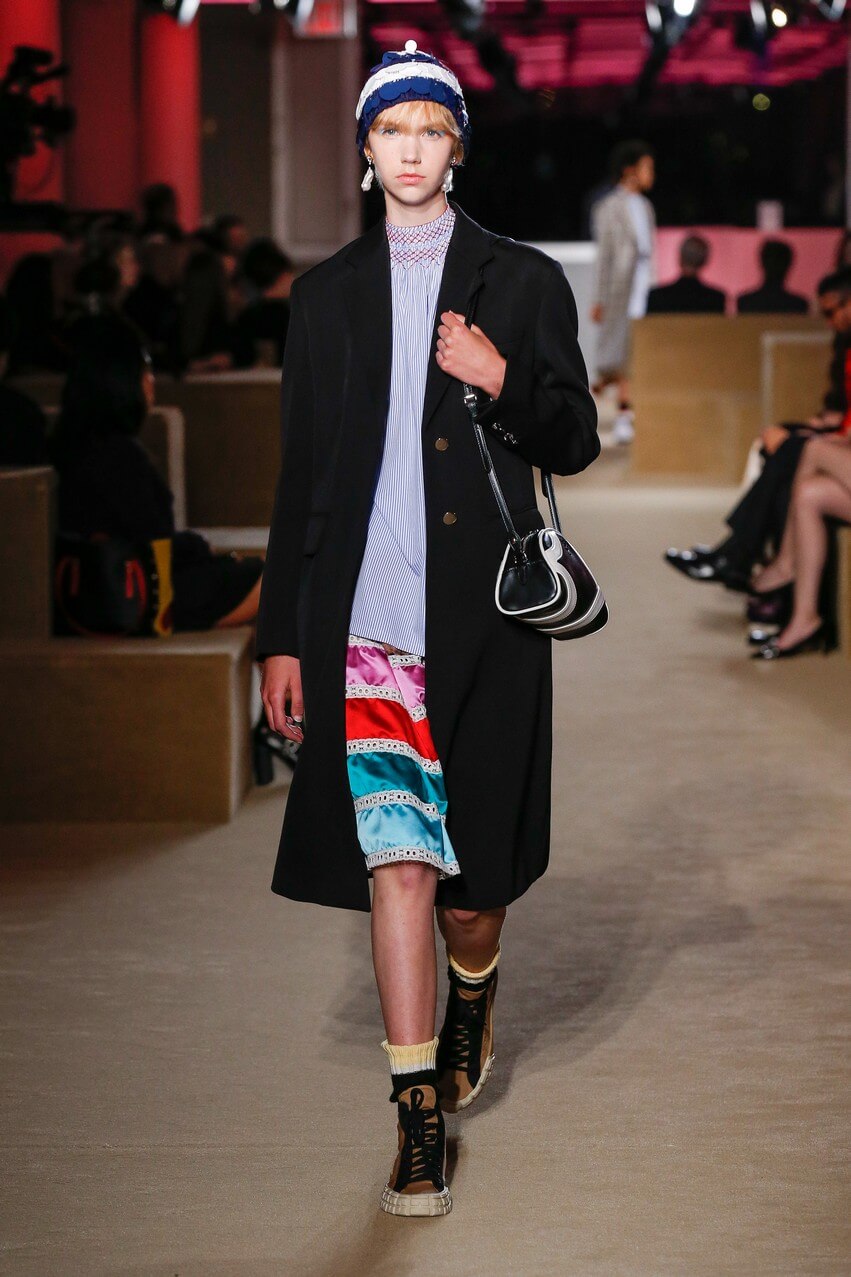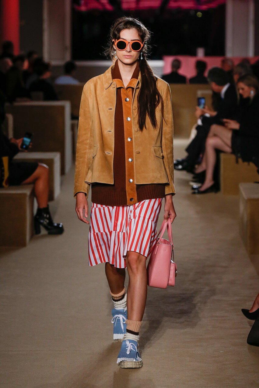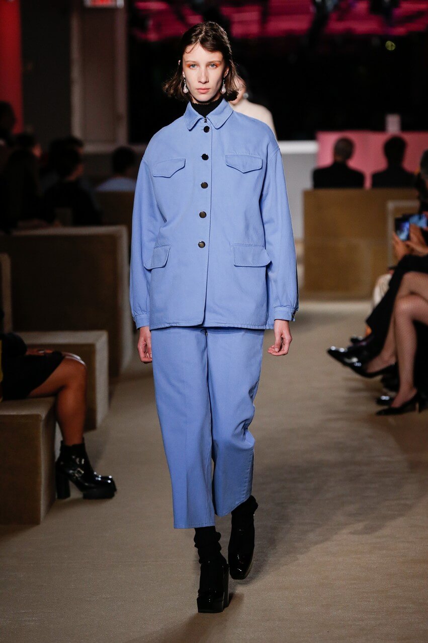 Нарушив собственные традиции, дизайнер представила не окрашенную в тёмный гламур коллекцию, которая выглядит просто невероятно мило, иначе и не сказать. Образы девчонок-сорванцов в ботинках и пальто из английской деревни сменялись выходами настоящих английских роз — Миучче Праде удалось объединить сахарную пастораль с элегантностью: так, нежно-голубое пальто в розах соседствует в коллекции с рубашками Тома Сойера и вариациями костюмов принца Уэльского — дошло даже до макинтоша в клетку. Аппликации из кожаных цветов, удлинённые платья из плиссированного трикотажа и спортивные джемперы крупной вязки, как в 20-х, — коллекция получилась интересной и разнообразной, а каждую вещь хочется рассматривать от и до.