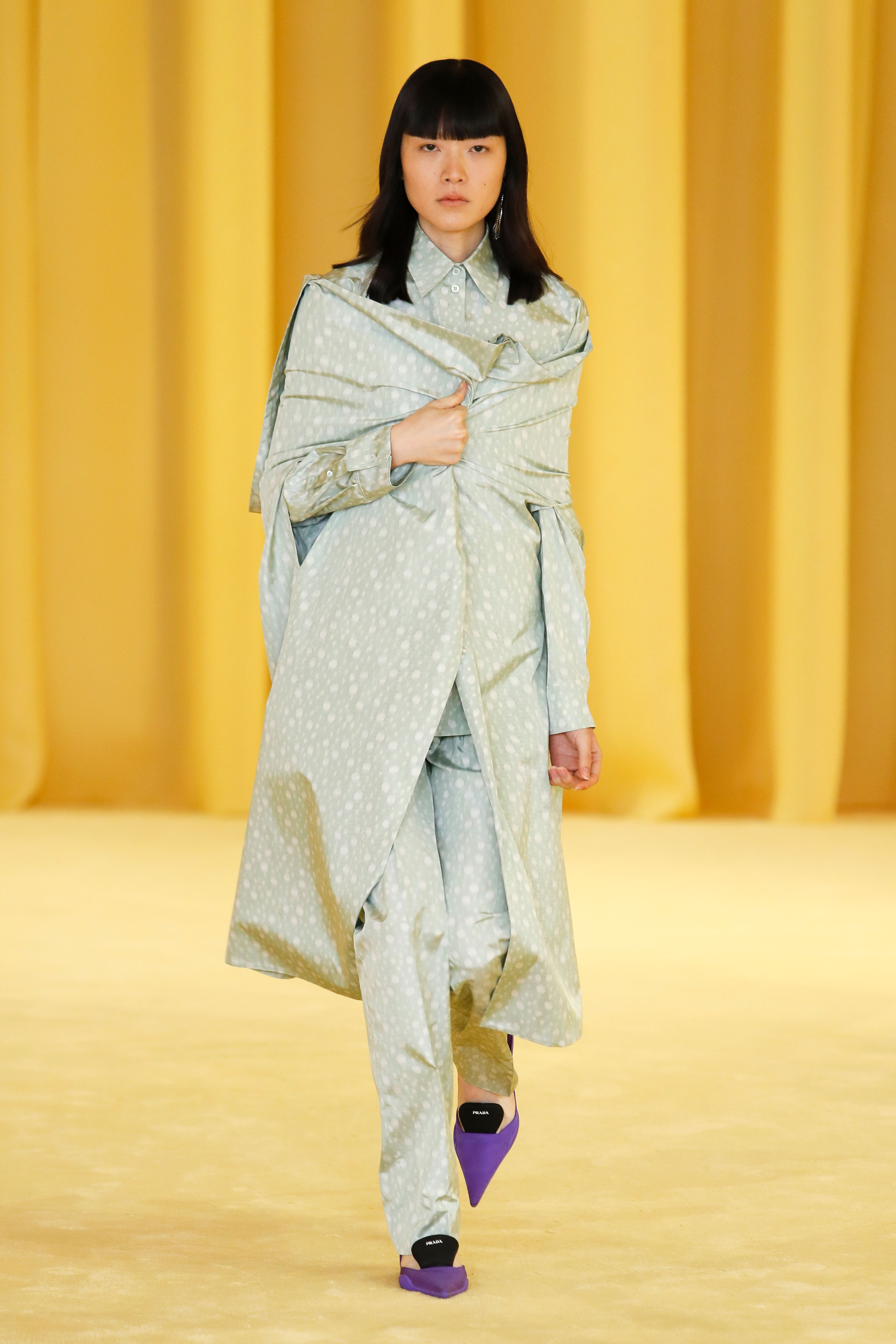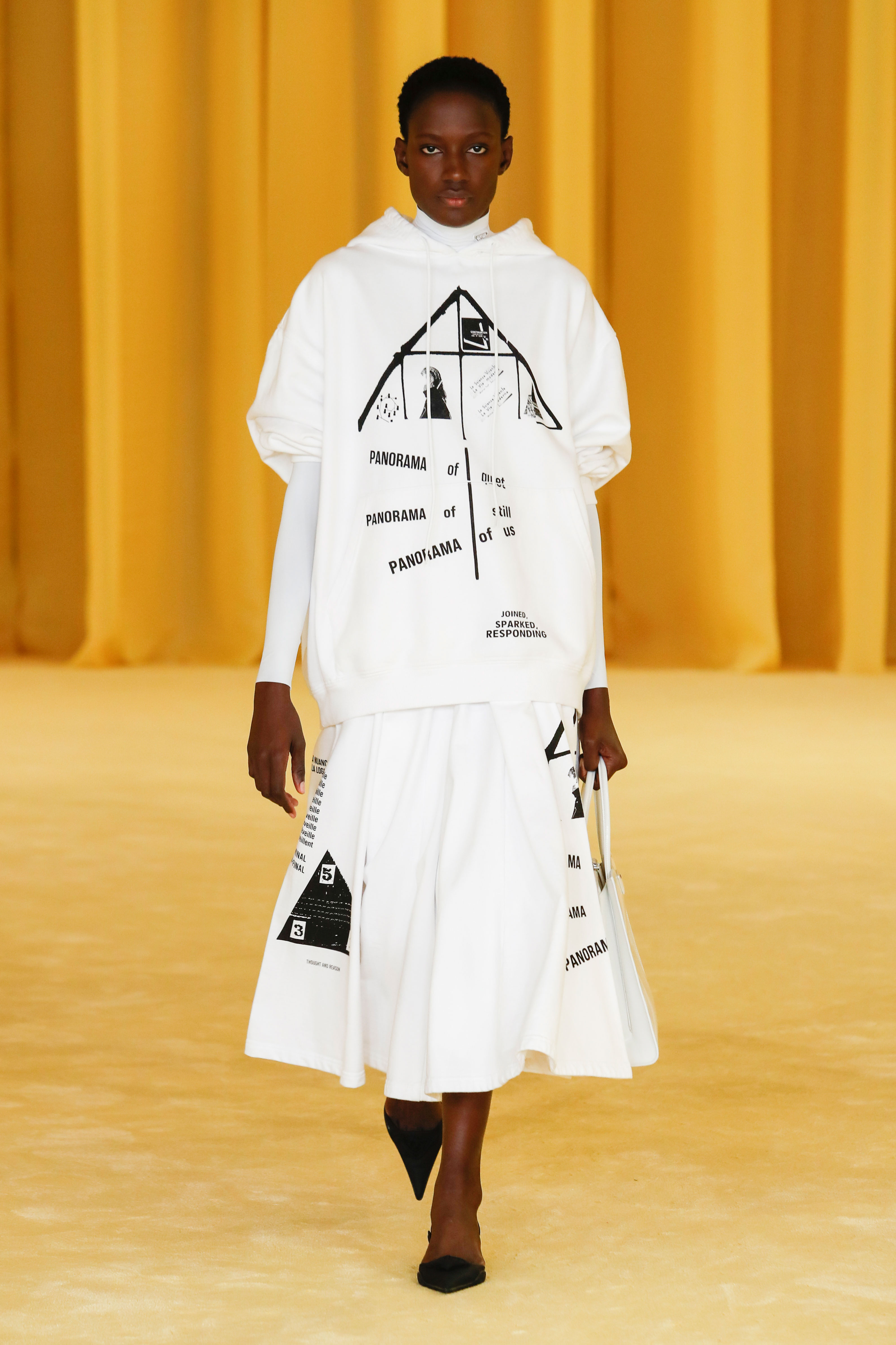 В коллекции был использован архивный принт Prada, напоминающий вырезки из постмодерных газет и символизирующий встречу миров и эстетических дискурсов, — его напечатали на атласных платьях, юбках миди и удобных анораках.