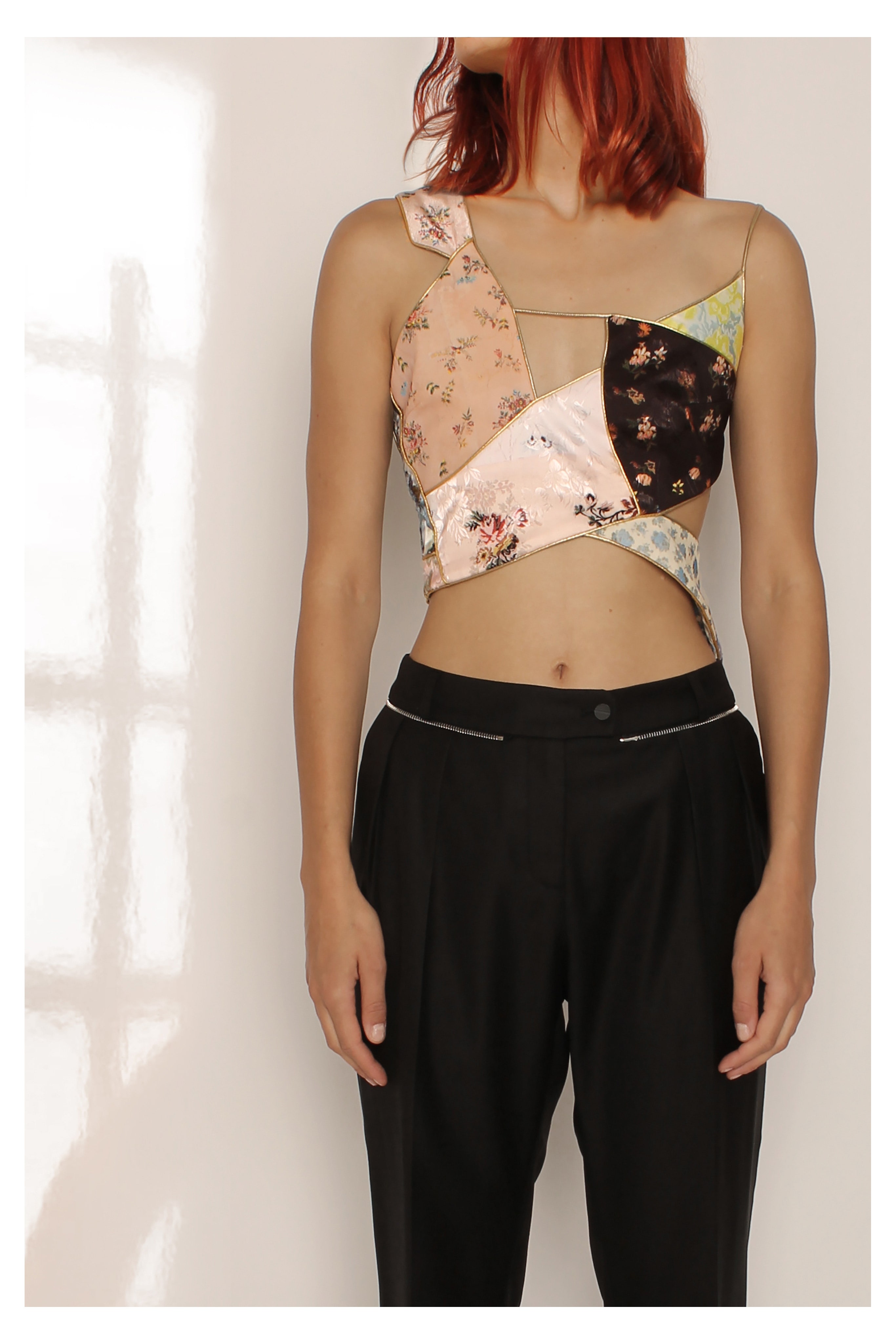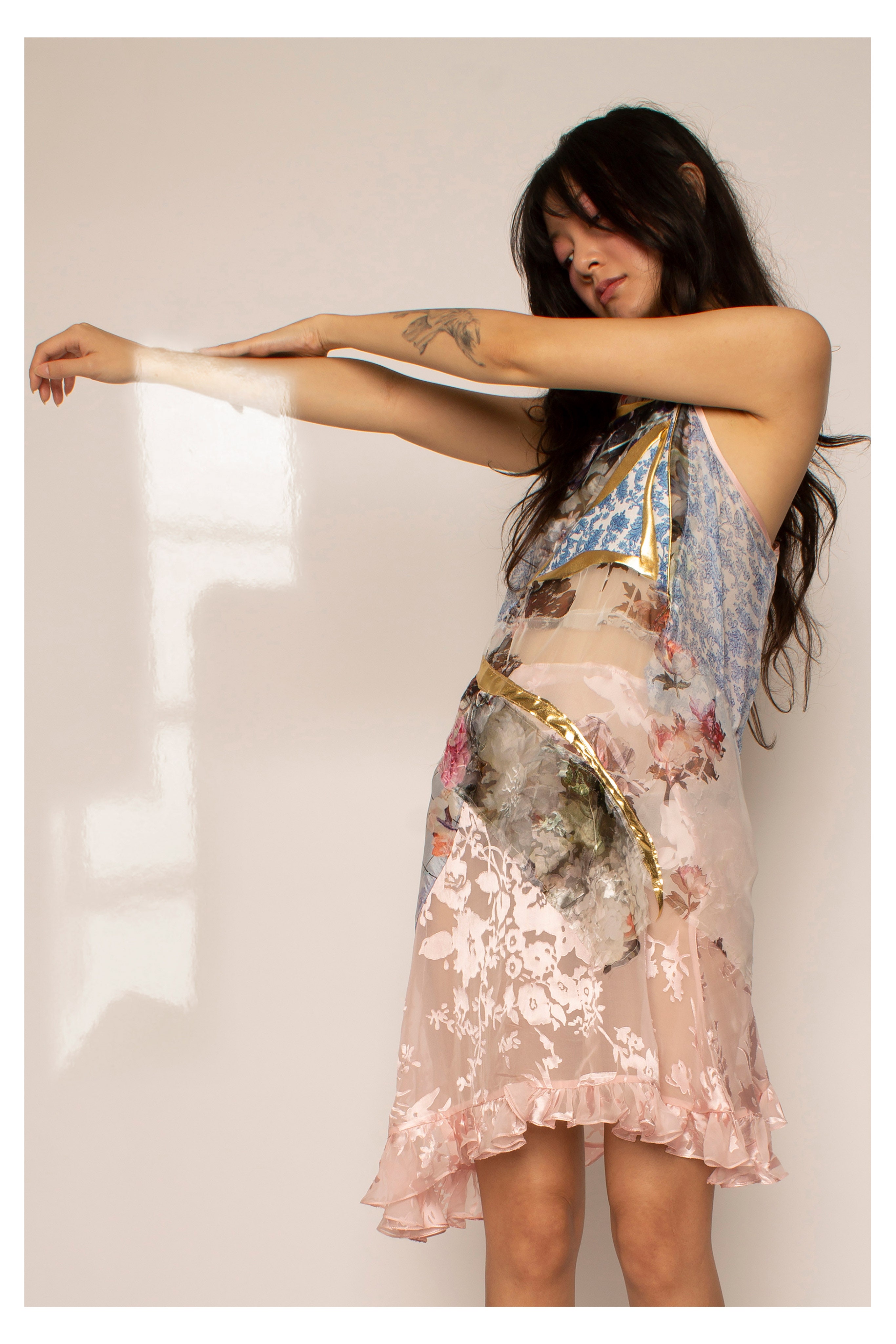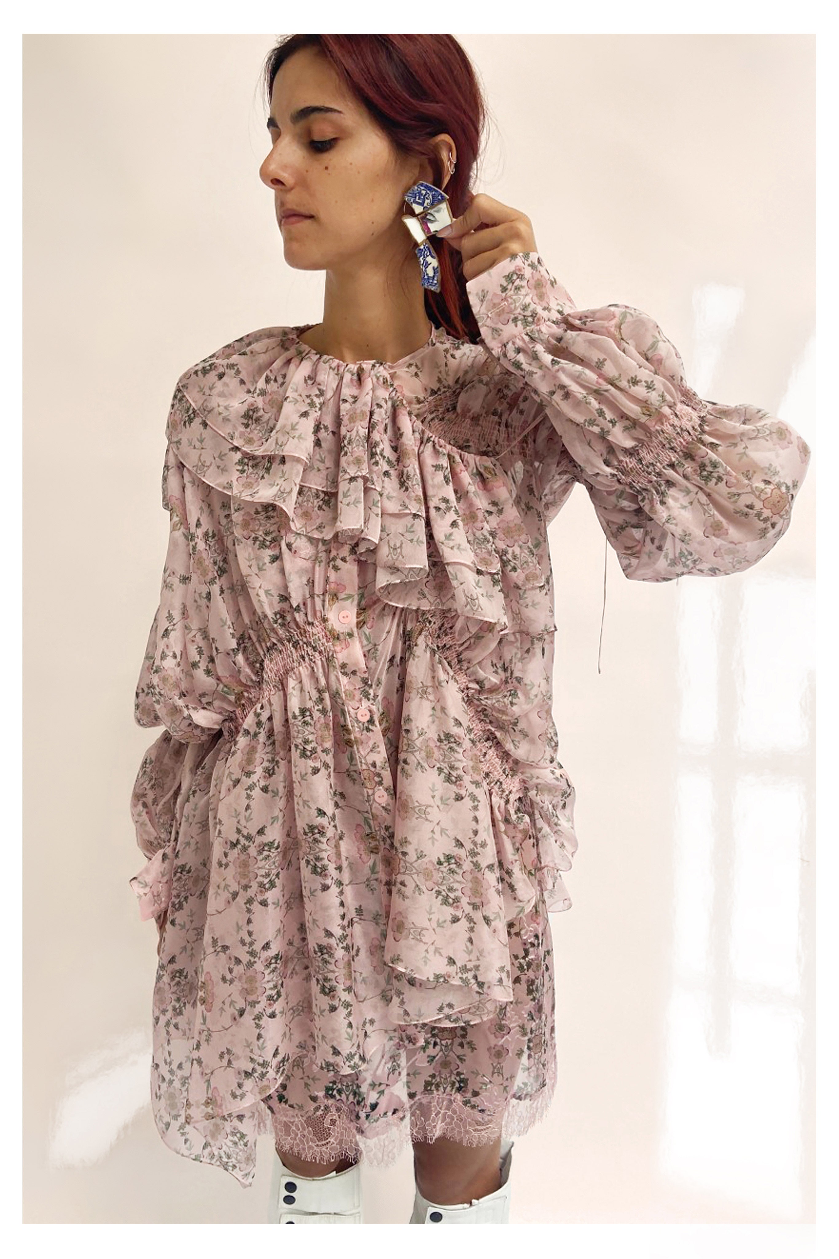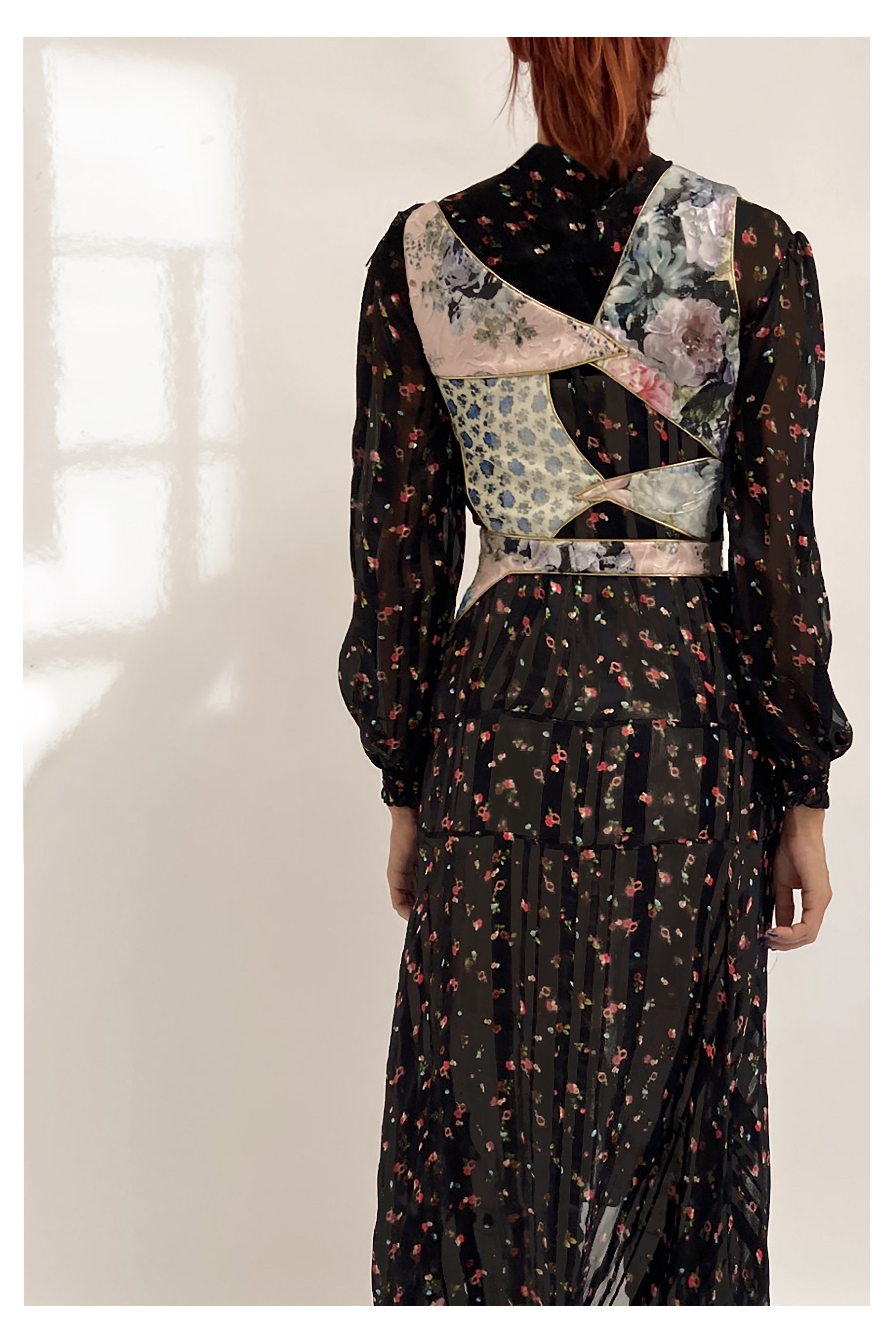 Так и сама коллекция получилась будто созданной из кусочков самых разных предметов и материалов. На работу с техникой пэчворк Джастина вдохновила работа художника Буке Де Фриза – кувшин с осколками фарфора. Поиски вдохновения привели дизайнеров к японской реставраторской технике кинцуги. Швы на облегающих лоскутных платьях выделены белой и серебряной нитью, уютные оборки и рюши усеяны мелкими цветами, а двухцветные сложные тренчи подвязаны поясами-бантами. Топы в лоскутной технике перемежаются с просторными оверсайз-платьями, а ключевым аксессуаром коллекции стали бандажные жилеты, также сшитые из отрезов тканей.