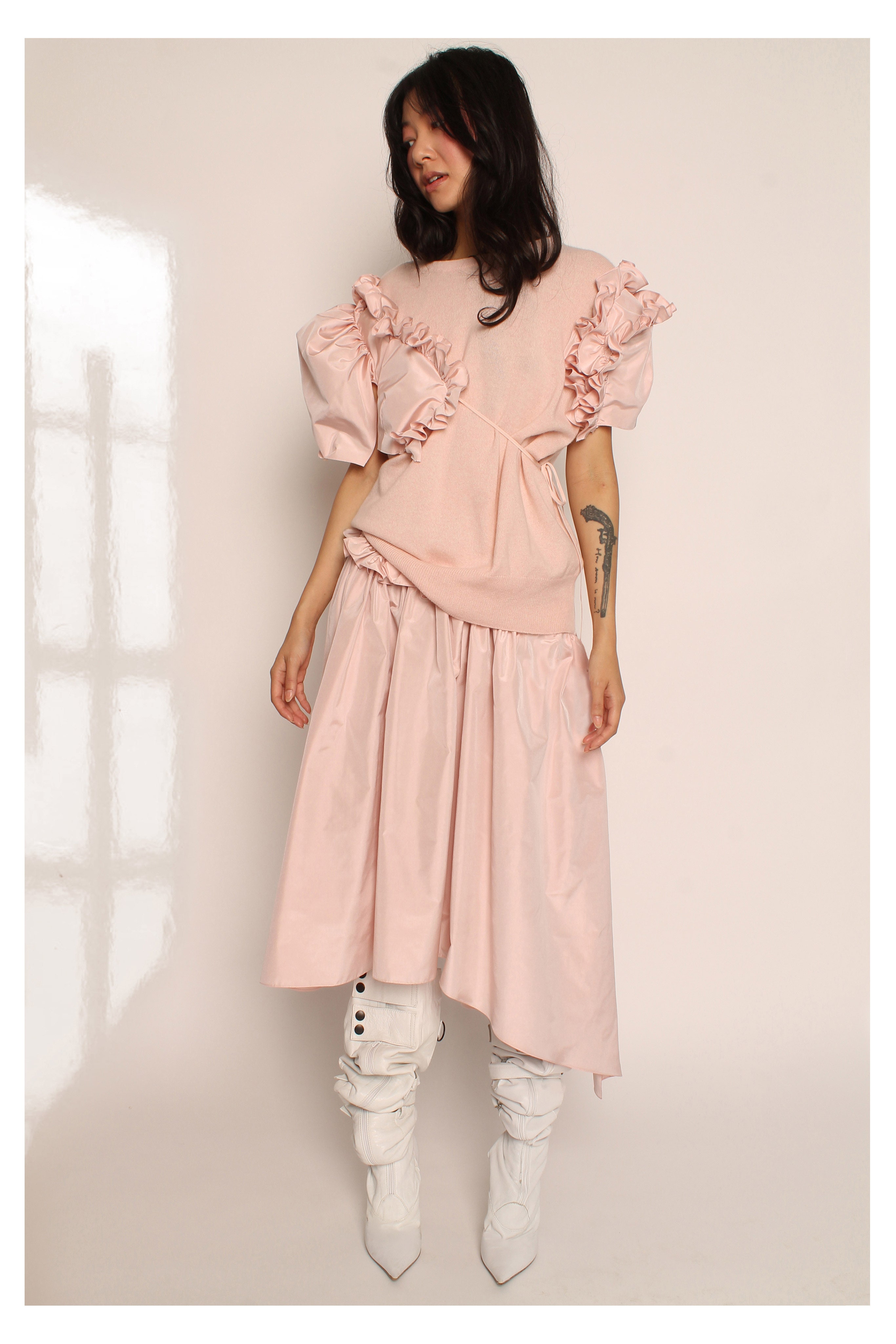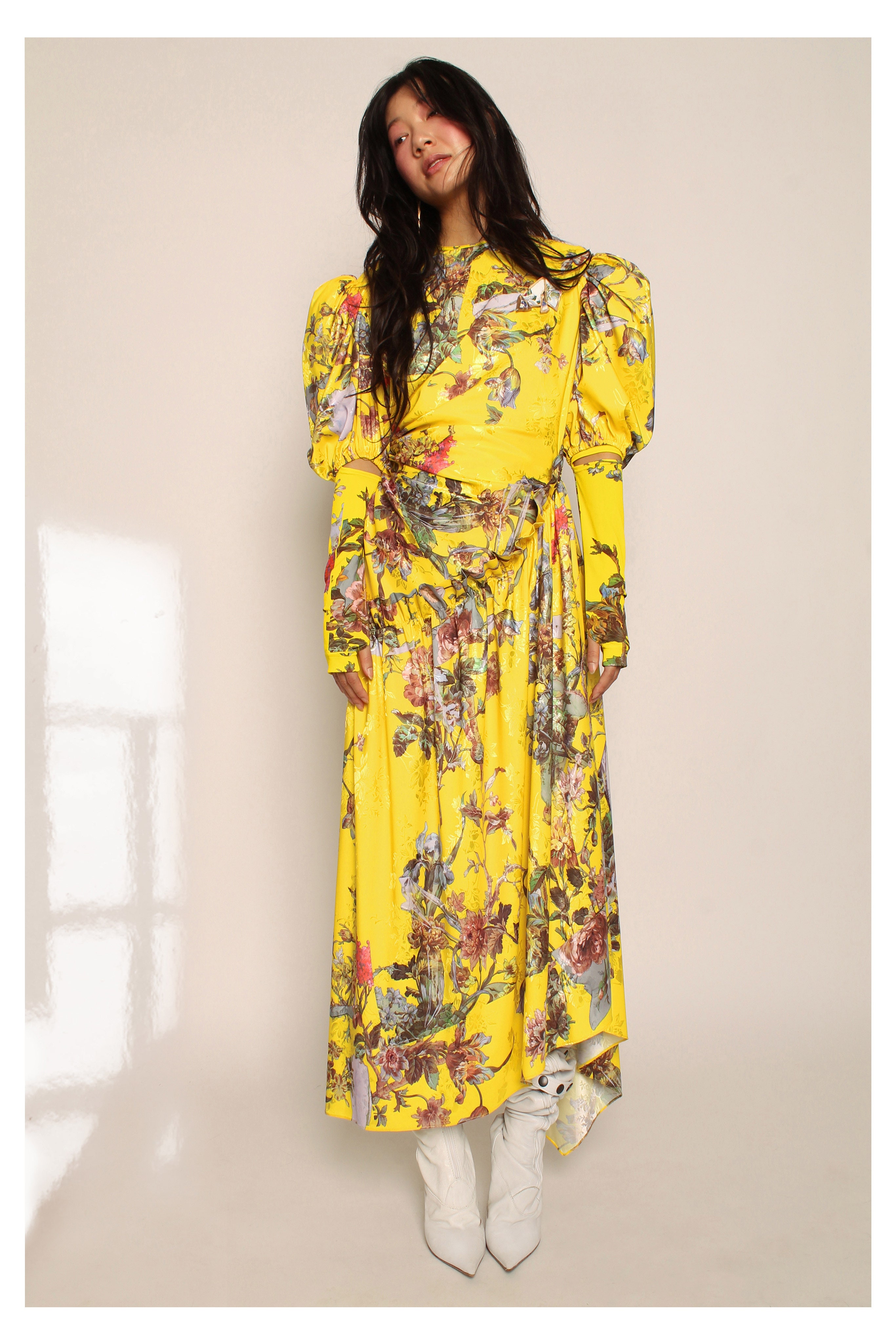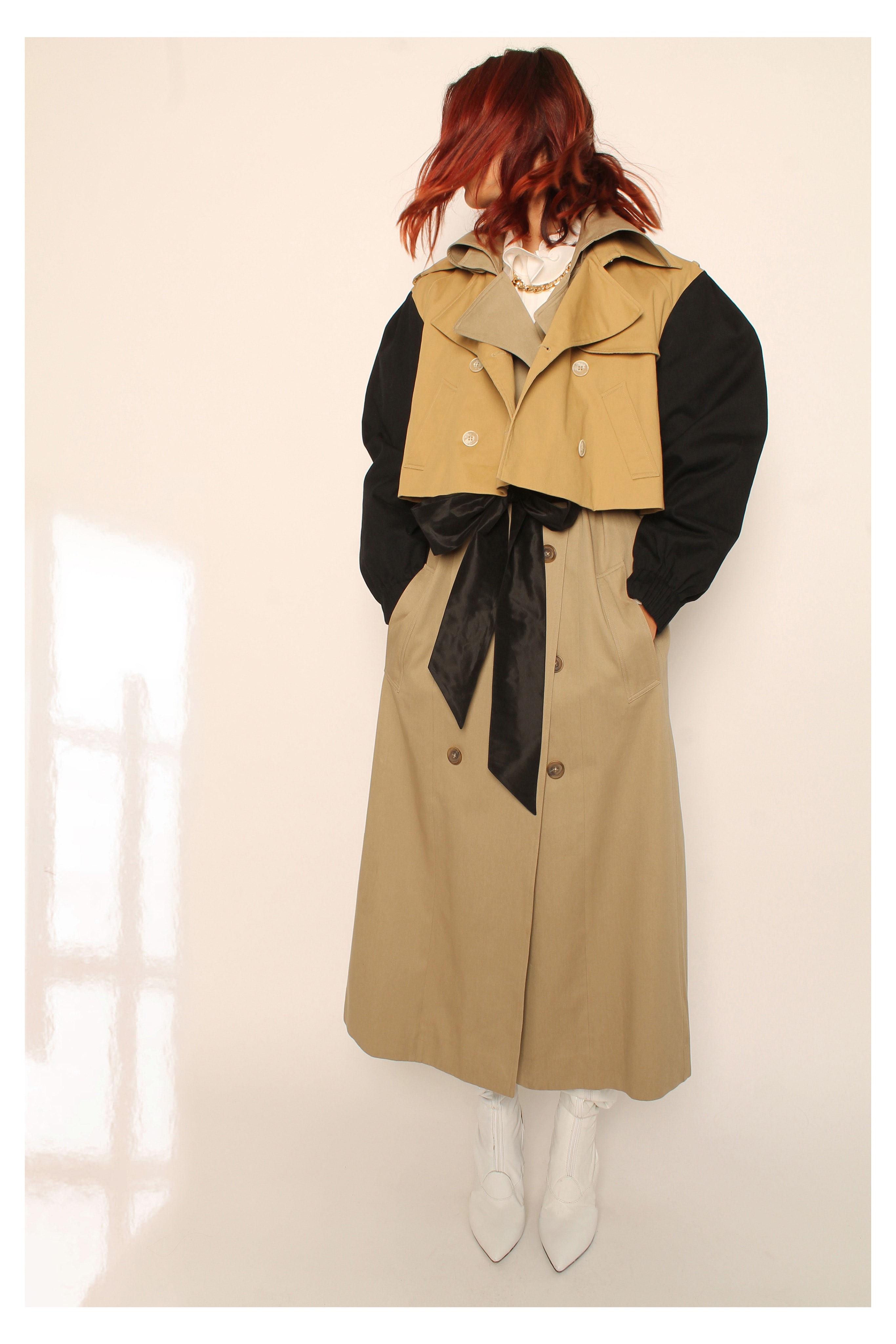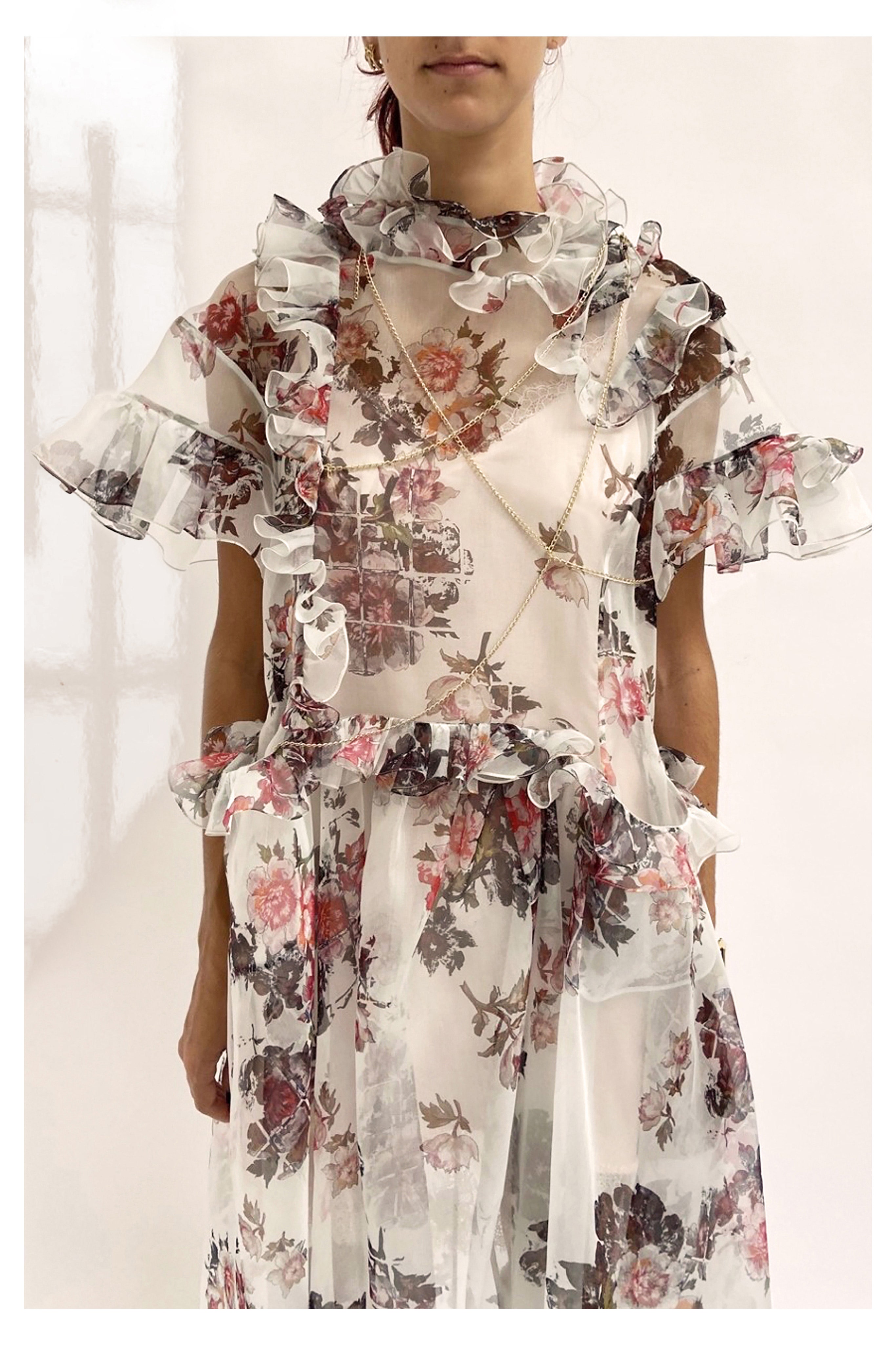 Так и сама коллекция получилась будто созданной из кусочков самых разных предметов и материалов. На работу с техникой пэчворк Джастина вдохновила работа художника Буке Де Фриза – кувшин с осколками фарфора. Поиски вдохновения привели дизайнеров к японской реставраторской технике кинцуги. Швы на облегающих лоскутных платьях выделены белой и серебряной нитью, уютные оборки и рюши усеяны мелкими цветами, а двухцветные сложные тренчи подвязаны поясами-бантами. Топы в лоскутной технике перемежаются с просторными оверсайз-платьями, а ключевым аксессуаром коллекции стали бандажные жилеты, также сшитые из отрезов тканей.