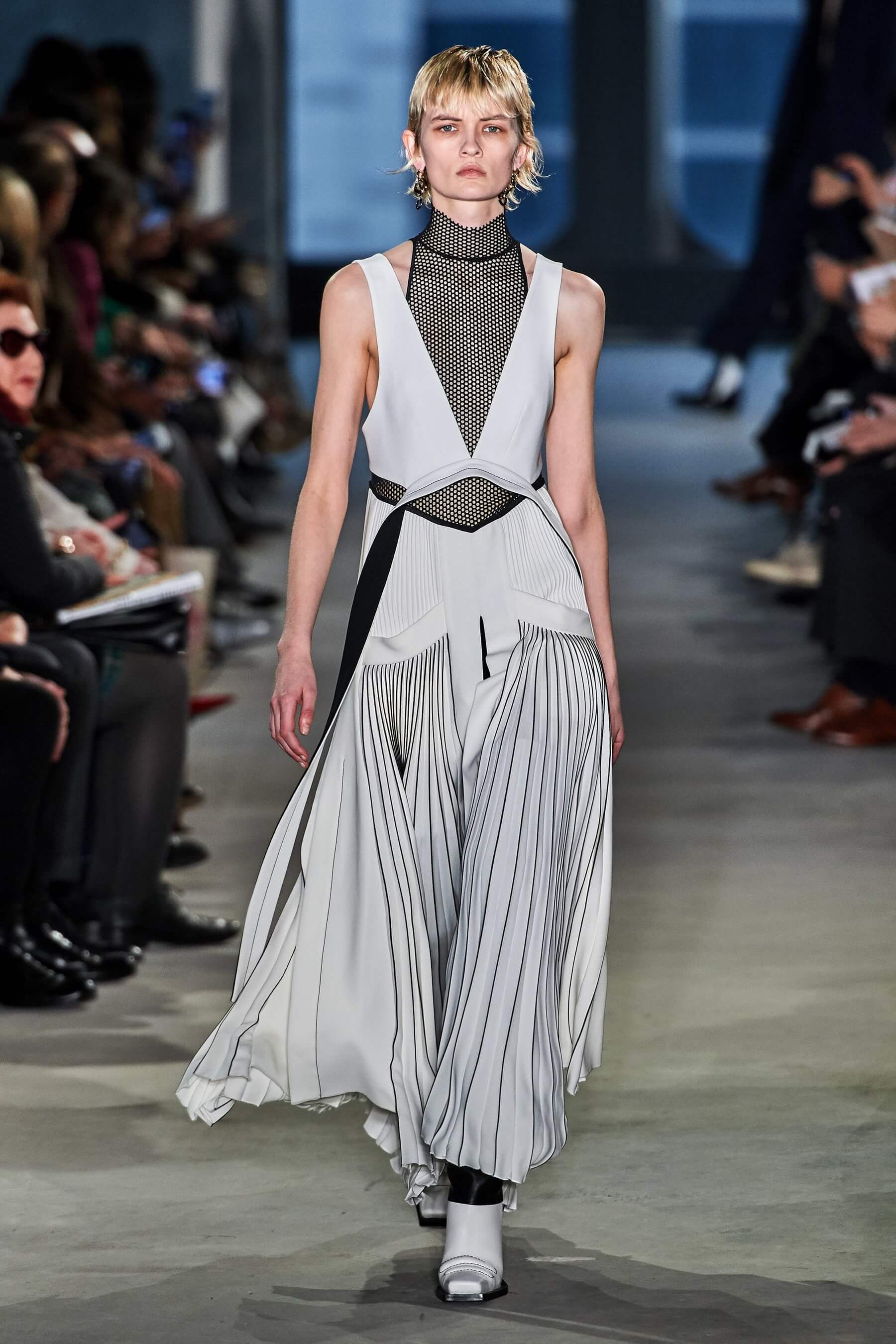 Коронным номером коллекции, как и всегда у Proenza Schouler, стали вещи из трикотажа — на этот раз платья необычной архитектурной вязки и сложных конструкций. Также дизайнеры вдохновлялись нарядами модника принца Уэльского, позаимствовав из его имиджа объёмные oversize-макинтоши, которые стали полупрозрачными или с полочками из выбеленного денима или вовсе превратились в деконструированные наряды, с лацканами, выкроенными в качестве шарфов. Также модели появлялись в лаконичных платьях, стянутых на талии, с кожаными ремнями на плечах, закрепленными бронзовыми пряжками, наподобие креплений плащей римских легионеров, трикотажных платьях с вырезами вместо пройм, струящихся костюмах в духе деловых 80-х. Дополняла образы гротескная, но уместная обувь — блестящие туфли с квадратными носками.