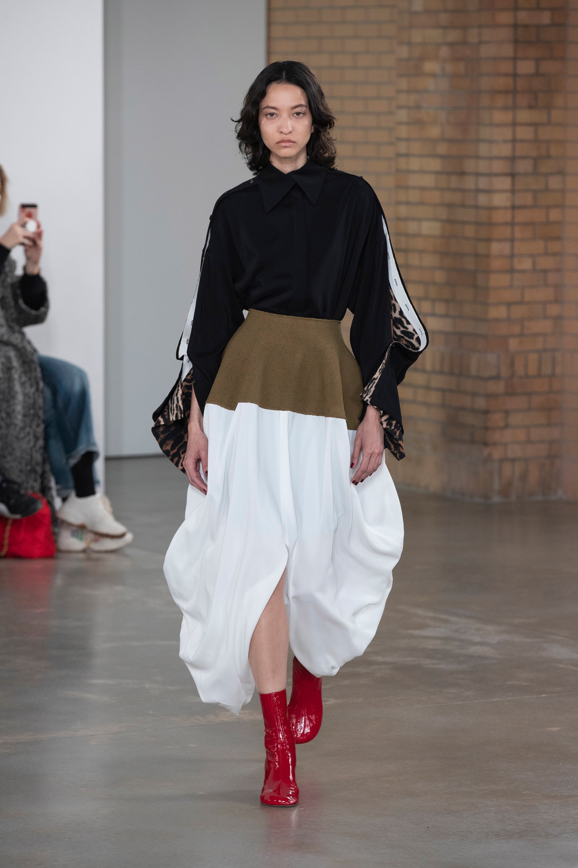 Плечистые брючные костюмы из новой коллекции скроены силуэтно, с акцентом на талии или дополнены монолитными трикотажными корсетами. Куртки и пальто также оказались деконструированными таким образом, чтобы усилить заданный силуэт "песочных часов". Белоснежные, почти офисные блузы чередуются с яркими лонгсливами и дополнены пышными юбками-баллонами — такие же имеют и трикотажные платья, сшитые из двух видов материалов. Джек Маккалоу и Лазаро Эрнандес снова обратились к корсетным силуэтам Proenza Schouler, придав им ещё более "хитрый" и технологичный вид, — так, благодаря крою, все, кроме платья, держались на моделях без помощи бретелей. Оммаж моде 18 столетия подчеркнул и квинтет скрипачей, выступивший во время шоу. Перед началом шоу гости получили распечатанный рассказ писательницы Отессы Мошфаг под названием "Куда мы пойдём дальше?". И это действительно важный вопрос для всей модной индустрии и мира.
