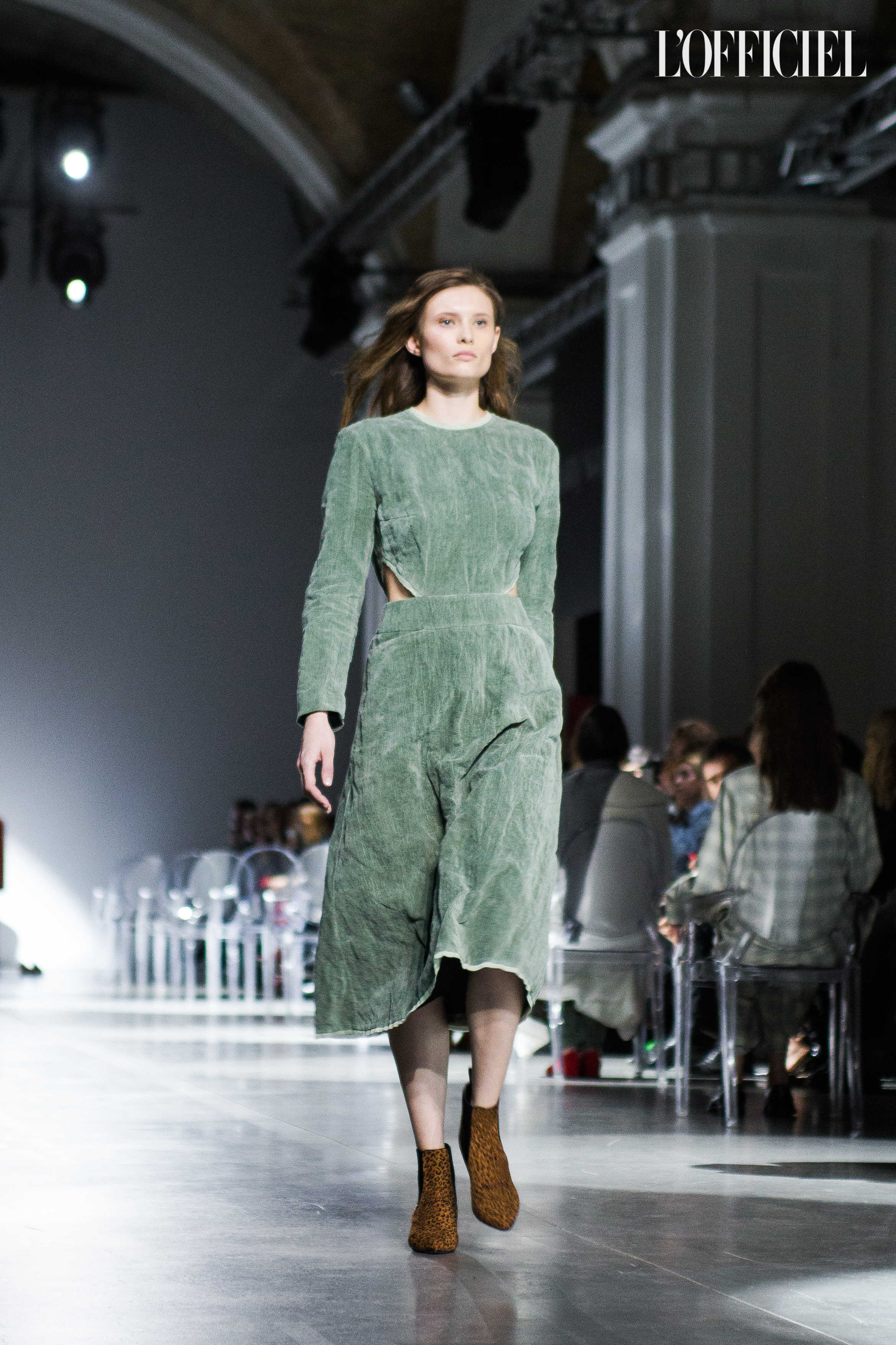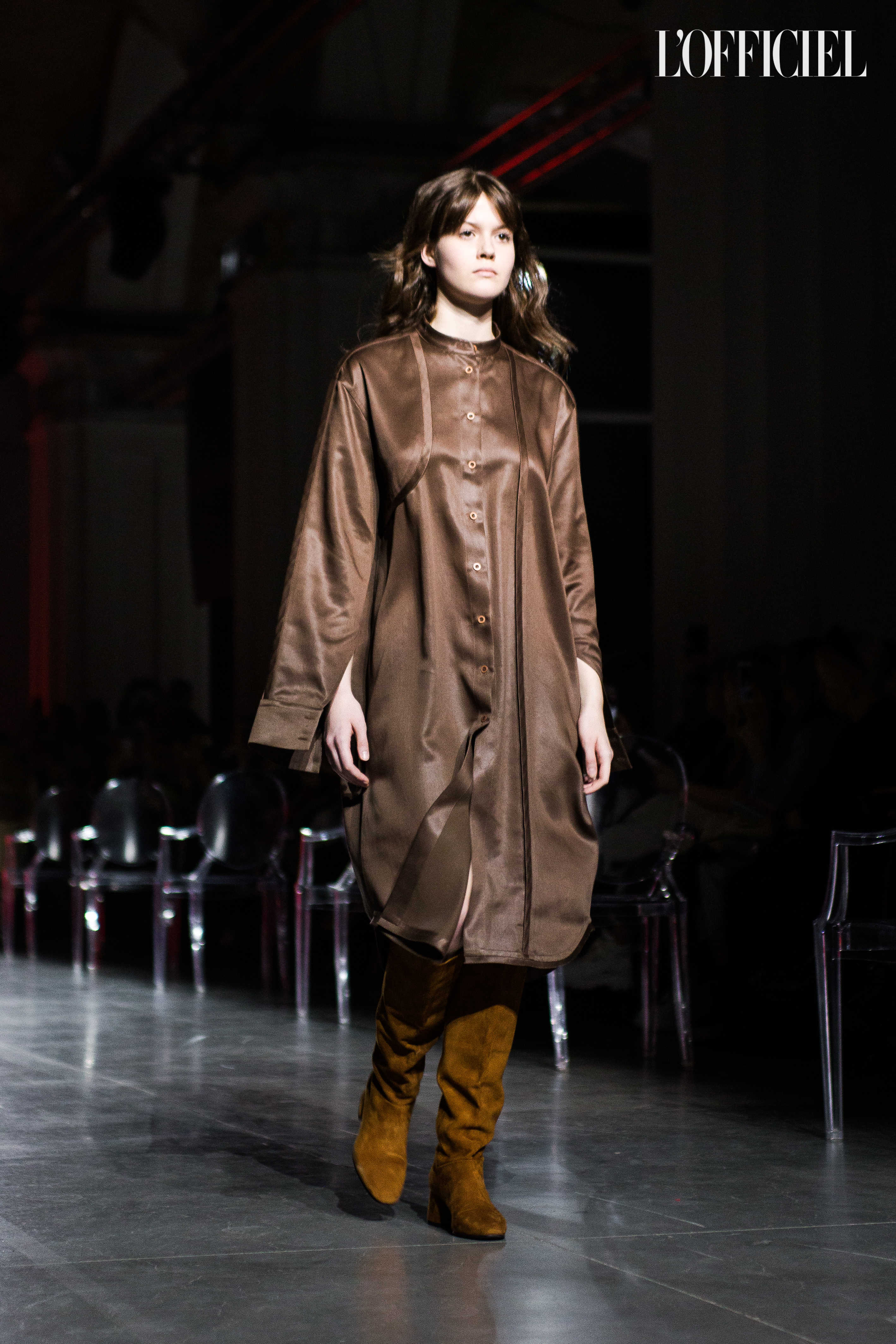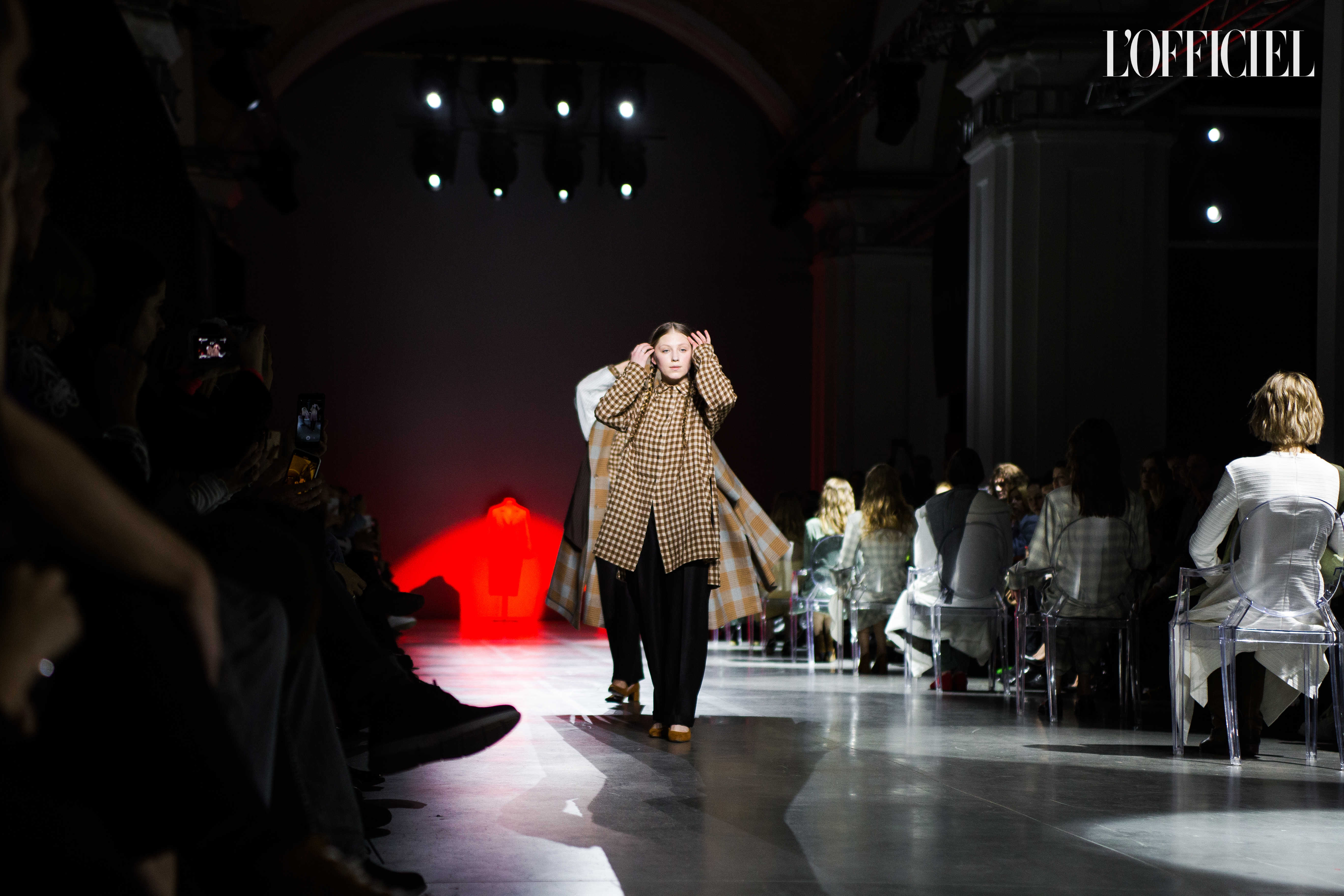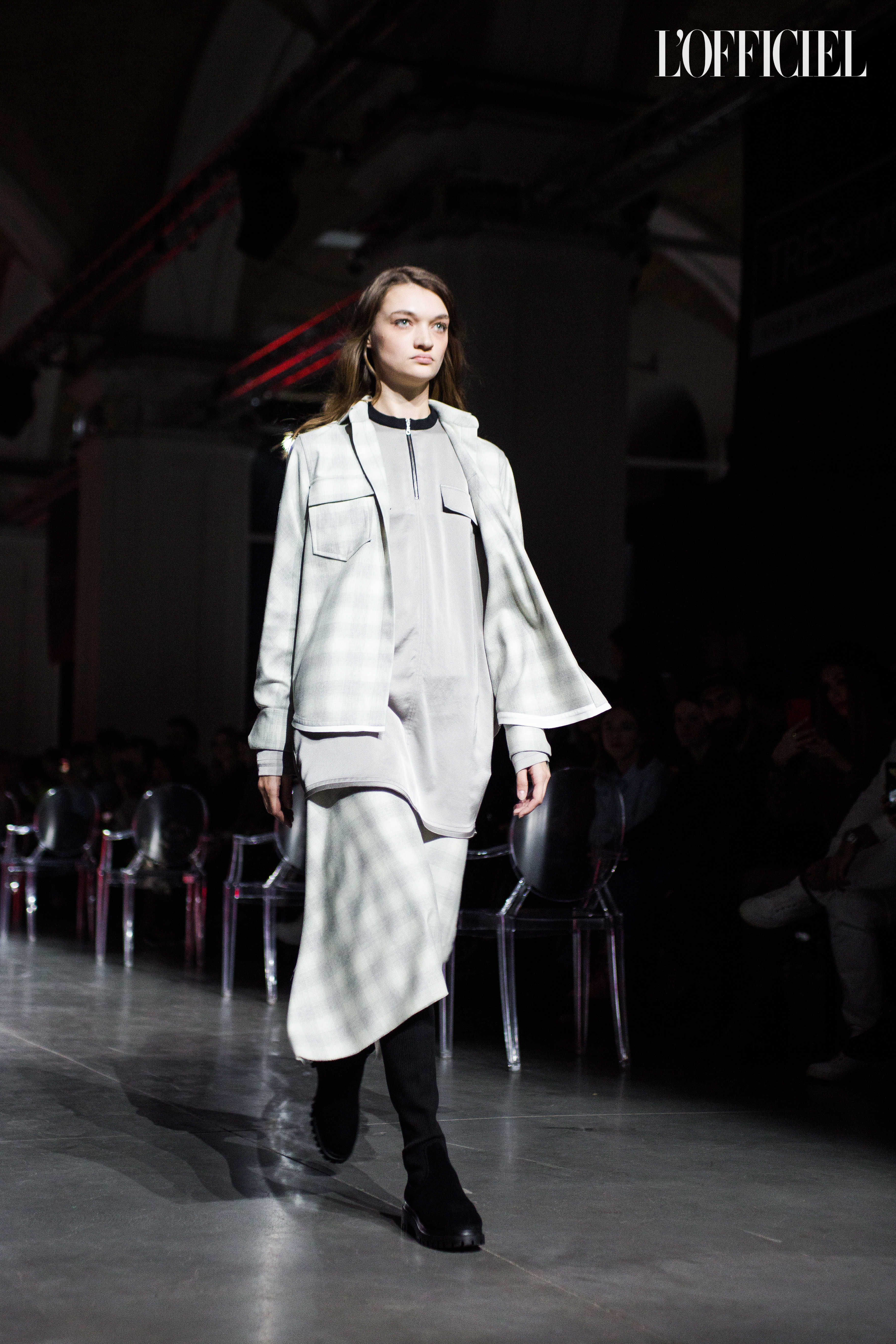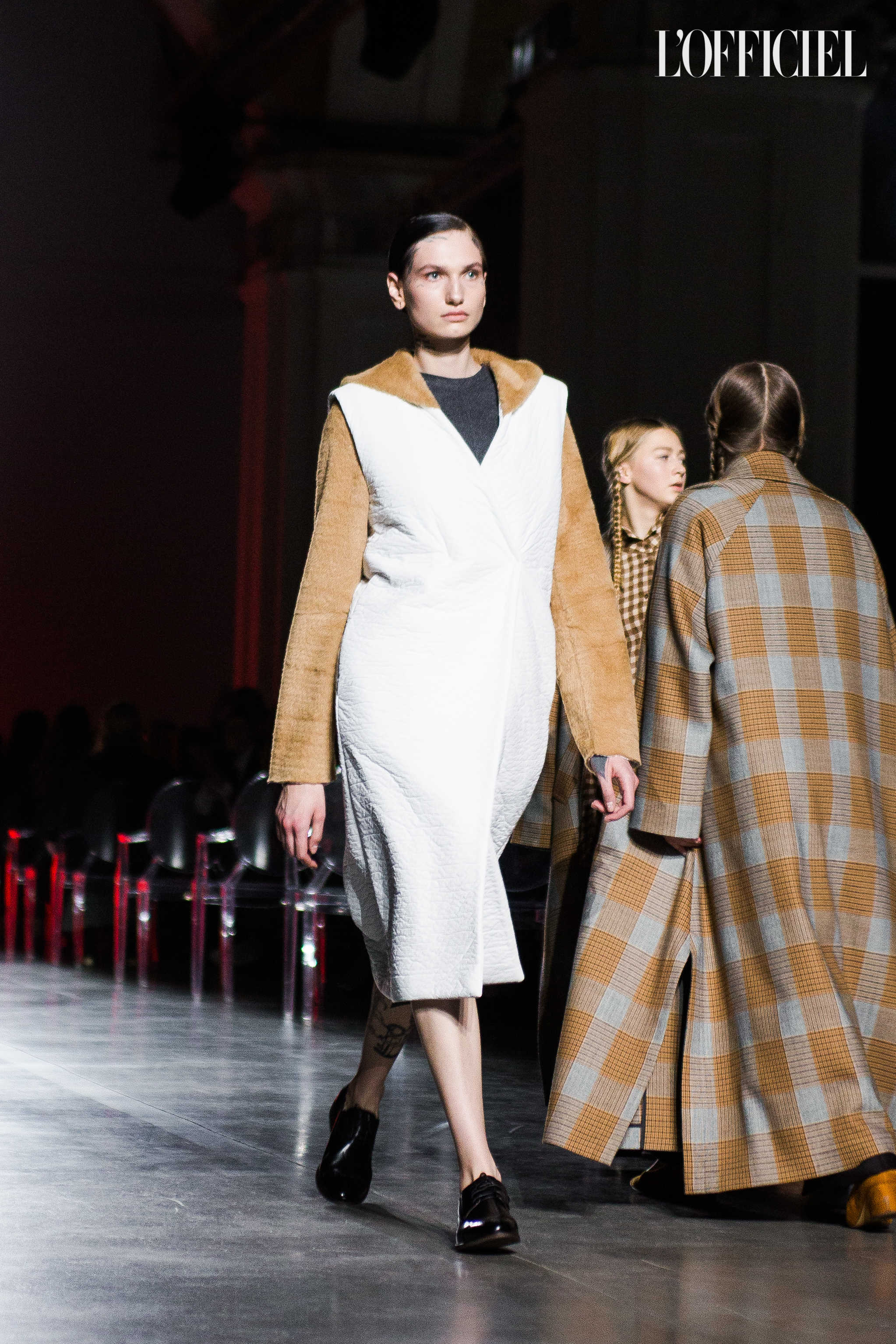 Показ прошёл в форме балетно-театрального перформанса, в основу которого легла идея поиска себя, своего места в мире и необходимости принимать важные решения на пути к цели. Нередко в этом деле мы сталкиваемся с внутренними конфликтами и страхом зайти в своих исканиях дальше, чем это позволено установленными в уме рамками, - а устанавливаем мы их сами. Модели совершали прогулку по подиуму в платьях и юбках из жатого бархата, клетчатых пальто и оверсайз-жакетах и садились на расставленные вдоль подиума стулья, совсем рядом с гостями. В это время две балерины с озорными косичками в мягких платьях-рубашках, будто балуясь, бегали по подиуму, танцевали и по-детски трогательно усаживались на стулья вместо моделей, нарочито ёрзая при этом - совсем как наши беспокойные умы. Это был дуэт Nosisters - Дарина Самойлова и Виктория Соловьева исполнили роли сознания и подсознания.