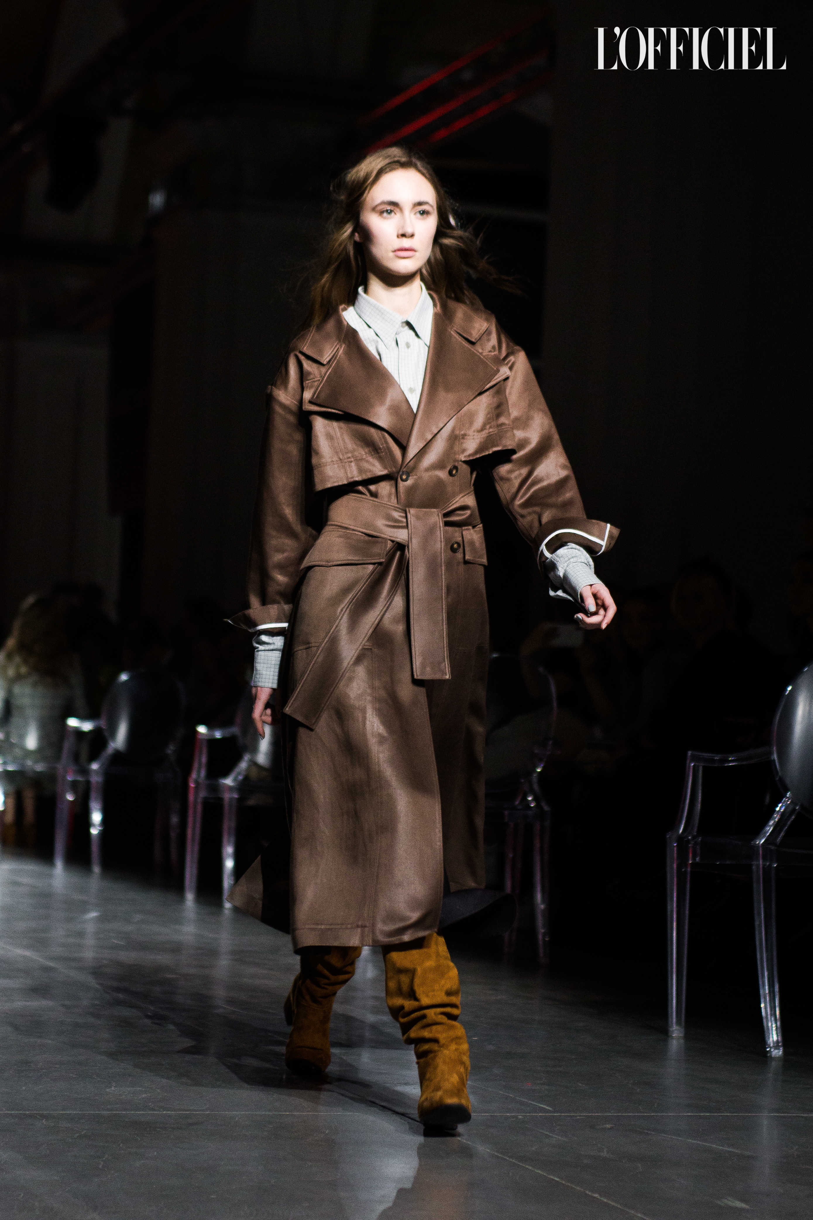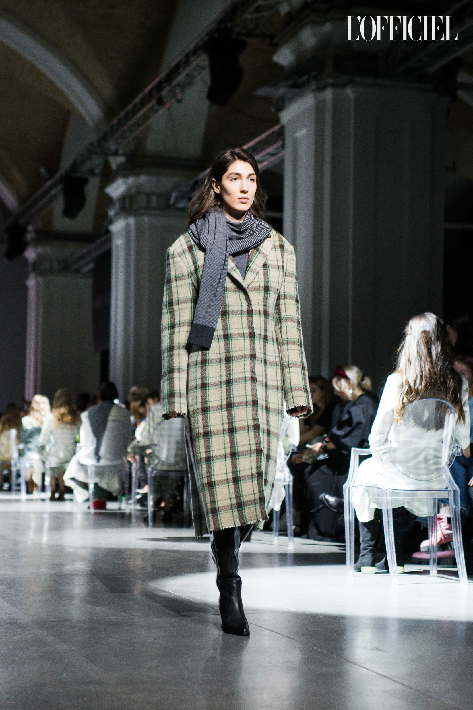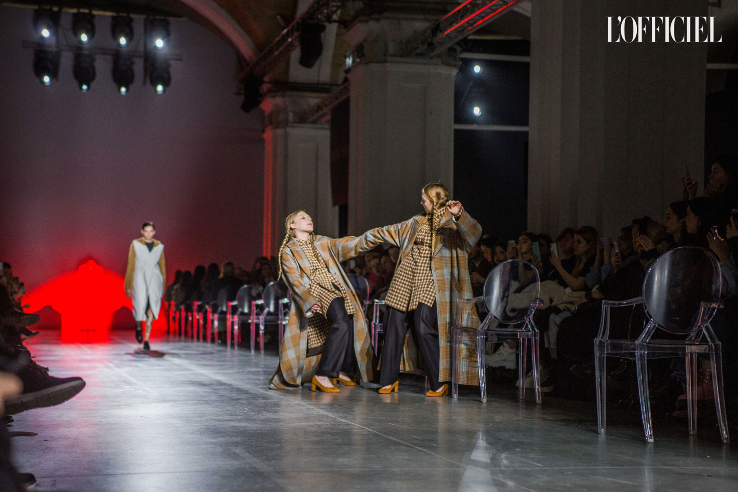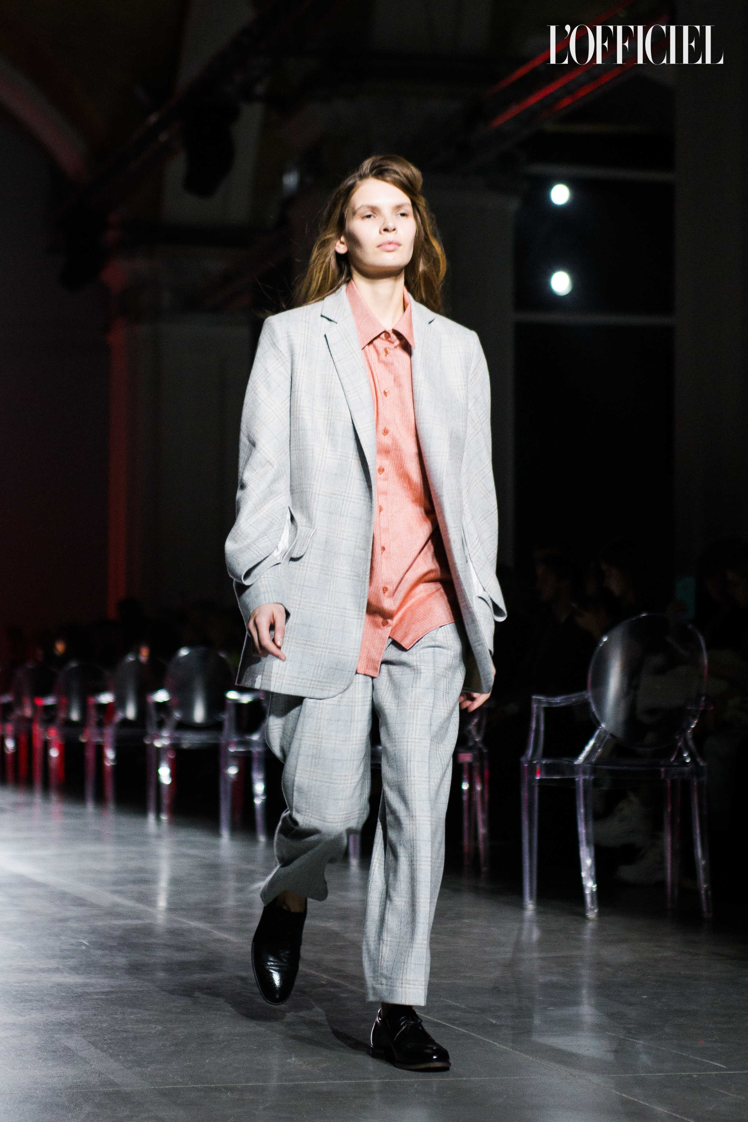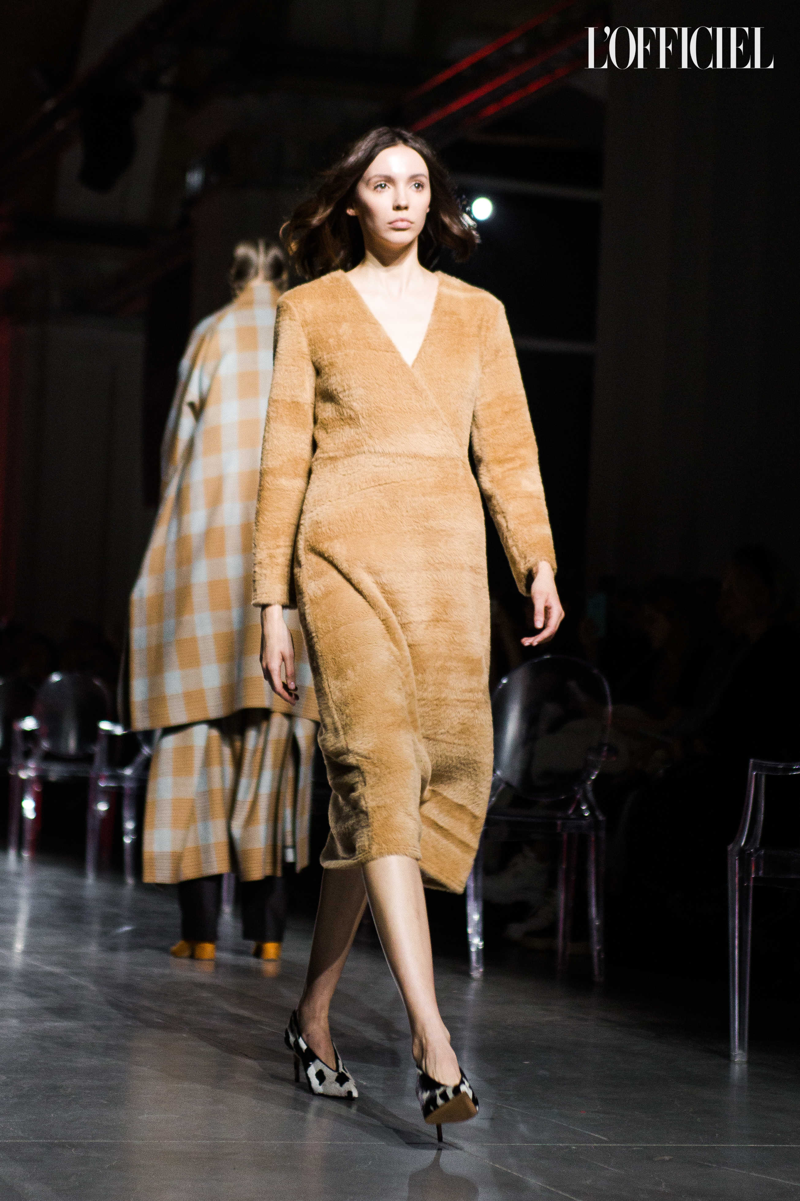 Показ прошёл в форме балетно-театрального перформанса, в основу которого легла идея поиска себя, своего места в мире и необходимости принимать важные решения на пути к цели. Нередко в этом деле мы сталкиваемся с внутренними конфликтами и страхом зайти в своих исканиях дальше, чем это позволено установленными в уме рамками, - а устанавливаем мы их сами. Модели совершали прогулку по подиуму в платьях и юбках из жатого бархата, клетчатых пальто и оверсайз-жакетах и садились на расставленные вдоль подиума стулья, совсем рядом с гостями. В это время две балерины с озорными косичками в мягких платьях-рубашках, будто балуясь, бегали по подиуму, танцевали и по-детски трогательно усаживались на стулья вместо моделей, нарочито ёрзая при этом - совсем как наши беспокойные умы. Это был дуэт Nosisters - Дарина Самойлова и Виктория Соловьева исполнили роли сознания и подсознания.