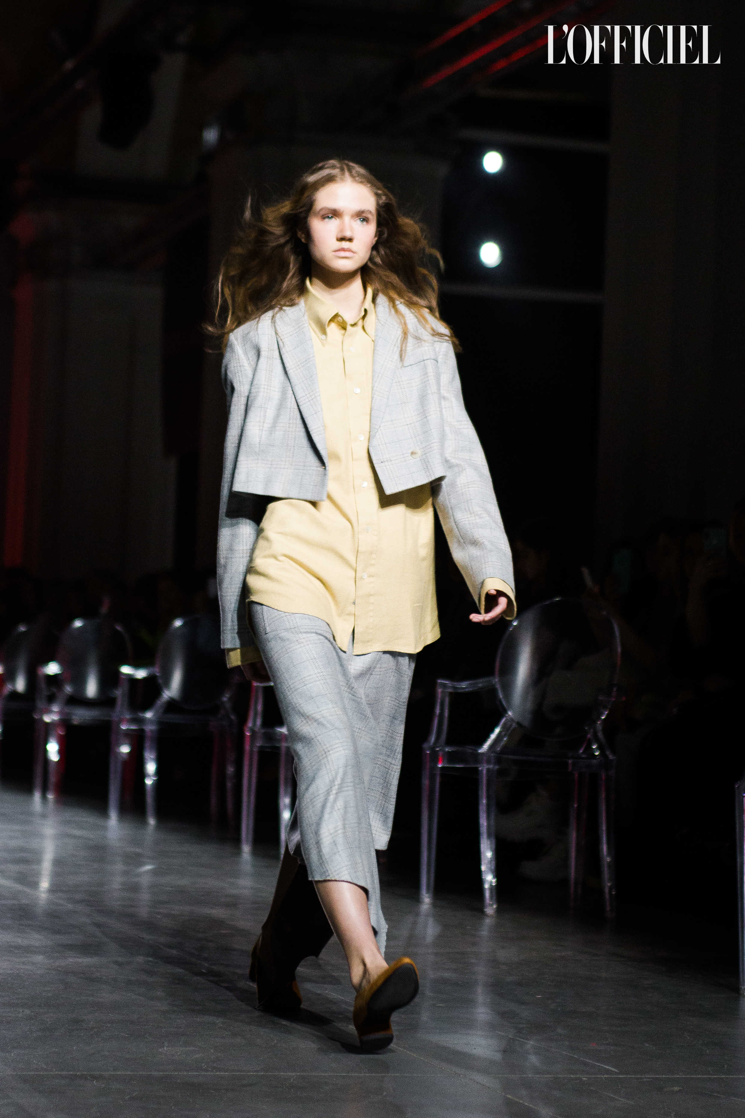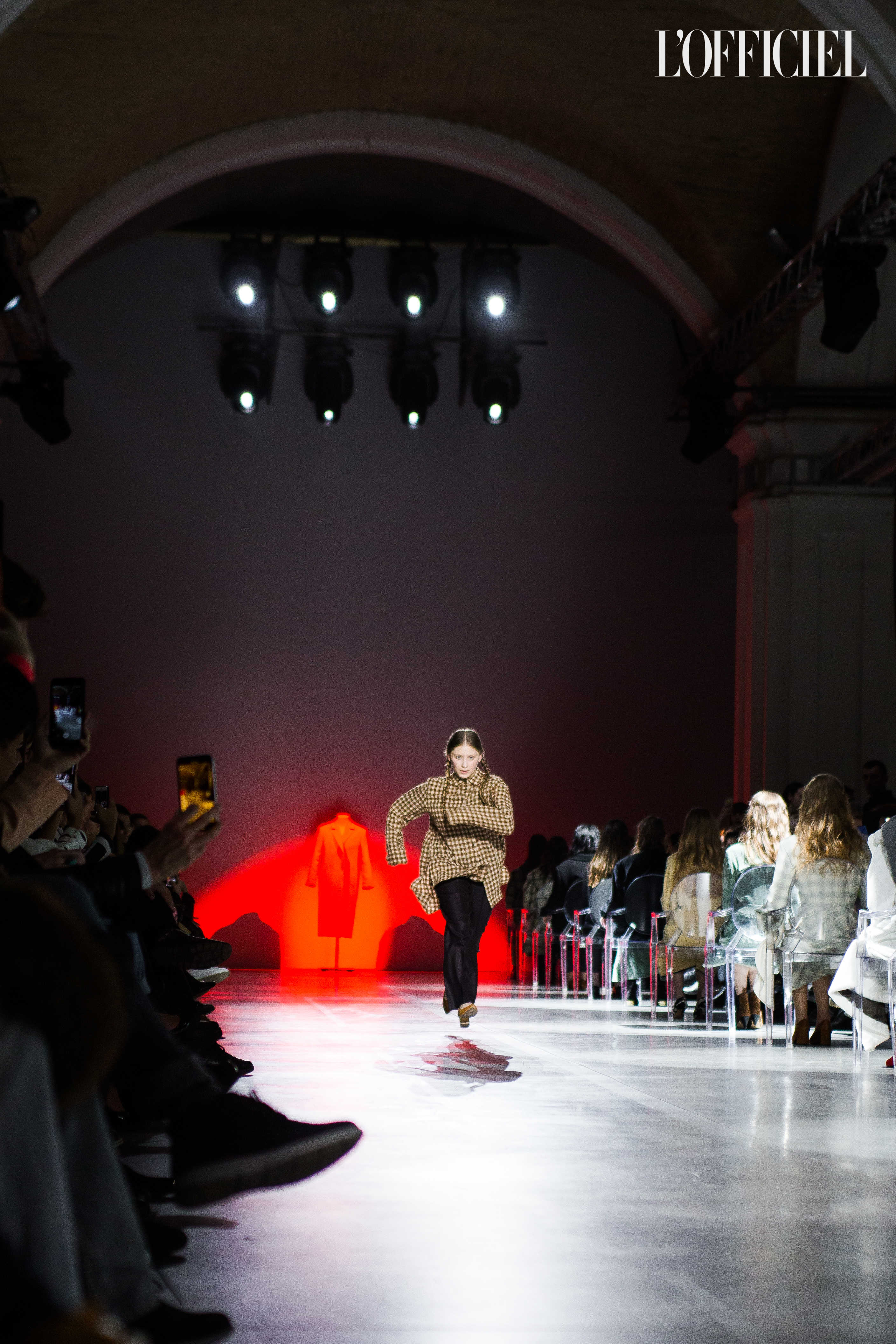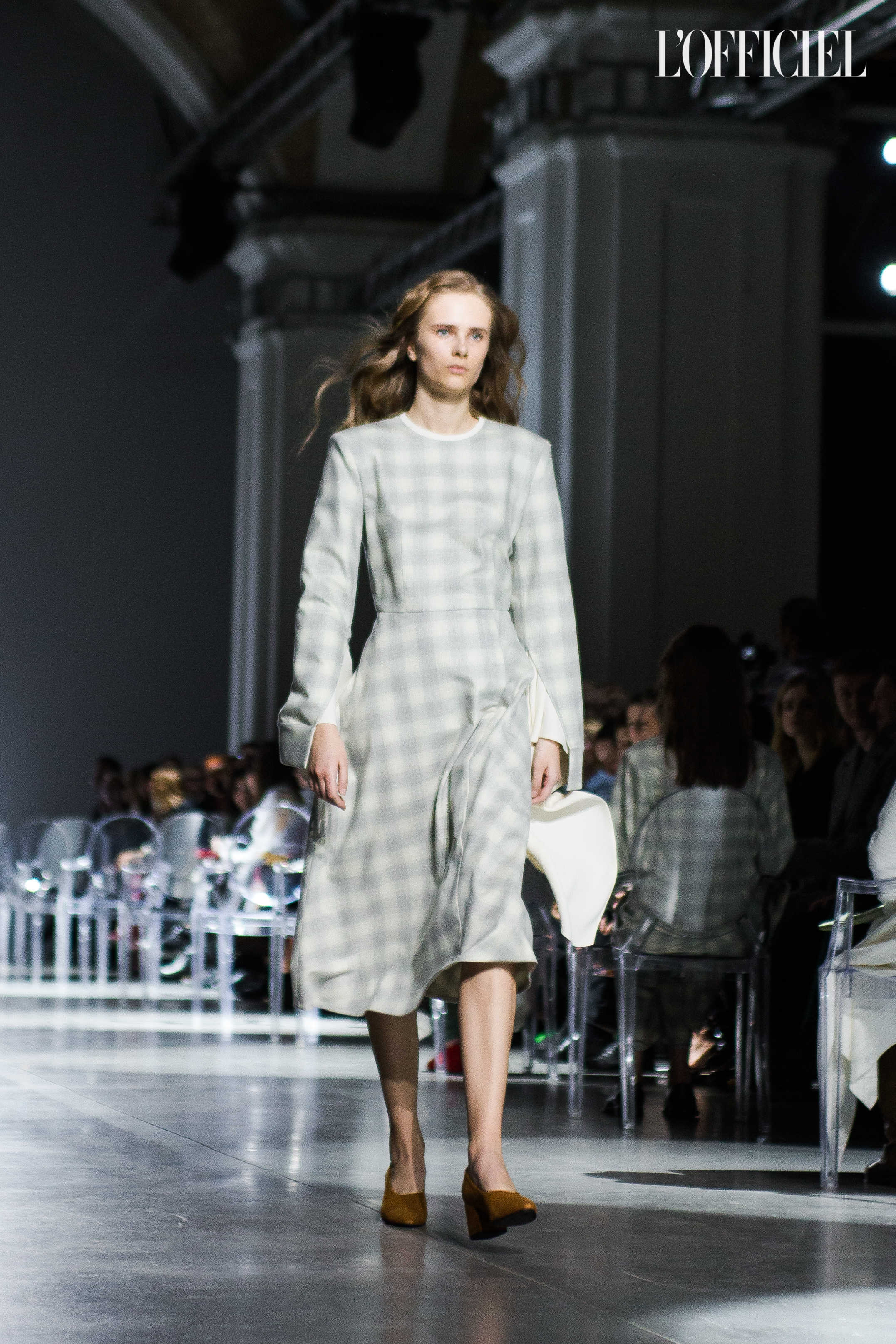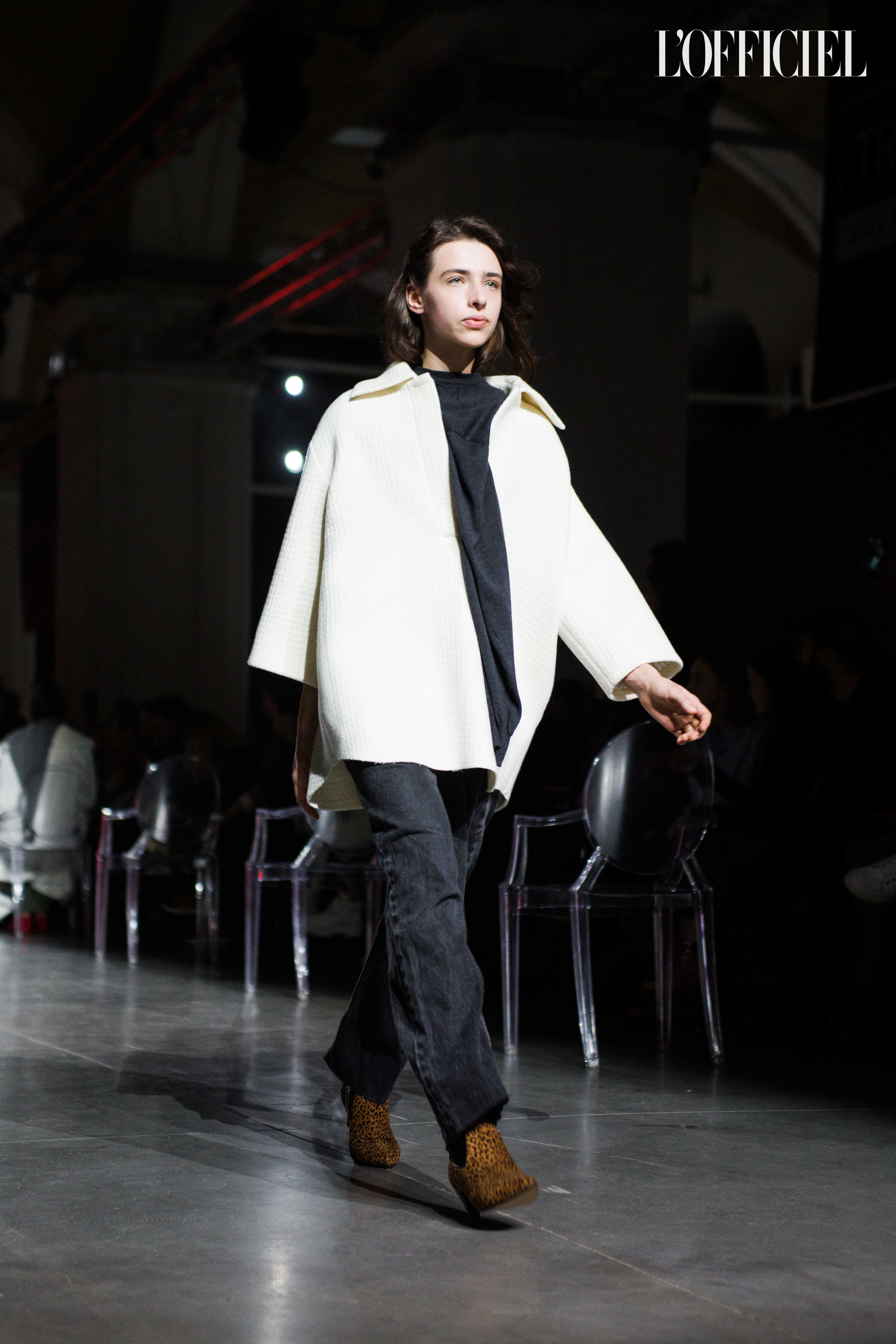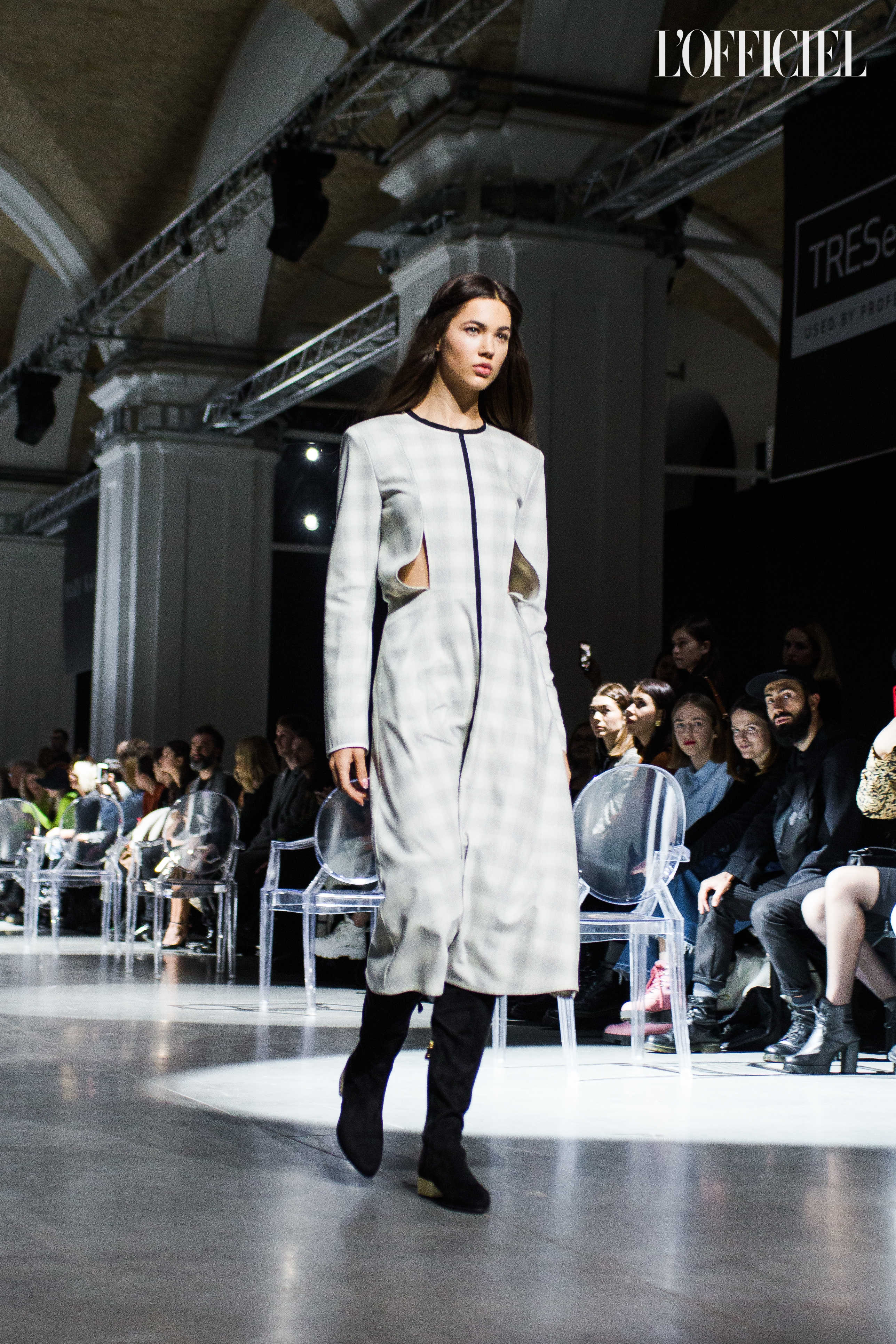 Показ прошёл в форме балетно-театрального перформанса, в основу которого легла идея поиска себя, своего места в мире и необходимости принимать важные решения на пути к цели. Нередко в этом деле мы сталкиваемся с внутренними конфликтами и страхом зайти в своих исканиях дальше, чем это позволено установленными в уме рамками, - а устанавливаем мы их сами. Модели совершали прогулку по подиуму в платьях и юбках из жатого бархата, клетчатых пальто и оверсайз-жакетах и садились на расставленные вдоль подиума стулья, совсем рядом с гостями. В это время две балерины с озорными косичками в мягких платьях-рубашках, будто балуясь, бегали по подиуму, танцевали и по-детски трогательно усаживались на стулья вместо моделей, нарочито ёрзая при этом - совсем как наши беспокойные умы. Это был дуэт Nosisters - Дарина Самойлова и Виктория Соловьева исполнили роли сознания и подсознания.