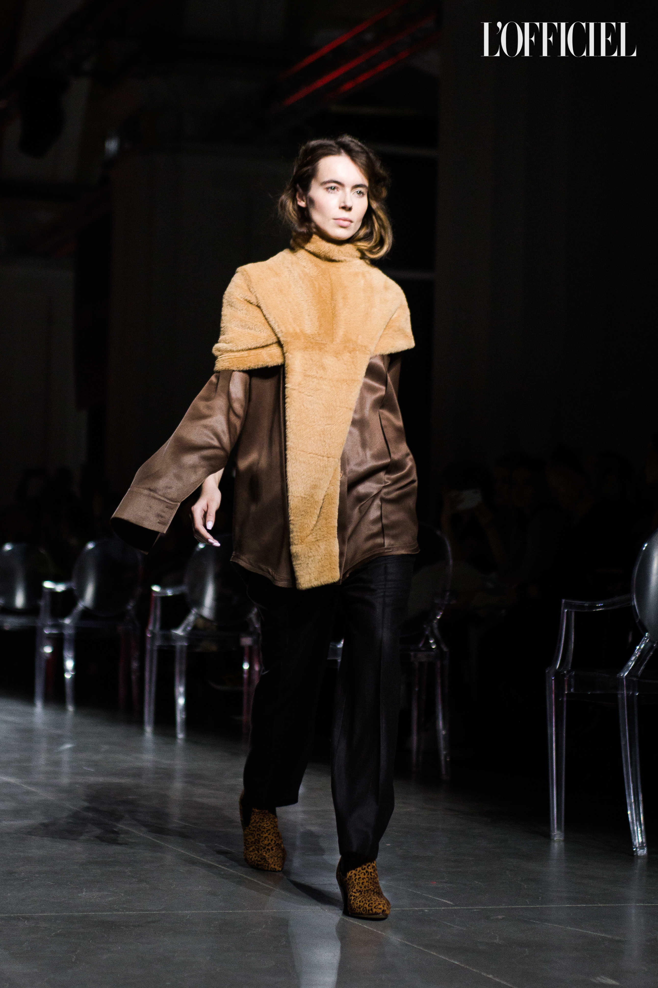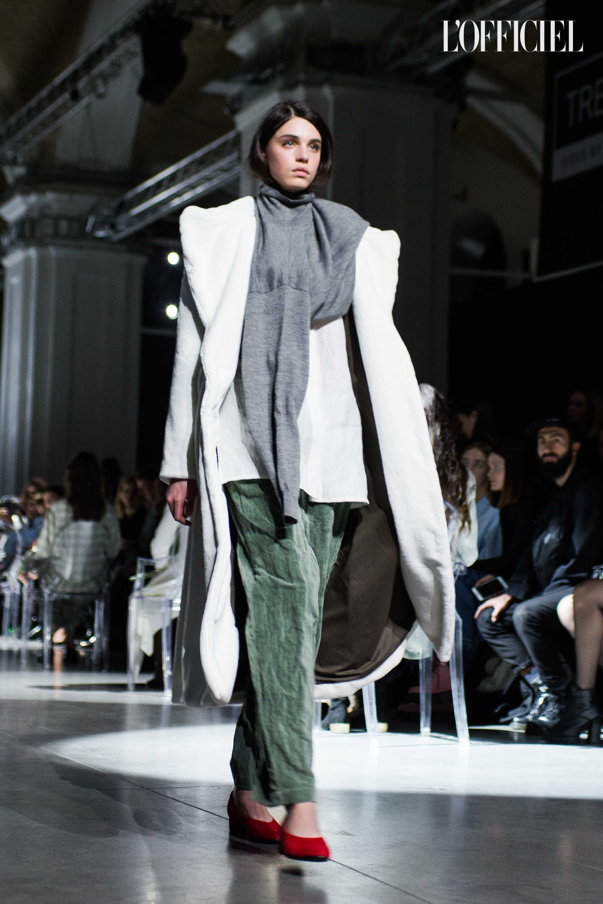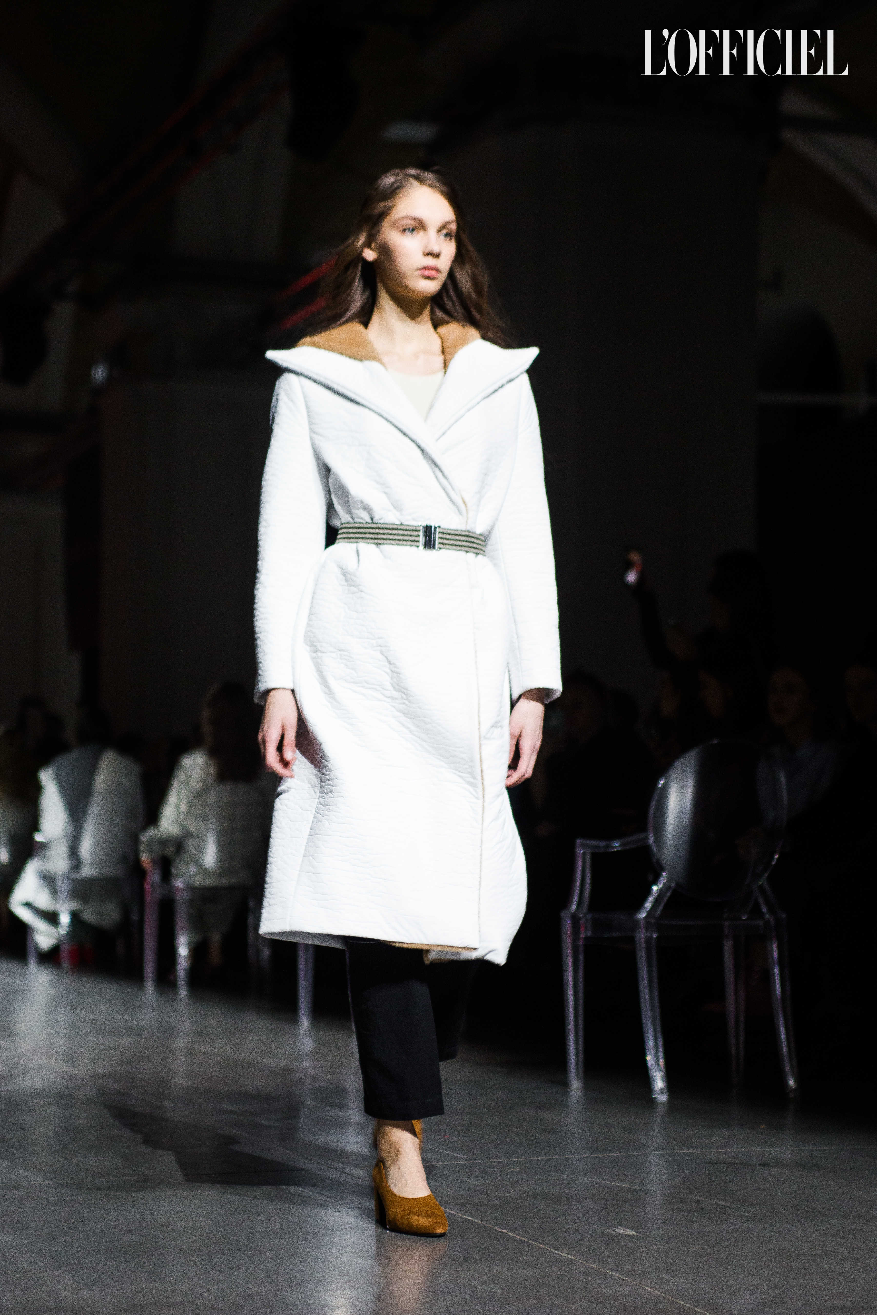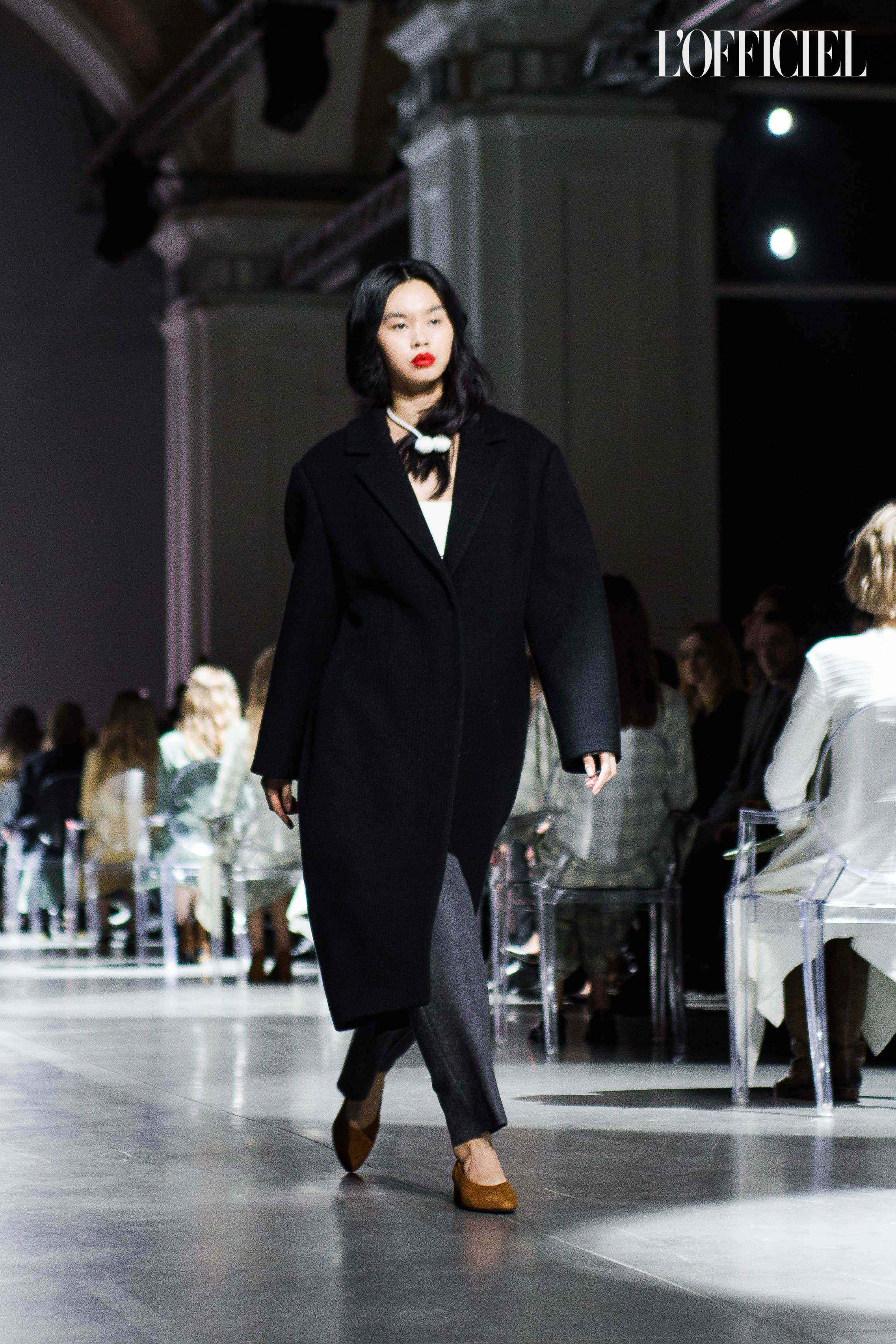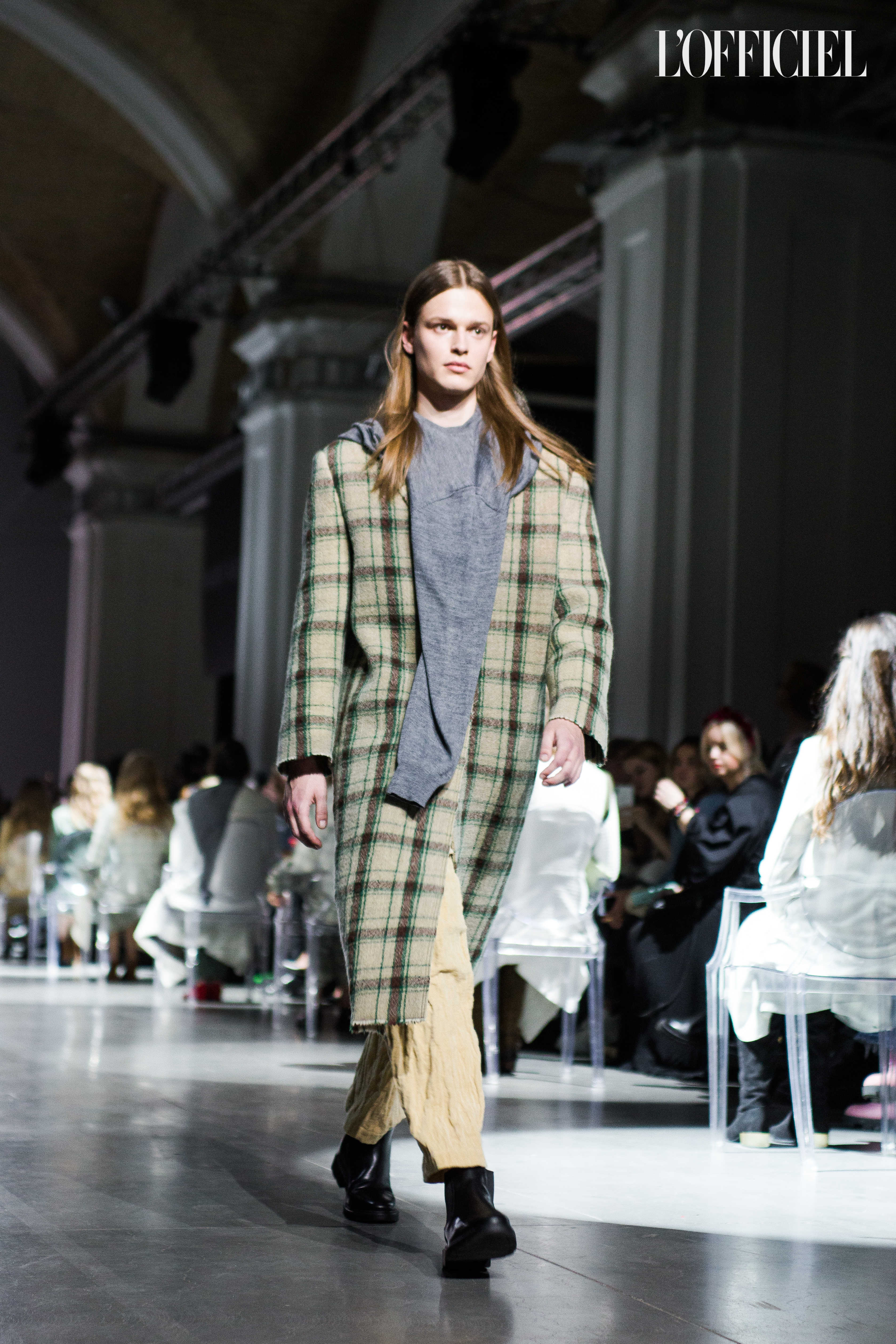 Показ прошёл в форме балетно-театрального перформанса, в основу которого легла идея поиска себя, своего места в мире и необходимости принимать важные решения на пути к цели. Нередко в этом деле мы сталкиваемся с внутренними конфликтами и страхом зайти в своих исканиях дальше, чем это позволено установленными в уме рамками, - а устанавливаем мы их сами. Модели совершали прогулку по подиуму в платьях и юбках из жатого бархата, клетчатых пальто и оверсайз-жакетах и садились на расставленные вдоль подиума стулья, совсем рядом с гостями. В это время две балерины с озорными косичками в мягких платьях-рубашках, будто балуясь, бегали по подиуму, танцевали и по-детски трогательно усаживались на стулья вместо моделей, нарочито ёрзая при этом - совсем как наши беспокойные умы. Это был дуэт Nosisters - Дарина Самойлова и Виктория Соловьева исполнили роли сознания и подсознания.