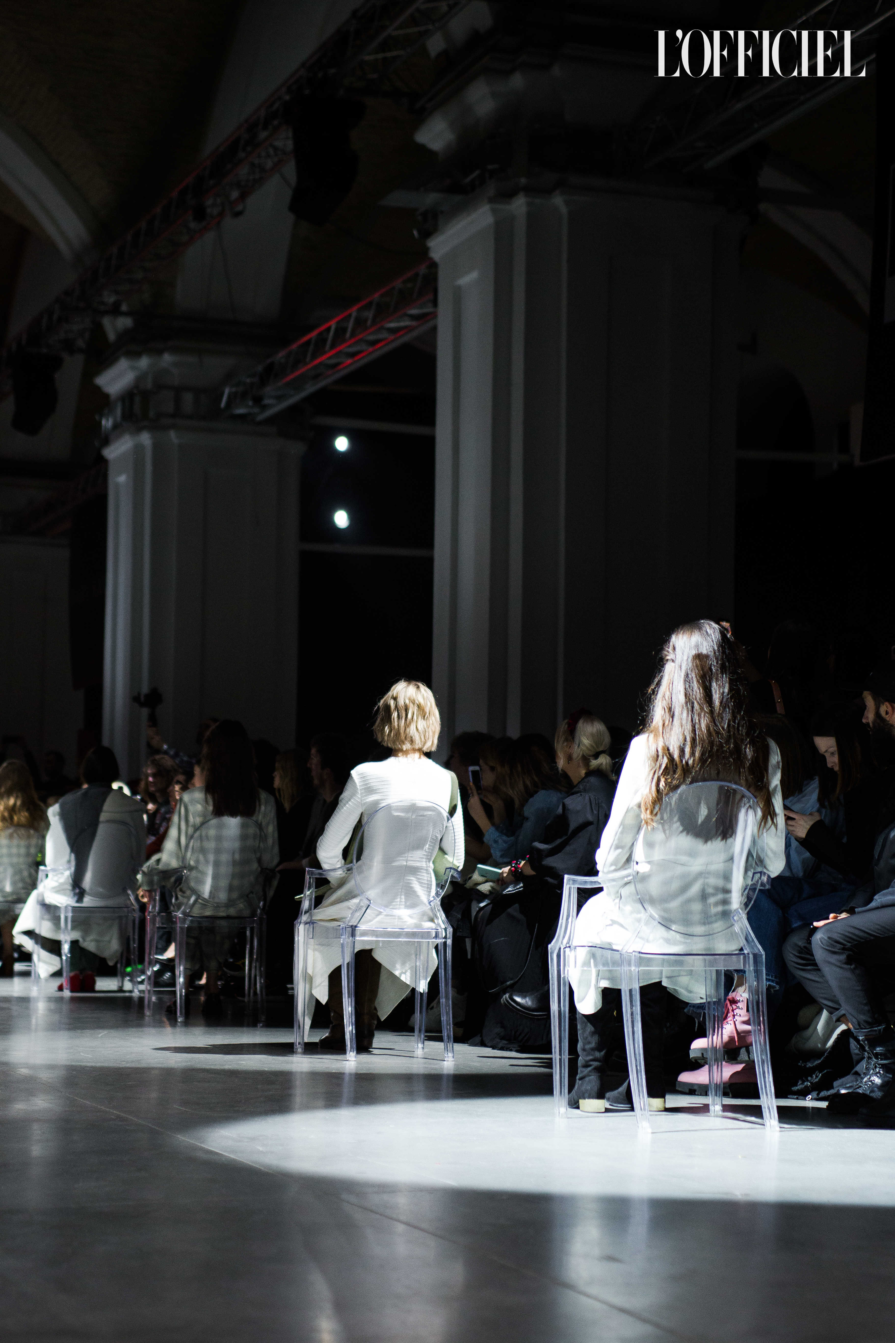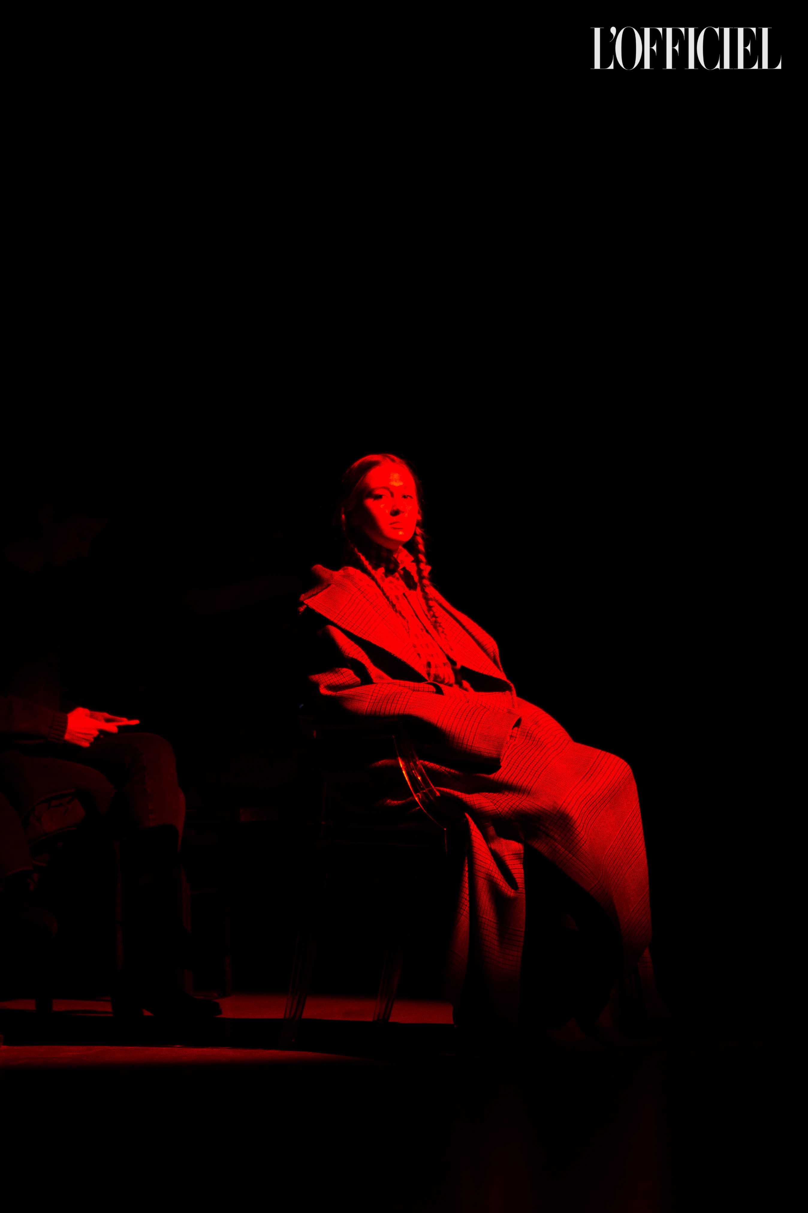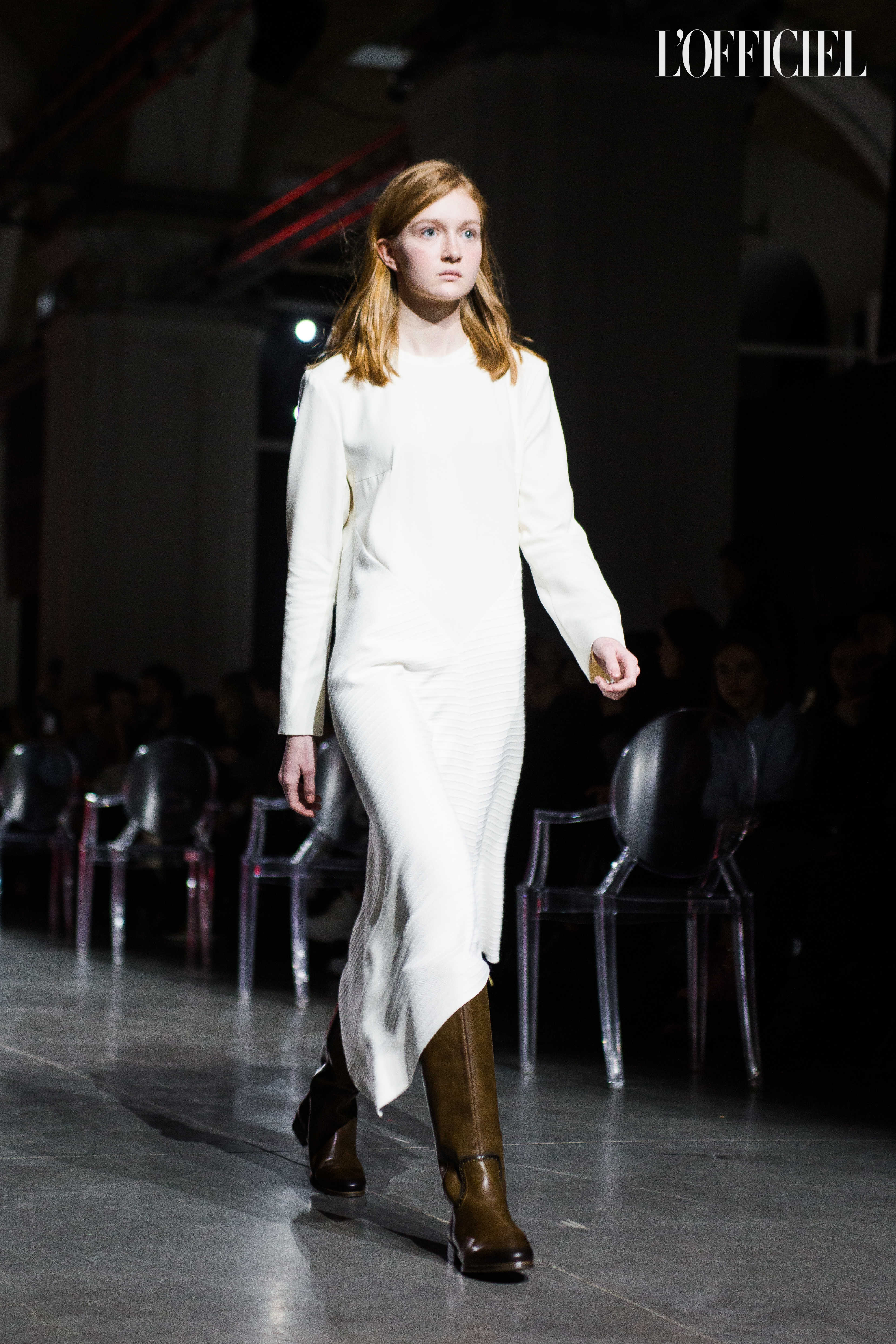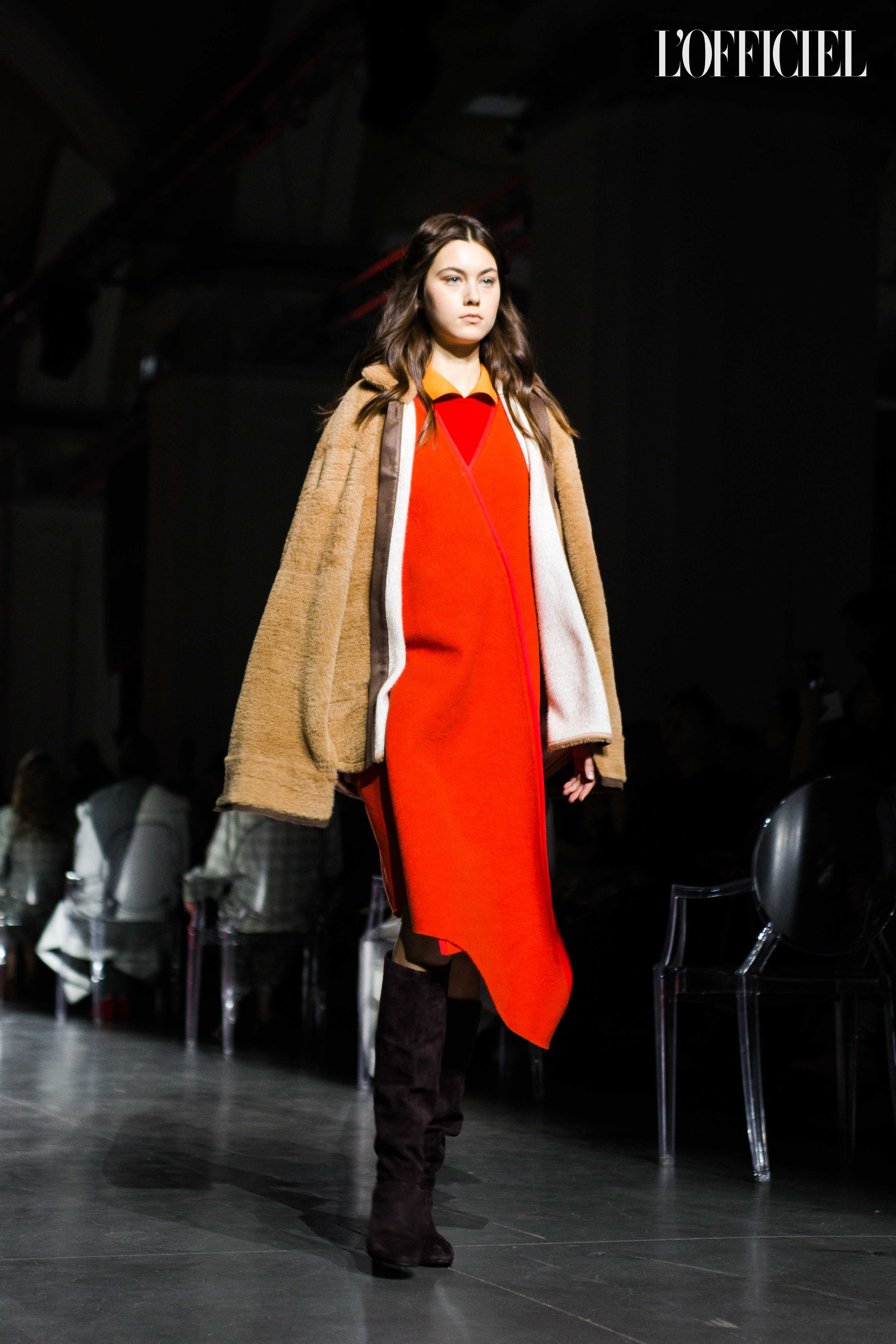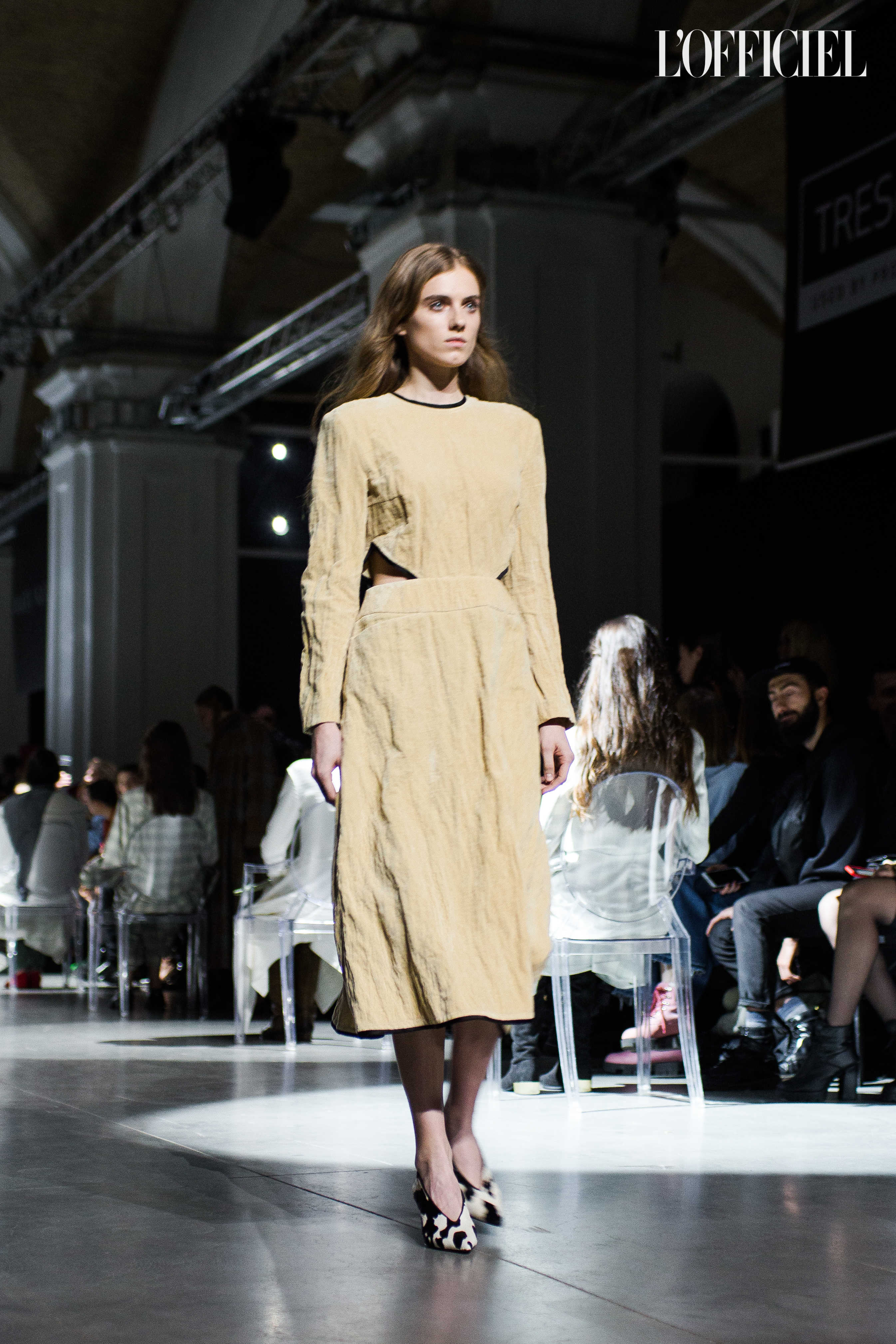 Показ прошёл в форме балетно-театрального перформанса, в основу которого легла идея поиска себя, своего места в мире и необходимости принимать важные решения на пути к цели. Нередко в этом деле мы сталкиваемся с внутренними конфликтами и страхом зайти в своих исканиях дальше, чем это позволено установленными в уме рамками, - а устанавливаем мы их сами. Модели совершали прогулку по подиуму в платьях и юбках из жатого бархата, клетчатых пальто и оверсайз-жакетах и садились на расставленные вдоль подиума стулья, совсем рядом с гостями. В это время две балерины с озорными косичками в мягких платьях-рубашках, будто балуясь, бегали по подиуму, танцевали и по-детски трогательно усаживались на стулья вместо моделей, нарочито ёрзая при этом - совсем как наши беспокойные умы. Это был дуэт Nosisters - Дарина Самойлова и Виктория Соловьева исполнили роли сознания и подсознания.